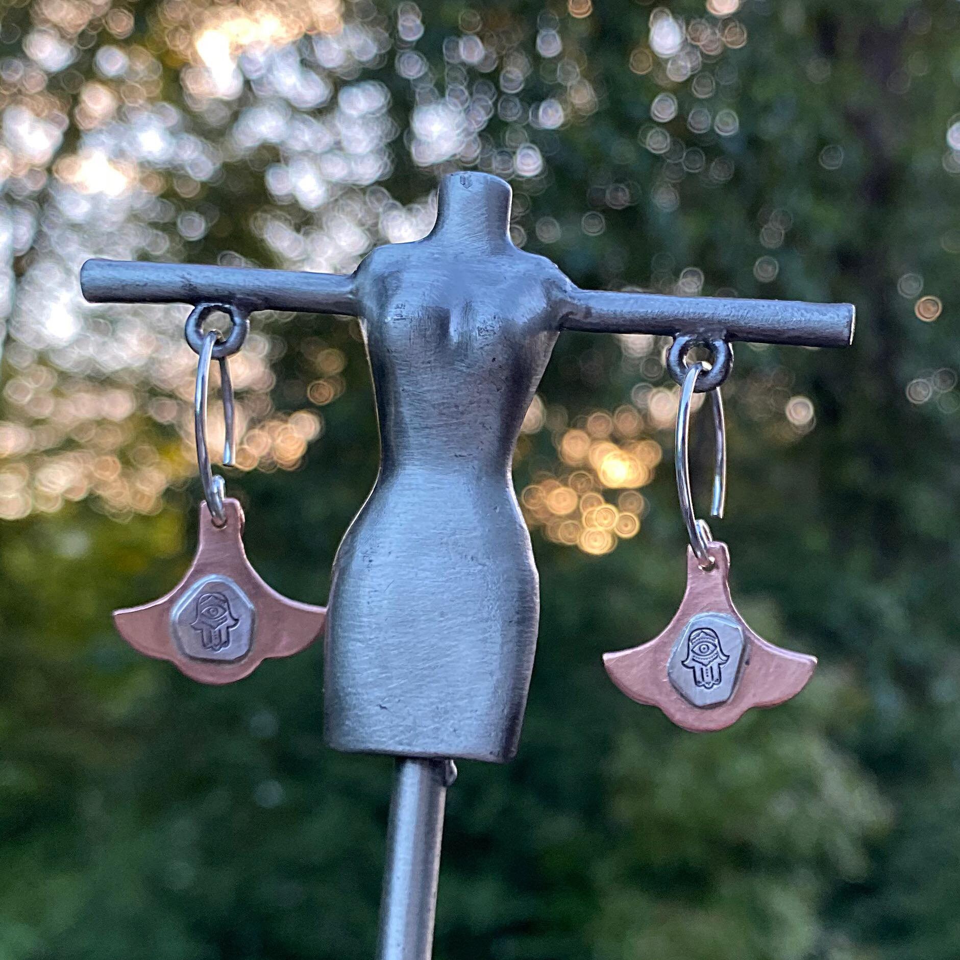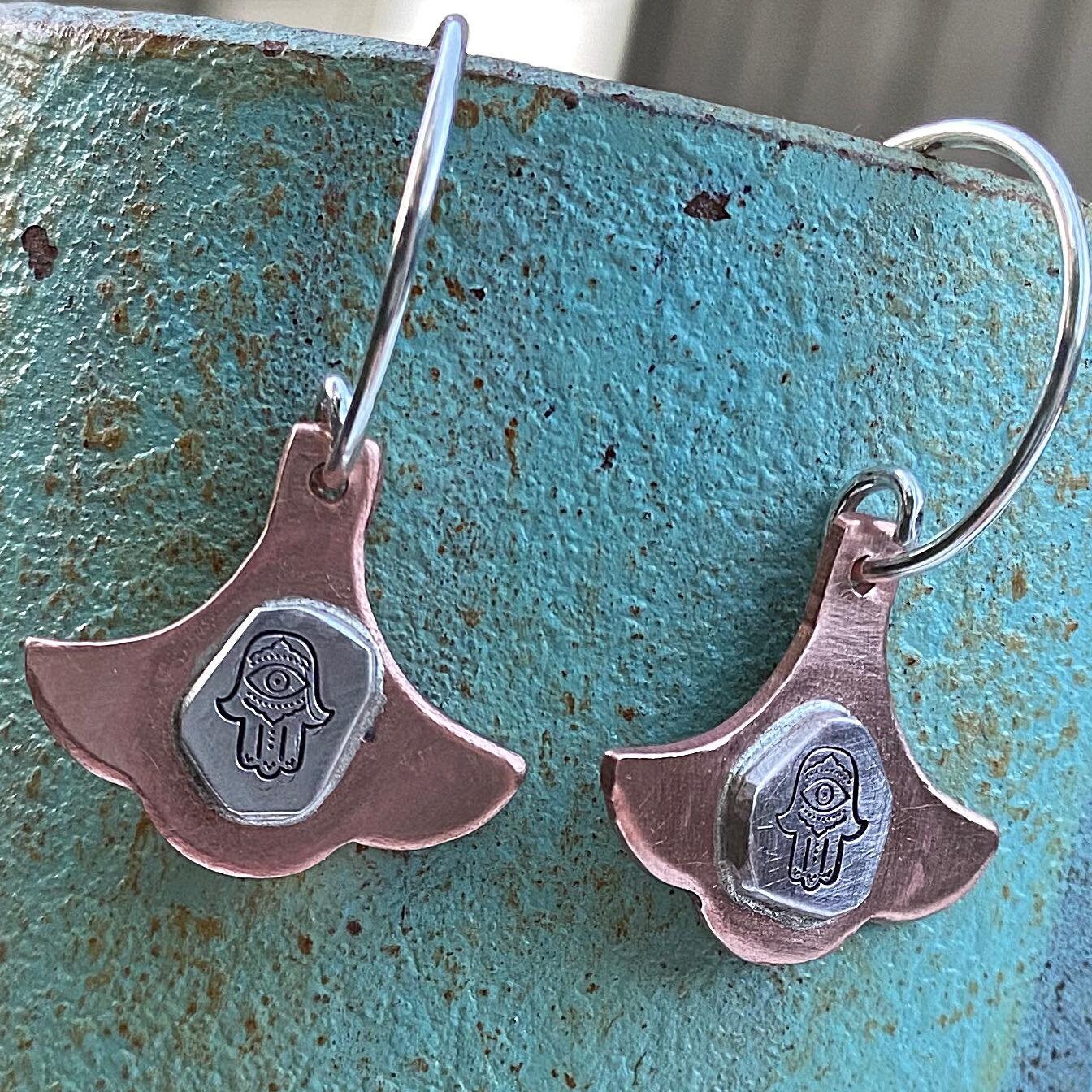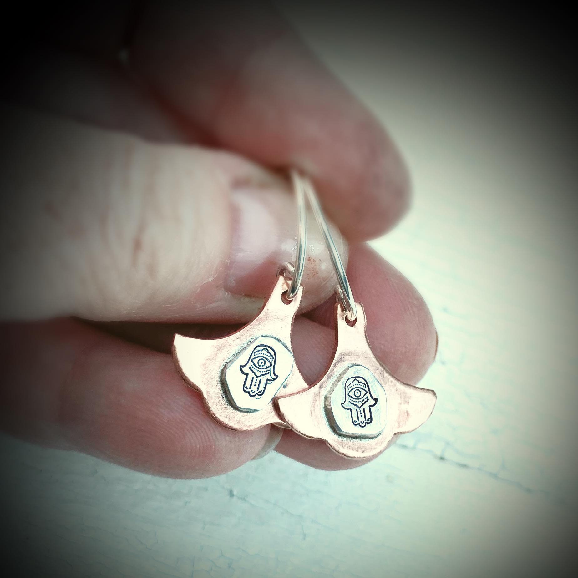 These earrings were made with a beautiful friend of mine in my mind's eye. Beautiful, giving, and always a pillar of faith and hope. The Hamsa image has been inscribed on a thick little irregular piece of sterling silver, and then soldered to a moroccan-fan style copper shape. This special image features the evil eye... (or all seeing eye), The earring wires are sterling silver - the best of both worlds! The color of the copper but only sterling touches your skin.
