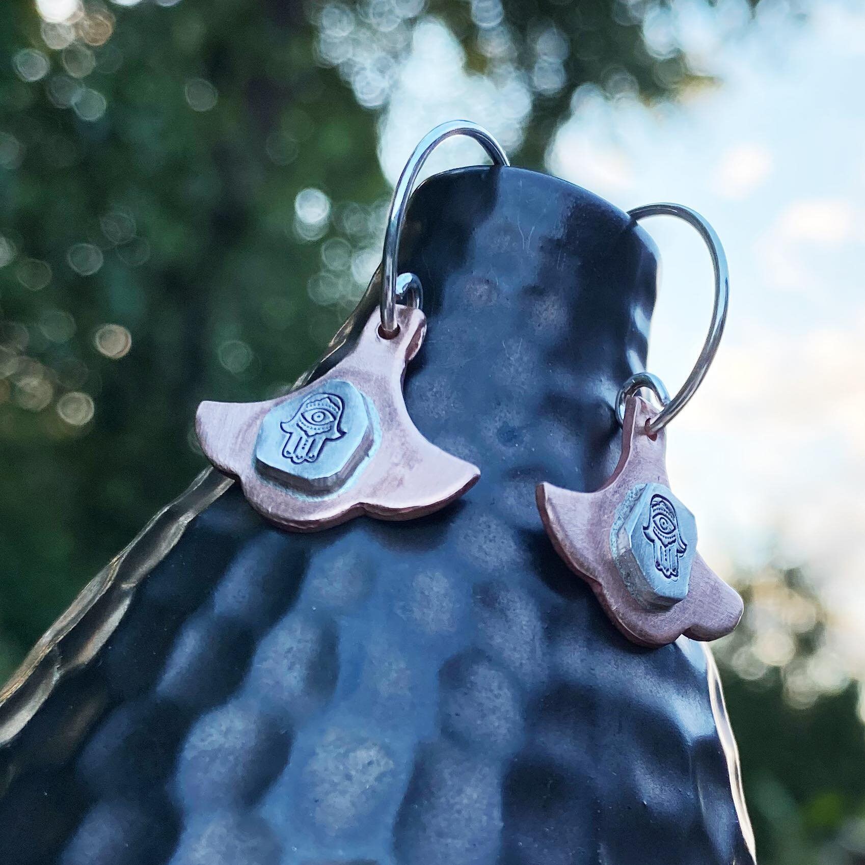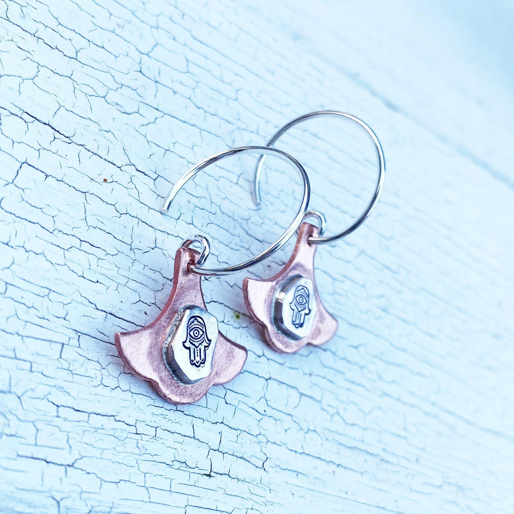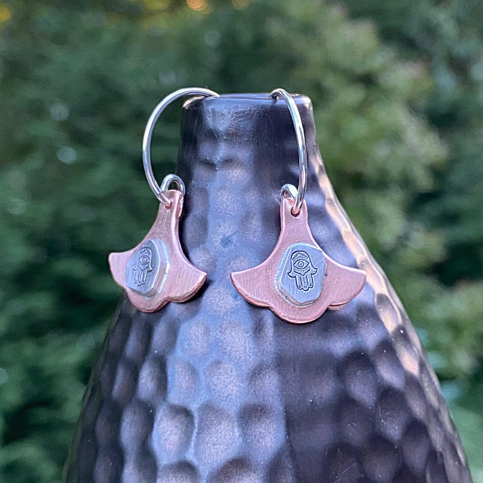 These earrings were made with a beautiful friend of mine in my mind's eye. Beautiful, giving, and always a pillar of faith and hope. The Hamsa image has been inscribed on a thick little irregular piece of sterling silver, and then soldered to a moroccan-fan style copper shape. This special image features the evil eye... (or all seeing eye), The earring wires are sterling silver - the best of both worlds! The color of the copper but only sterling touches your skin.