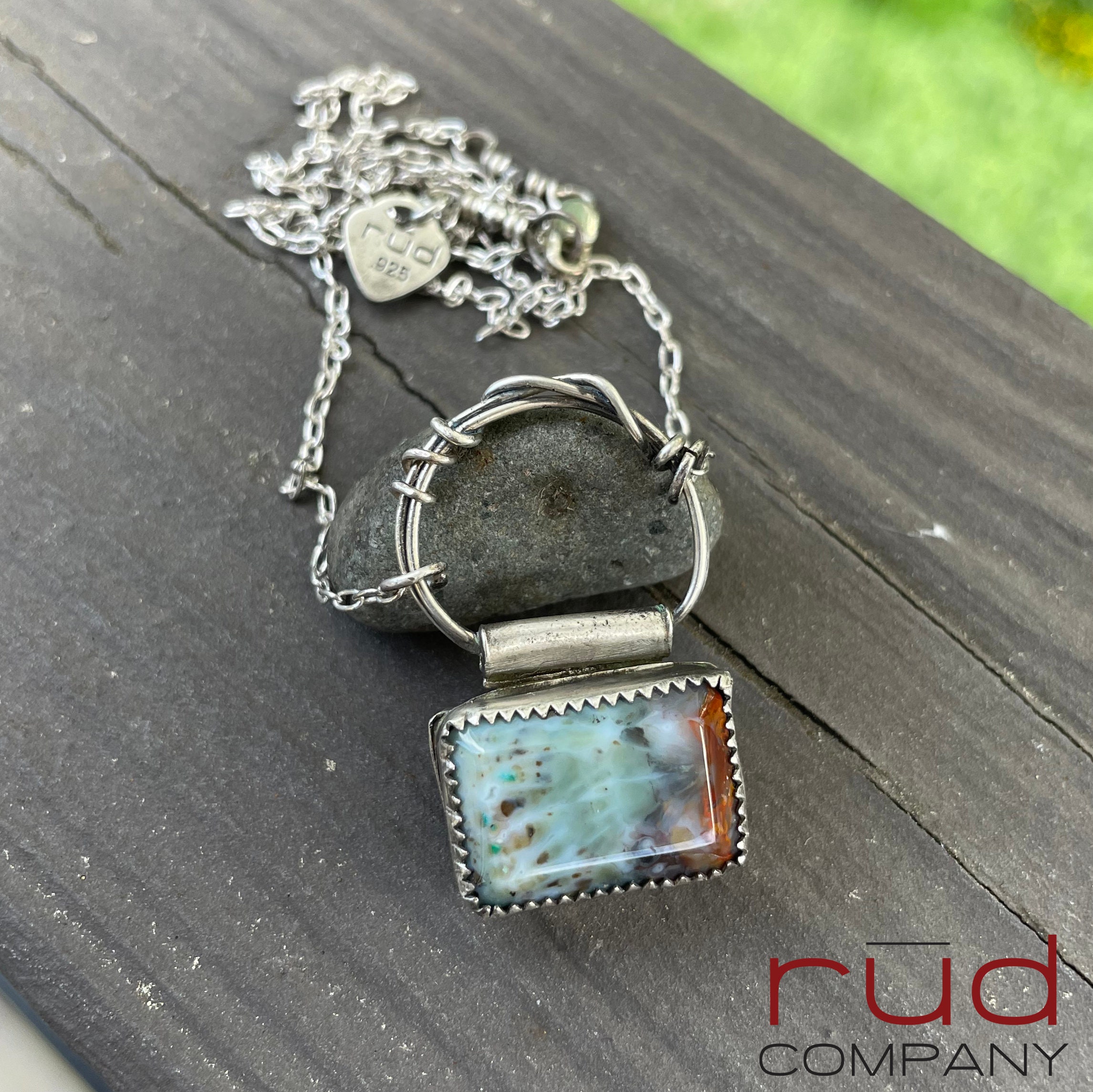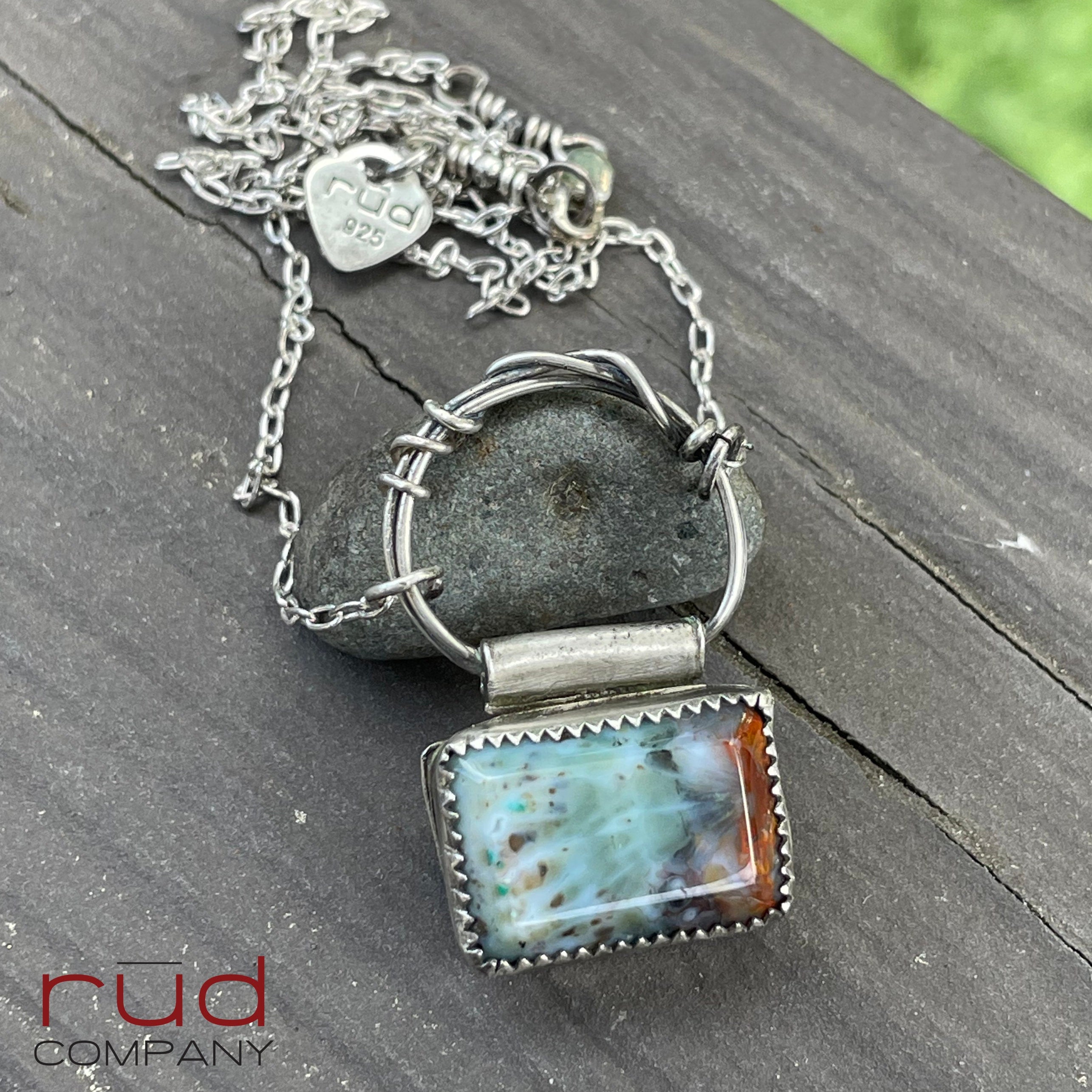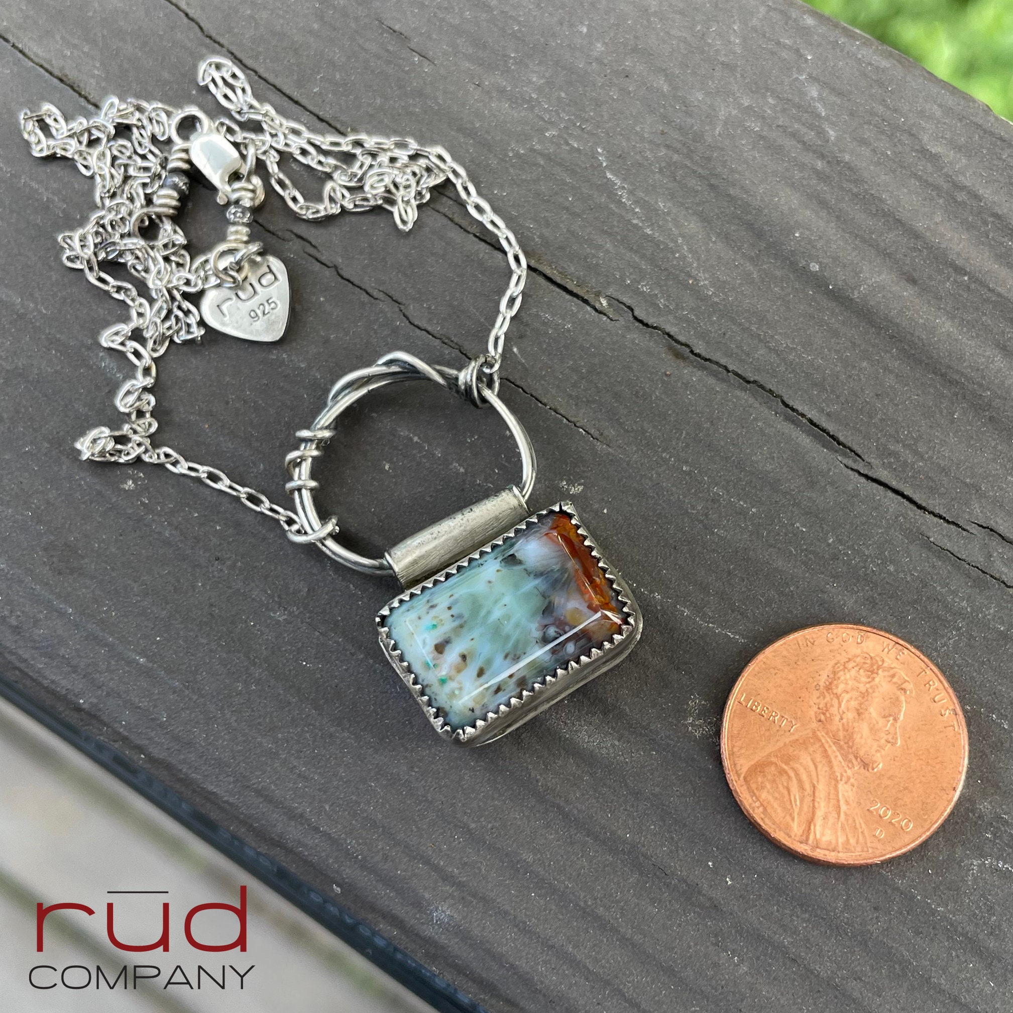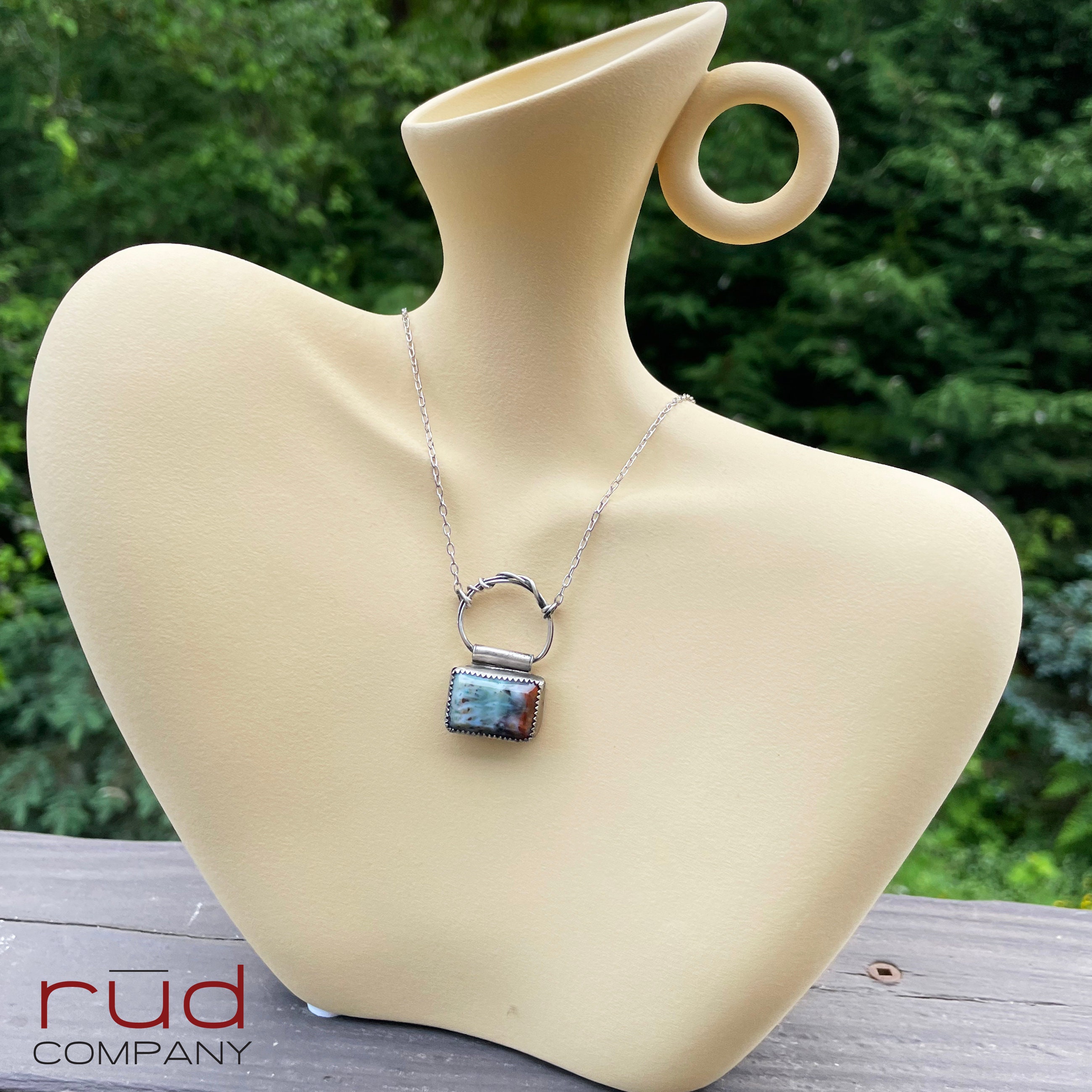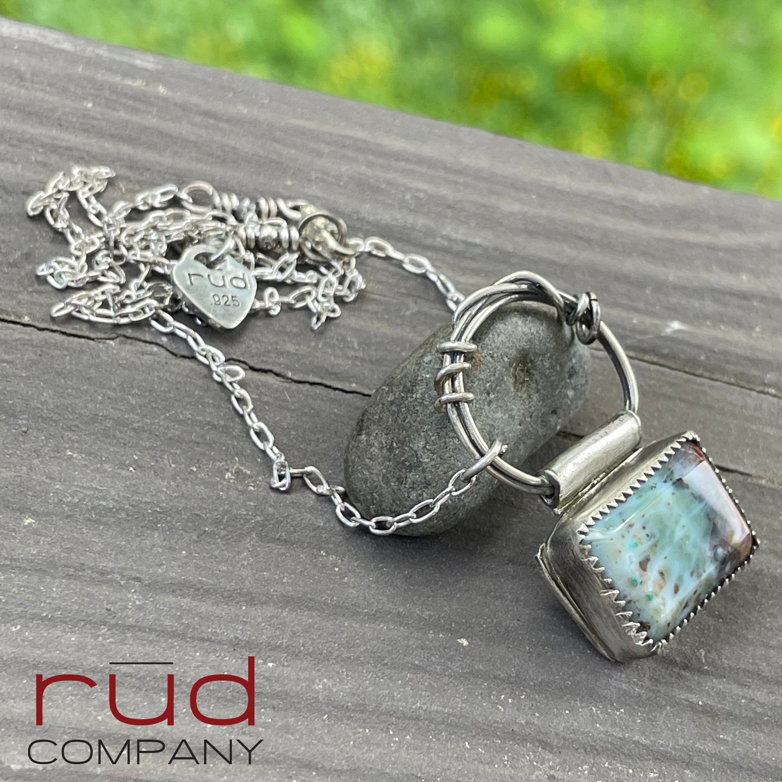 A heart tag with the Rūd logo and .925 (sterling) hallmark graces the back of the necklace. Our logo and hallmark also whimsically appear on the reverse of the pendant. This is a breathtaking necklace that will be treasured by its owner. The photos do not do the beauty of this stone justice - it is just gorgeous. Shades of earthy brown, teal, spots of aqua and cobalt - stunning.