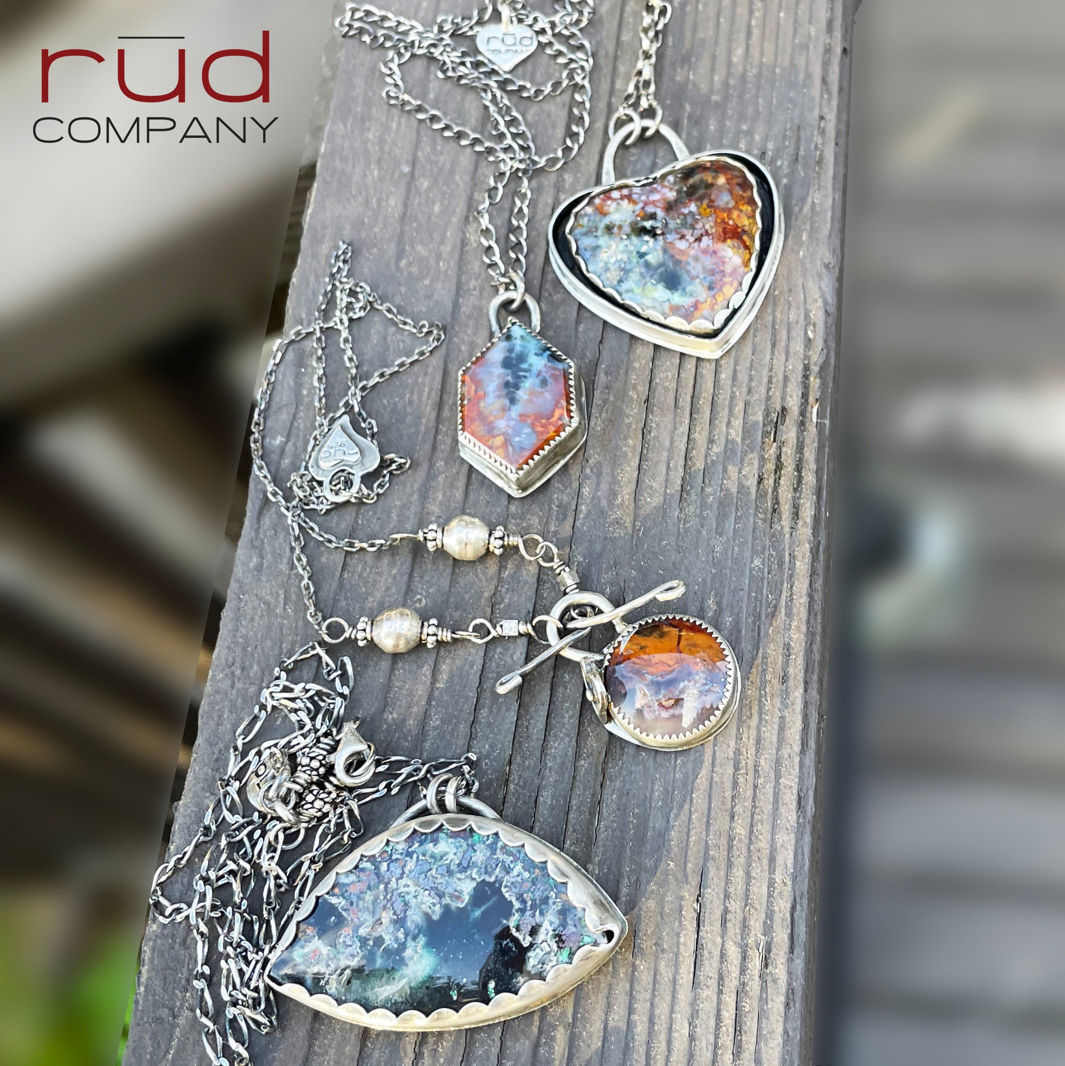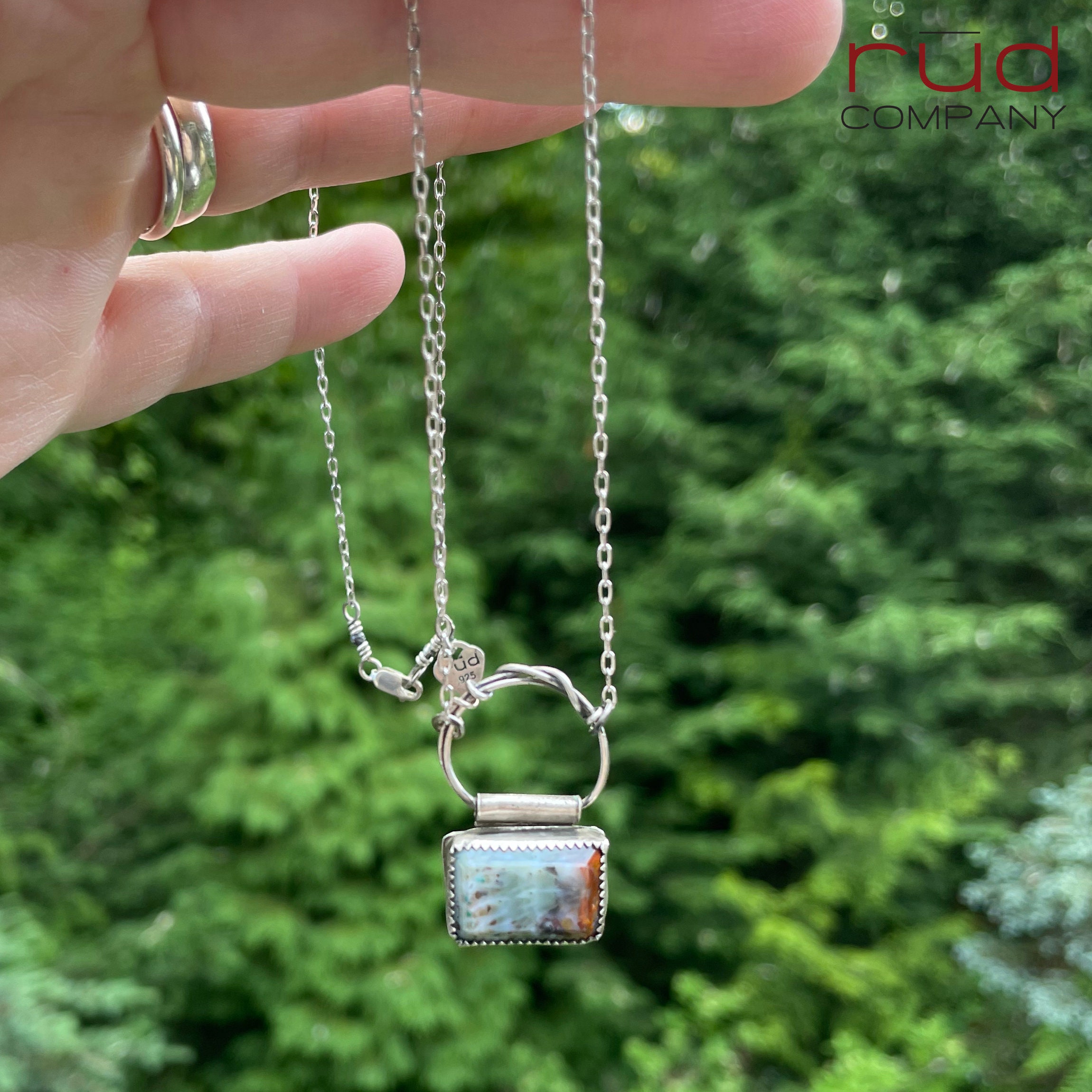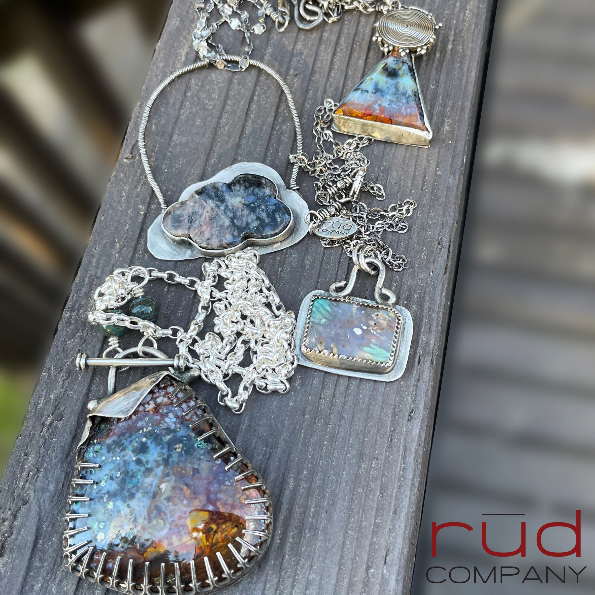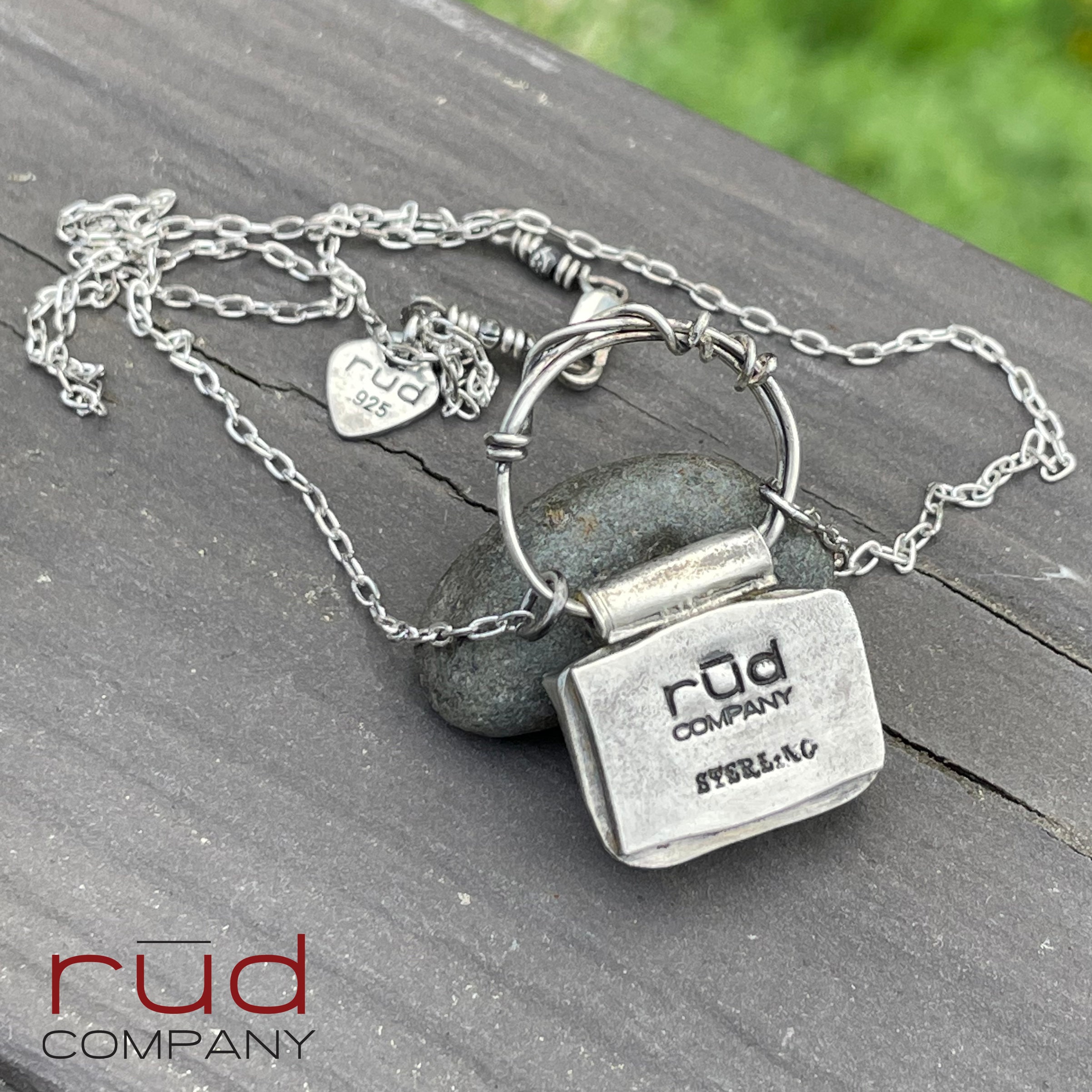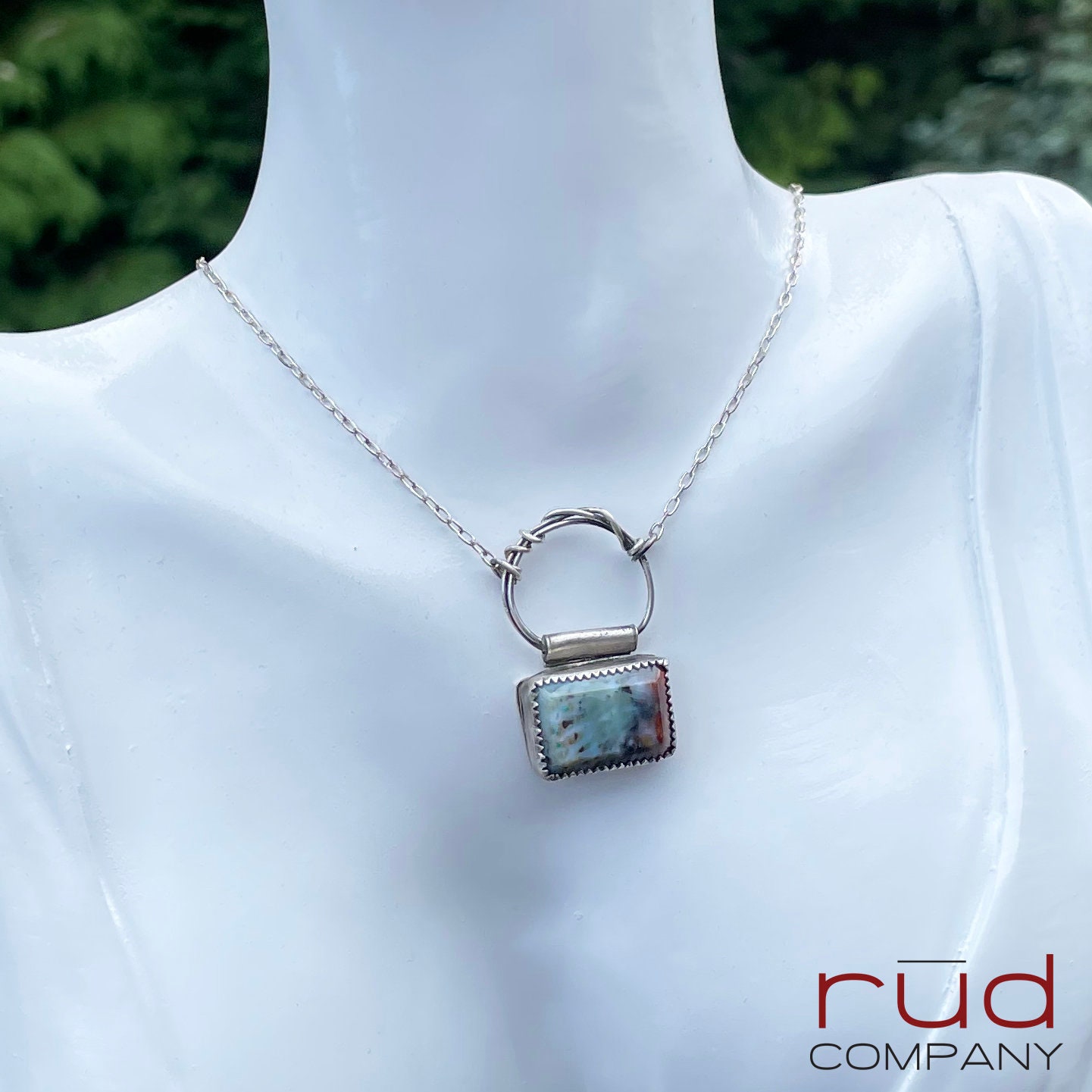 A heart tag with the Rūd logo and .925 (sterling) hallmark graces the back of the necklace. Our logo and hallmark also whimsically appear on the reverse of the pendant. This is a breathtaking necklace that will be treasured by its owner. The photos do not do the beauty of this stone justice - it is just gorgeous. Shades of earthy brown, teal, spots of aqua and cobalt - stunning.