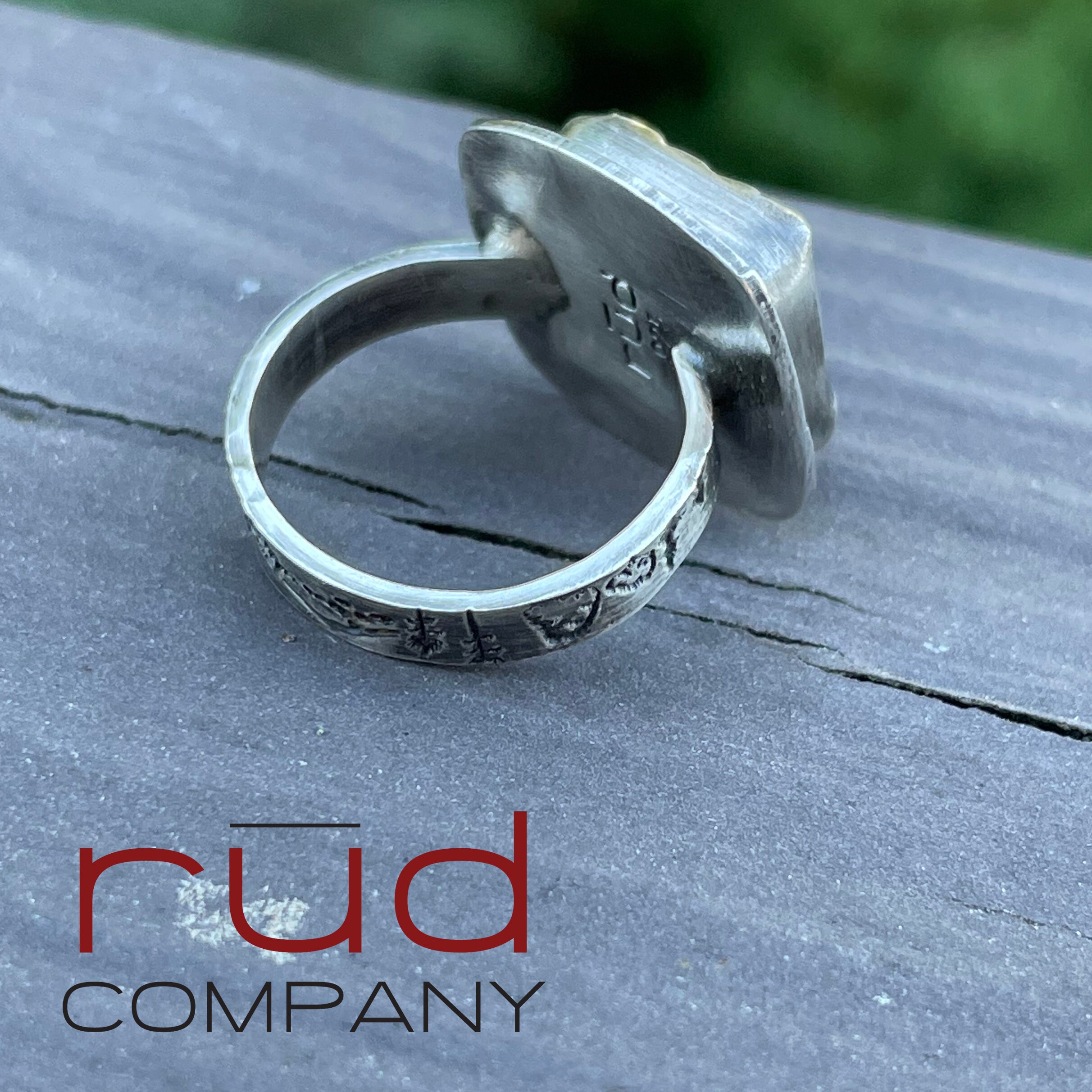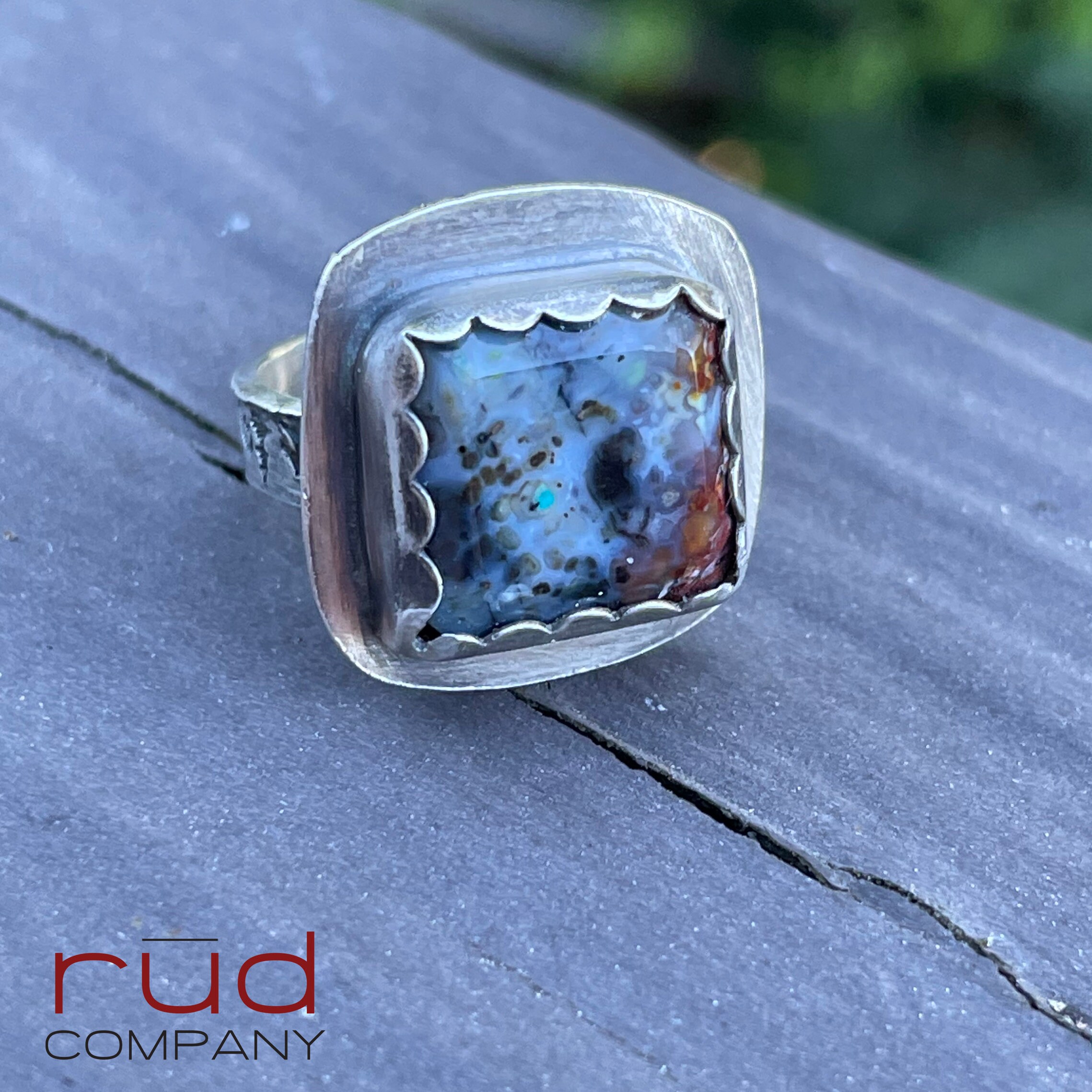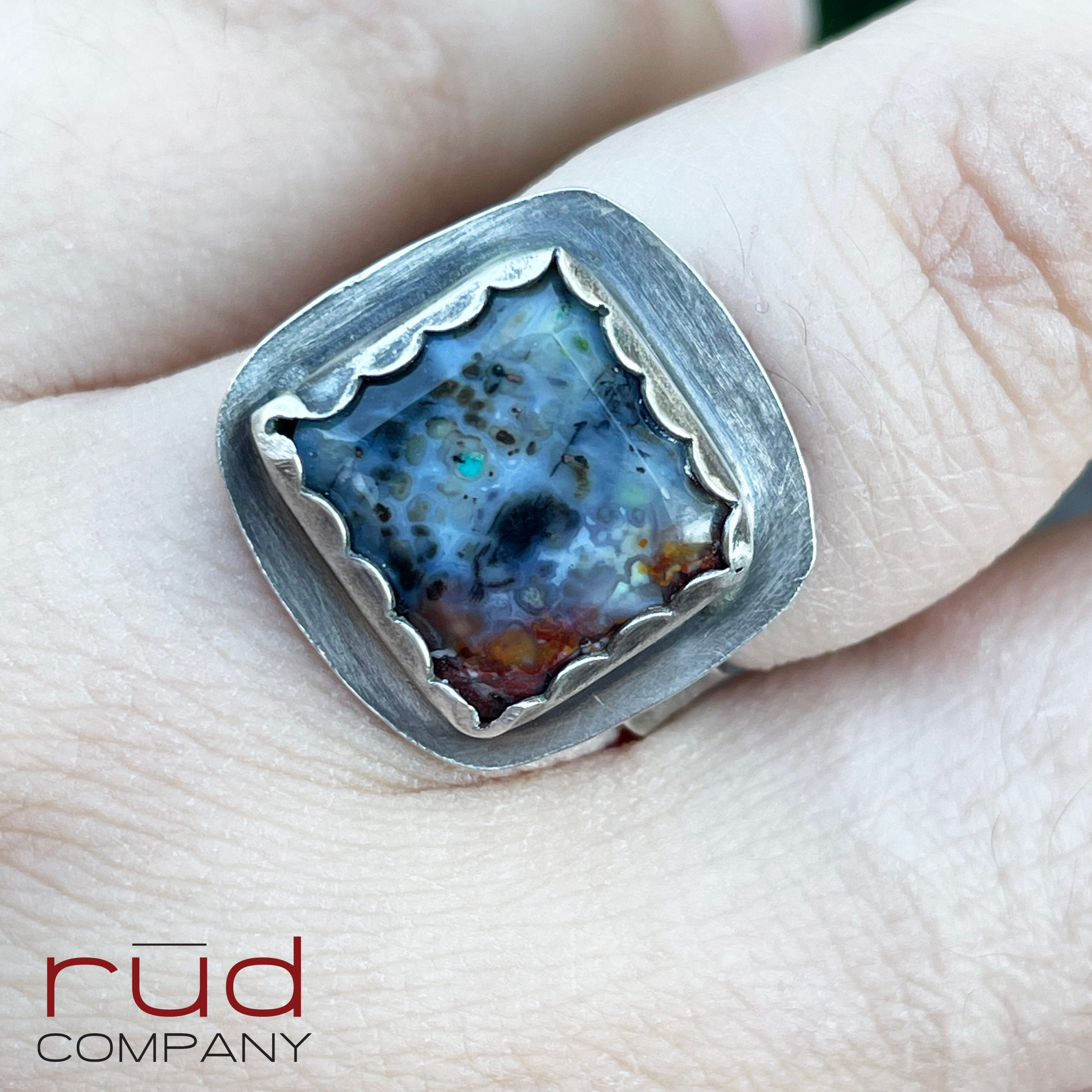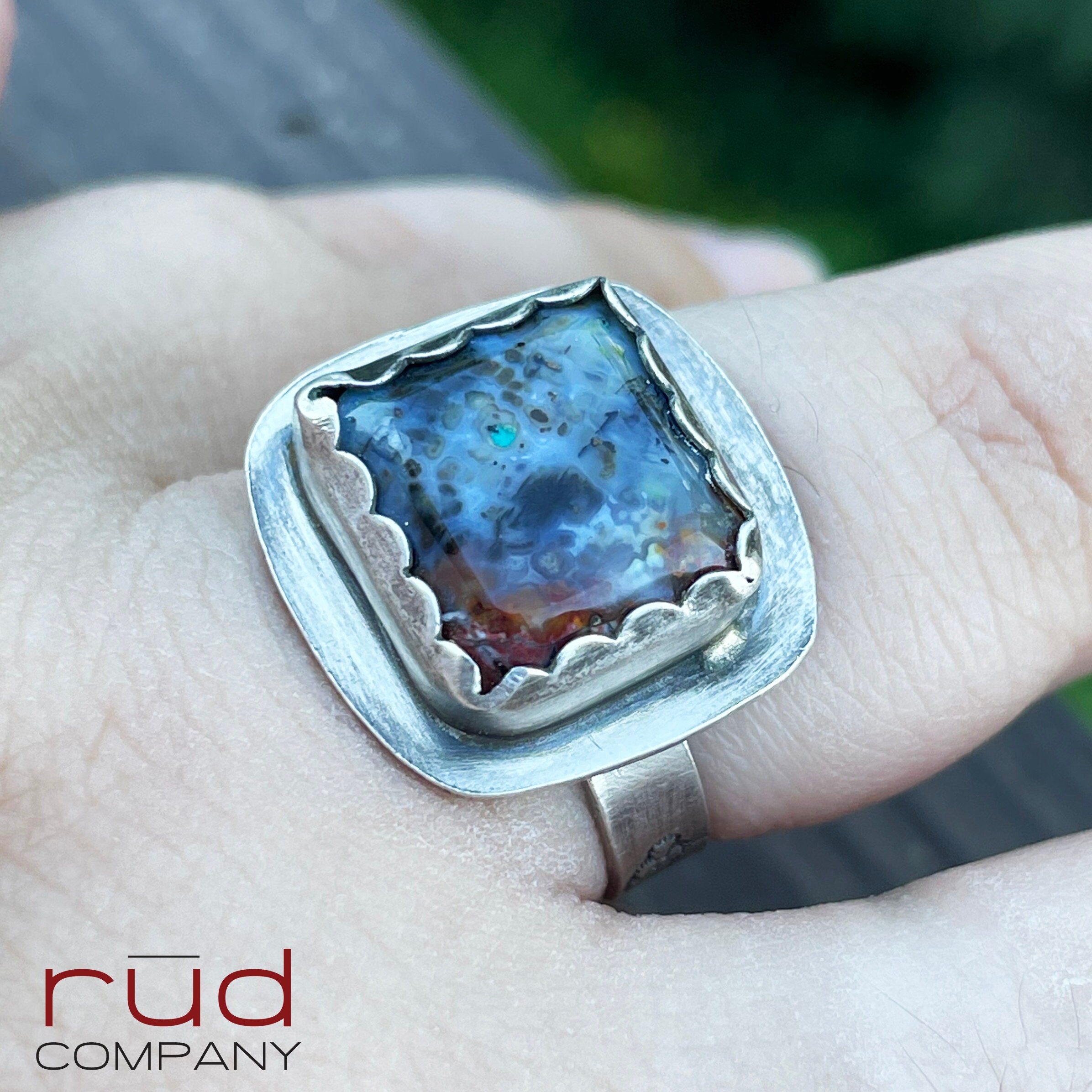 This ring will set you apart - there is only one and this stone/material is very rare and only comes from a single source location in Indonesia. The stonecutter uses a bevel technique that is stunning. I've set it into a scallop-edged sterling silver bezel, with a bit of a flair for comfort and design.