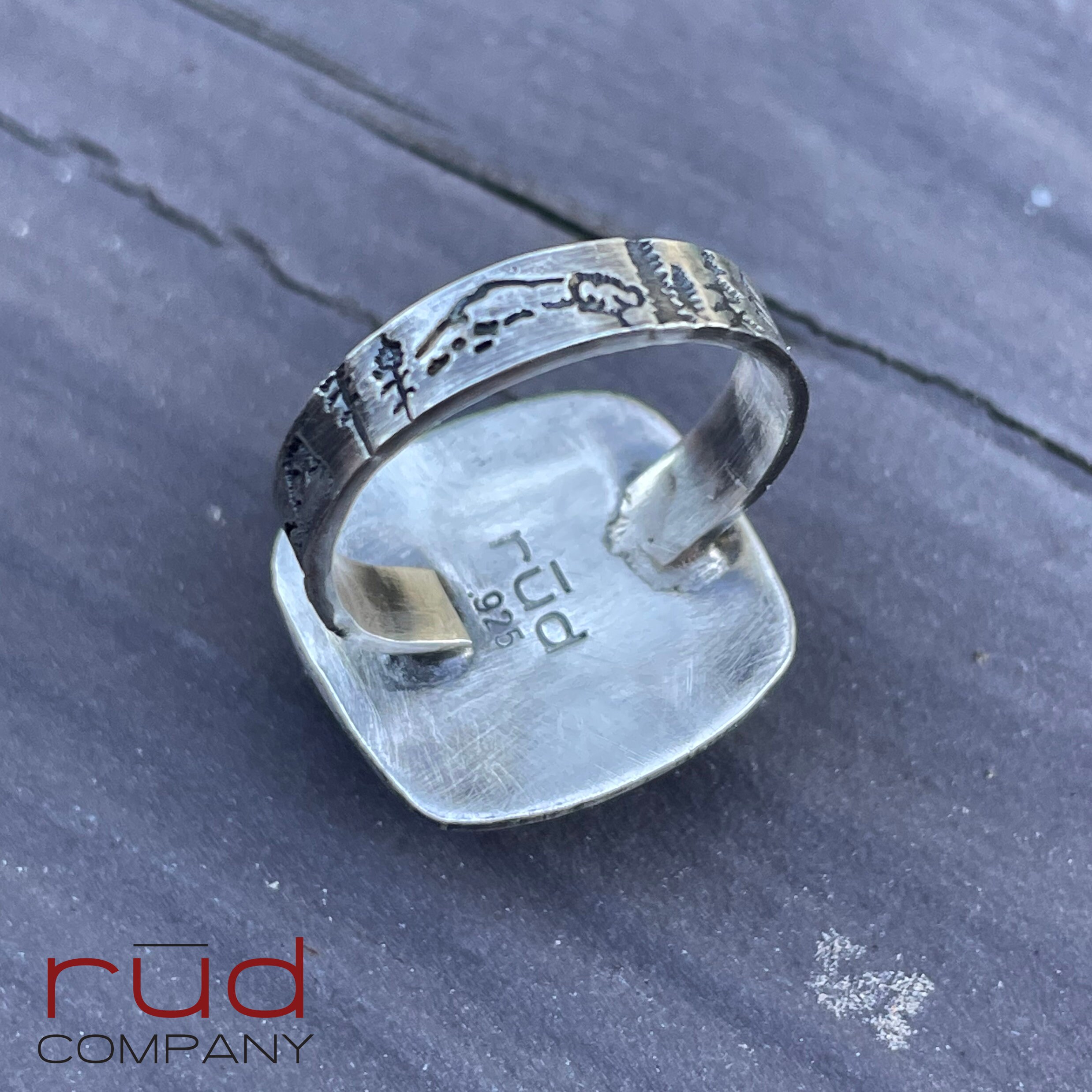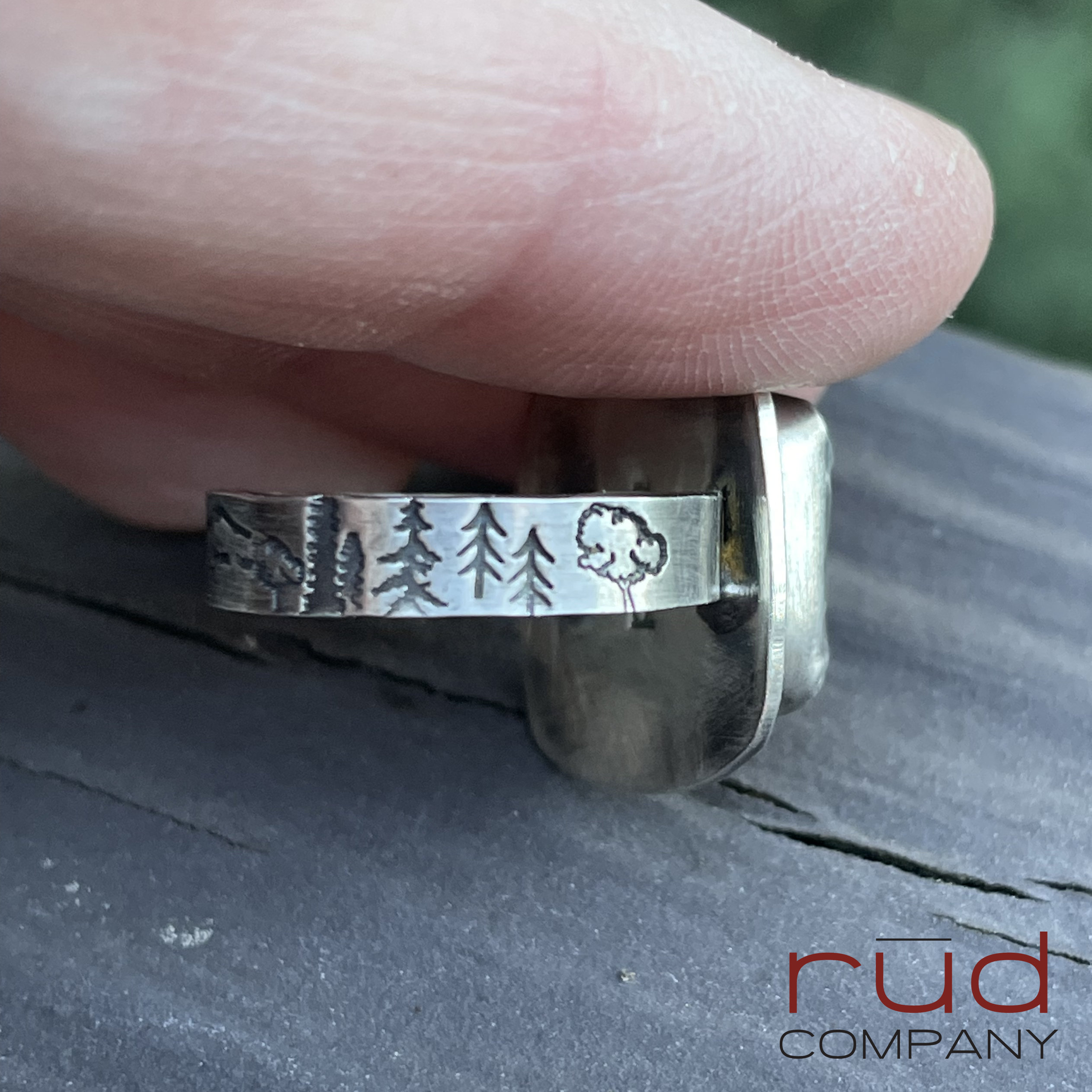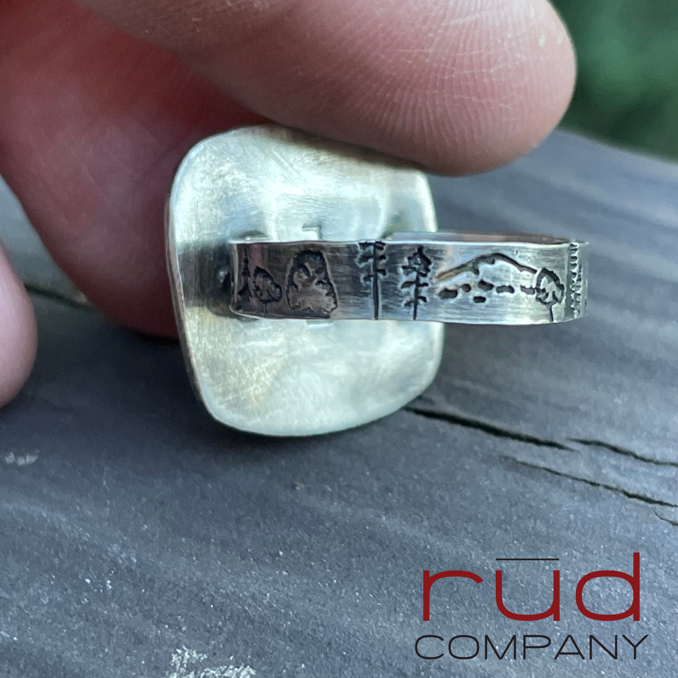 The band of the ring is in itself a piece of art - it shows a mountain scene with a custom image of Mount Rainier and forest. The ring is approximately a size 8.