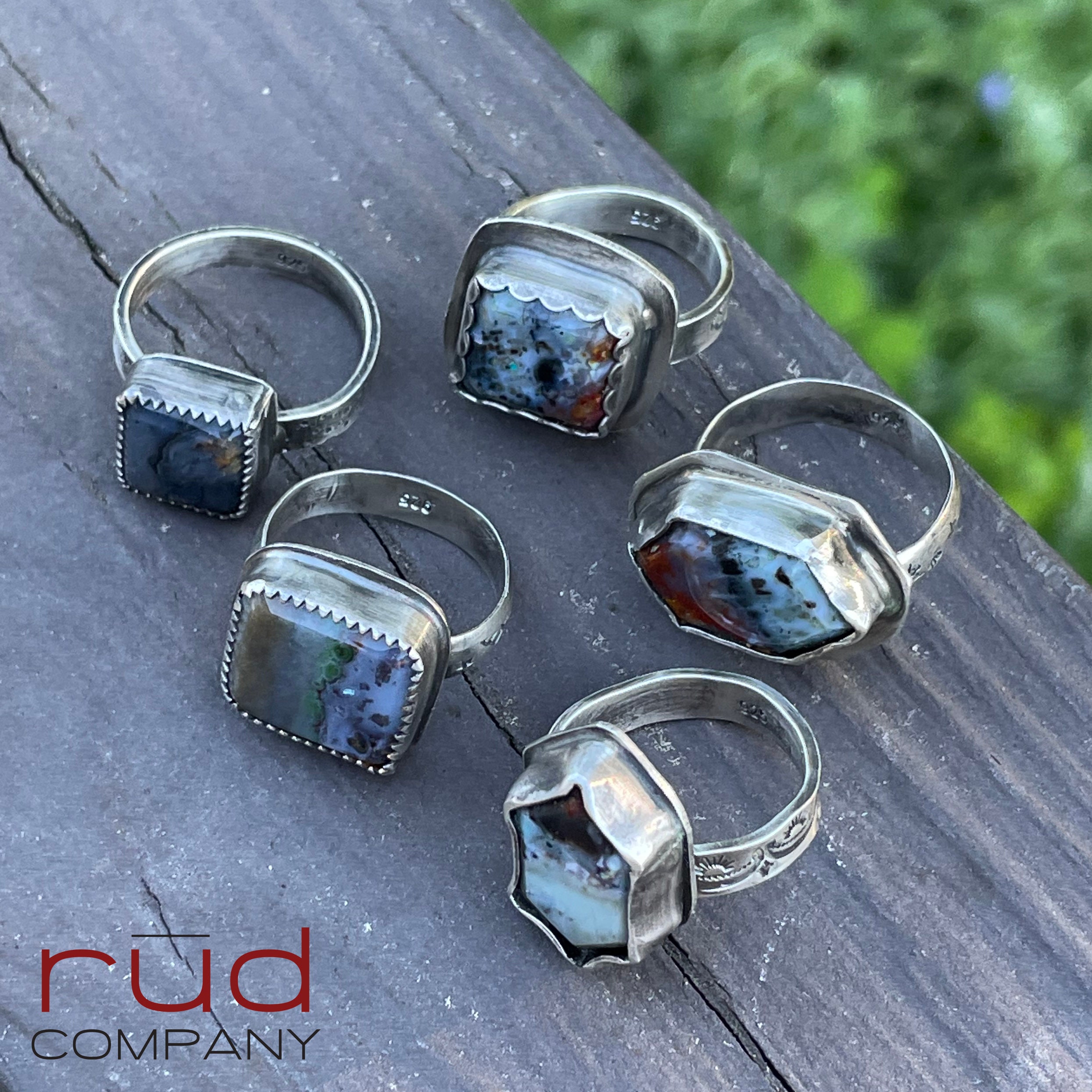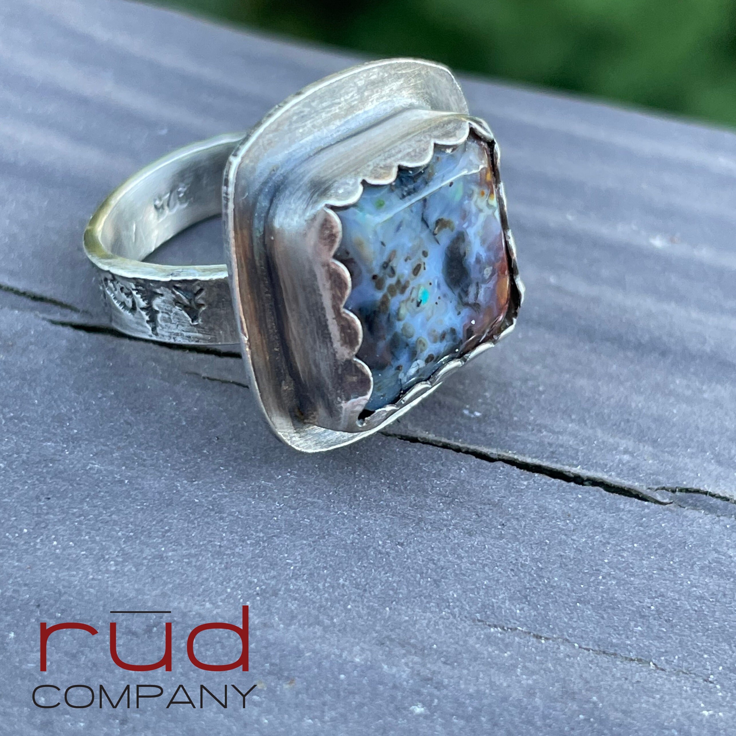Our logo and hallmark whimsically appear on the reverse of the ring. This is a breathtaking ring that will be treasured by its owner. The photos do not do the beauty of this stone justice - it is just gorgeous. The colors range from a rich earthy brown to aqua, teal, blue, and even flecks of purple and periwinkle.