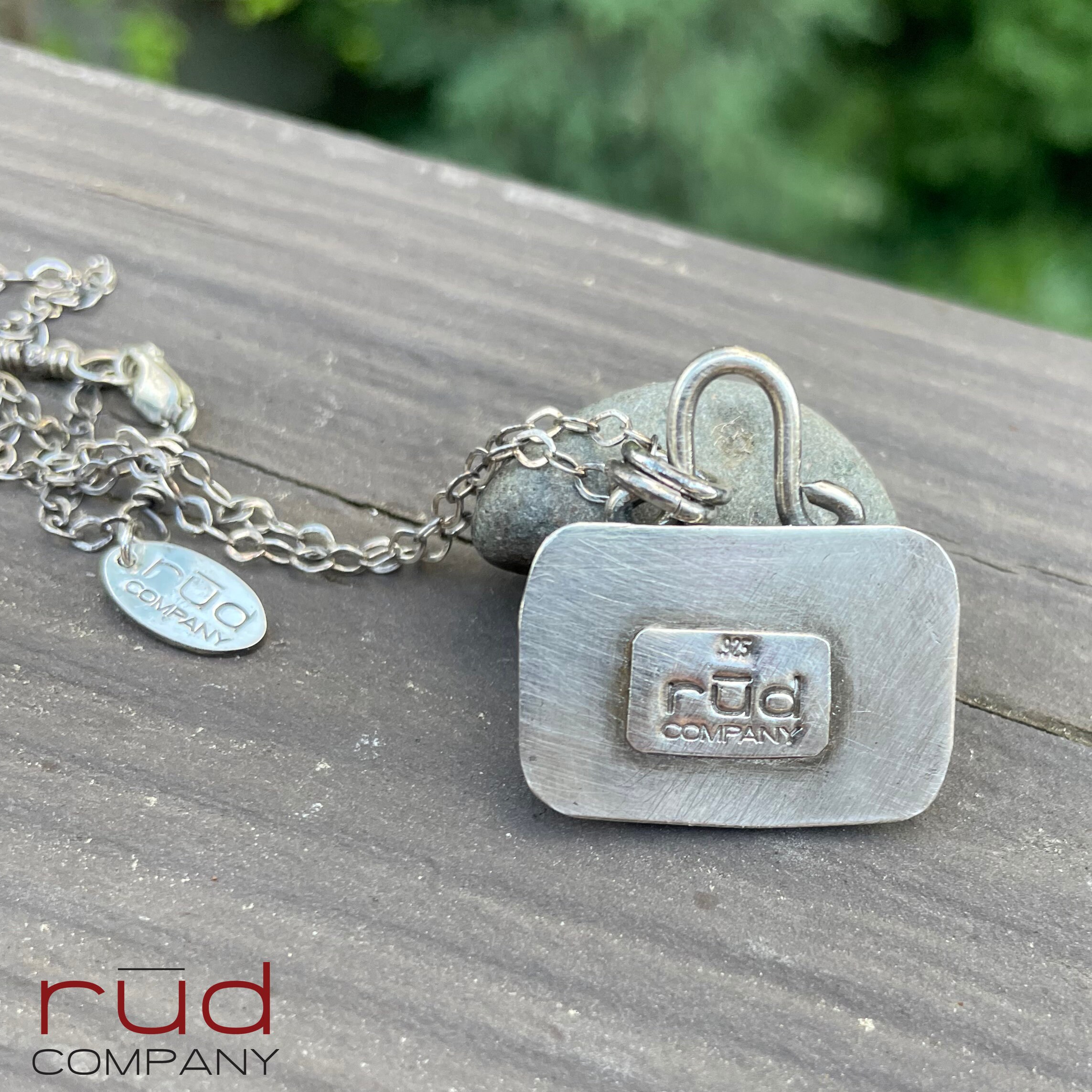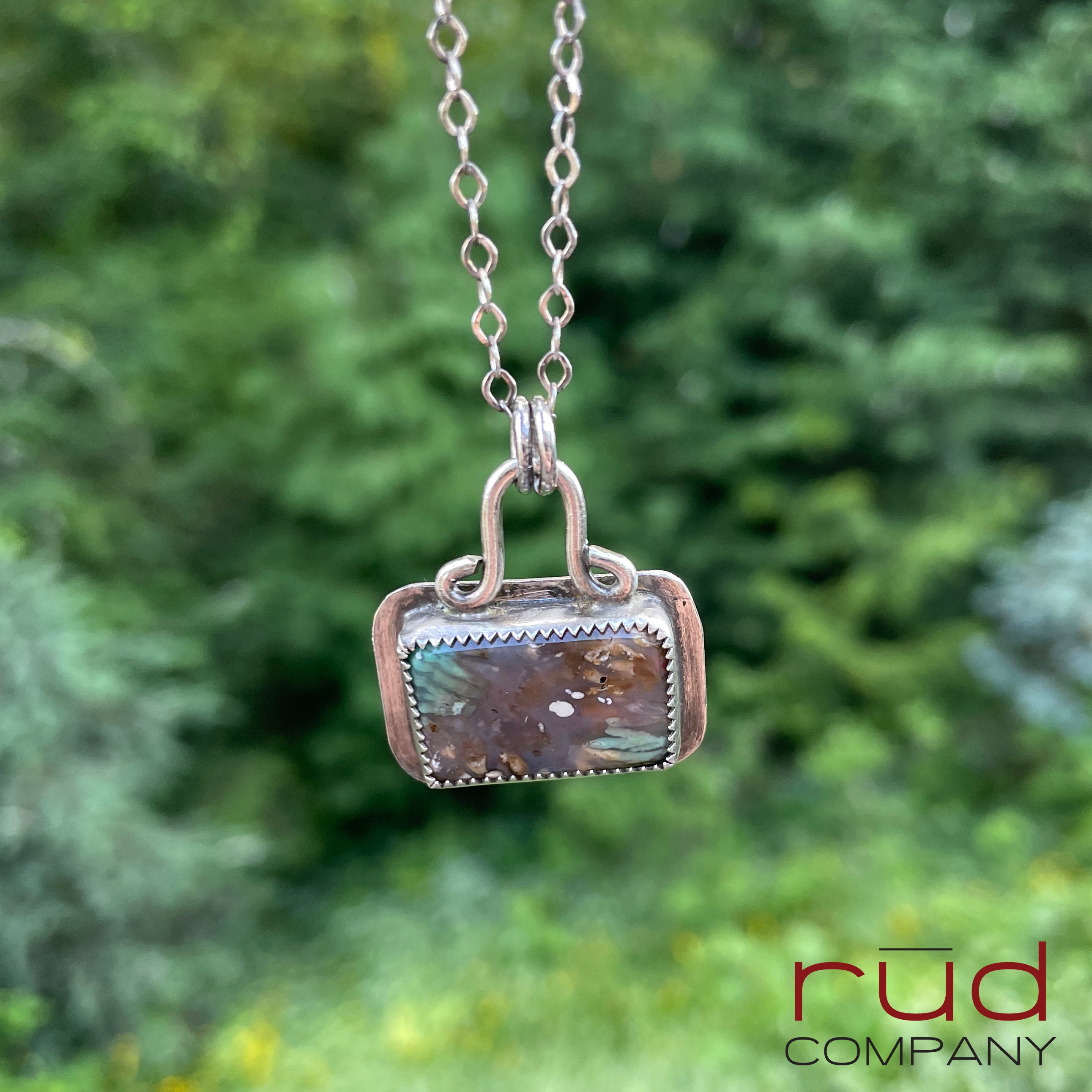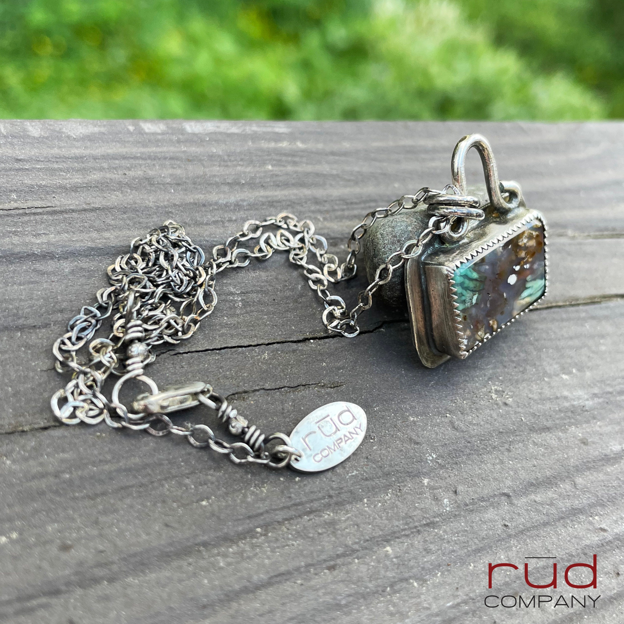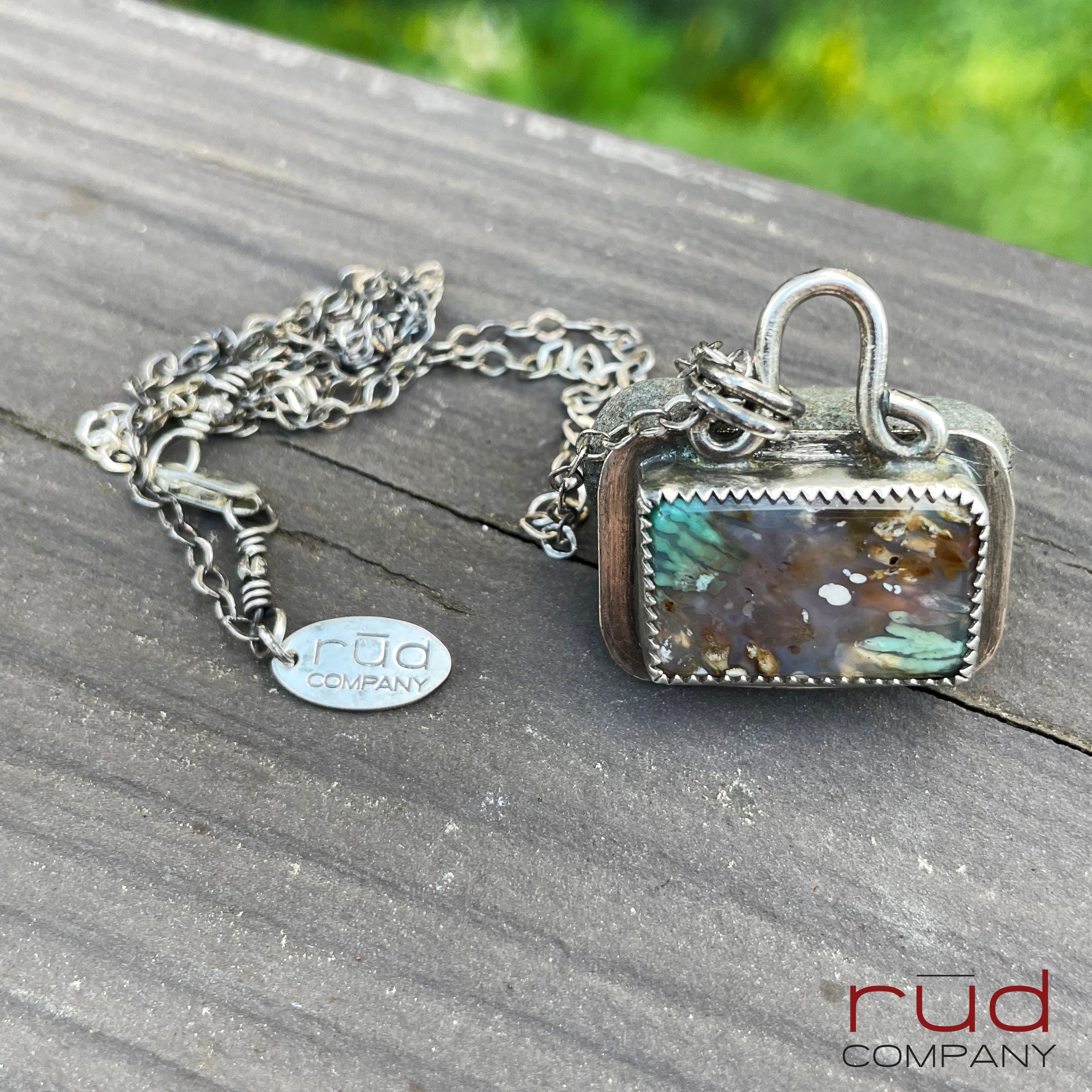 A heart tag with the Rūd logo and .925 (sterling) hallmark graces the back of the necklace. Our logo and hallmark also whimsically appear on the reverse of the pendant. This is a breathtaking necklace that will be treasured by its owner. The photos do not do the beauty of this stone justice - it is just gorgeous. Shades of earthy brown, teal, spots of aqua and cobalt - stunning.