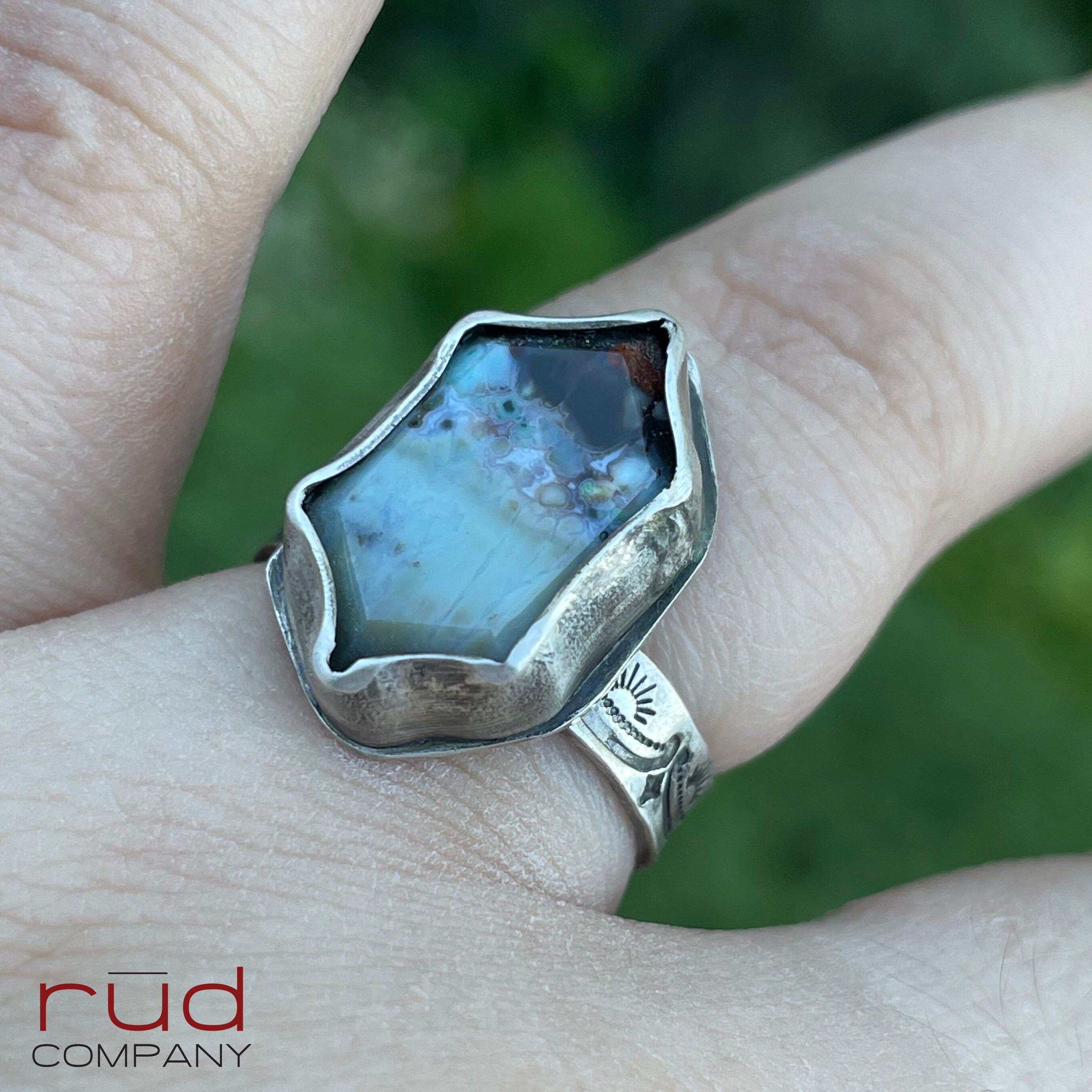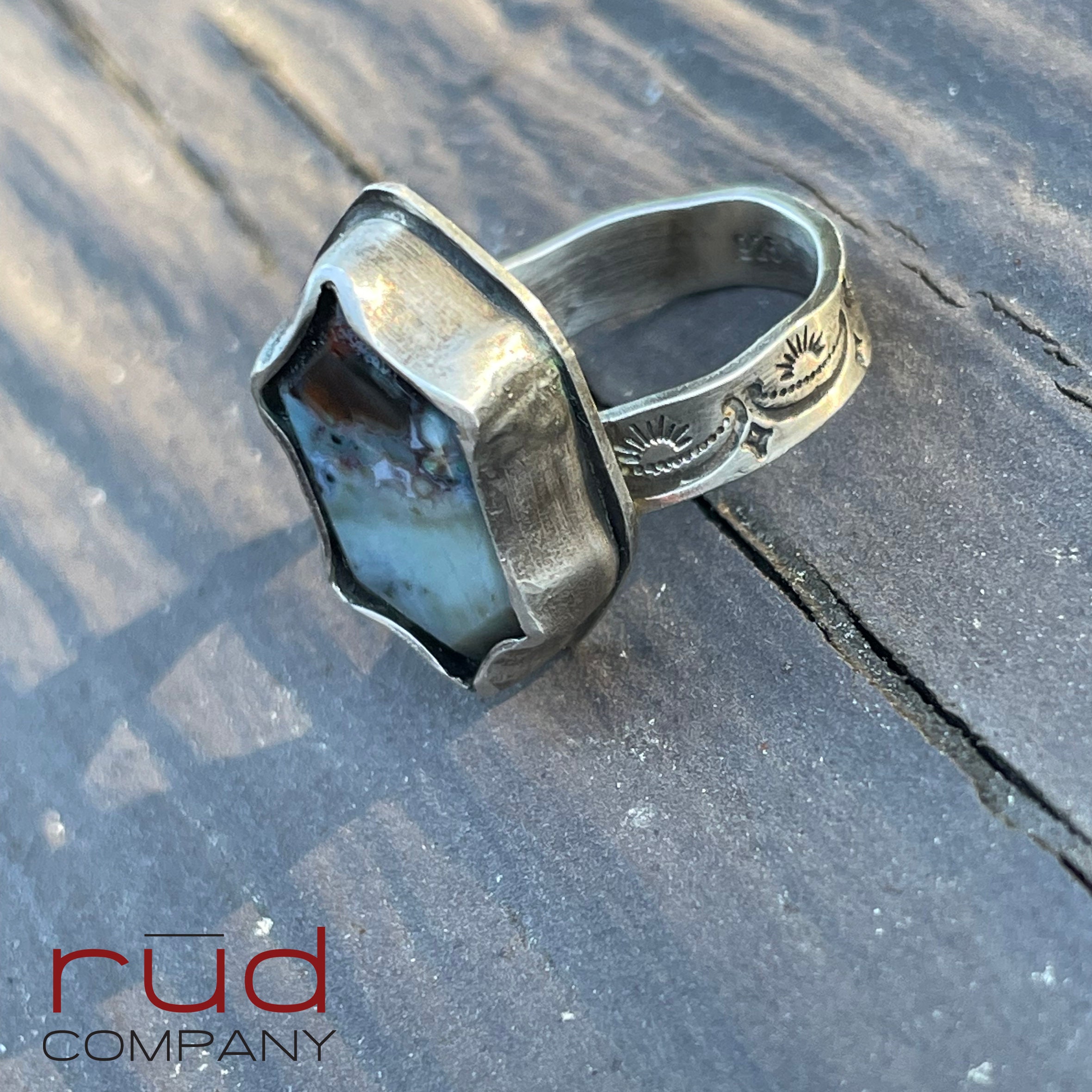 The band of the ring is in itself a piece of art - it shows an alternating theme with a Native American feel. The ring is approximately a size 8.
