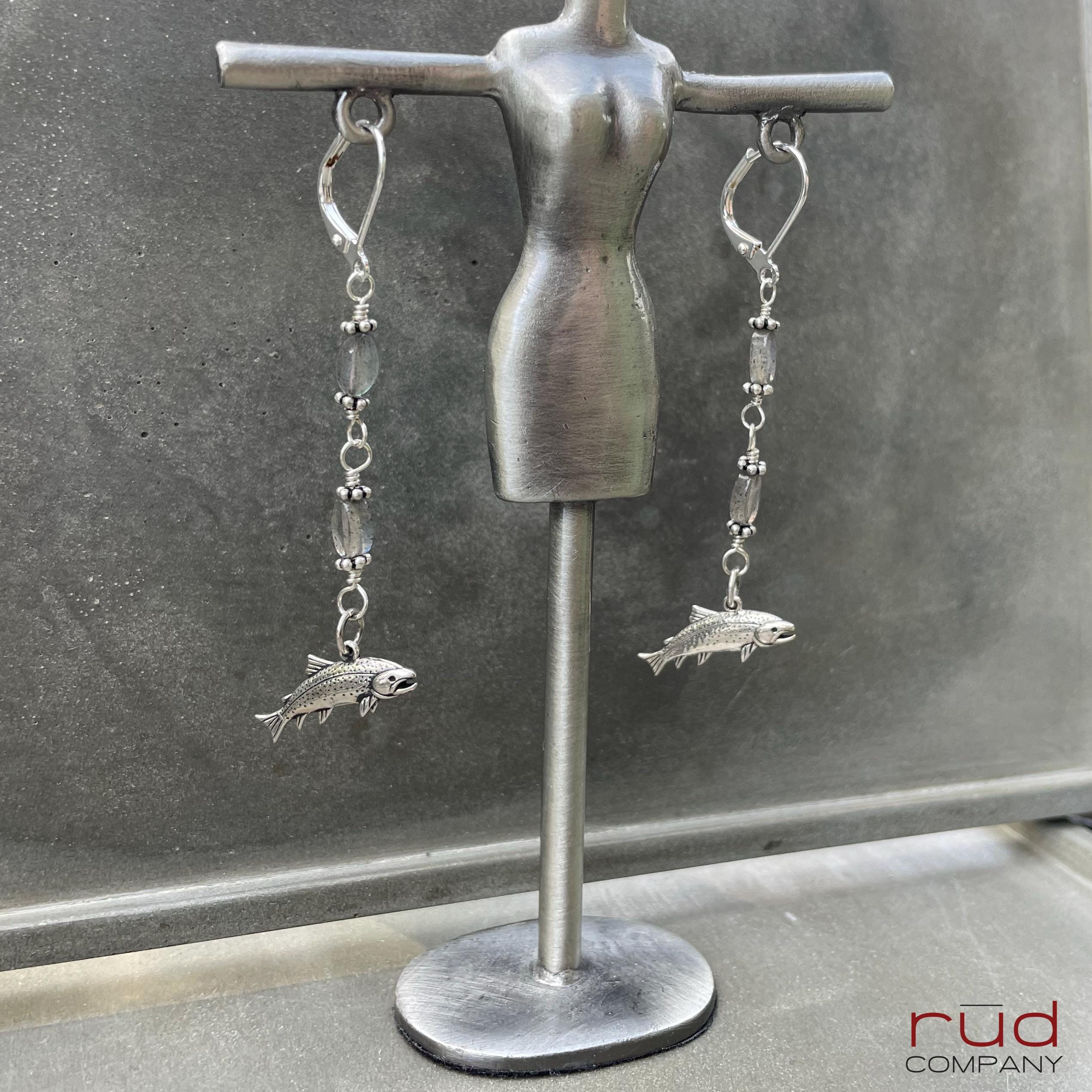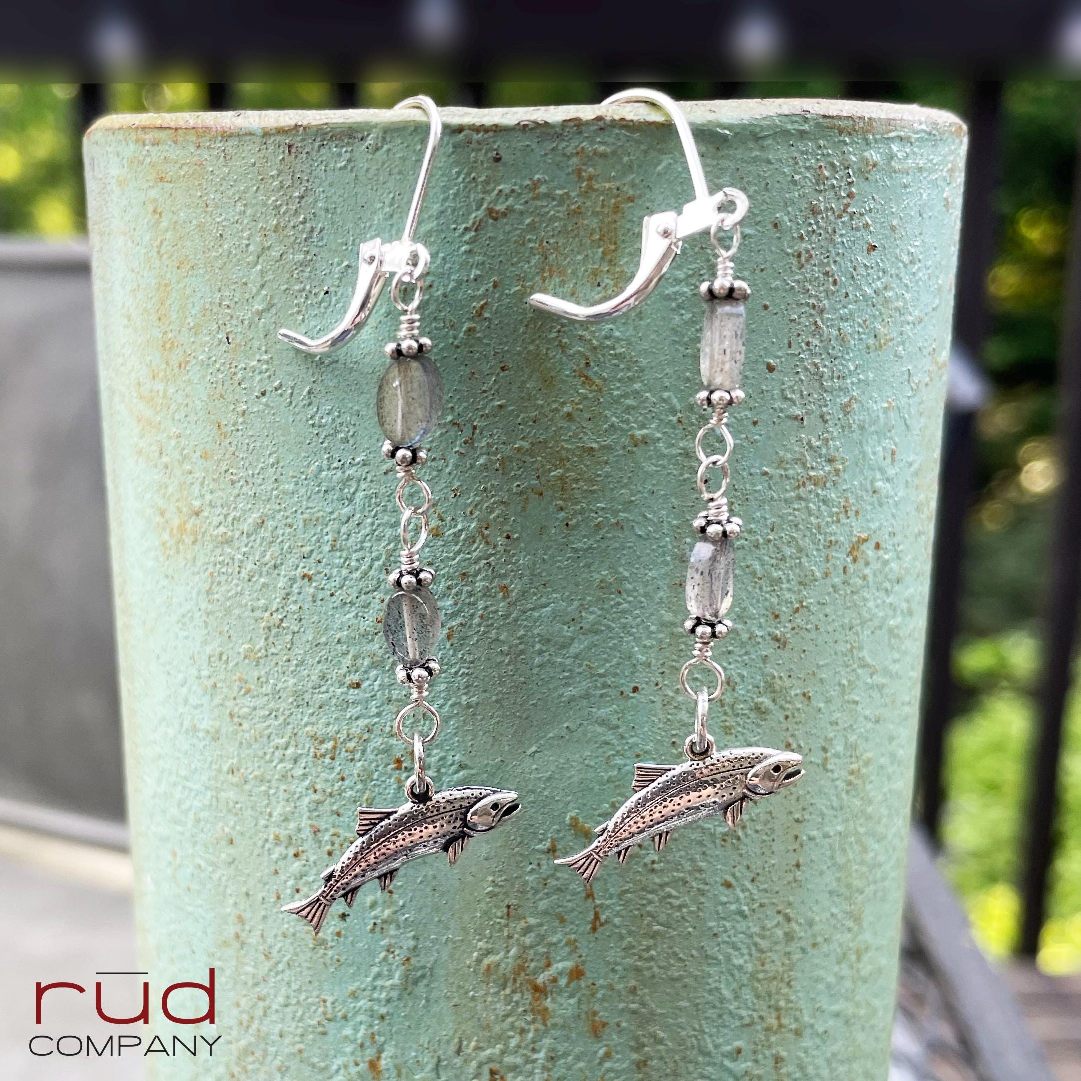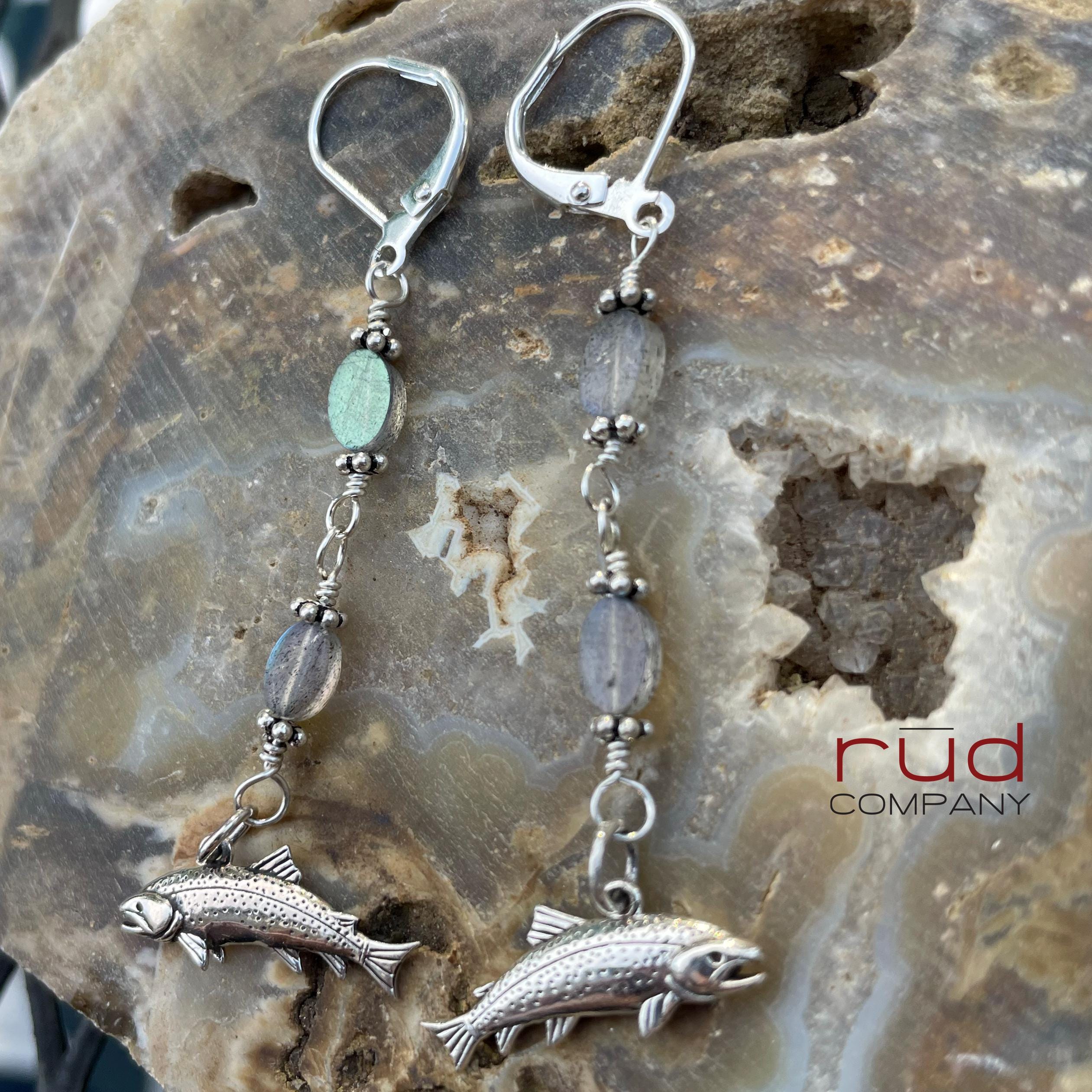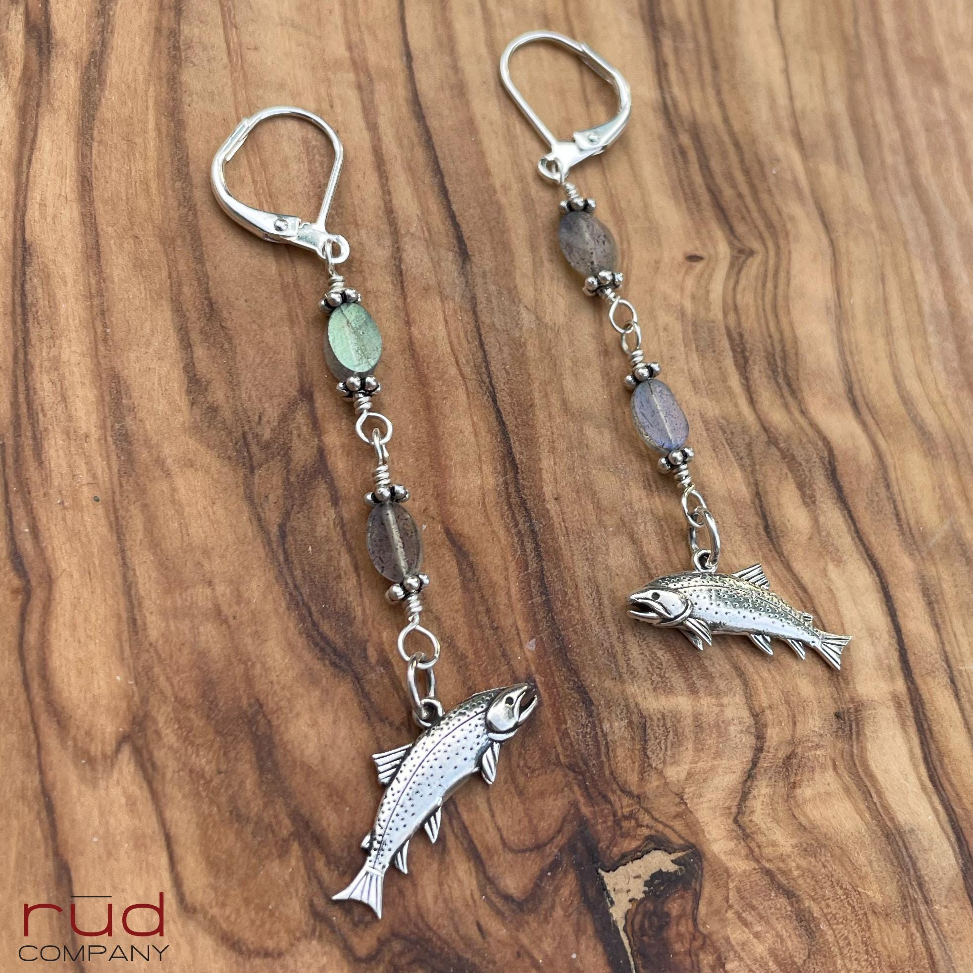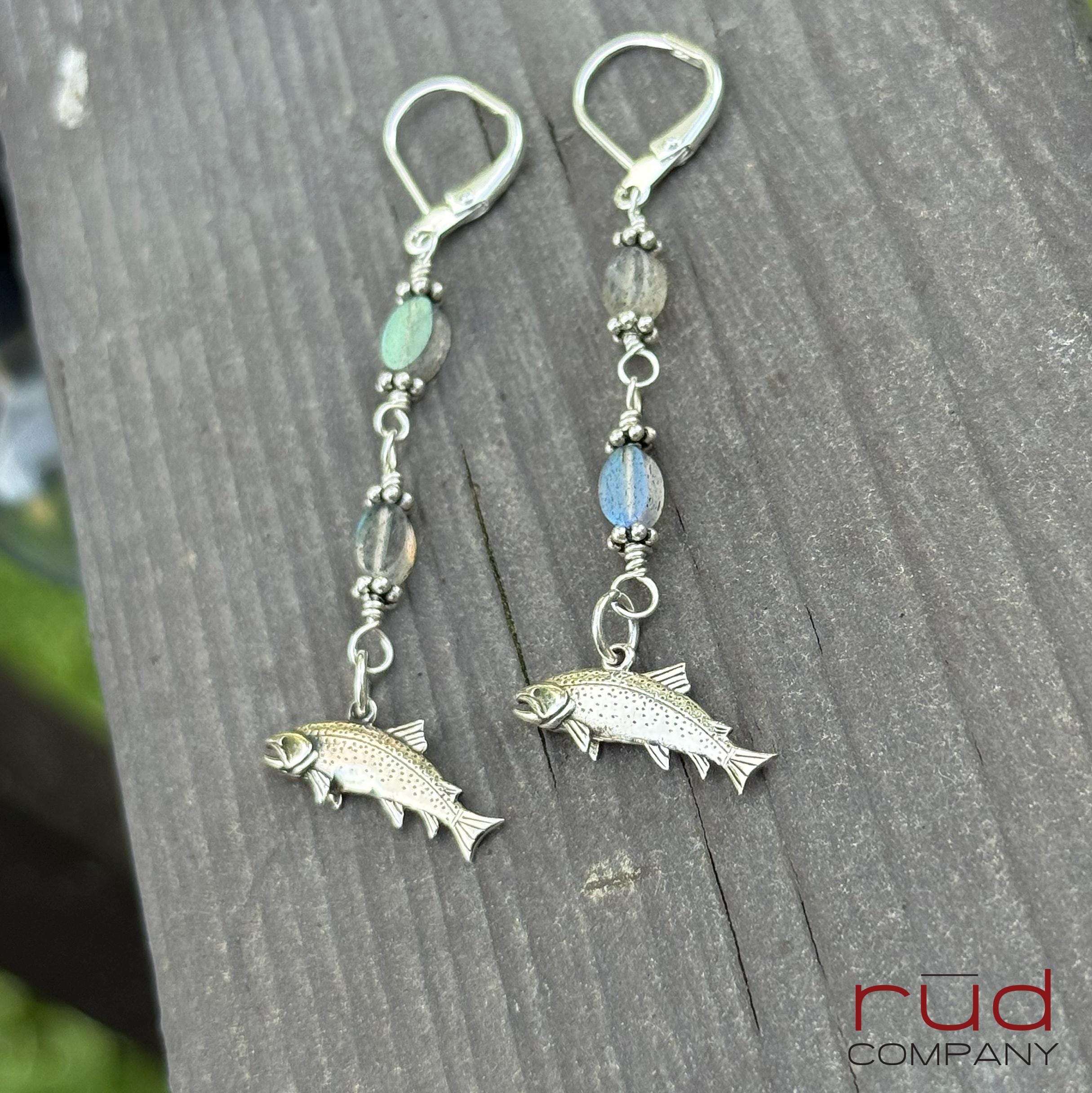 Sterling Silver Rainbow Trout & Labradorite Artisan Earrings, silversmith, dangle earrings, nature, fish earrings, fishing gift camping gift