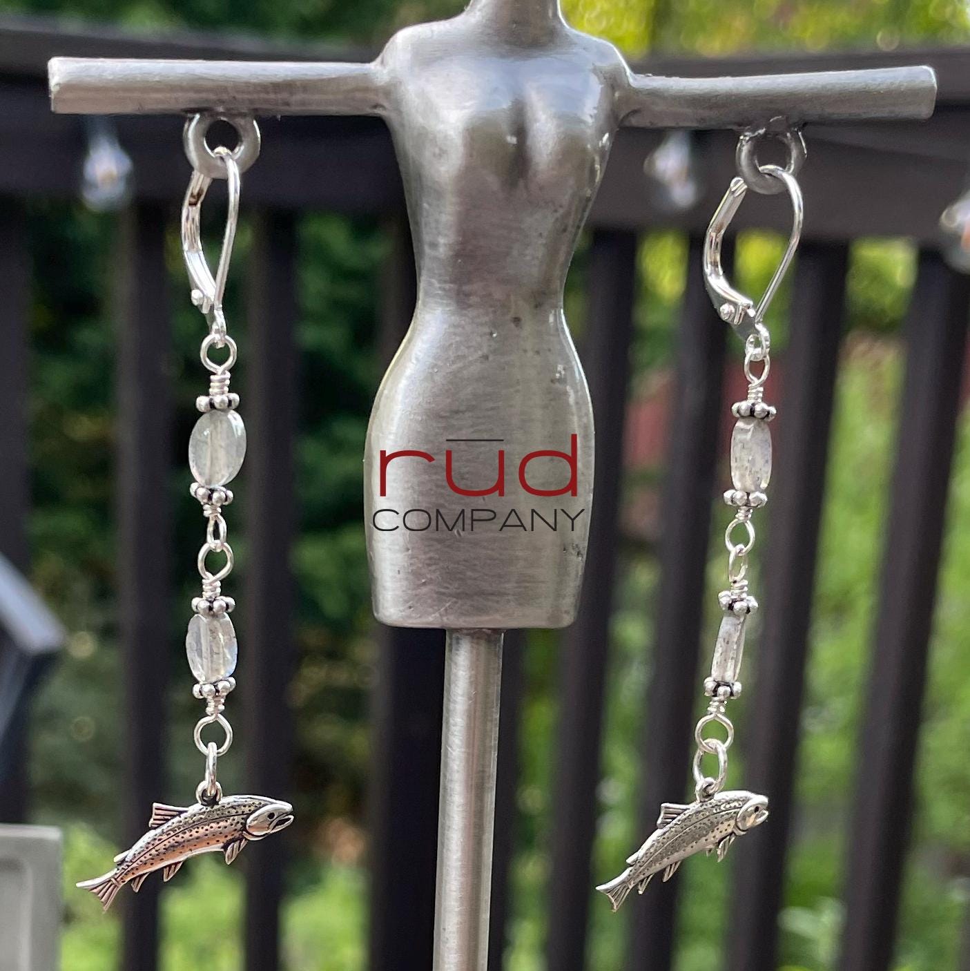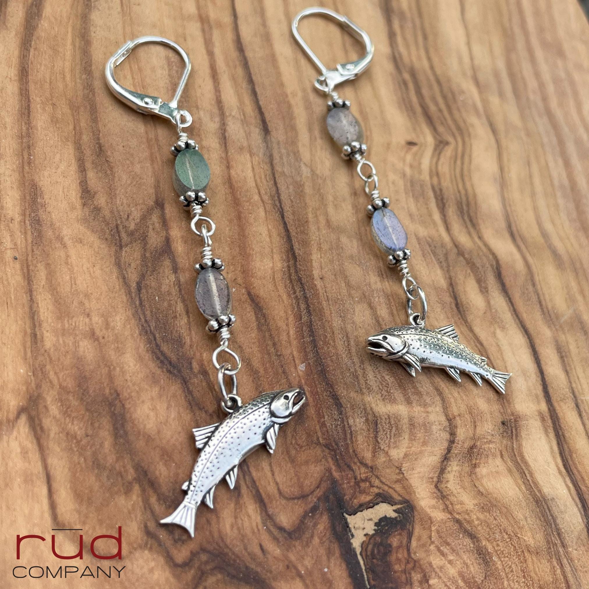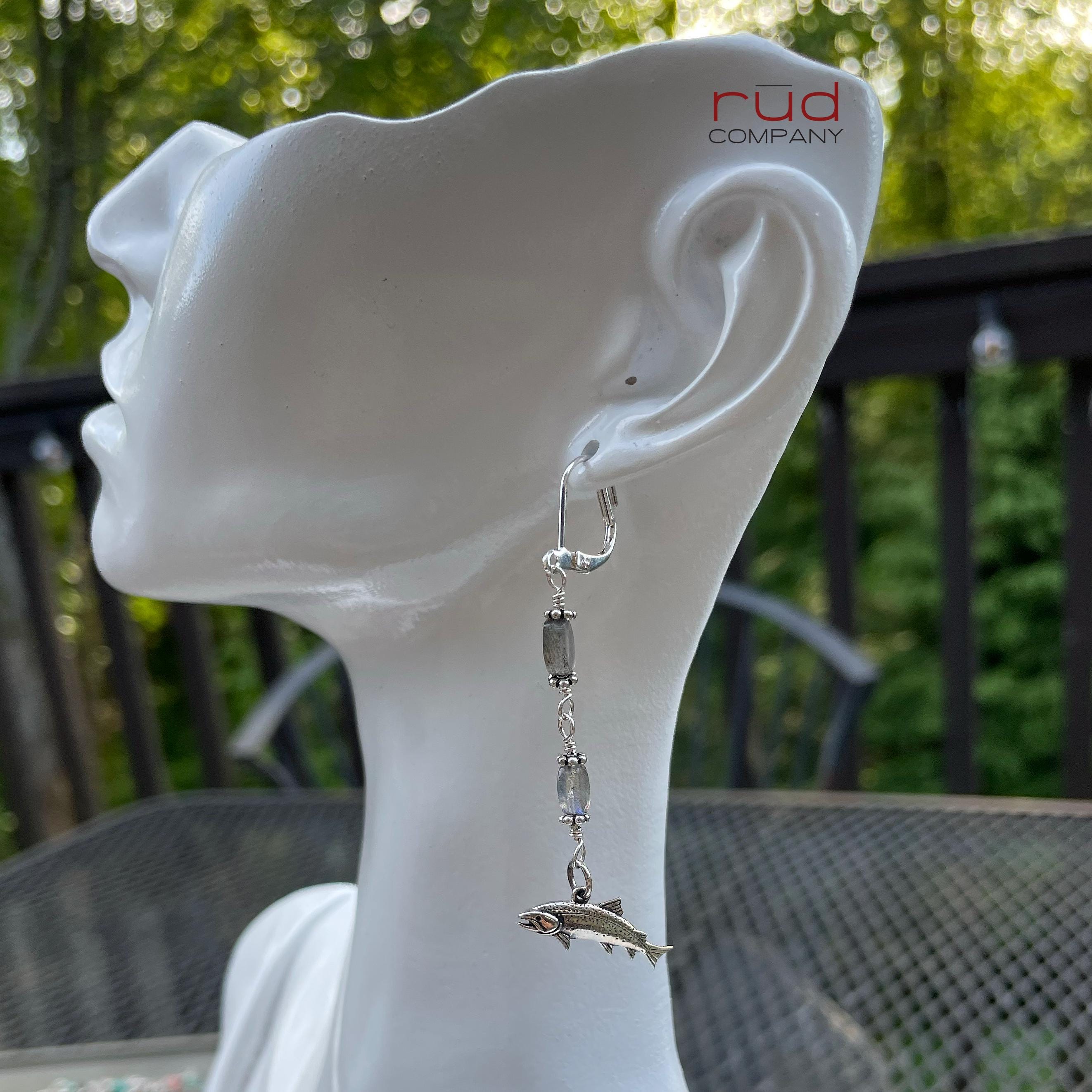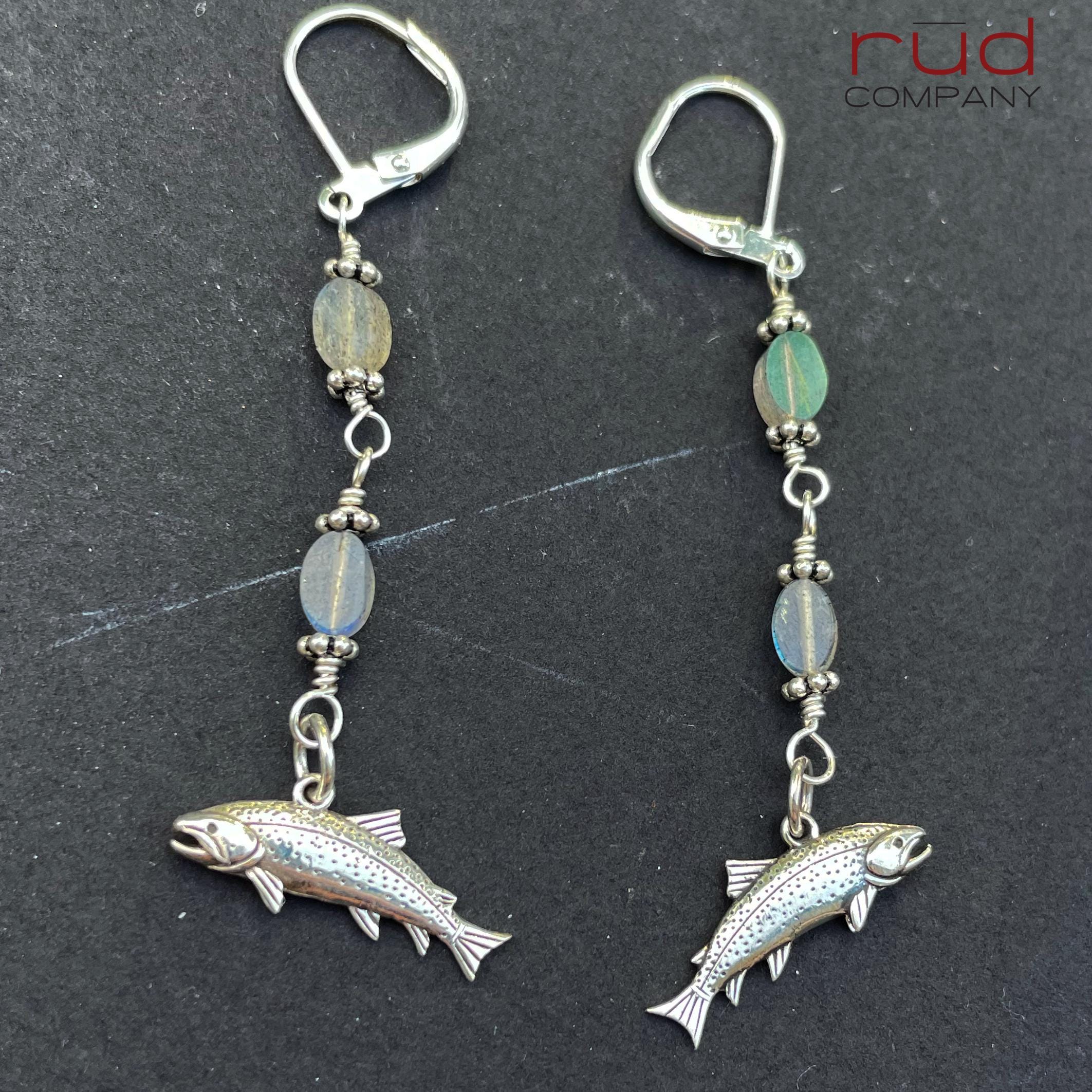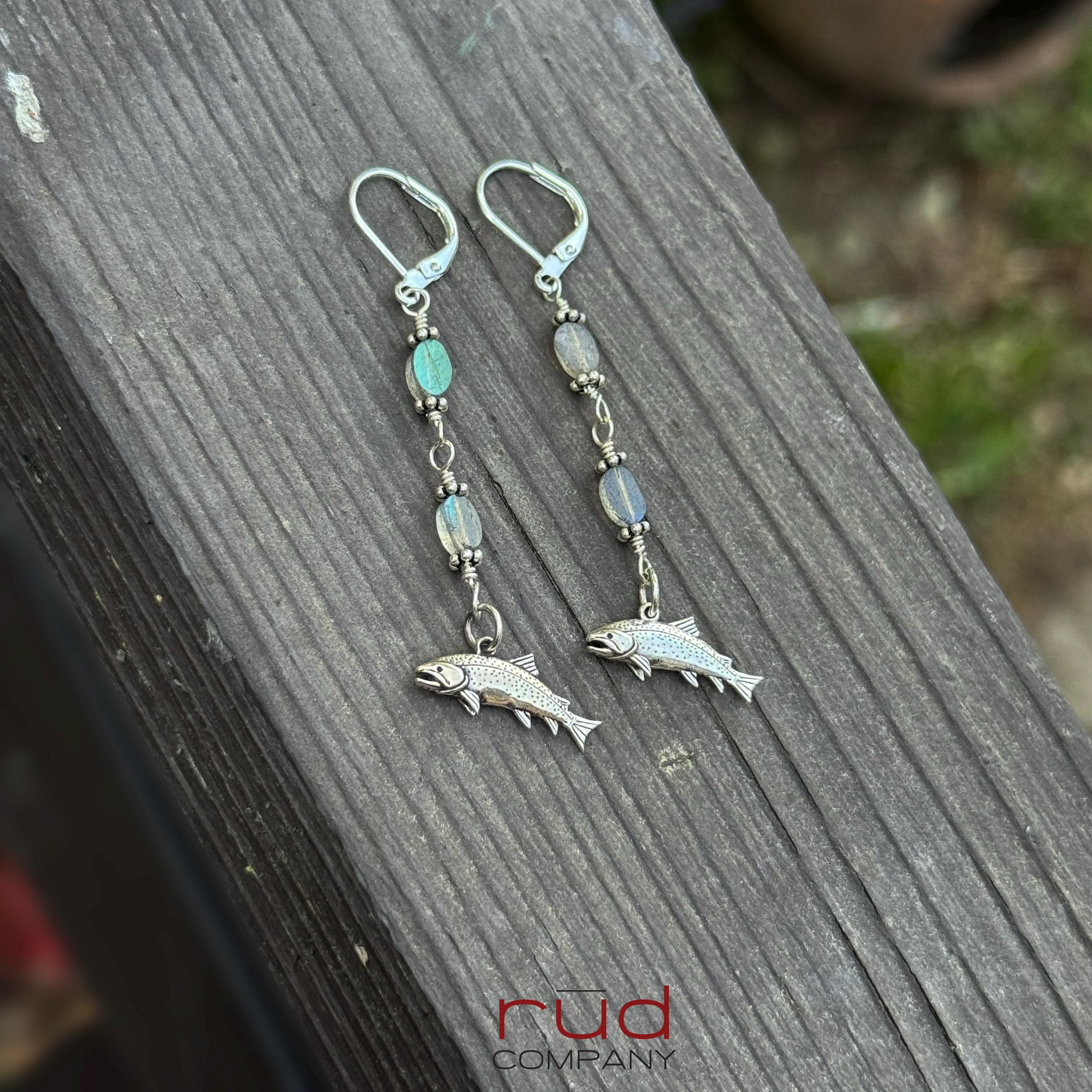 Sterling Silver Rainbow Trout & Labradorite Artisan Earrings, silversmith, dangle earrings, nature, fish earrings, fishing gift camping gift