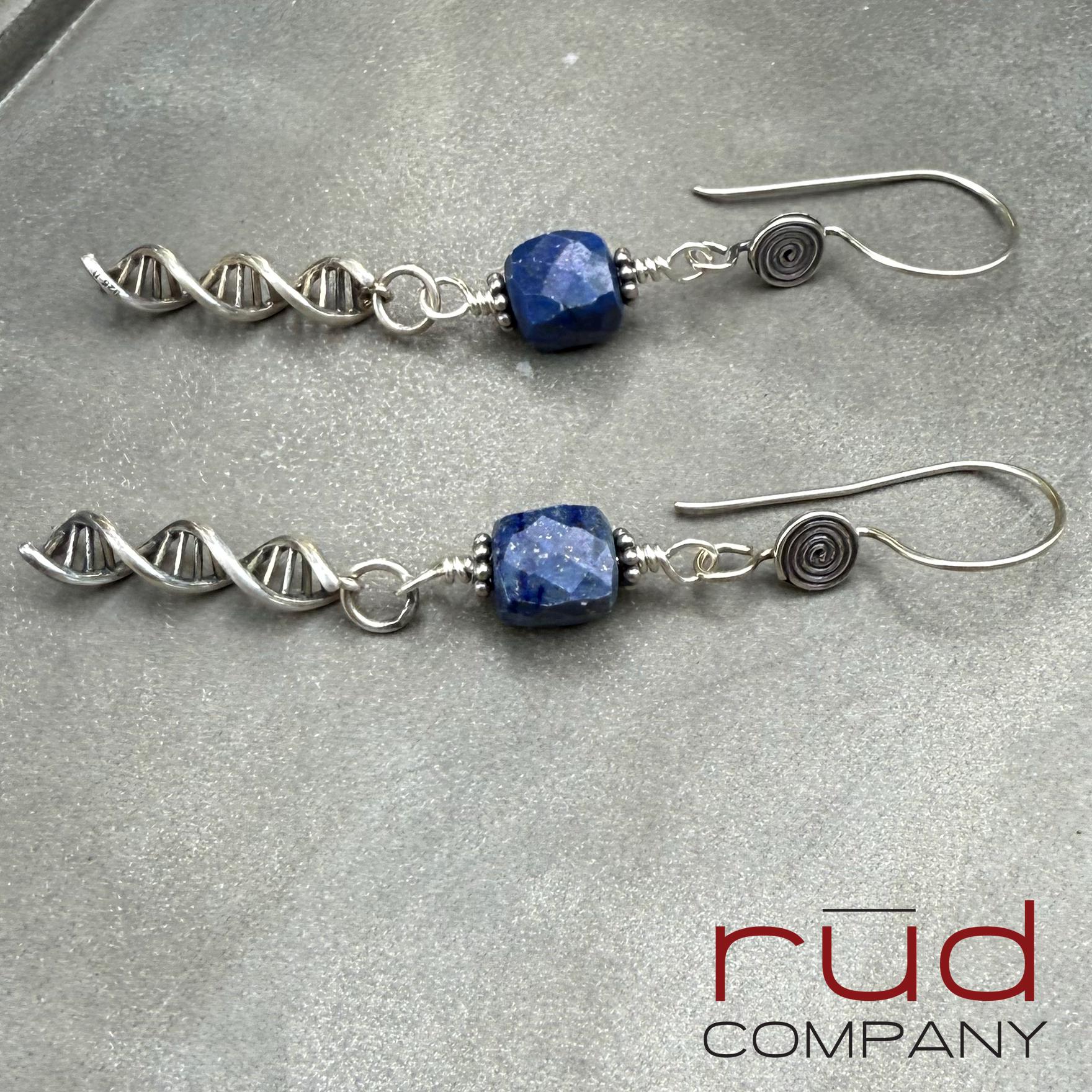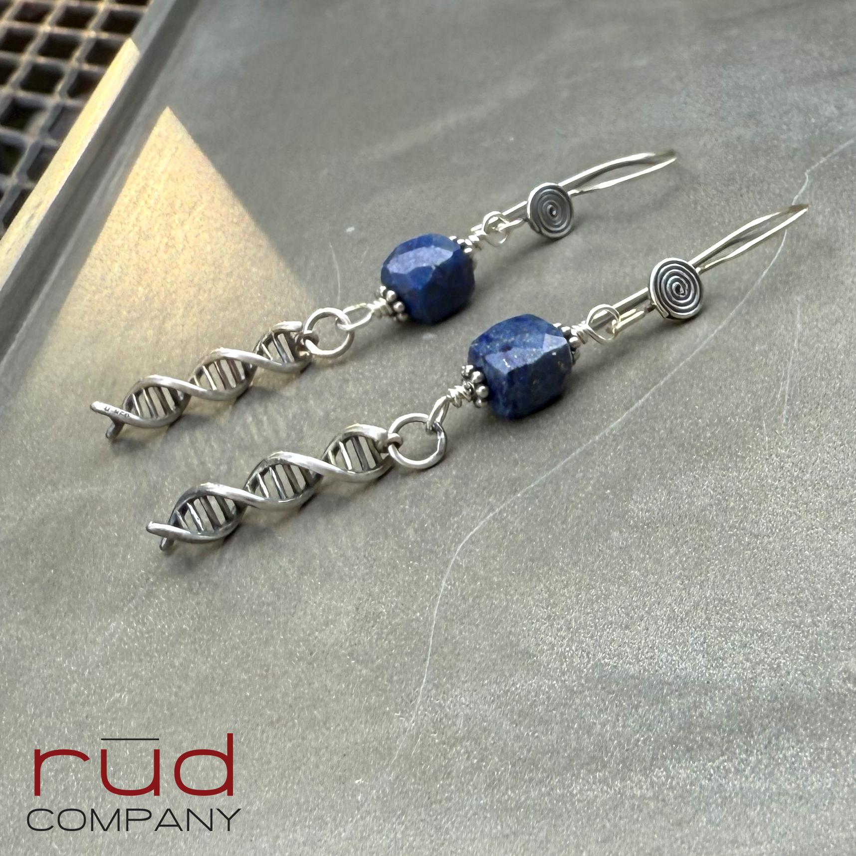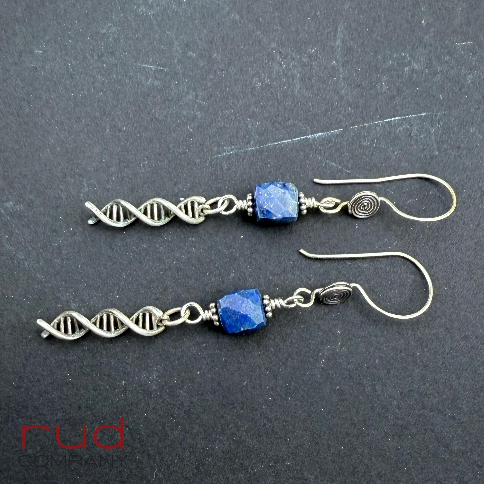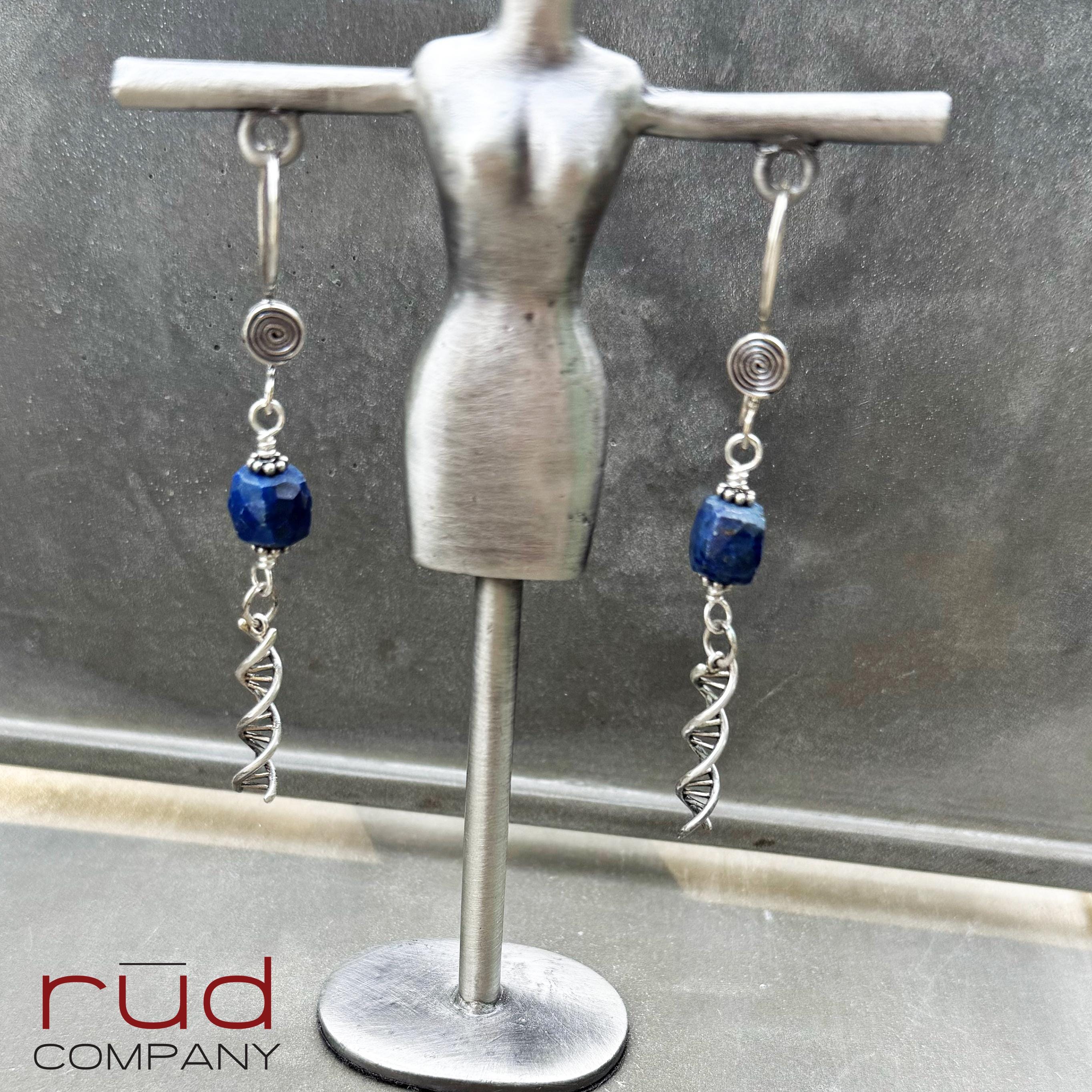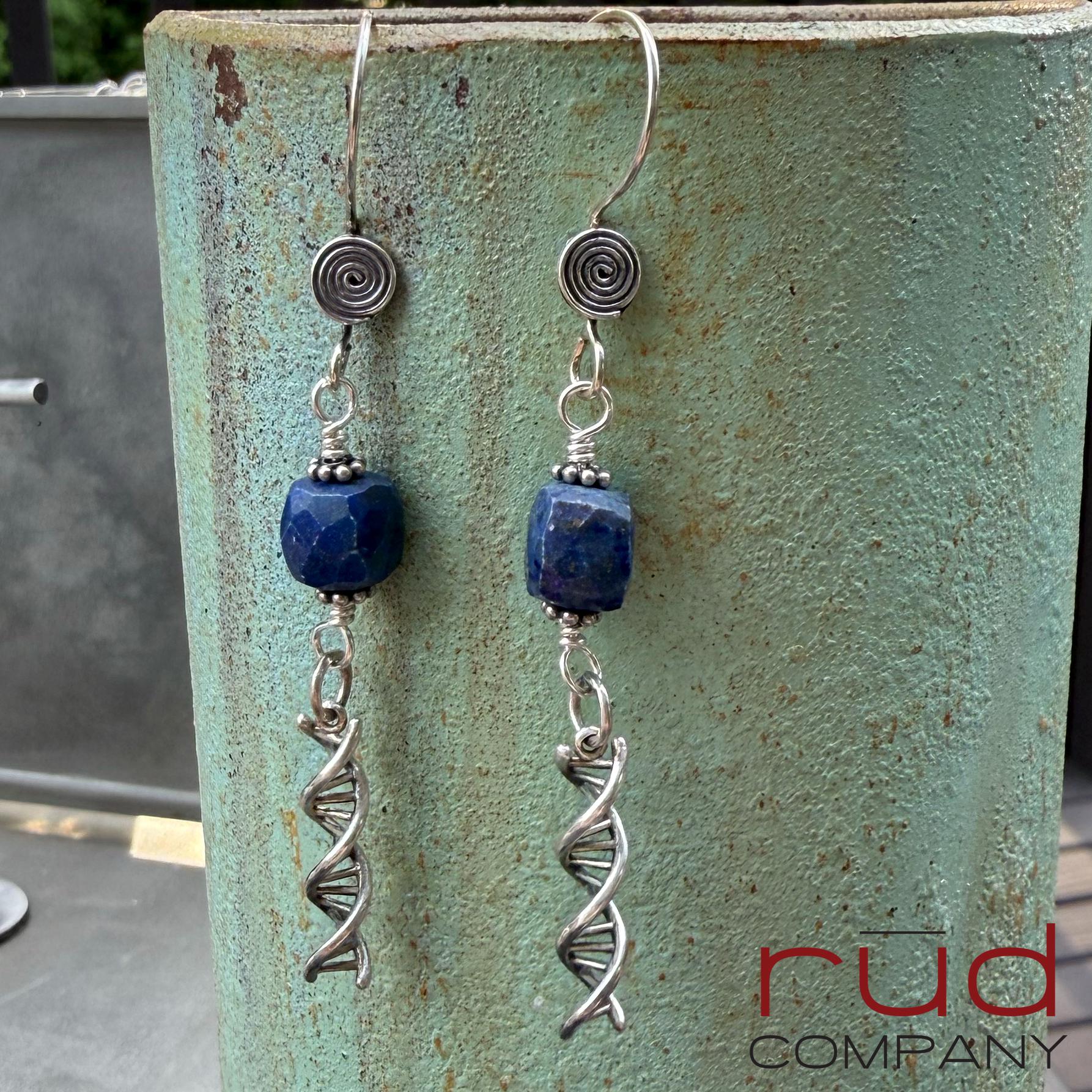 Sterling Silver DNA spiral drops & Lapis Lazuli cubes Artisan Earrings, dangle delicate handmade high quality, chemistry or lab gift, family