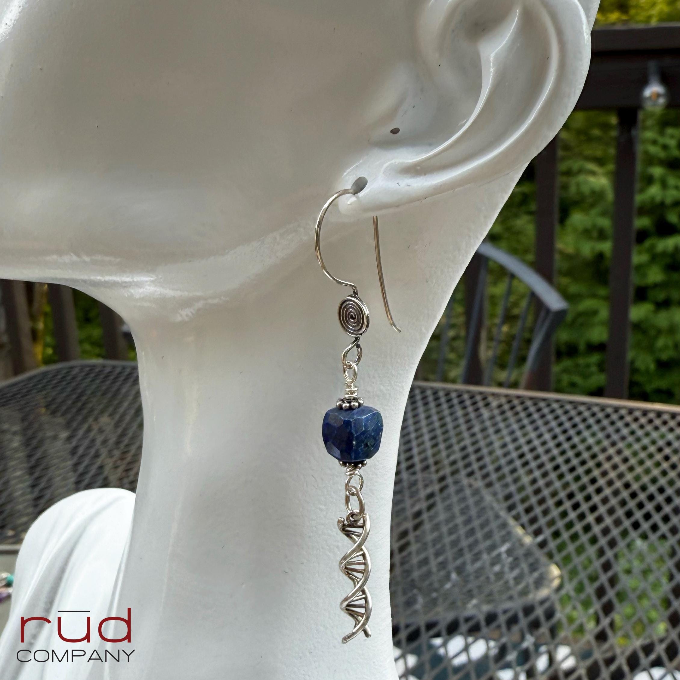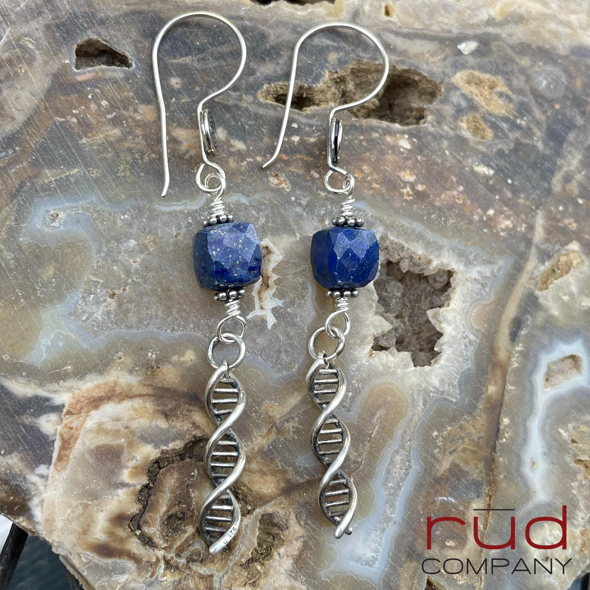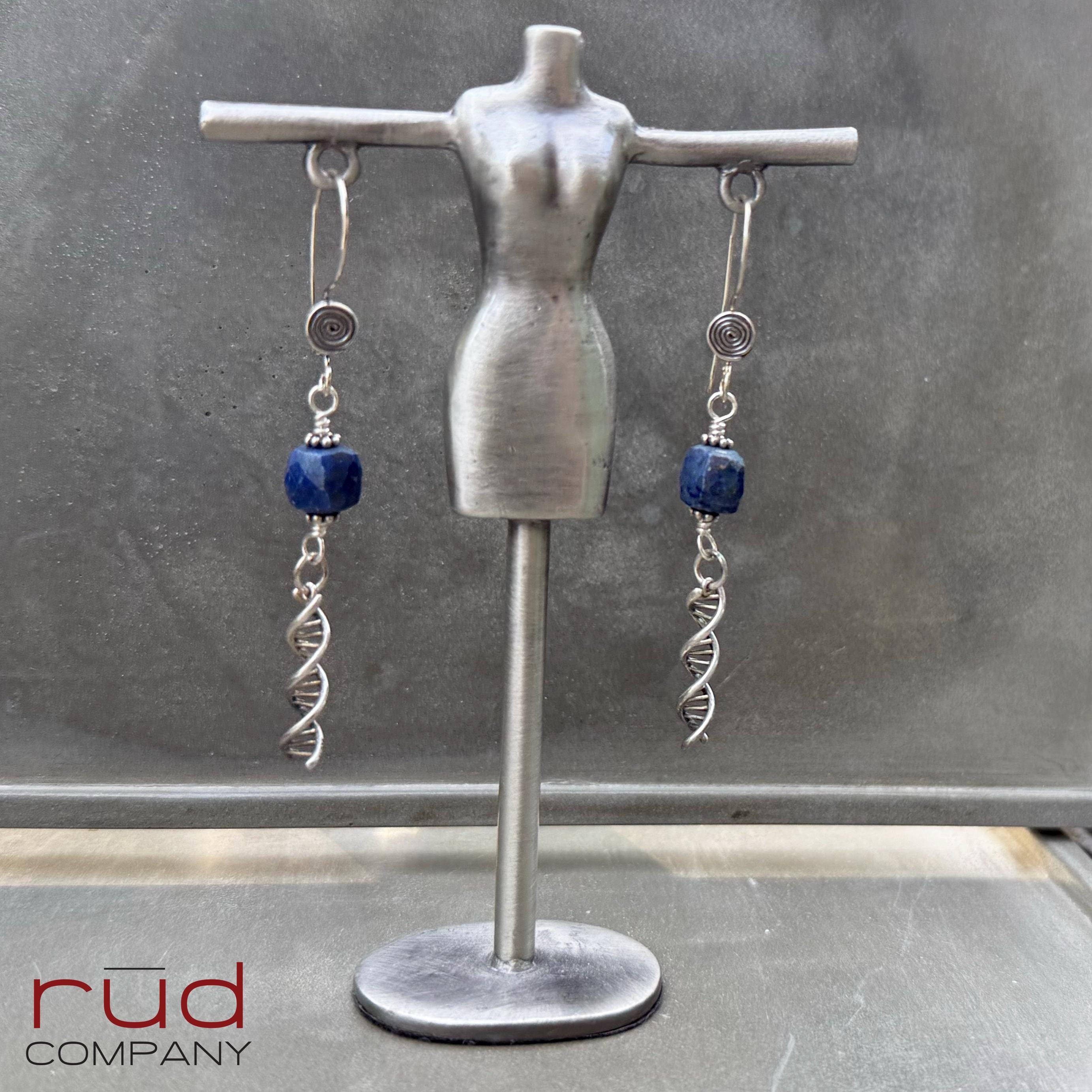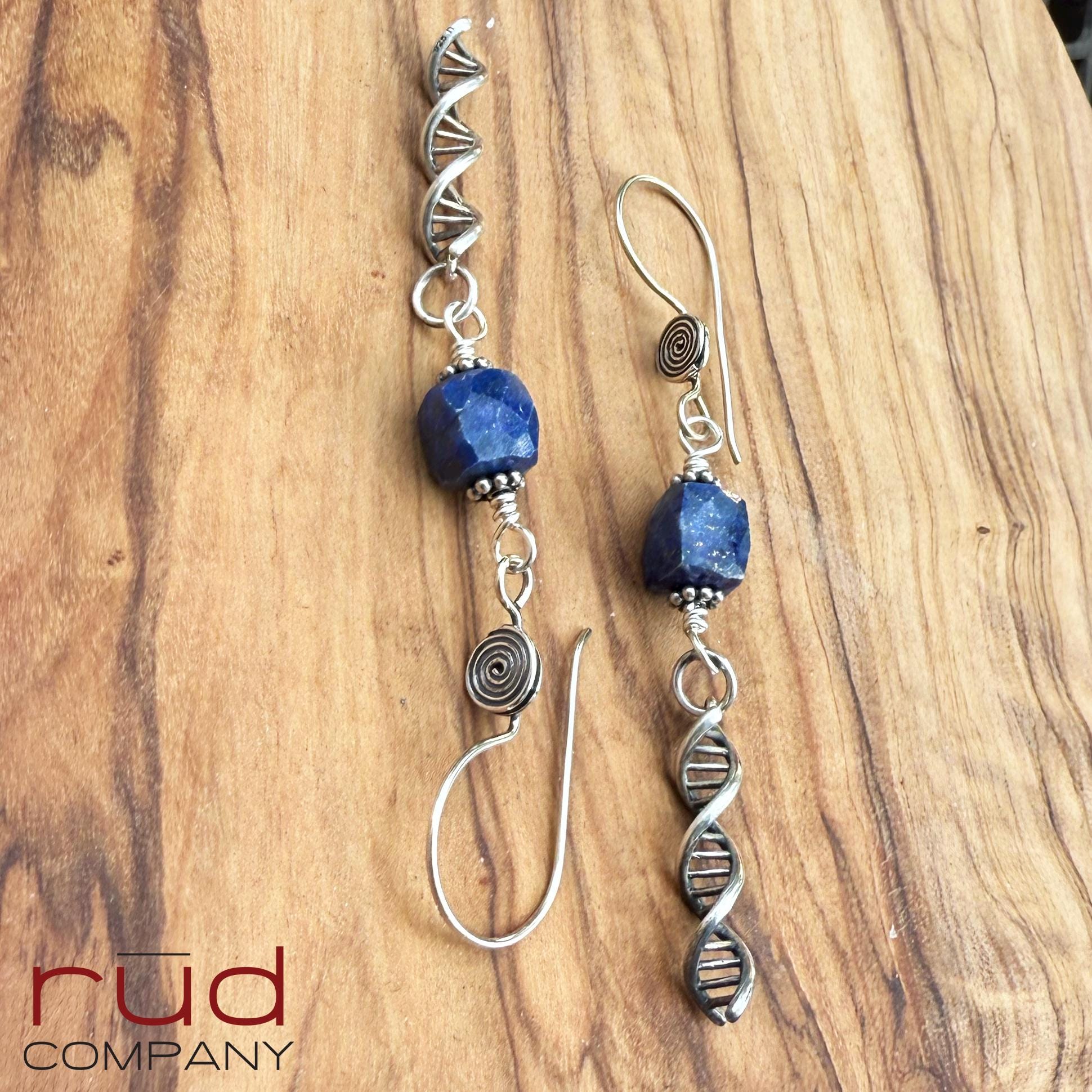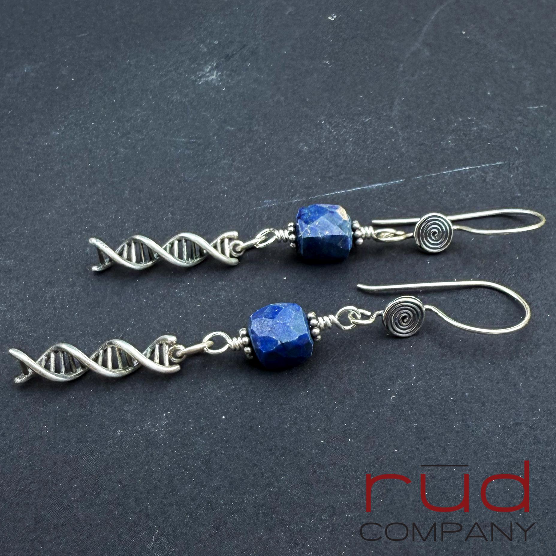 Sterling Silver DNA spiral drops & Lapis Lazuli cubes Artisan Earrings, dangle delicate handmade high quality, chemistry or lab gift, family