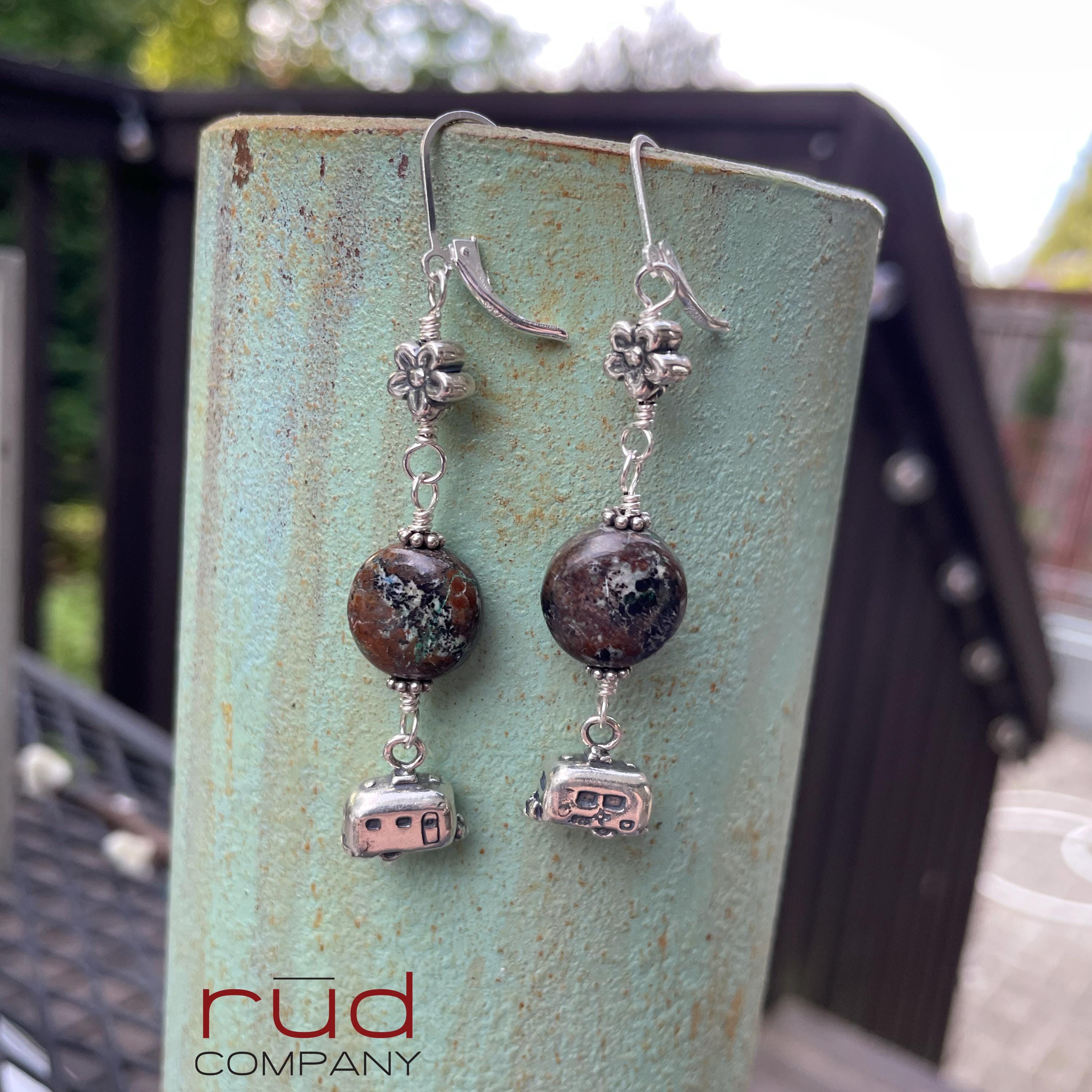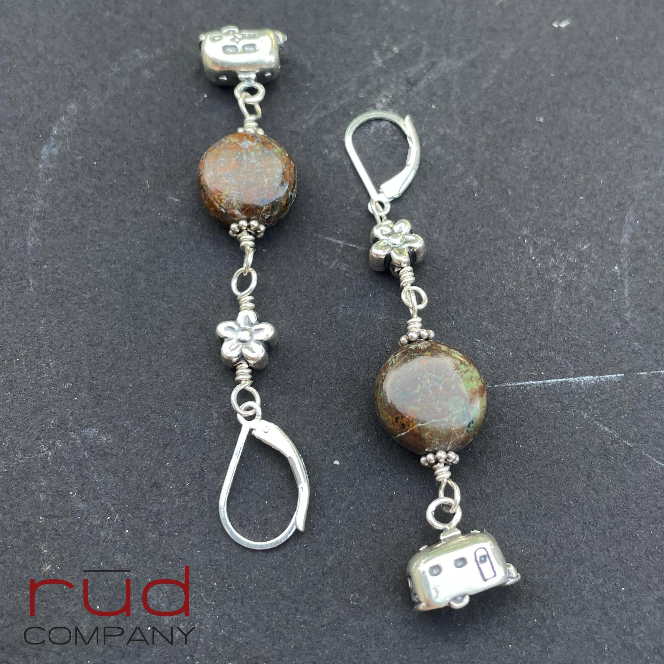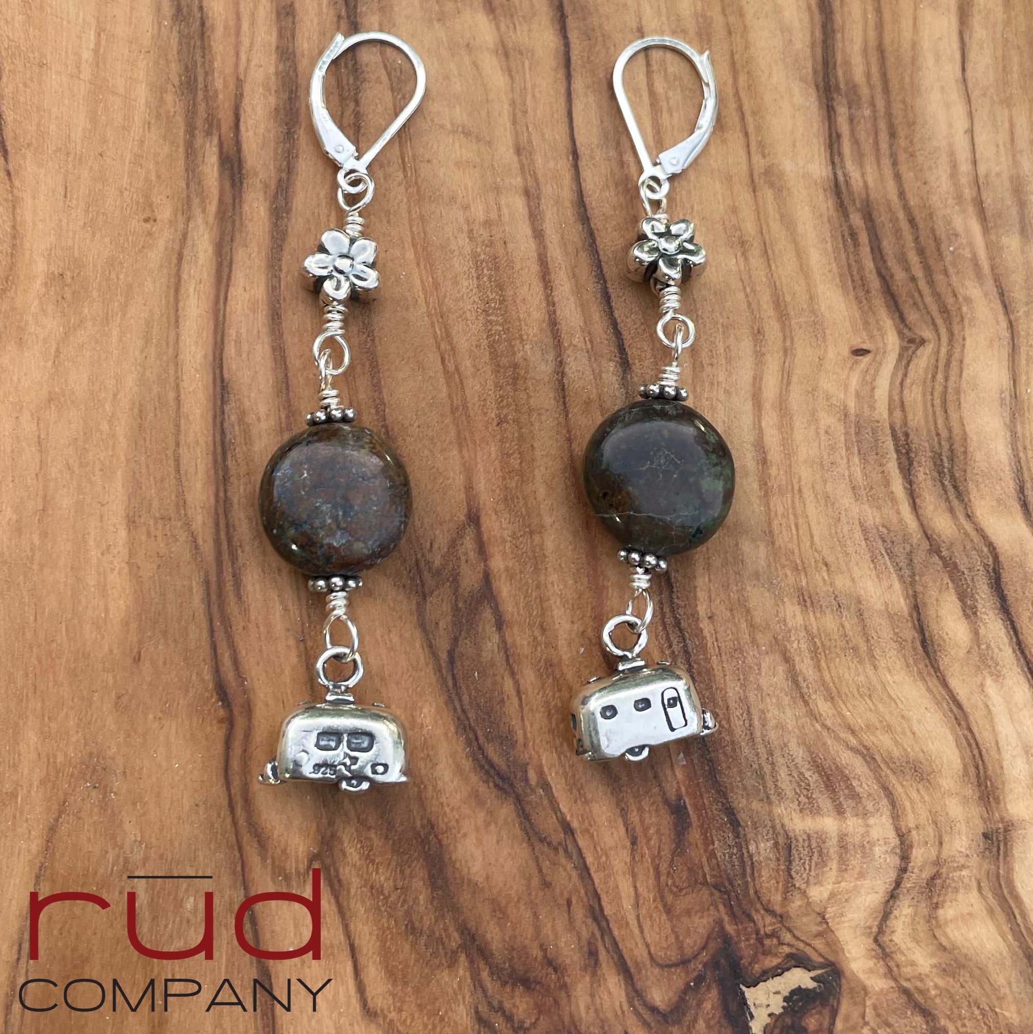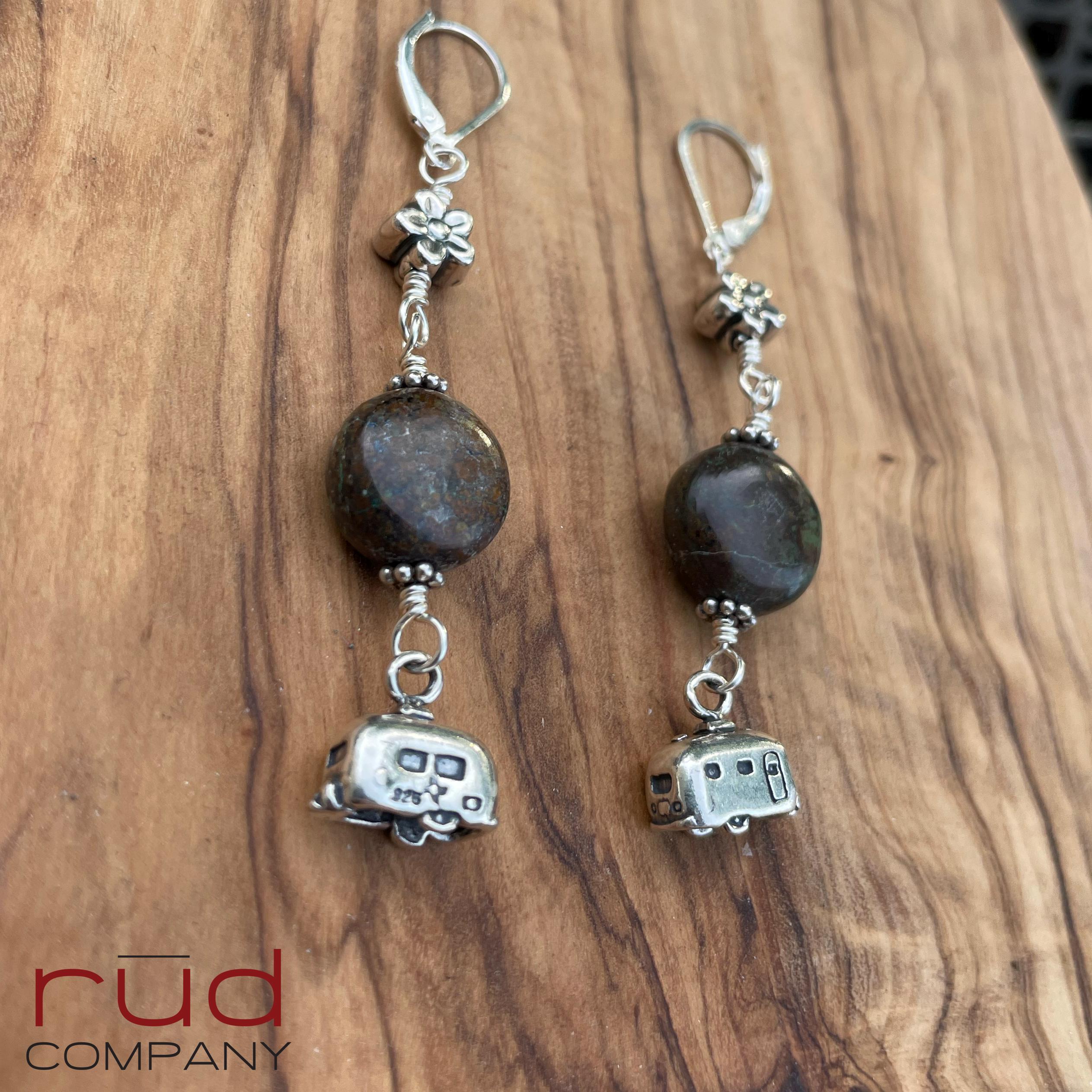 These earrings are so fun! They are classy and made to last. The brown turquoise fits the theme perfectly, and little sterling flowers at the top. The camping trailer charms are 2-sided and quite realistic! Approximately 2.5" long from the top of the leverback earwires. The leverbacks ensure you will not lose these lovely earrings. These are one of a kind, and will complement most any occasion or style. A super fun gift. These earrings will absolutely delight whoever is so lucky to receive them :)