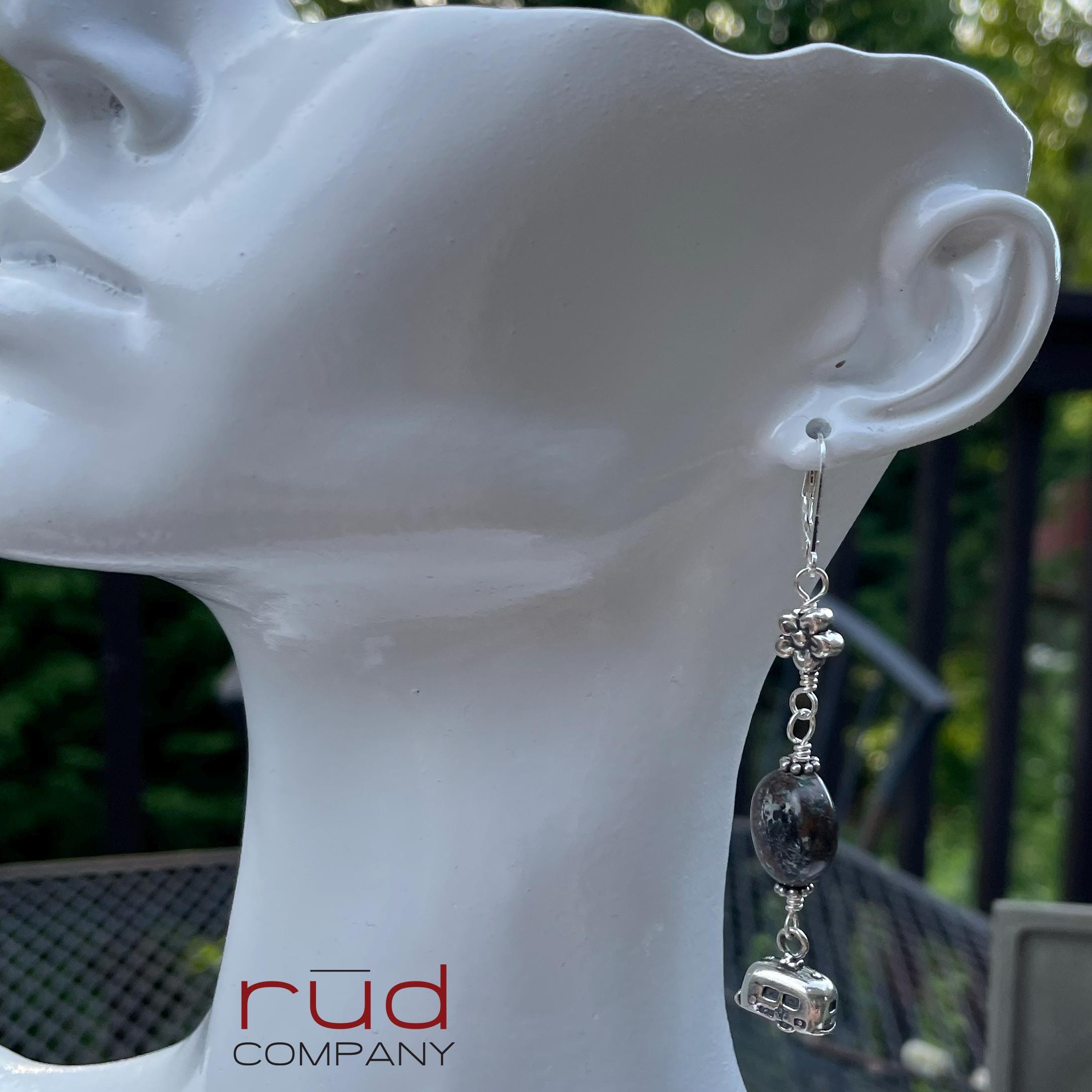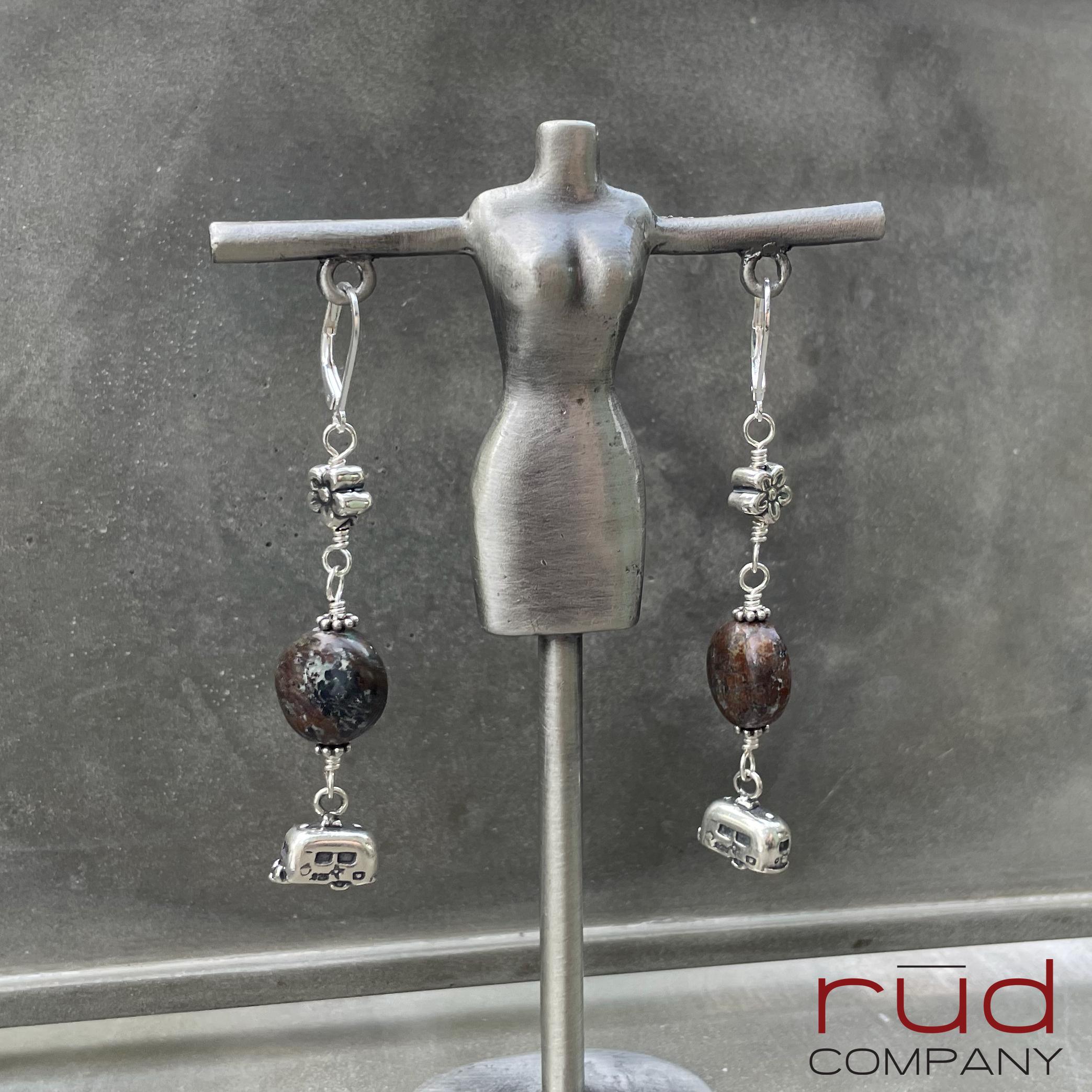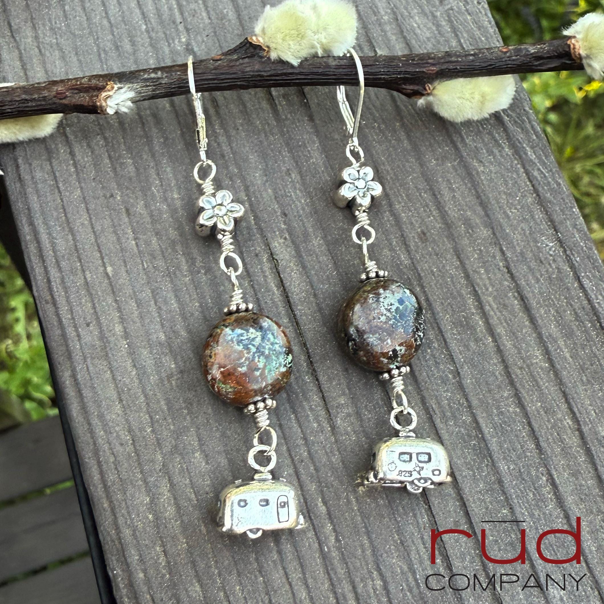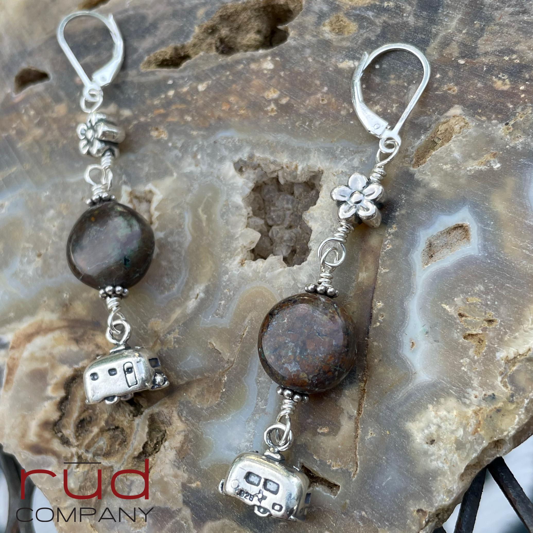 These earrings are so fun! They are classy and made to last. The brown turquoise fits the theme perfectly, and little sterling flowers at the top. The camping trailer charms are 2-sided and quite realistic! Approximately 2.5" long from the top of the leverback earwires. The leverbacks ensure you will not lose these lovely earrings. These are one of a kind, and will complement most any occasion or style. A super fun gift. These earrings will absolutely delight whoever is so lucky to receive them :)