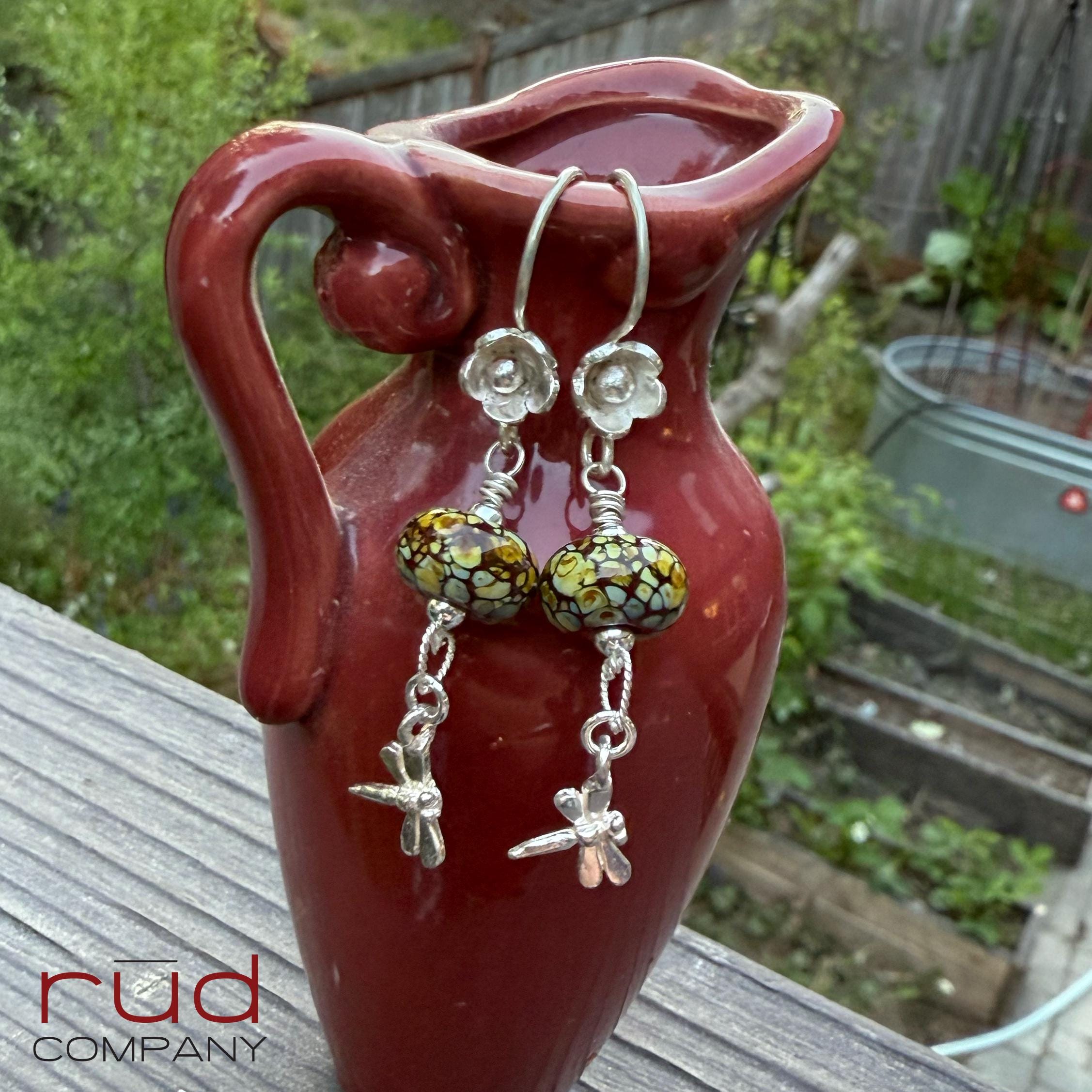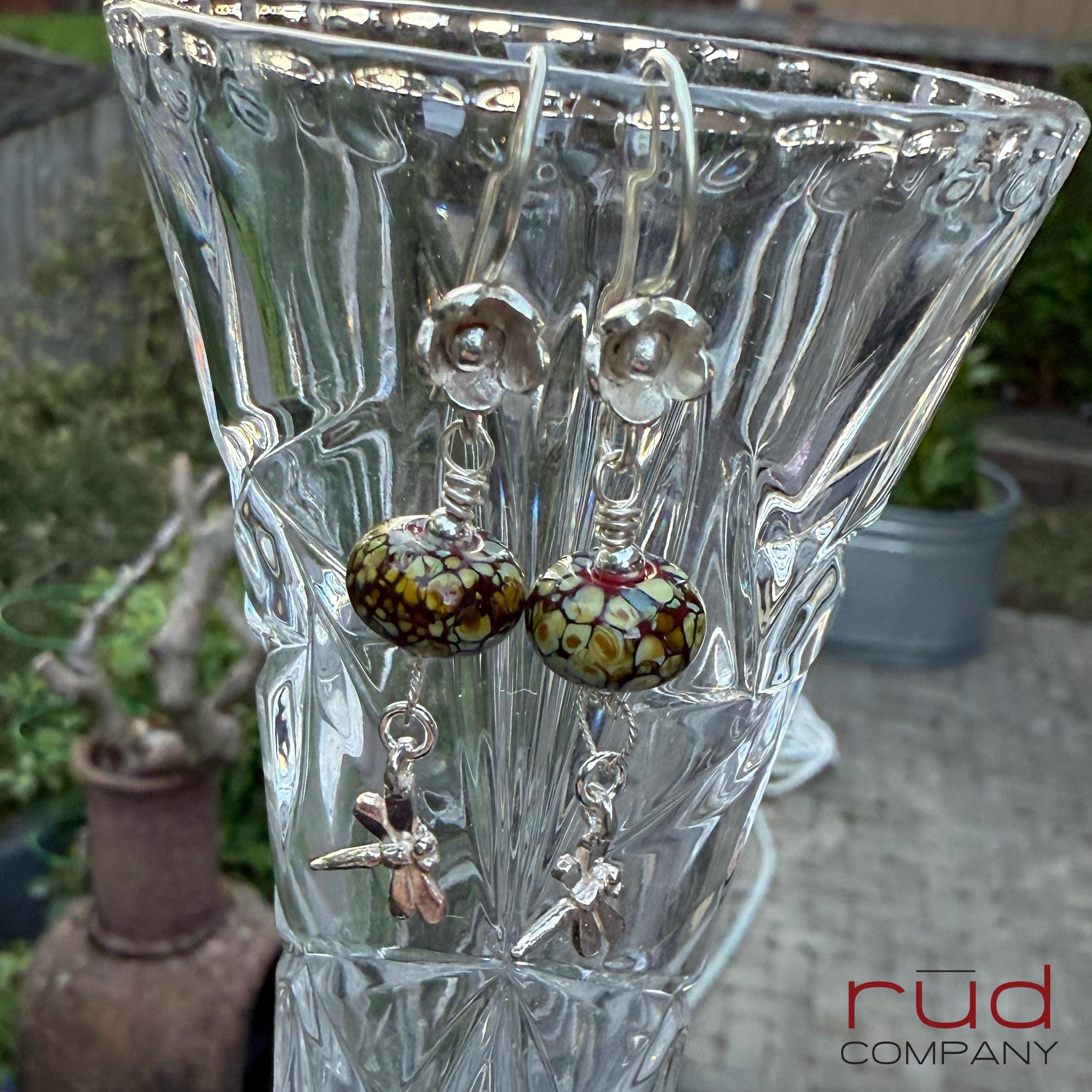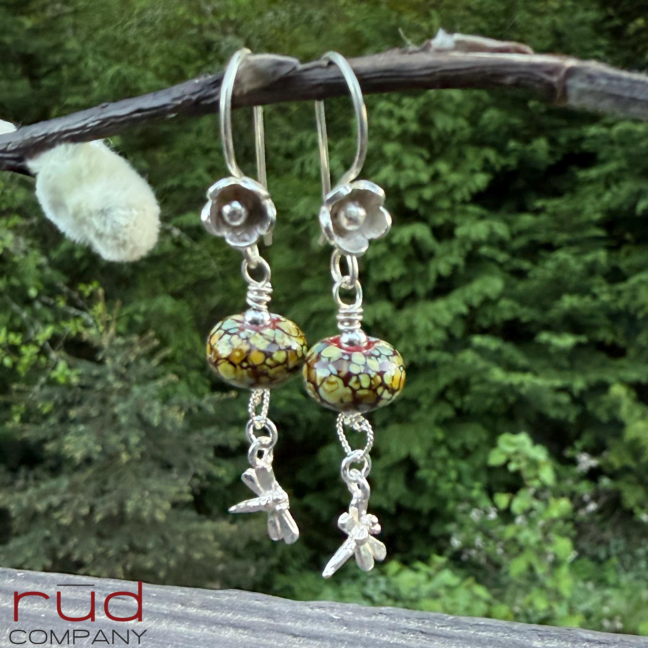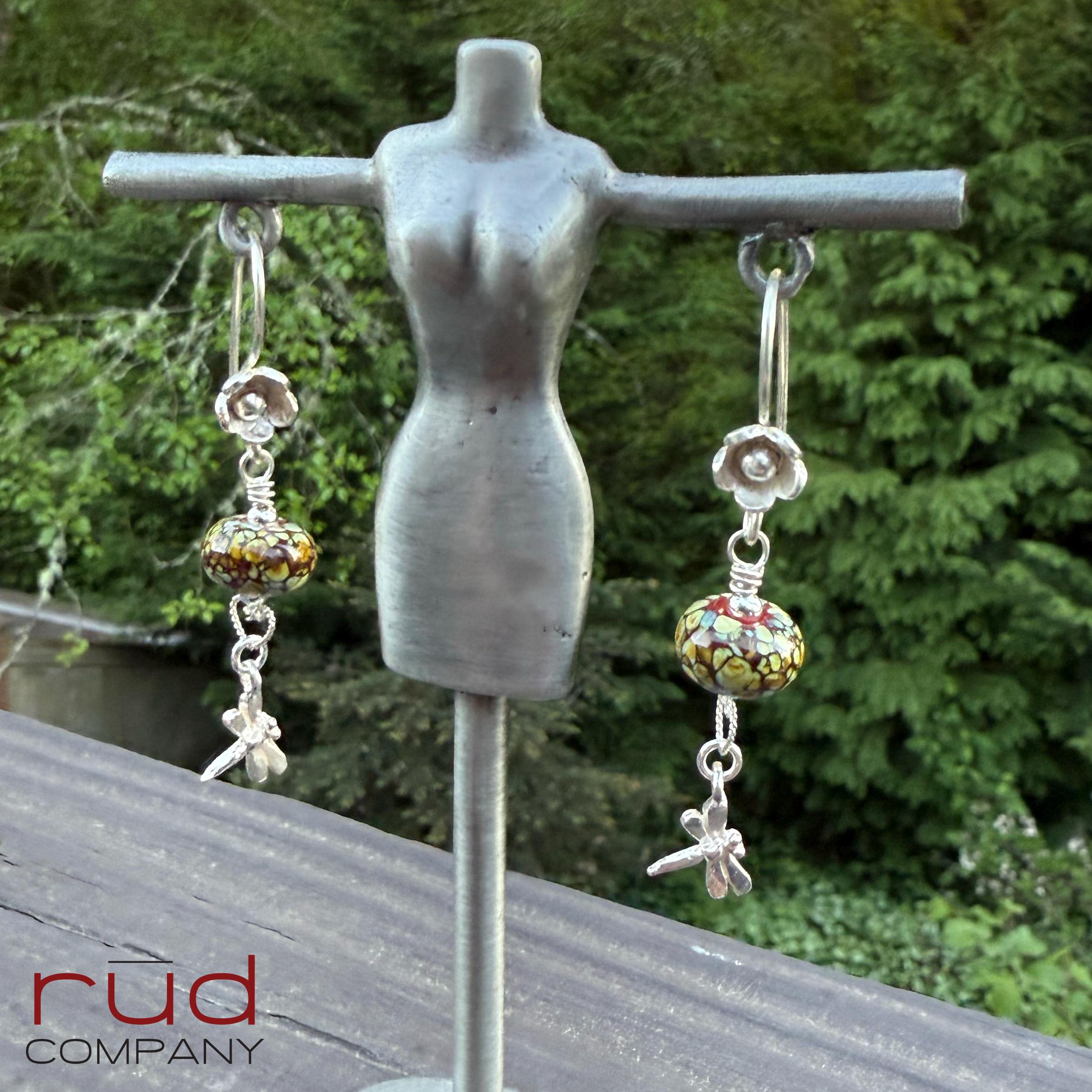 Sterling Silver Dragonfly & USA Lampwork Glass Frit Artisan Earrings, silversmith, dangle earrings, flower with confetti red yellow green