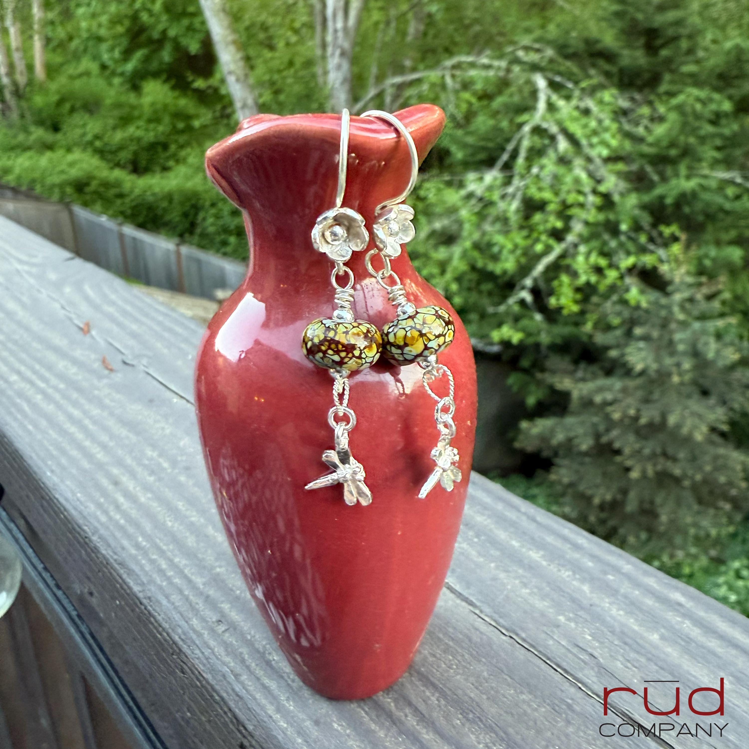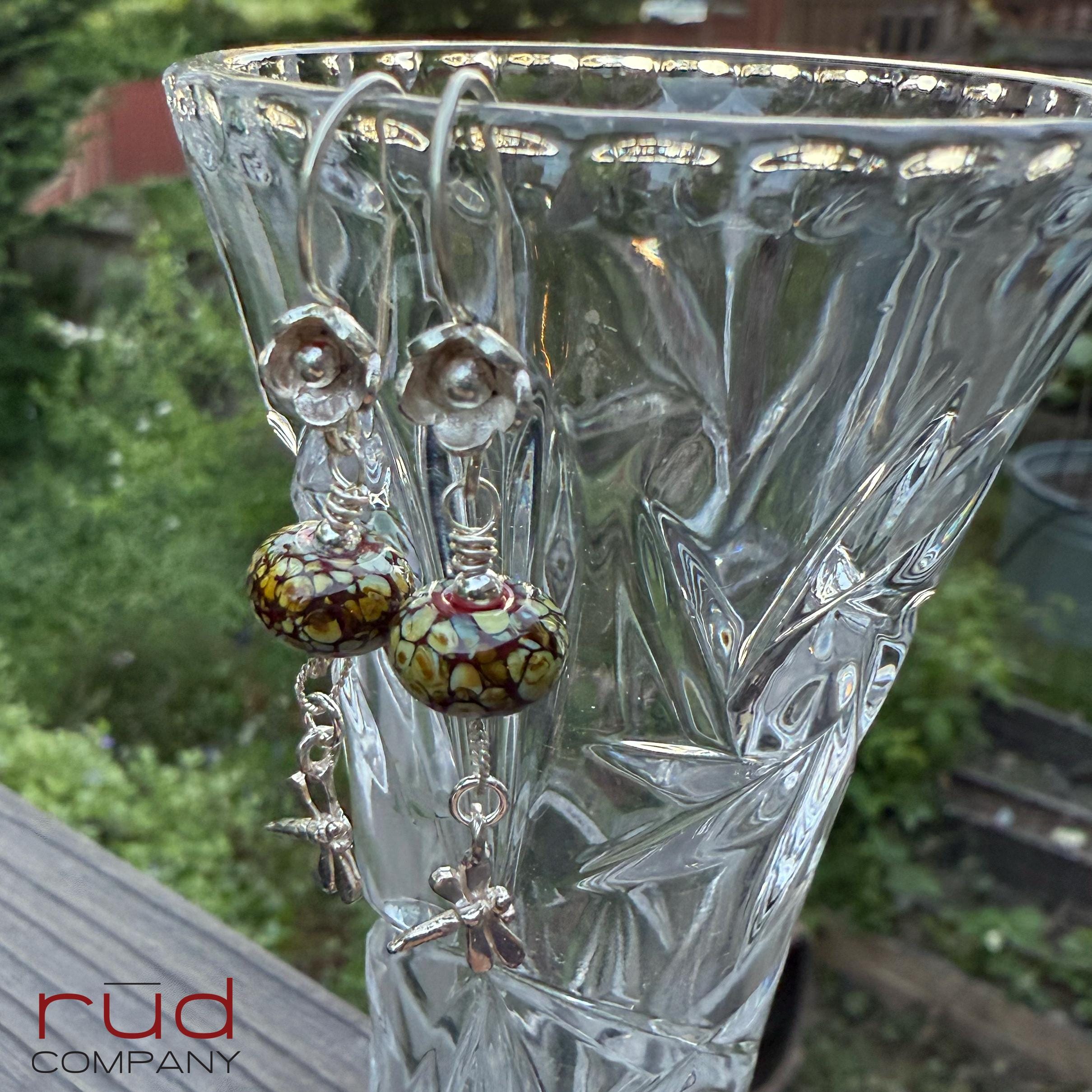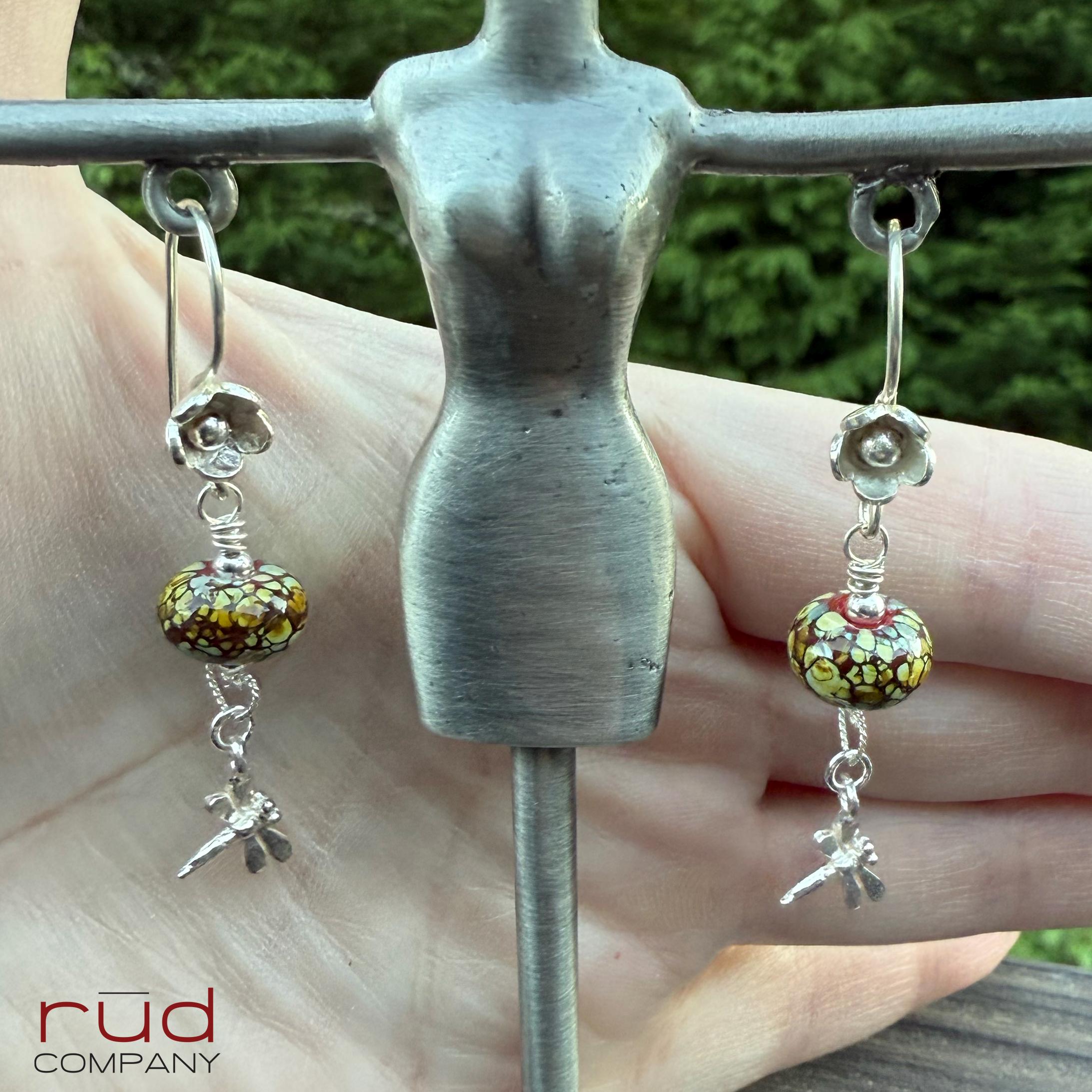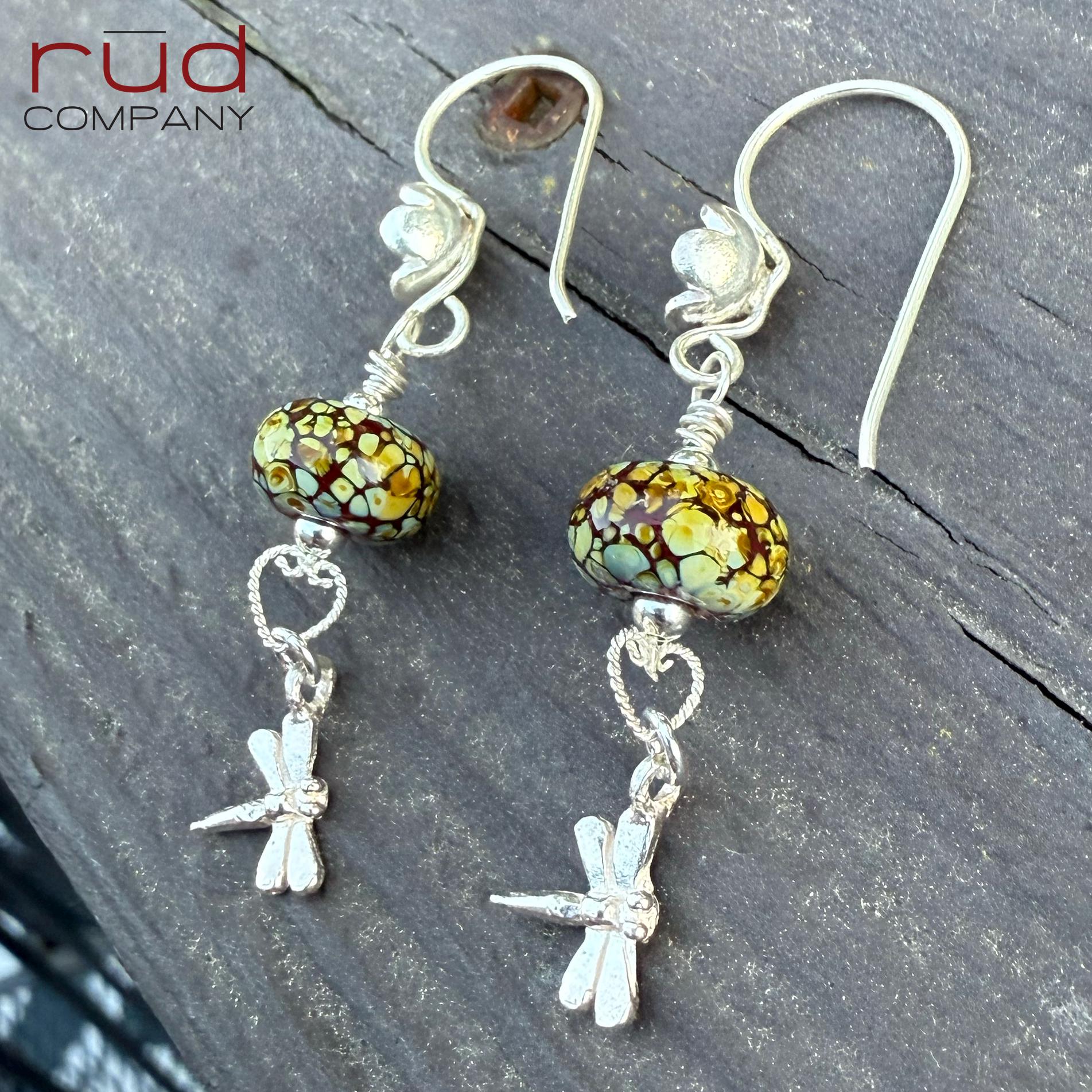 Sterling Silver Dragonfly & USA Lampwork Glass Frit Artisan Earrings, silversmith, dangle earrings, flower with confetti red yellow green