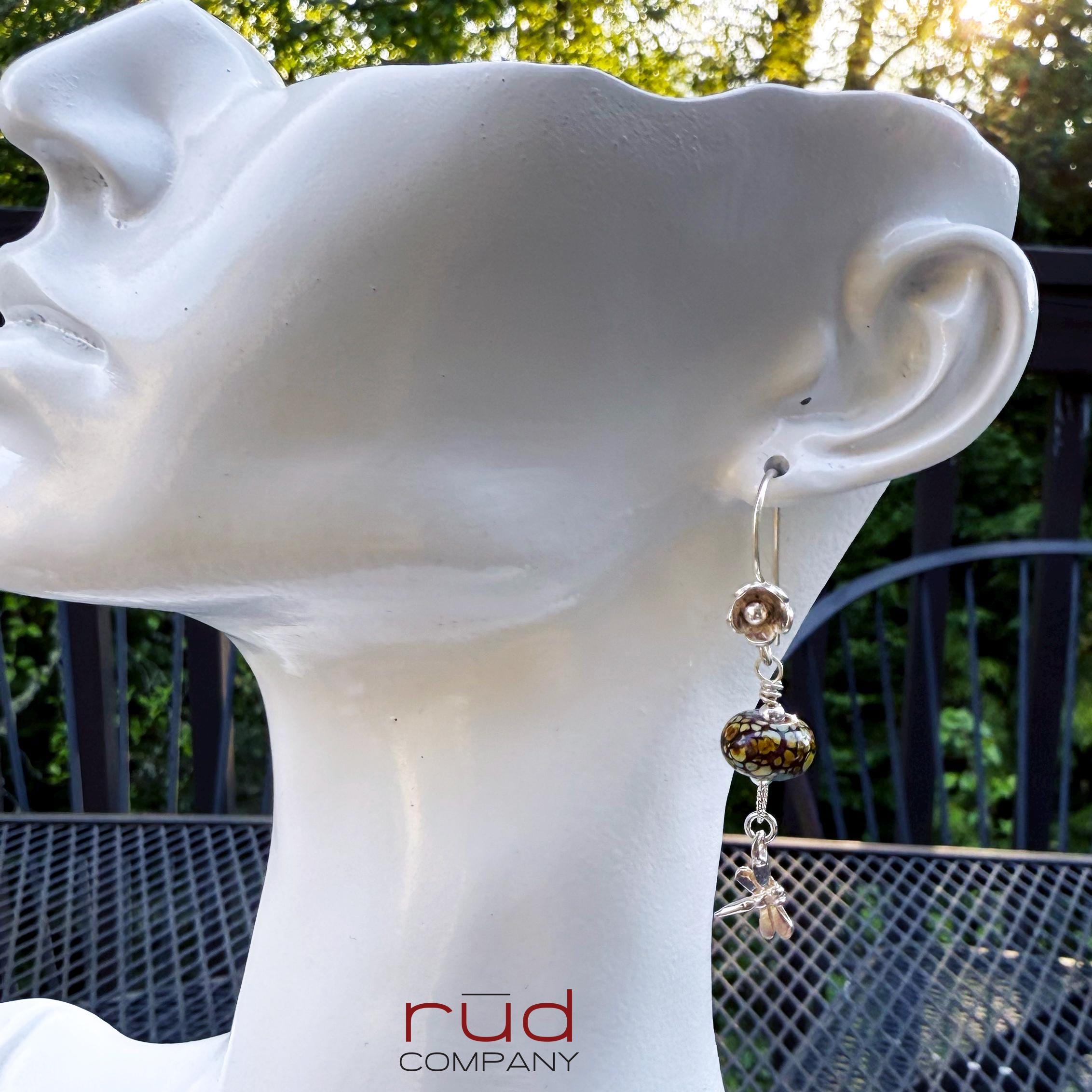 These earrings are just gorgeous - you have to really study the details to appreciate! Approximately 2.5" long from the beautiful detailed flower earwires. These are one of a kind - the artist who made the gorgeous confetti frit beads is an accomplished US lamp work glass artist. At the bottom, simple dragonflies complete the look. Really stunning and would make a great gift. These earrings will not disappoint.