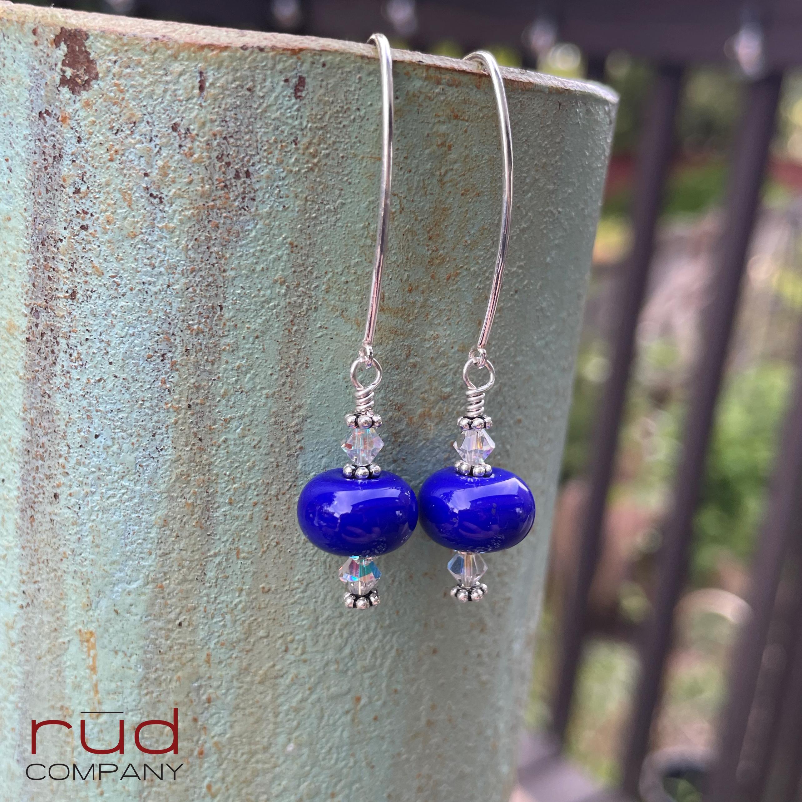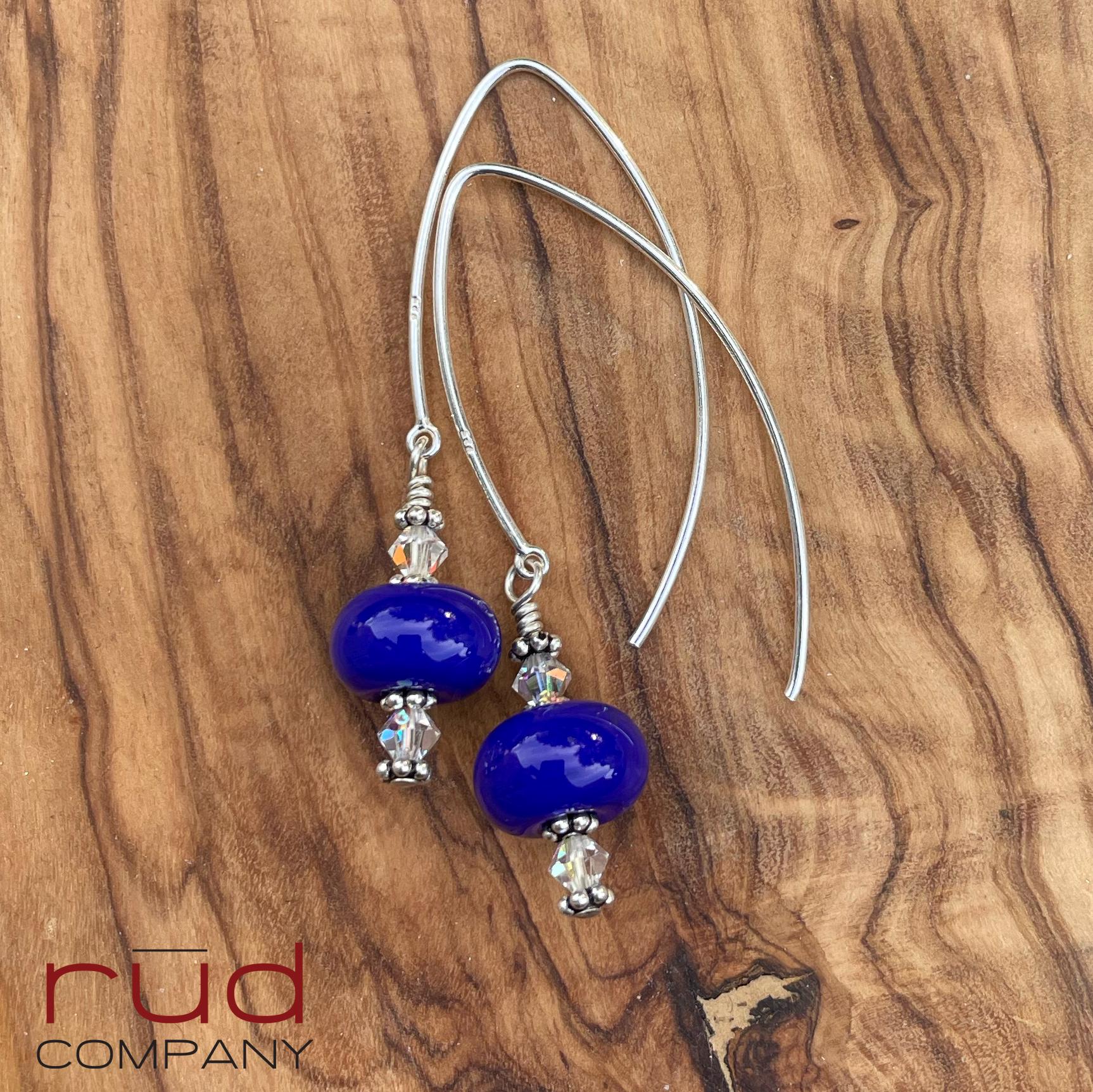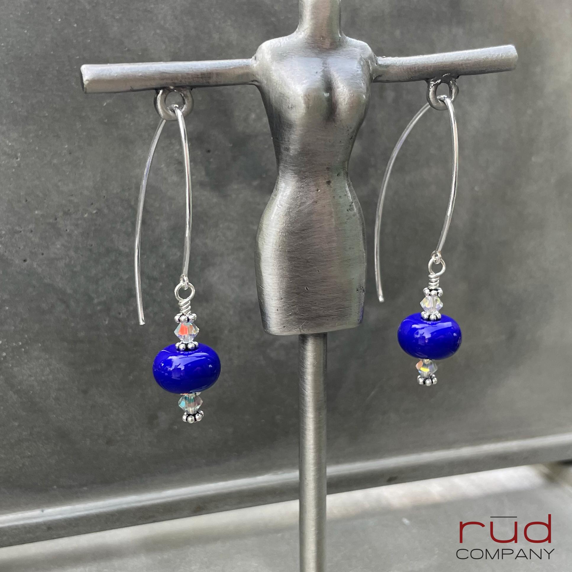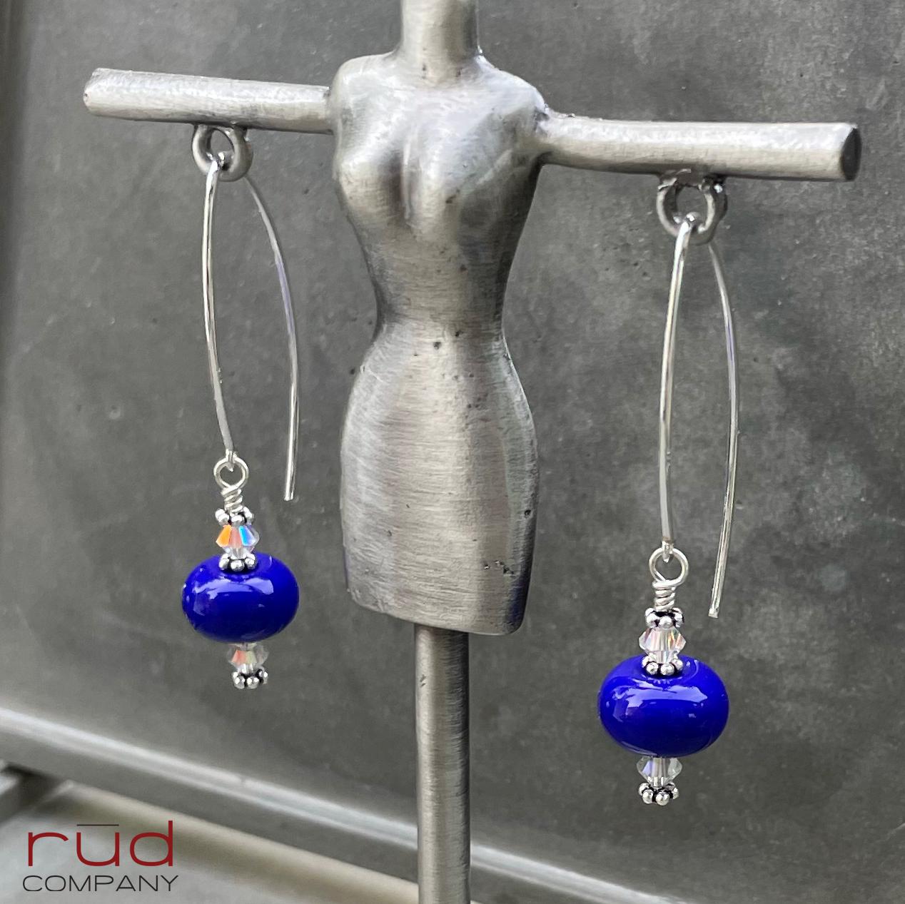 Sterling Silver & USA Lampwork Glass Bright Royal Blue Artisan Earrings, silversmith dangle earrings, Simple Stunning with Swarovski Crystal