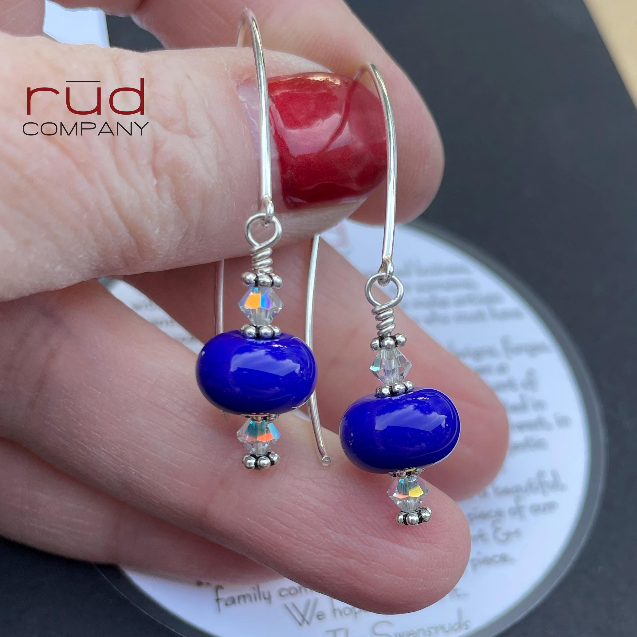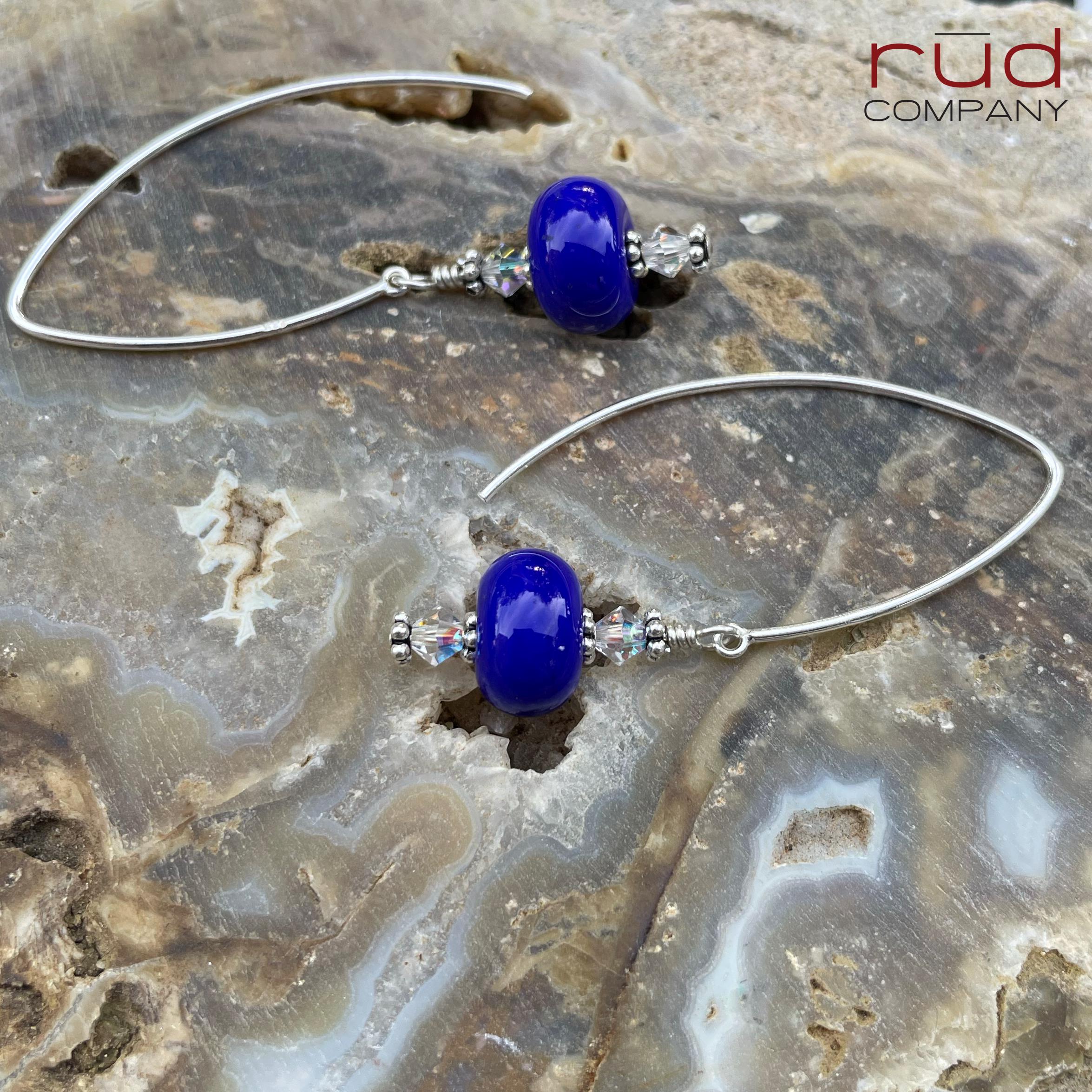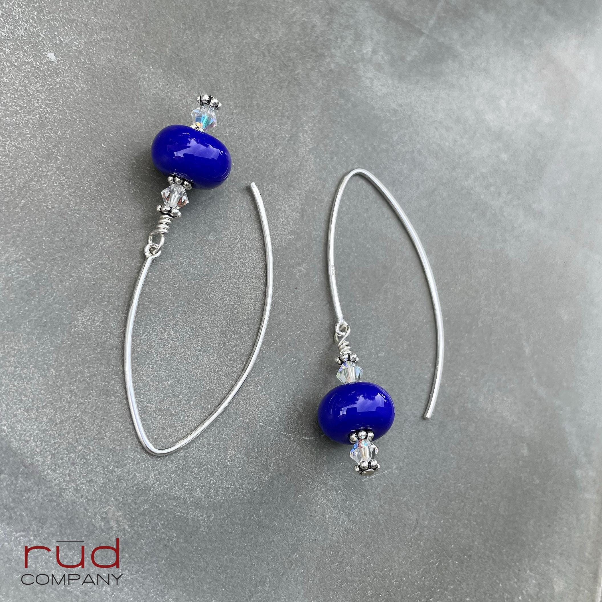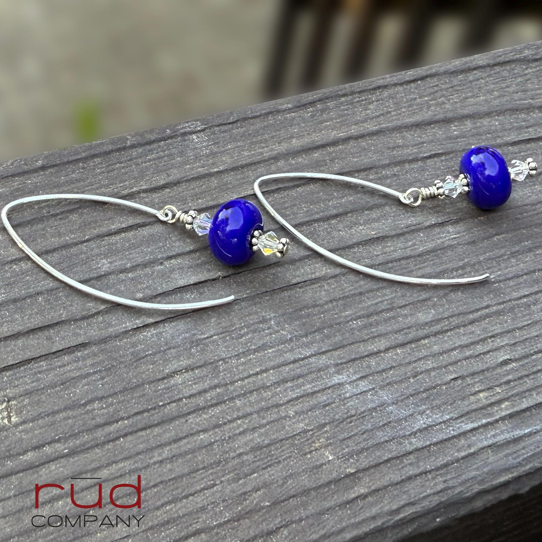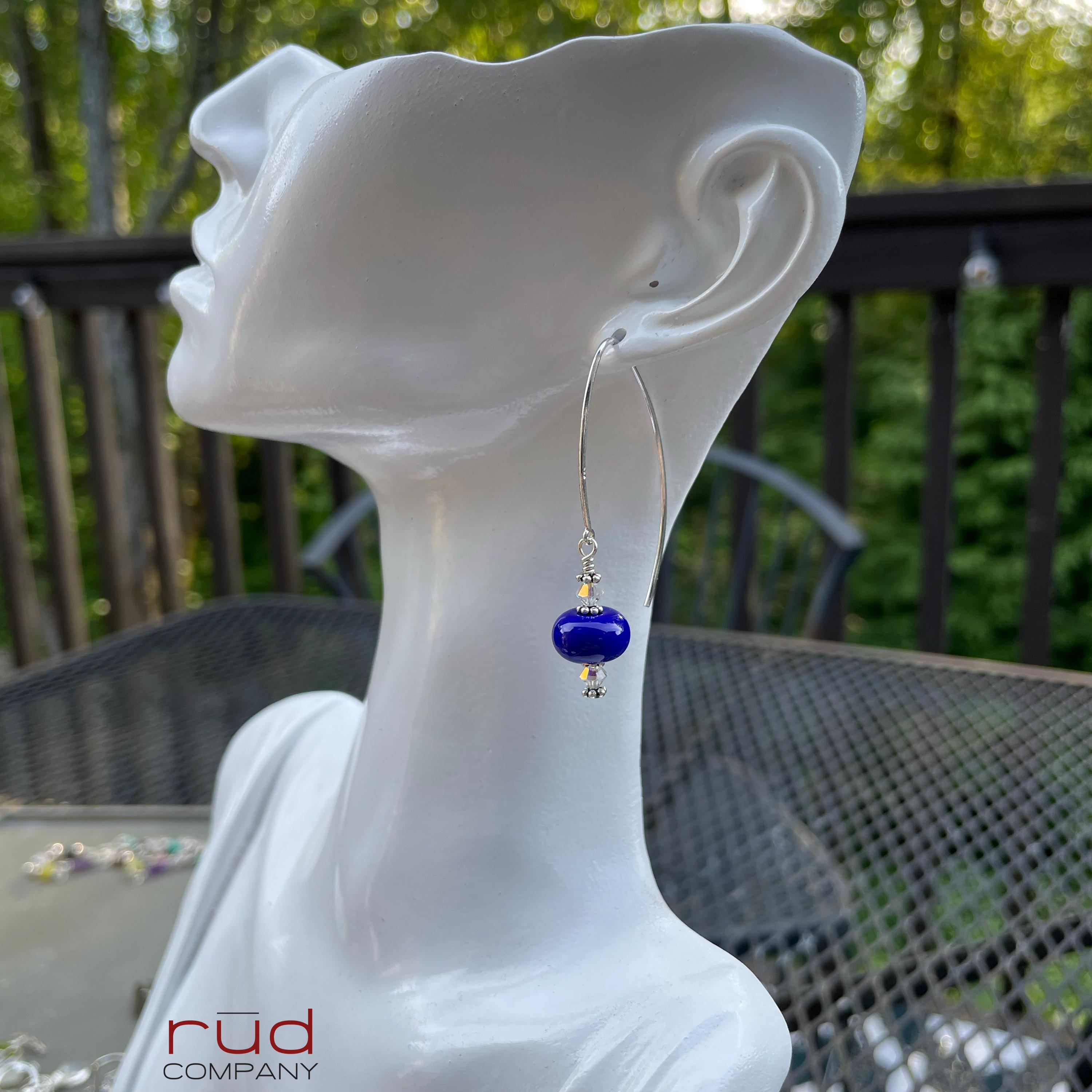 Sterling Silver & USA Lampwork Glass Bright Royal Blue Artisan Earrings, silversmith dangle earrings, Simple Stunning with Swarovski Crystal