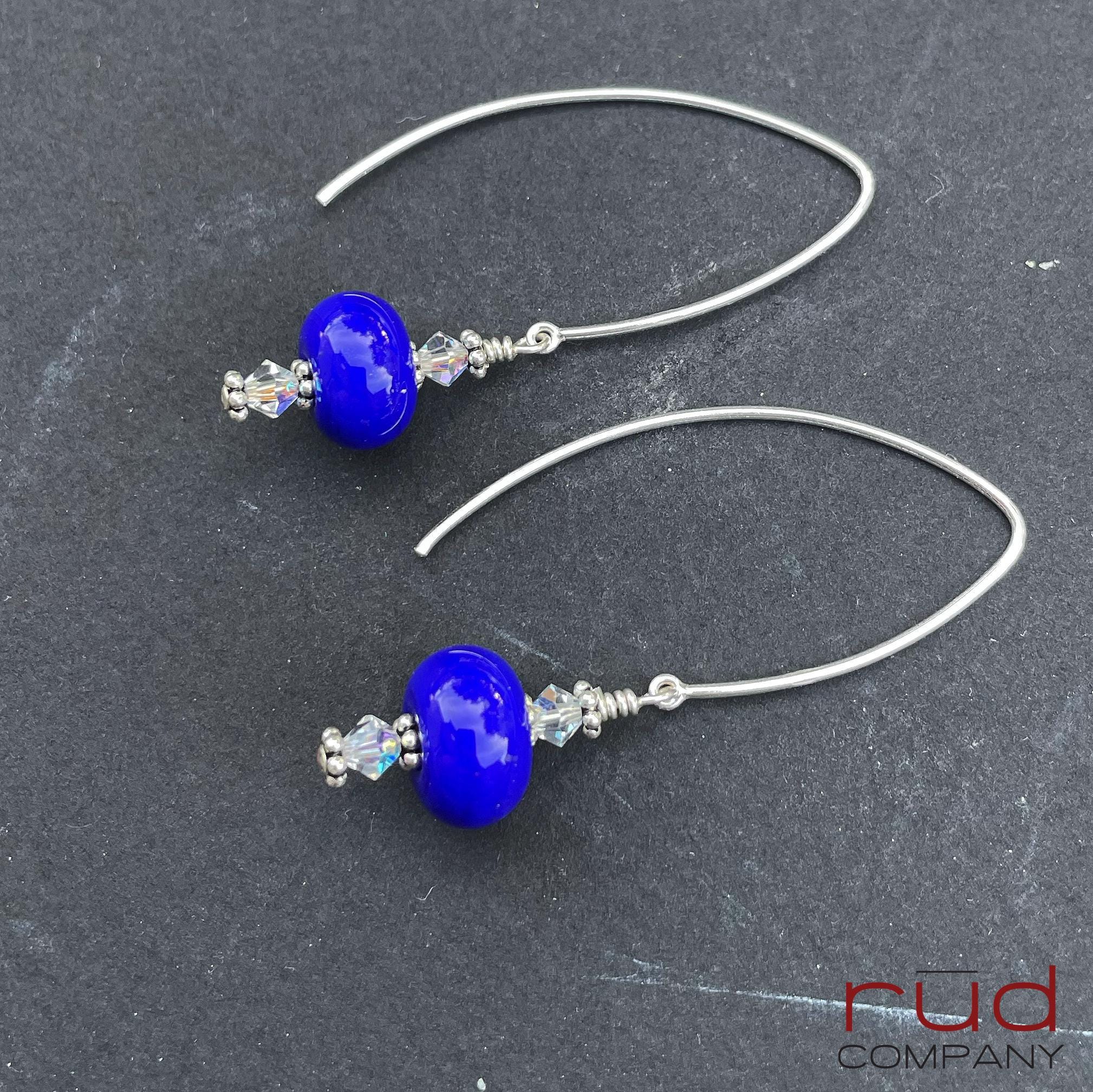 These earrings are a truly unique. Perfect to add flair to your outfit or a pop of color. Approximately 2" long from the top of the handmade long earwires. These are one of a kind - the artist who made the super-pigmented royal blue beads is an accomplished US lamp work glass artist. Accompanied on both sides by Aurora Borealis clear Swarovski Crystals. These earrings will not disappoint.