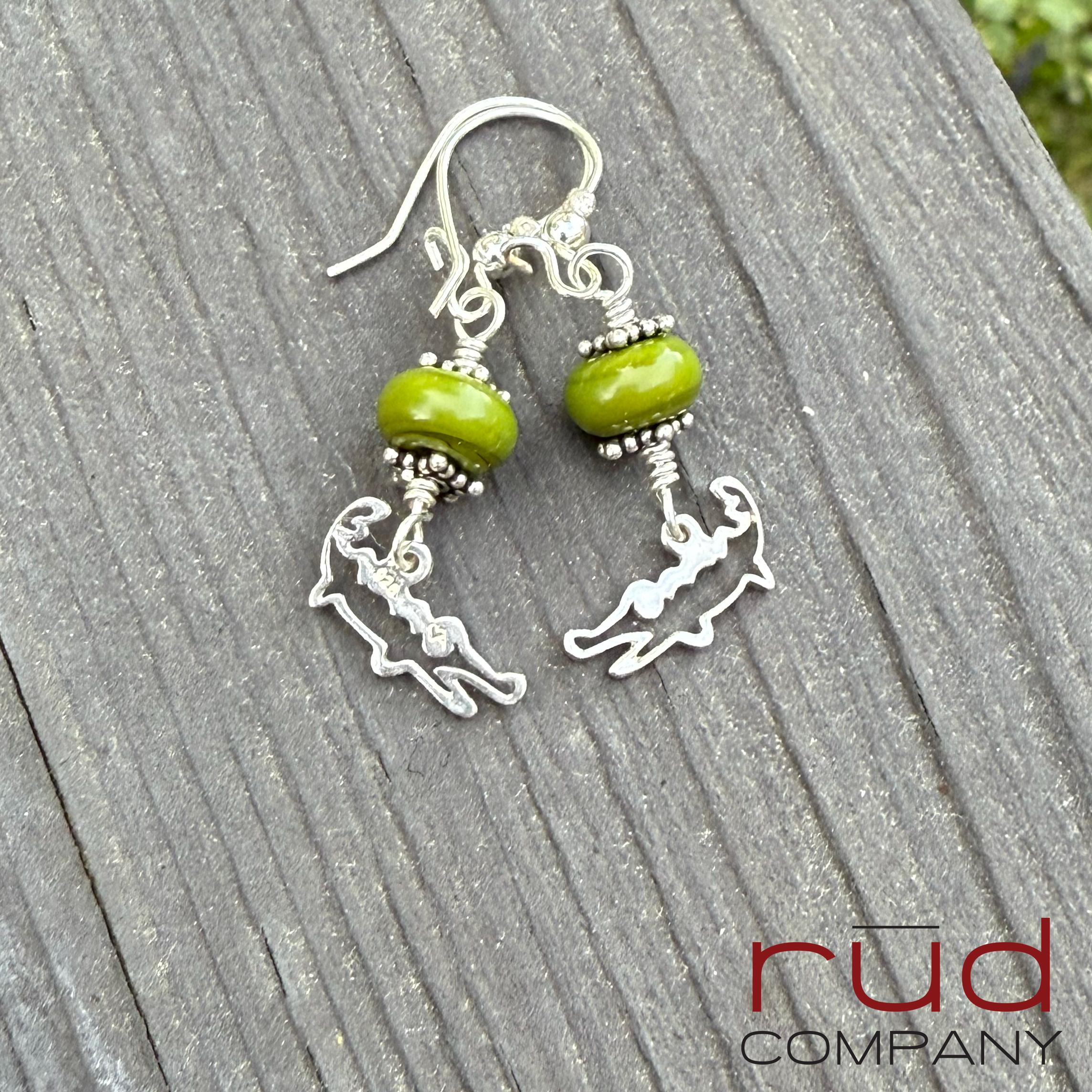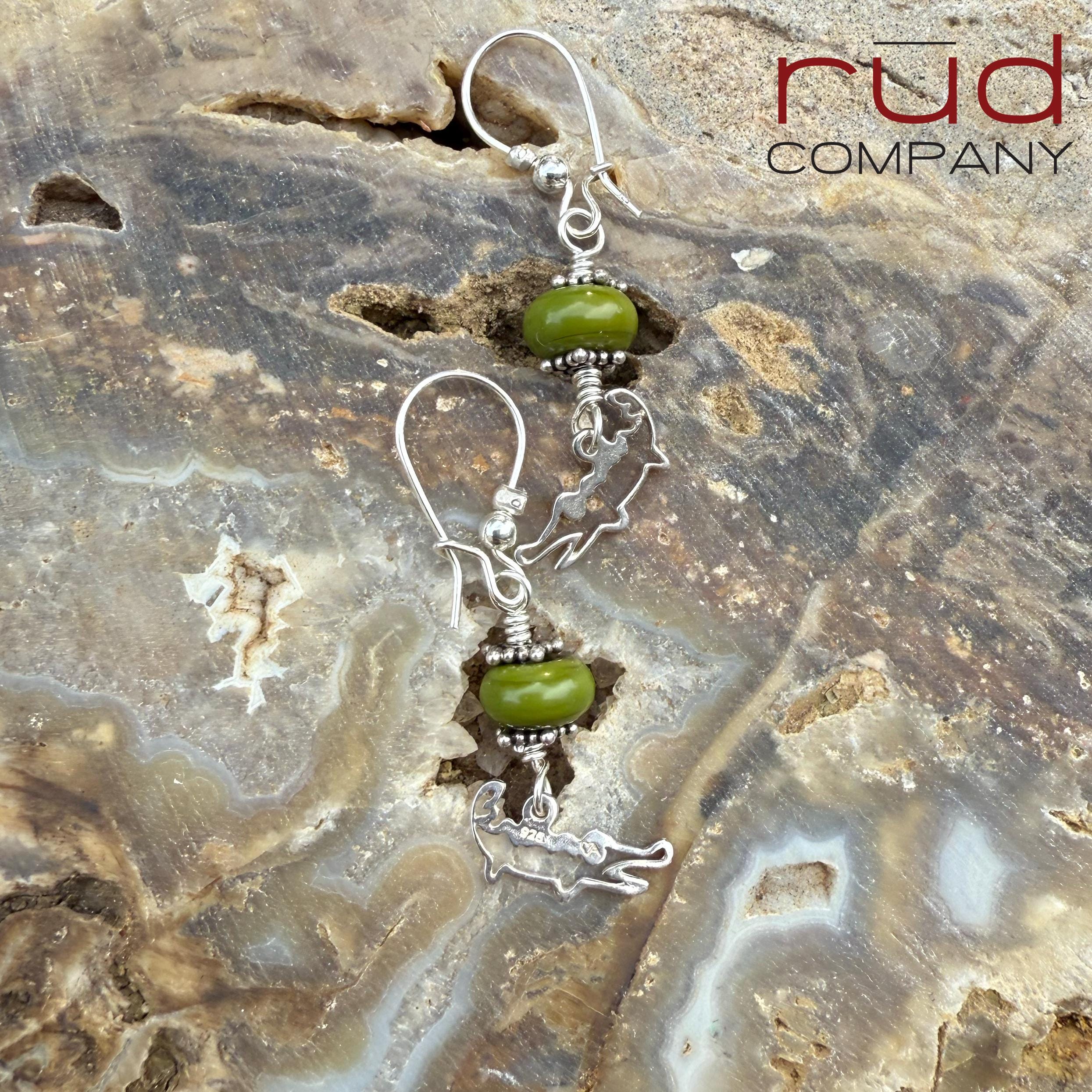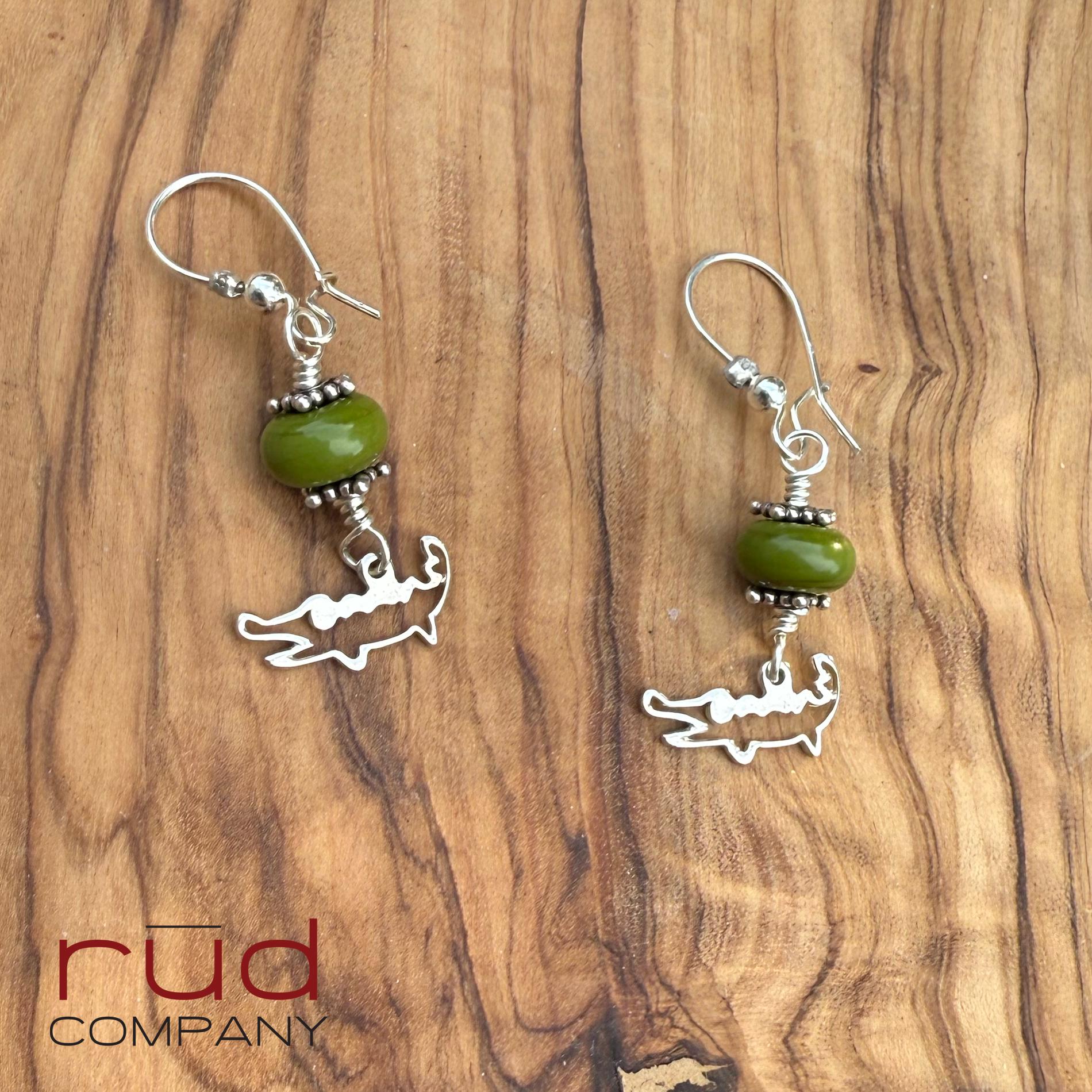 Sterling Silver Alligator & USA Lampwork Glass Artisan Earrings, silversmith, olive green dangle earrings, kidney ear wires, Gator earrings