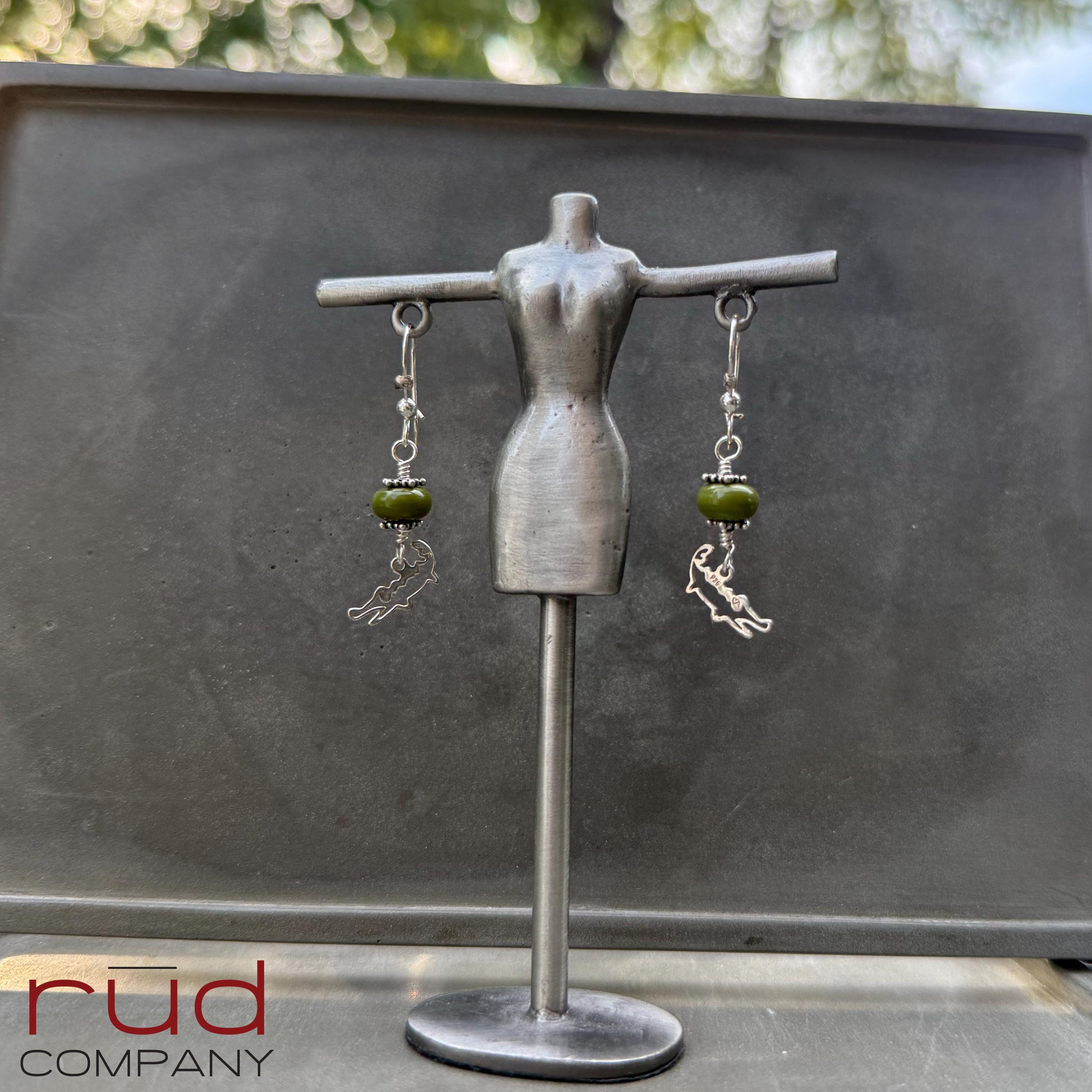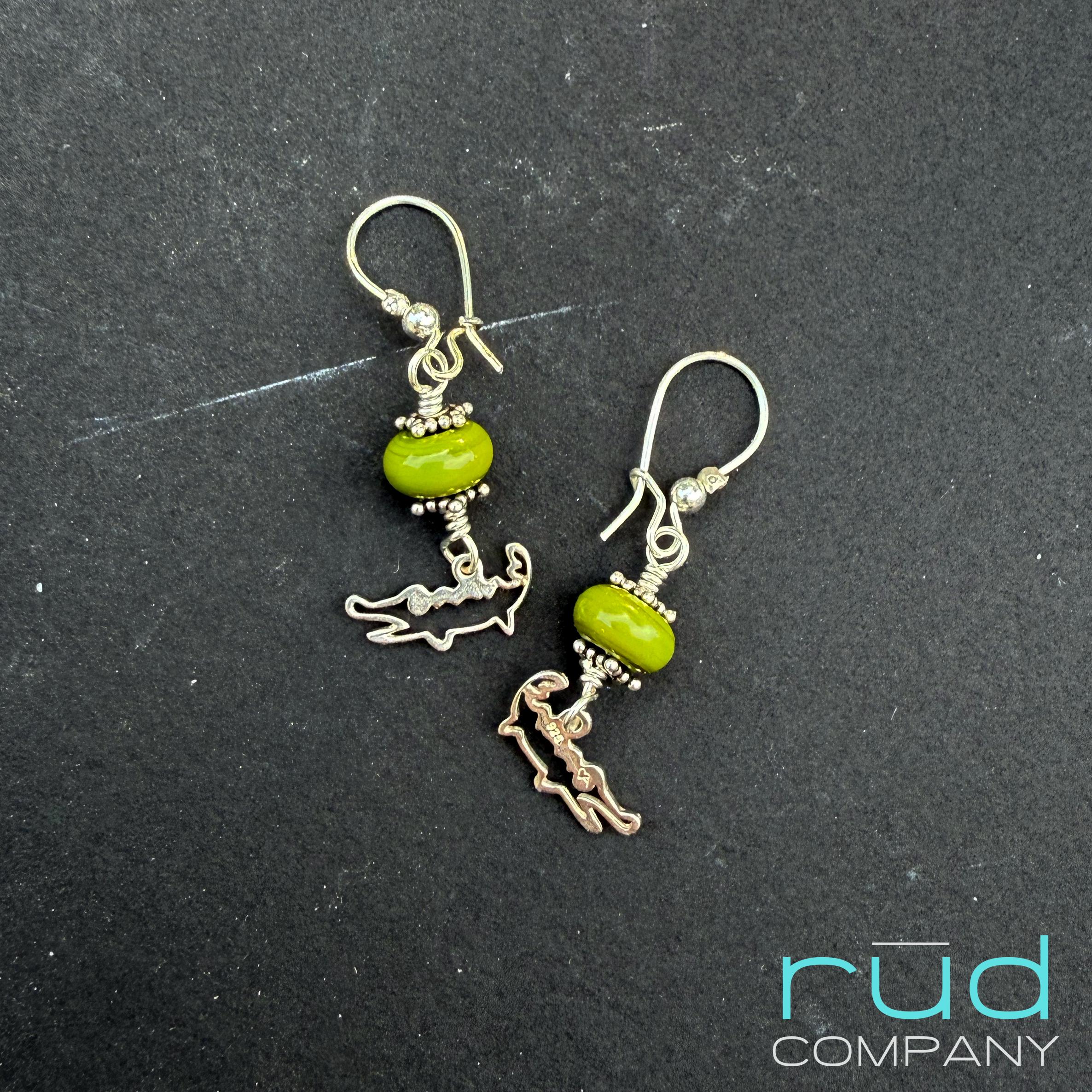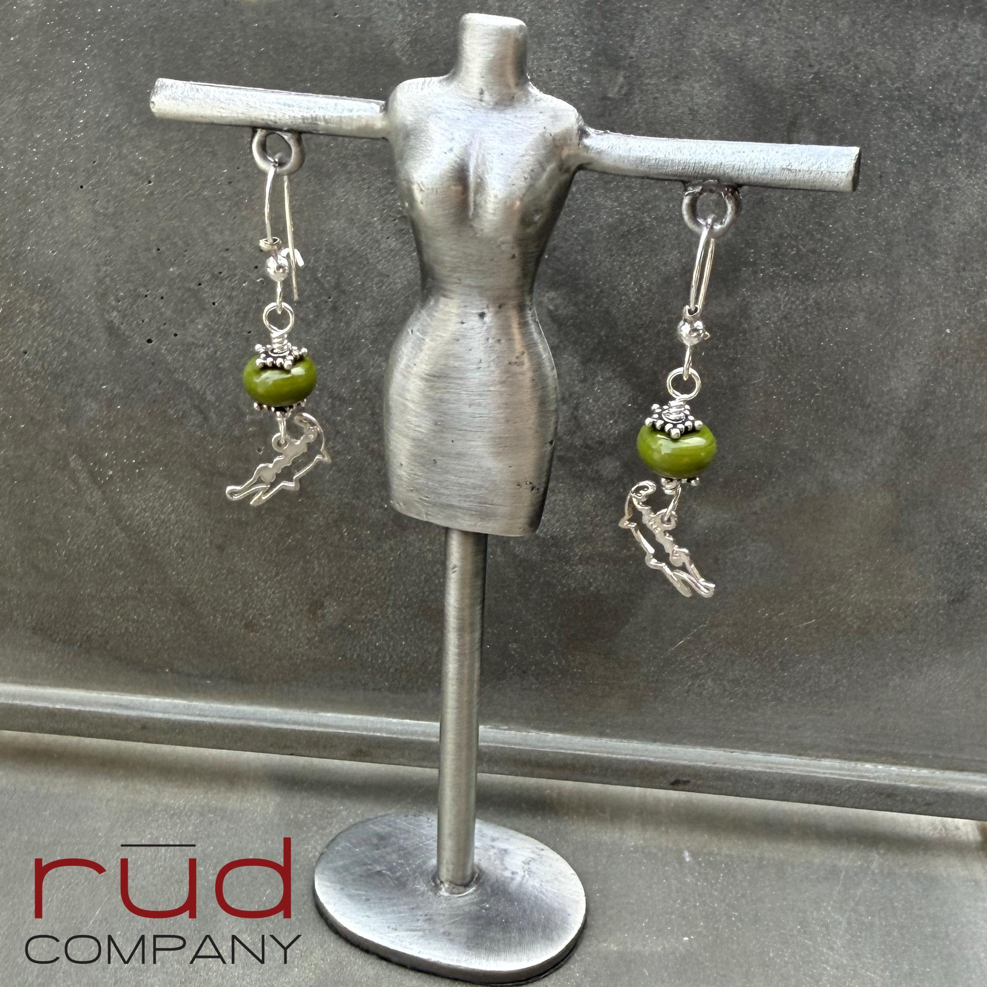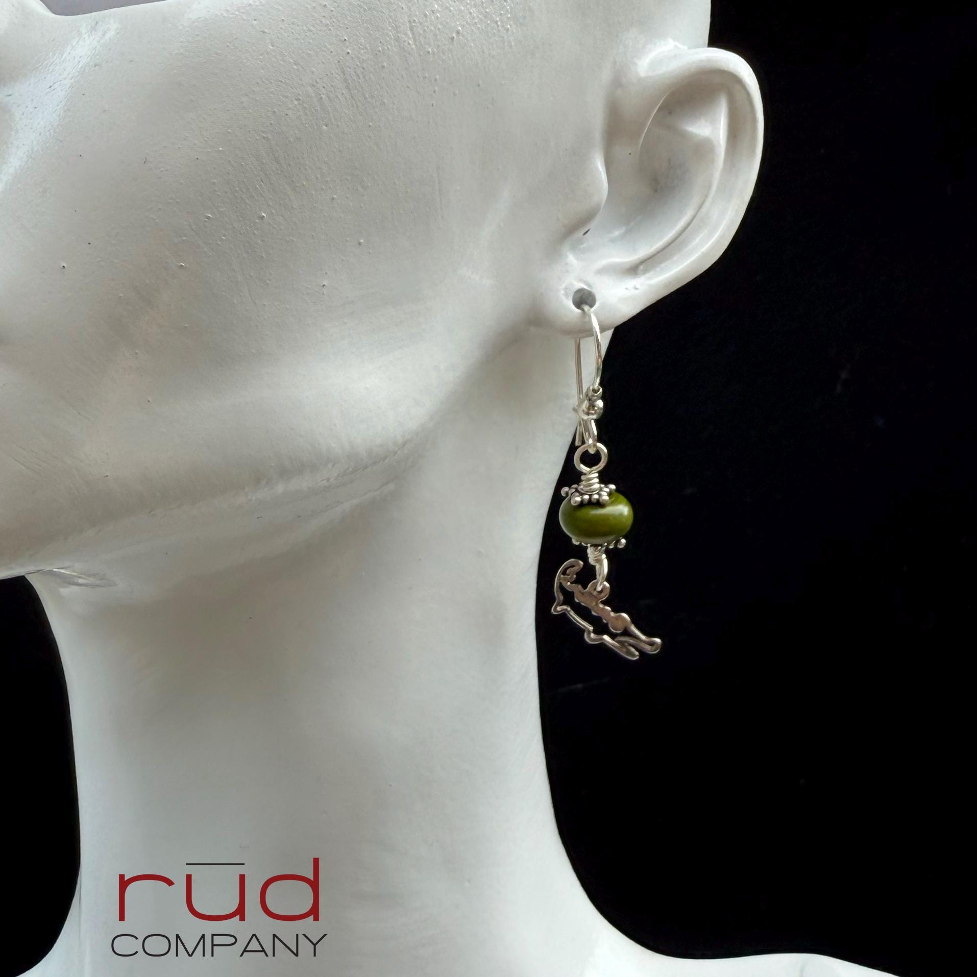 Sterling Silver Alligator & USA Lampwork Glass Artisan Earrings, silversmith, olive green dangle earrings, kidney ear wires, Gator earrings