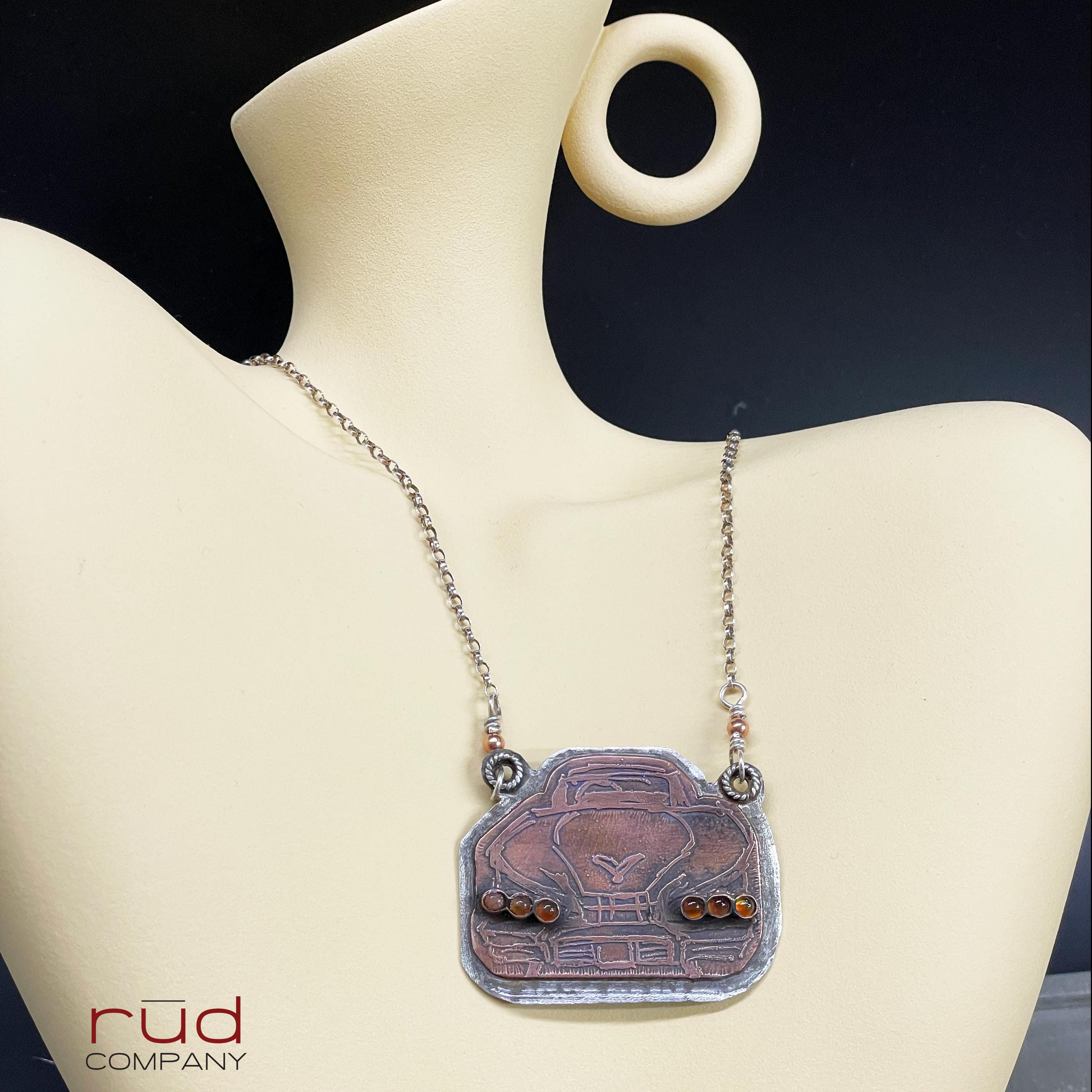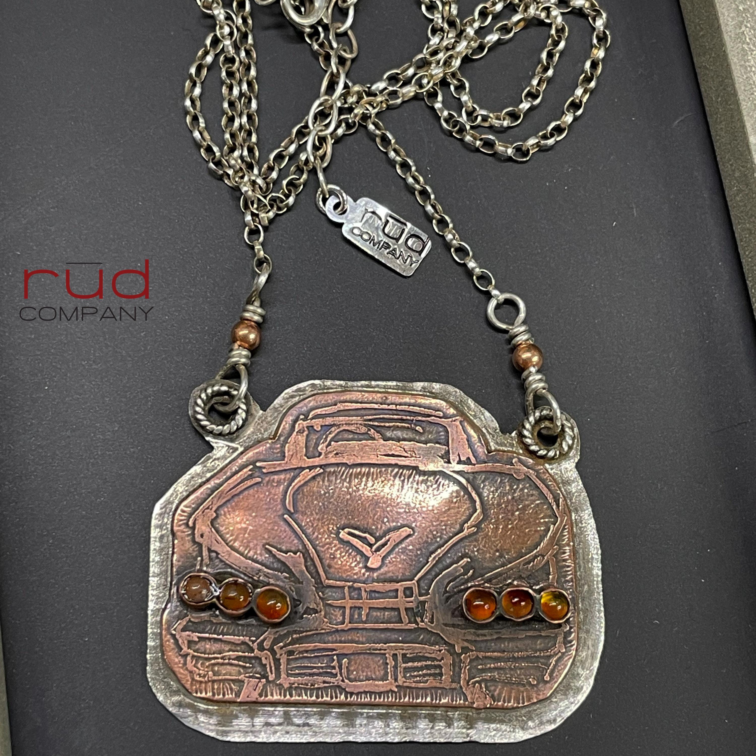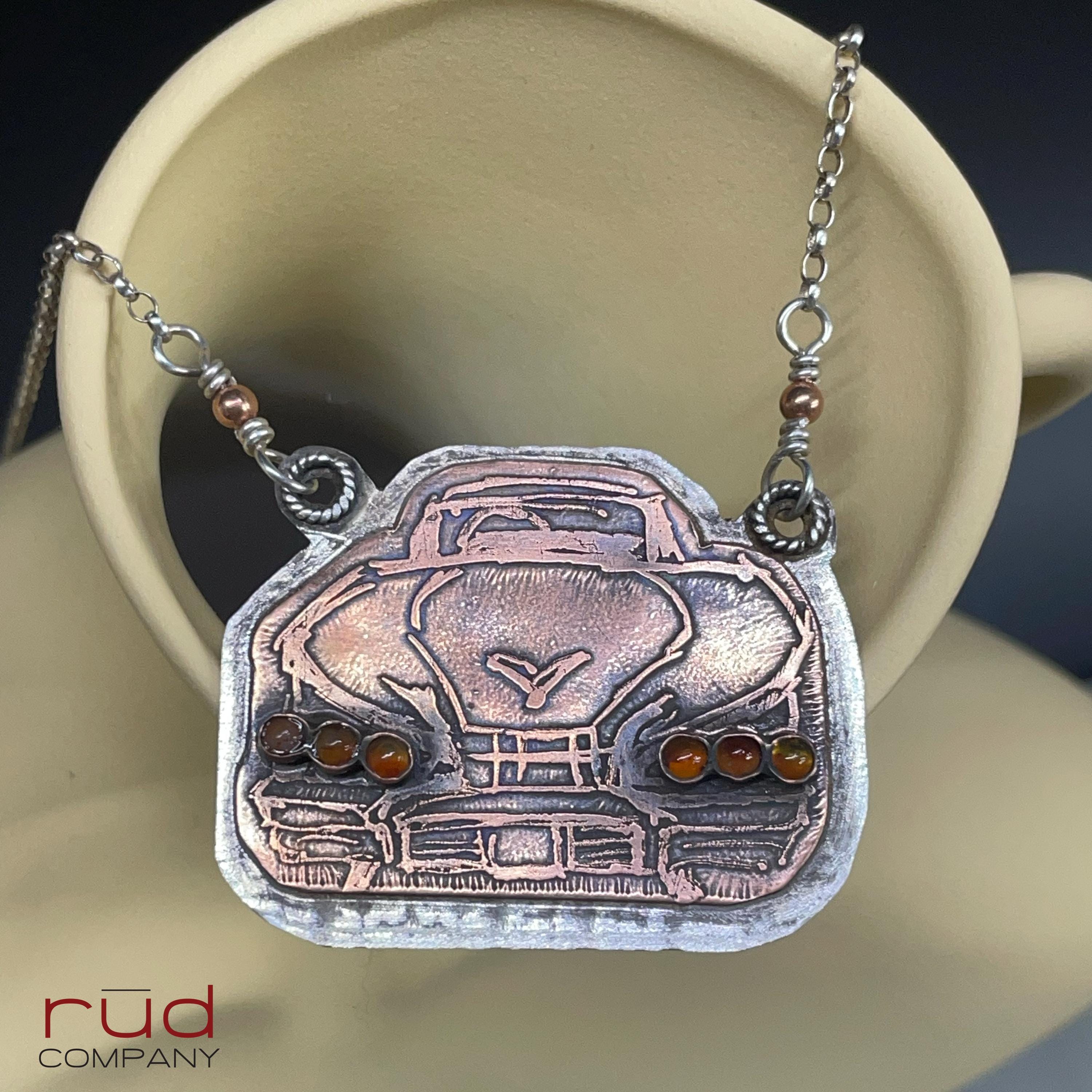 Rūd Rides - Original Etched Copper Mounted on Sterling Silver '58 Chevy Impala Rear, Hotrod Necklace Carnelian Tail Lights handmade silver