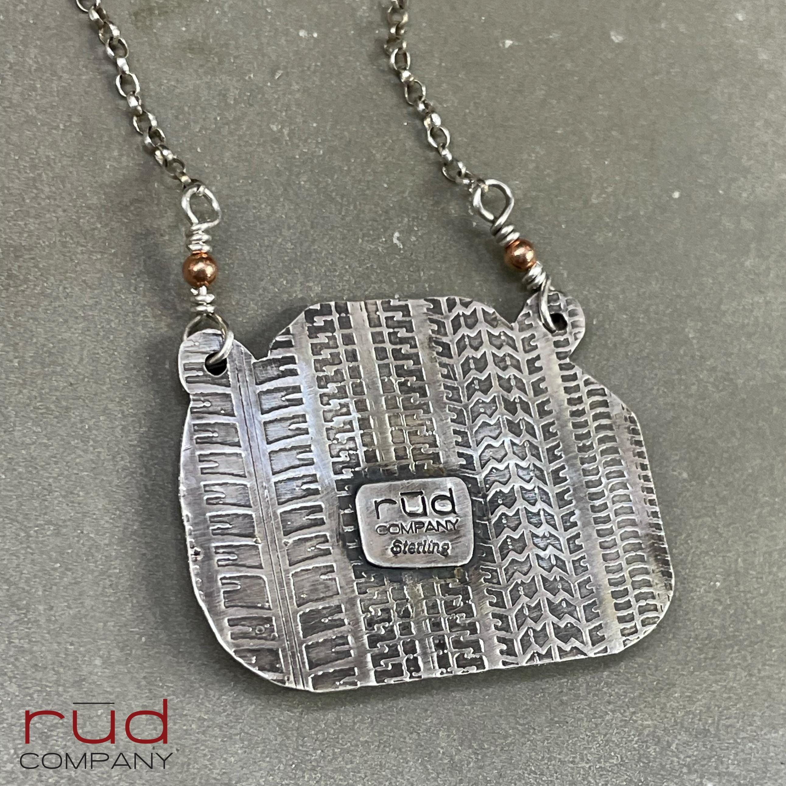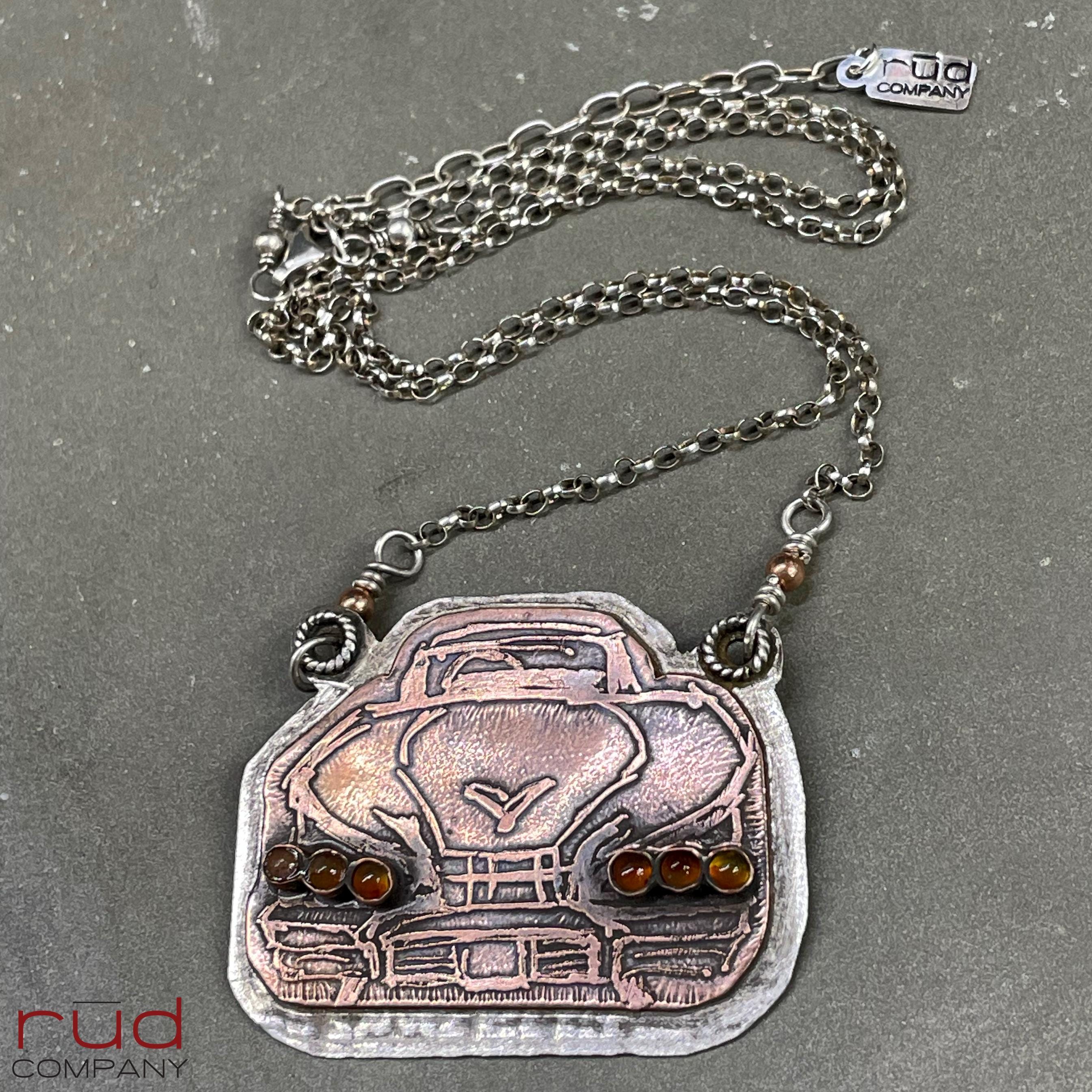 This piece is a true one-of-a-kind. I only made 6 styles, and only one of each. These are hand-drawn on copper and then acid etched to form a relief. They were then soldered to a solid sterling silver backplate with a lovely tire-tread pattern. The rolo chain is hand finished, with copper accent connectors. The taillights are high quality carnelian. The pendant measures approximately 1.75" x 1.35".