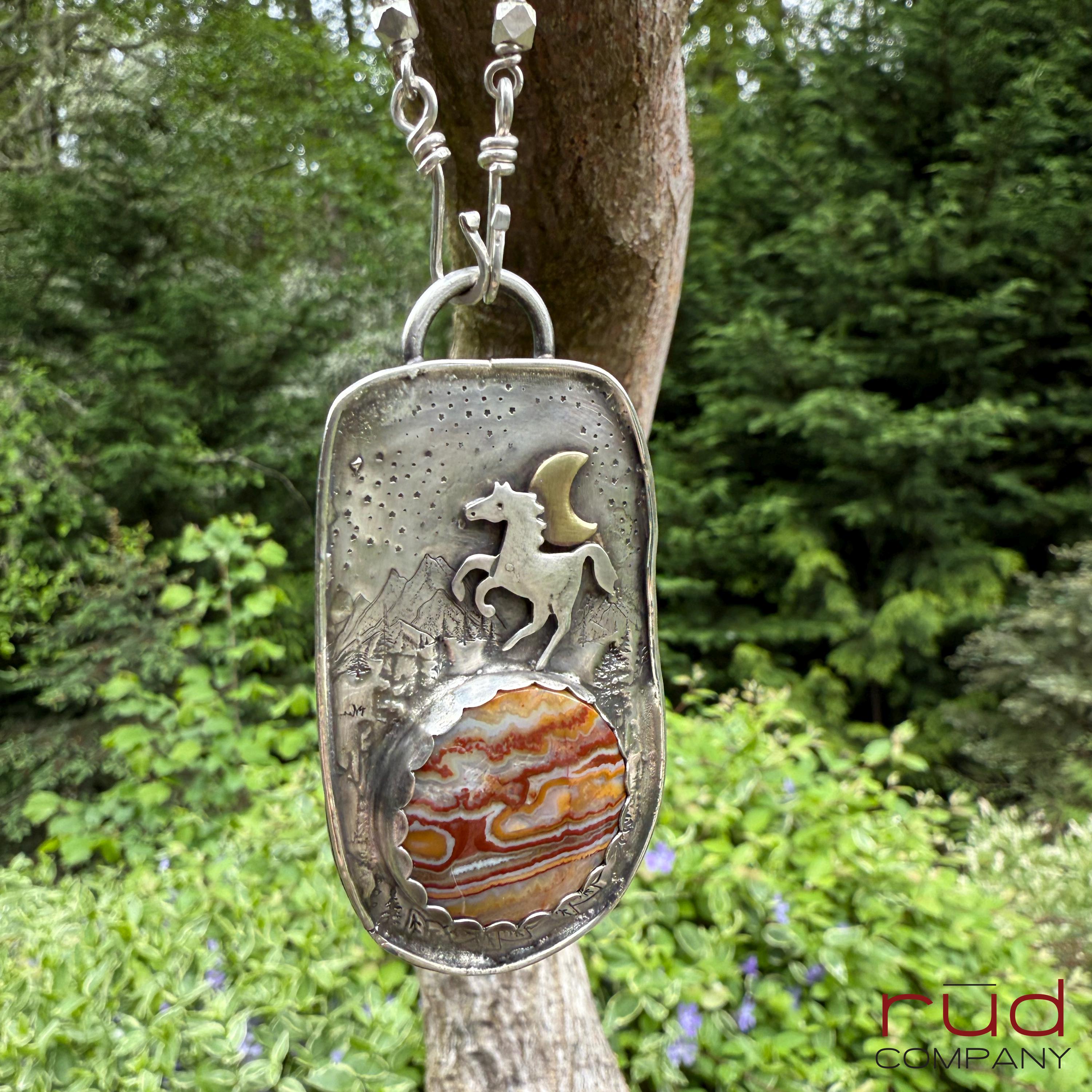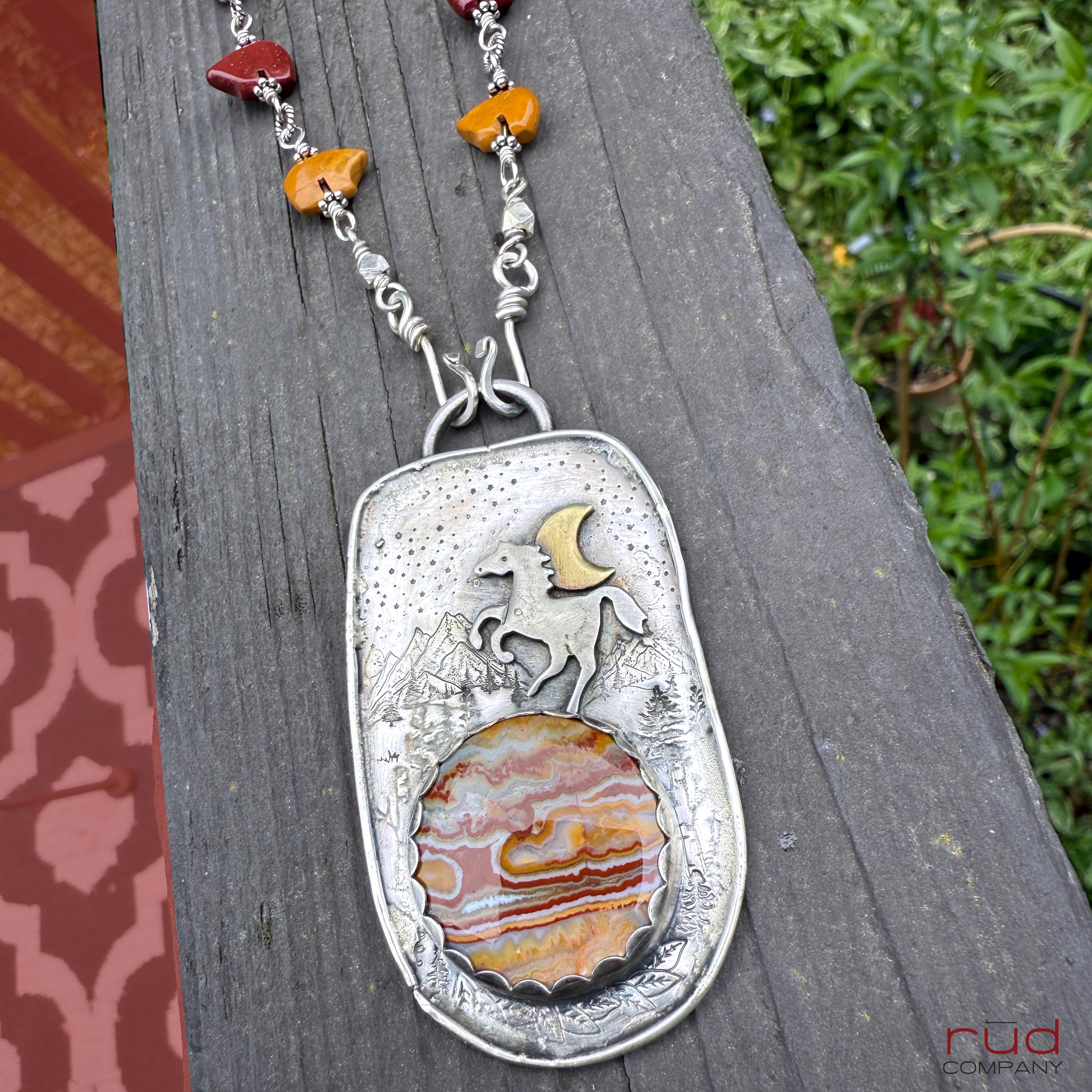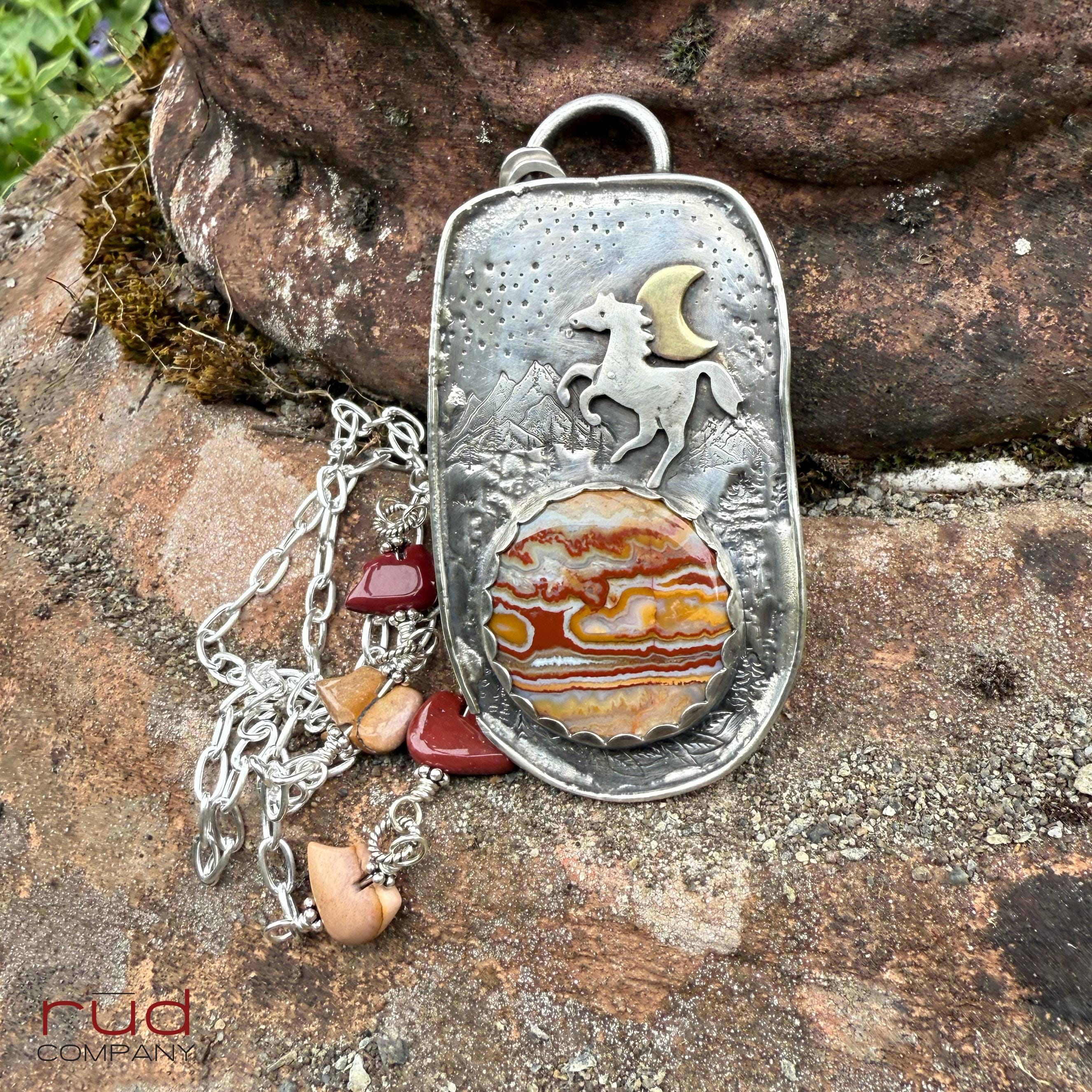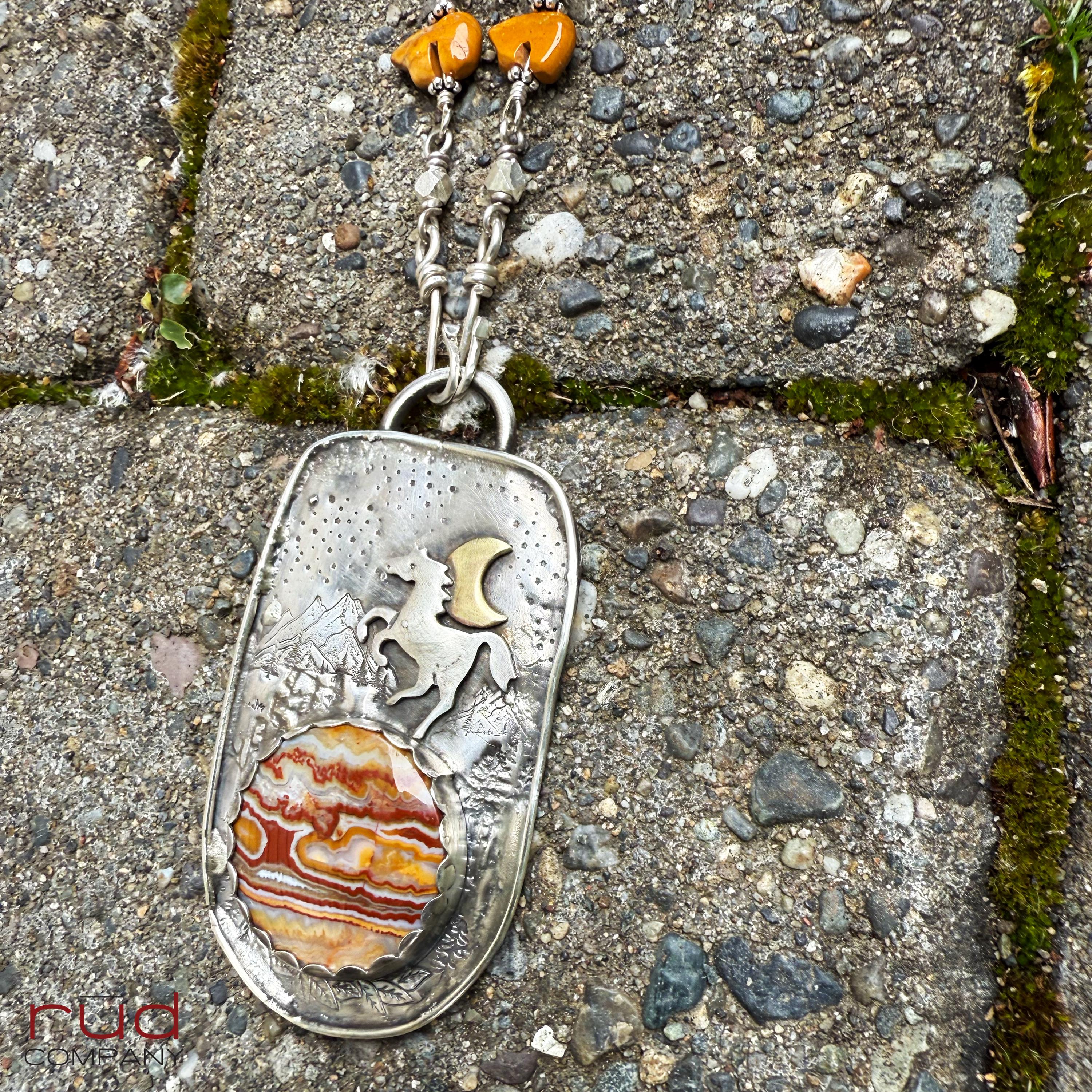 This lovely handcrafted, one of a kind solid sterling silver necklace is set with an exquisite, expertly cut Crazy Lace Agate pendant in mustard, rust, and cream colors. It is accented on the front with mountain scene of a running horse, with a brass crescent moon. One of a kind!