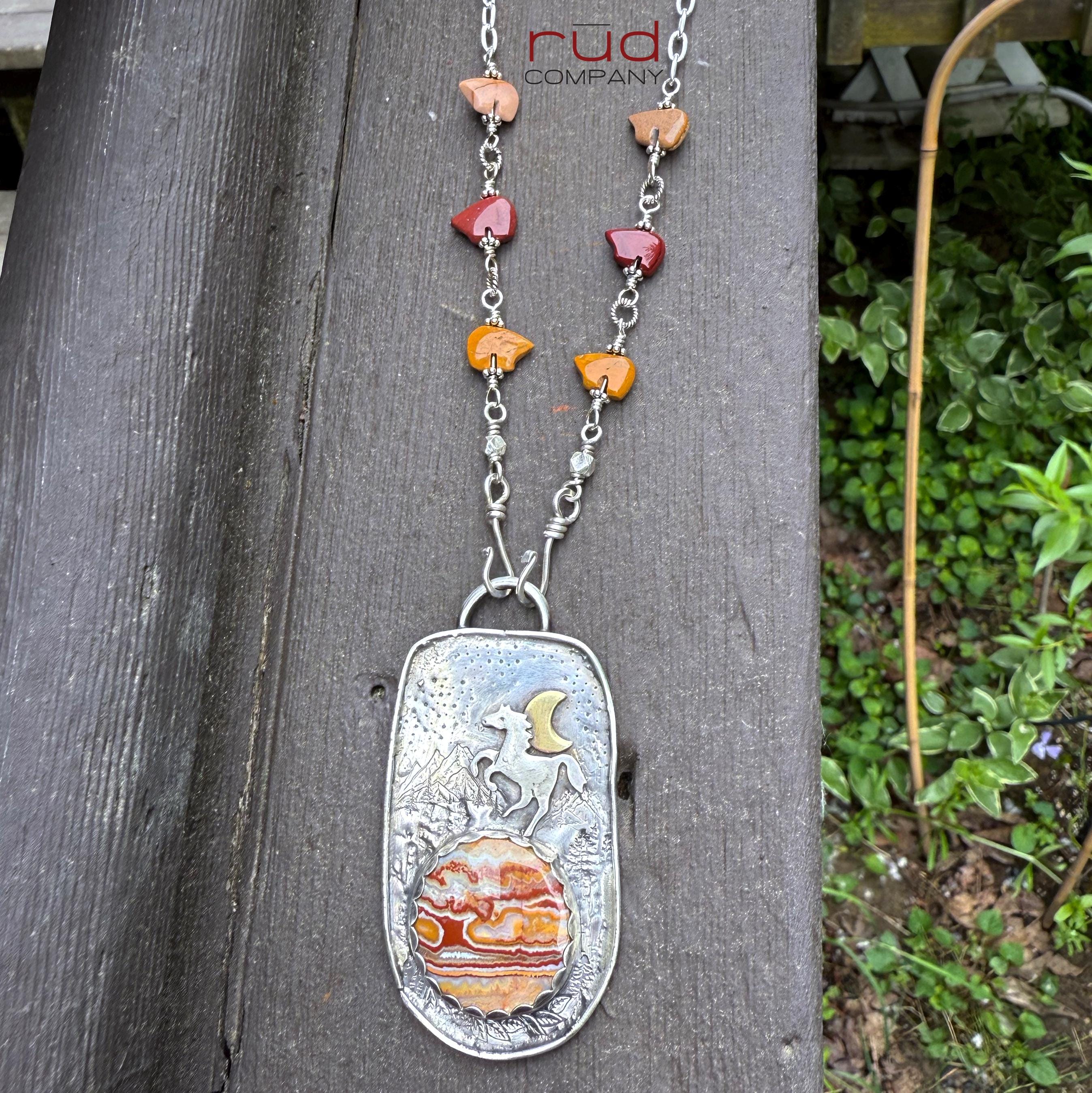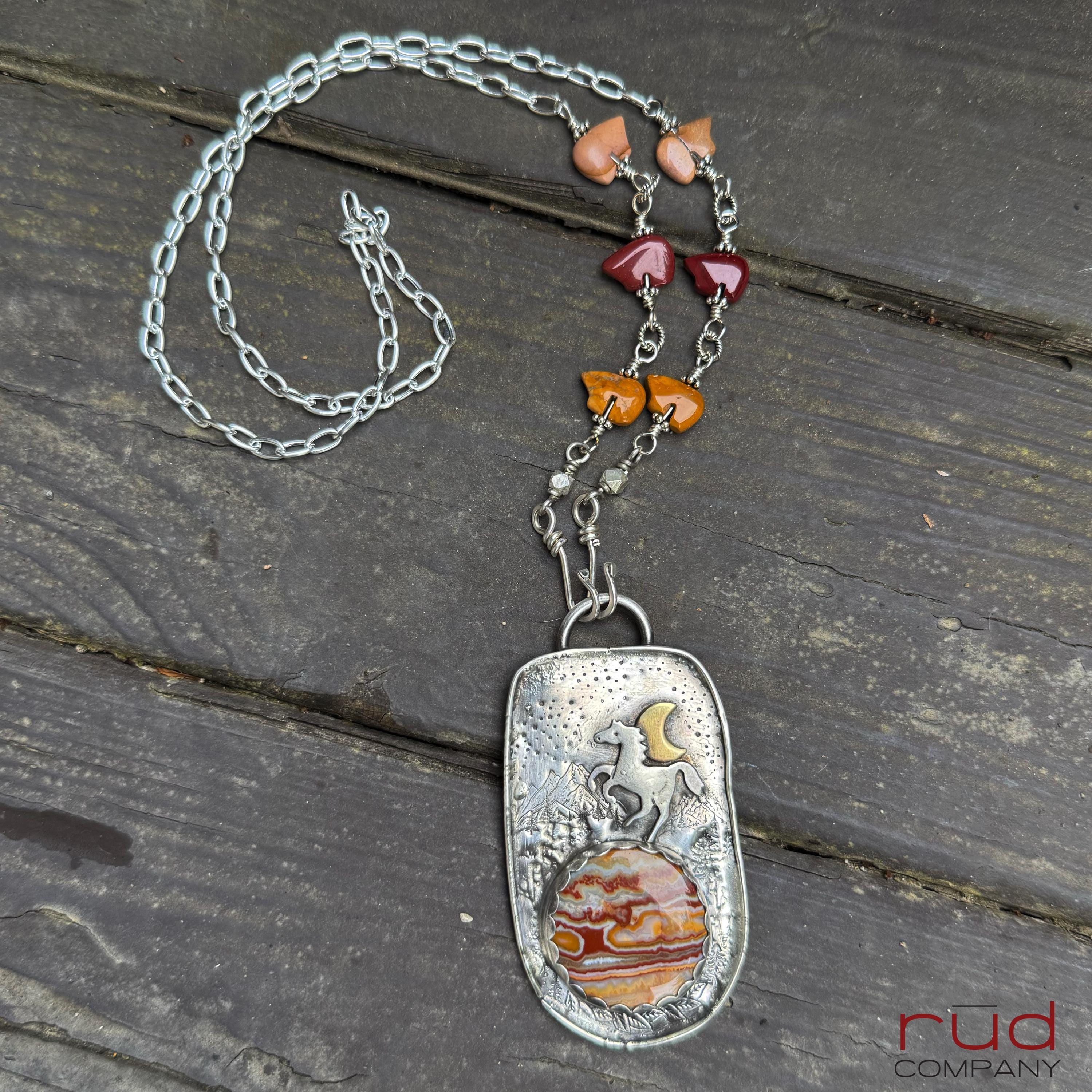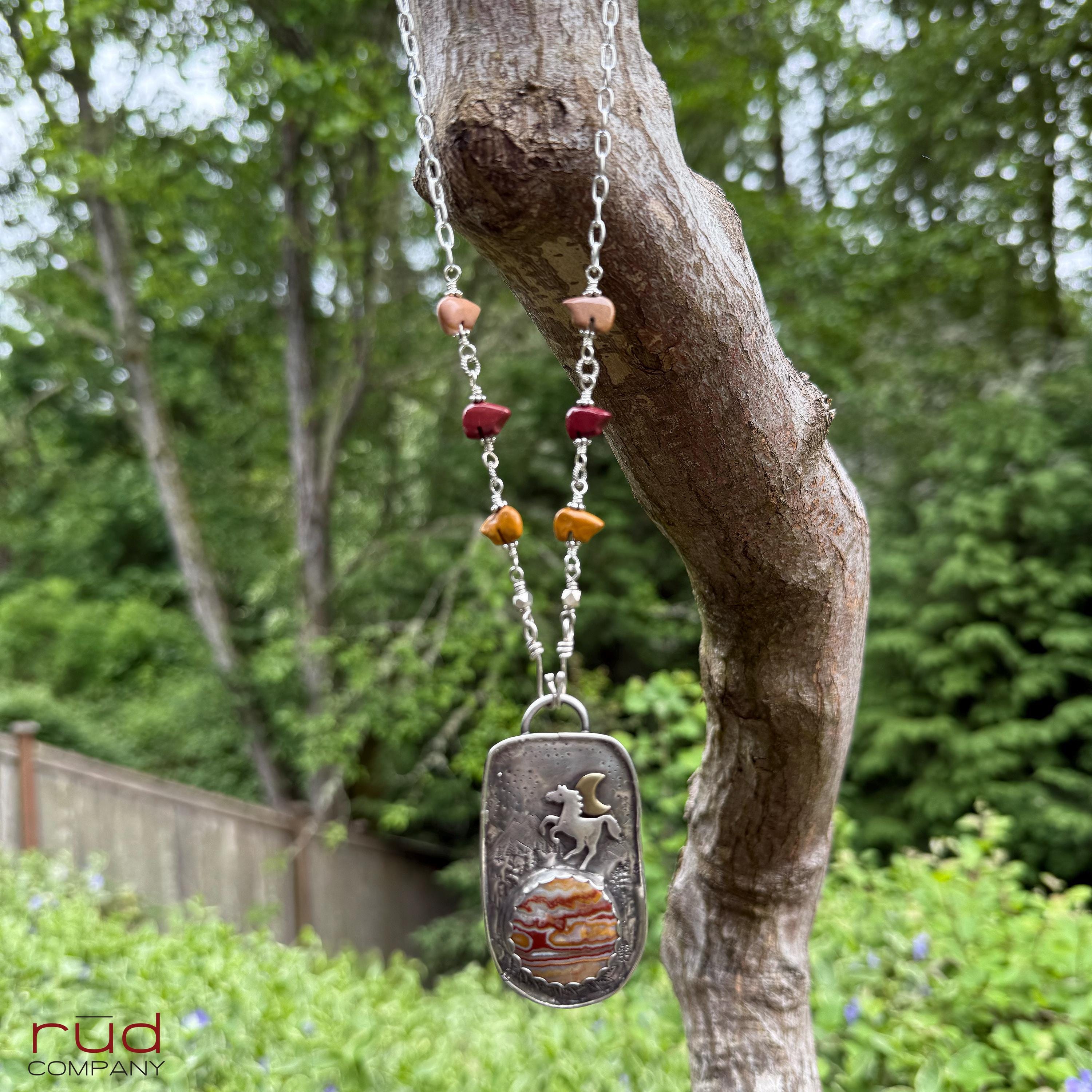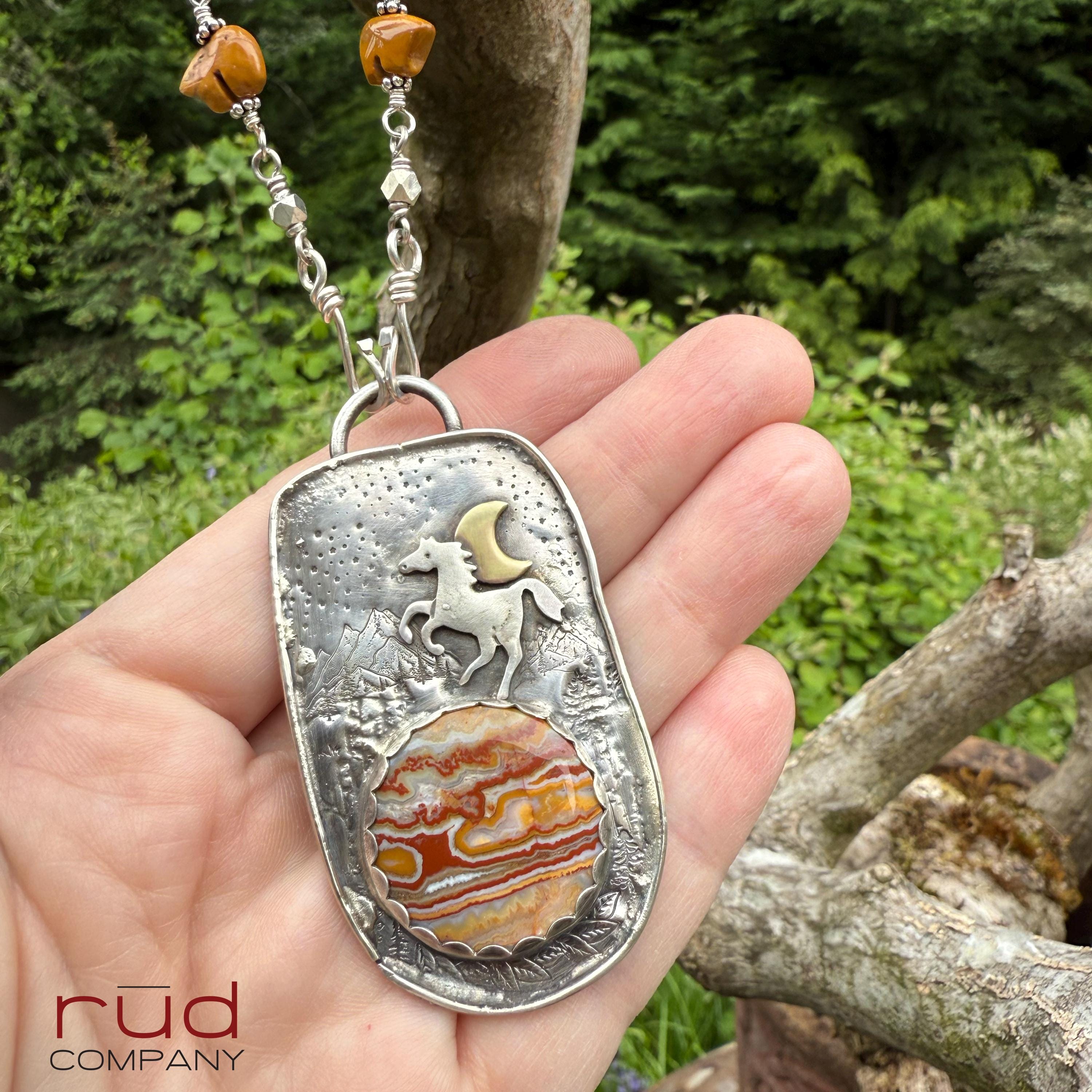 This lovely handcrafted, one of a kind solid sterling silver necklace is set with an exquisite, expertly cut Crazy Lace Agate pendant in mustard, rust, and cream colors. It is accented on the front with mountain scene of a running horse, with a brass crescent moon. One of a kind!