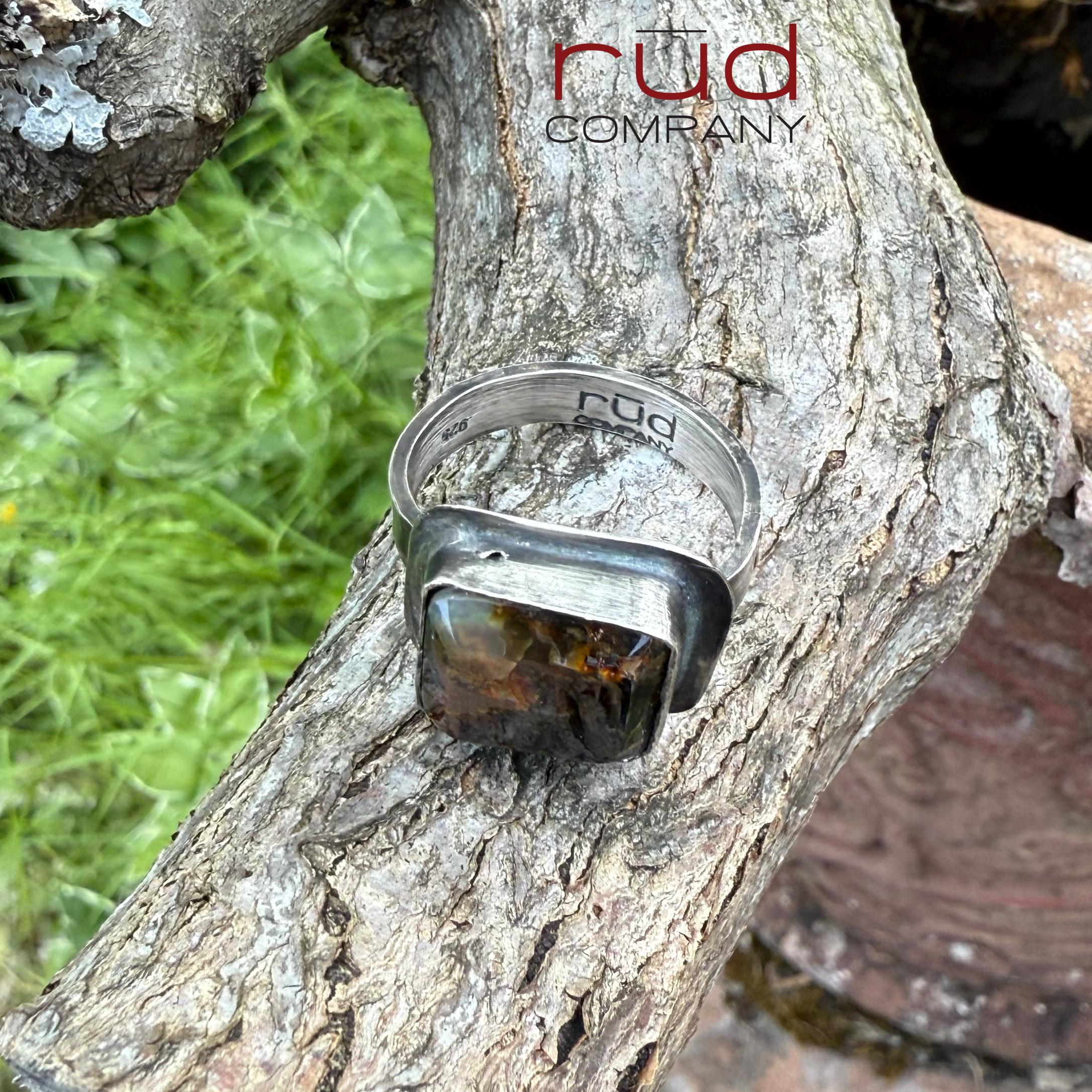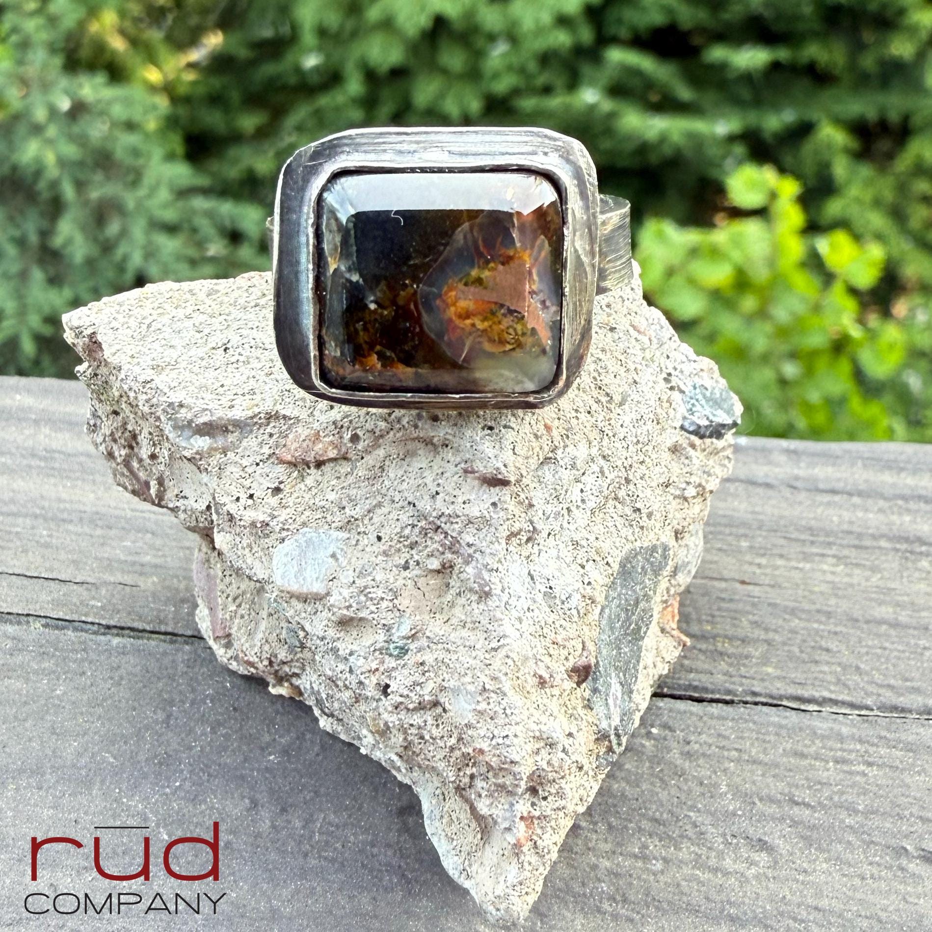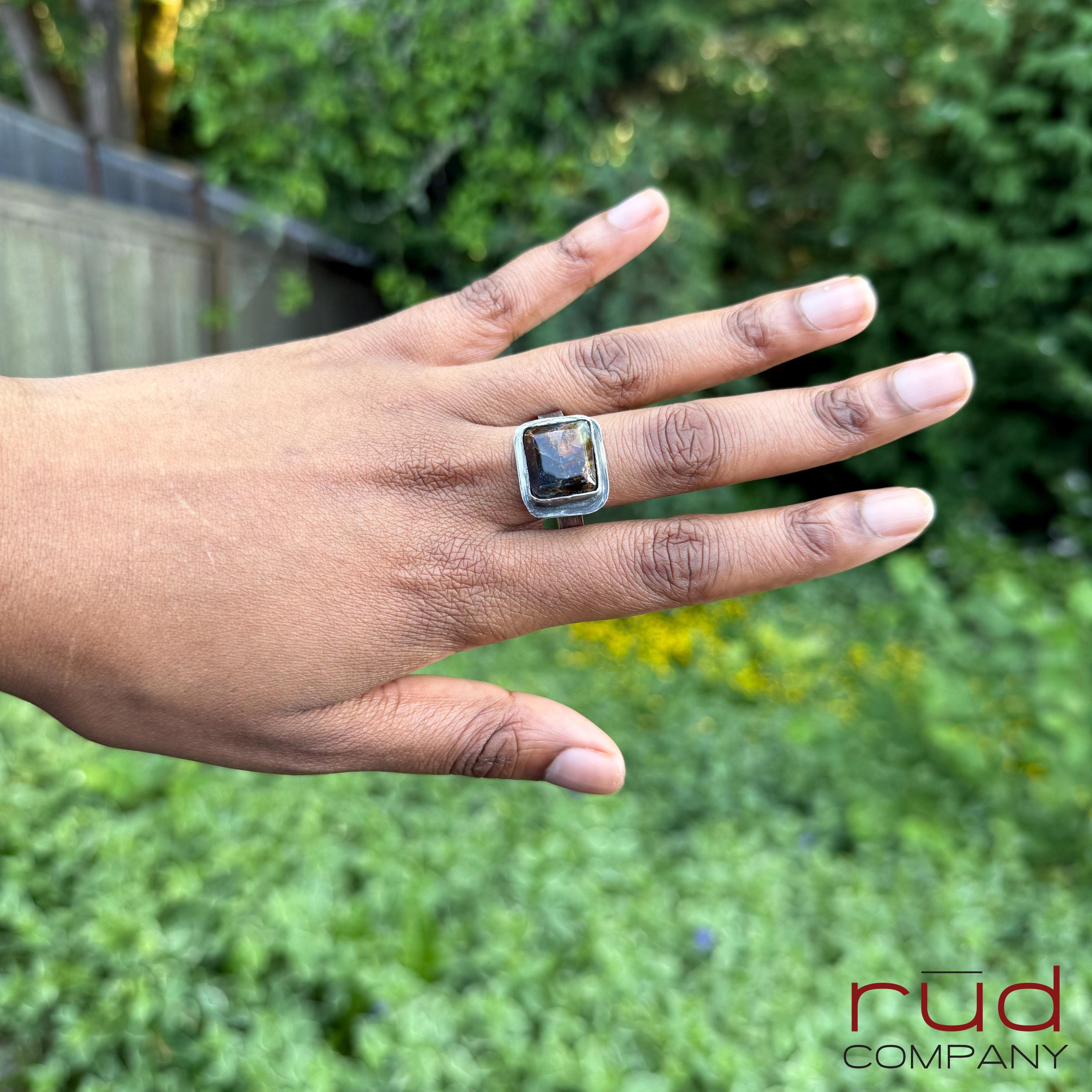 This ring will set you apart - there is only one and this stone/material is very rare and only comes from a single source location in Indonesia. The stonecutter uses a bevel technique that is stunning. I've set it into a scallop-edged sterling silver bezel, with a bit of a flair for comfort and design.