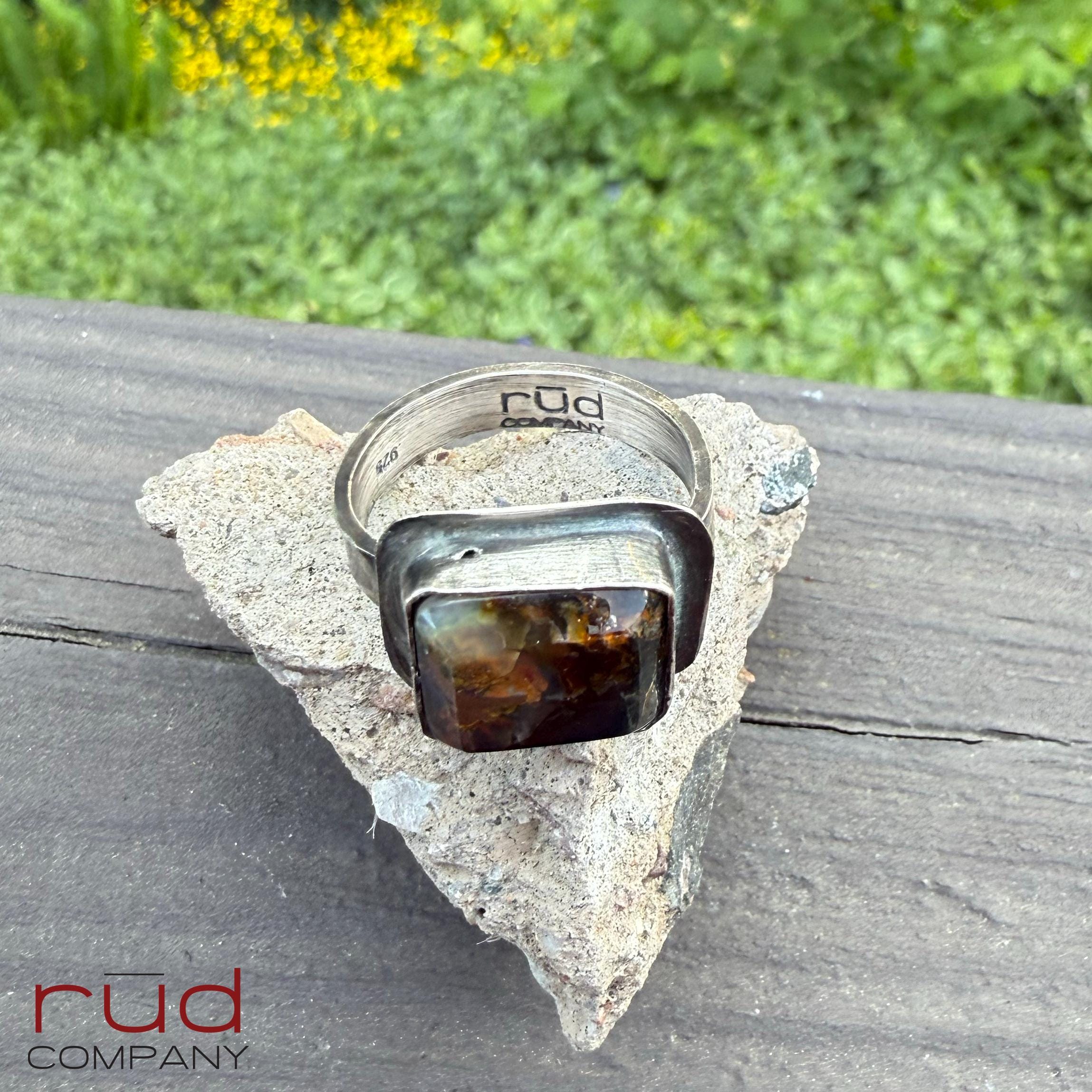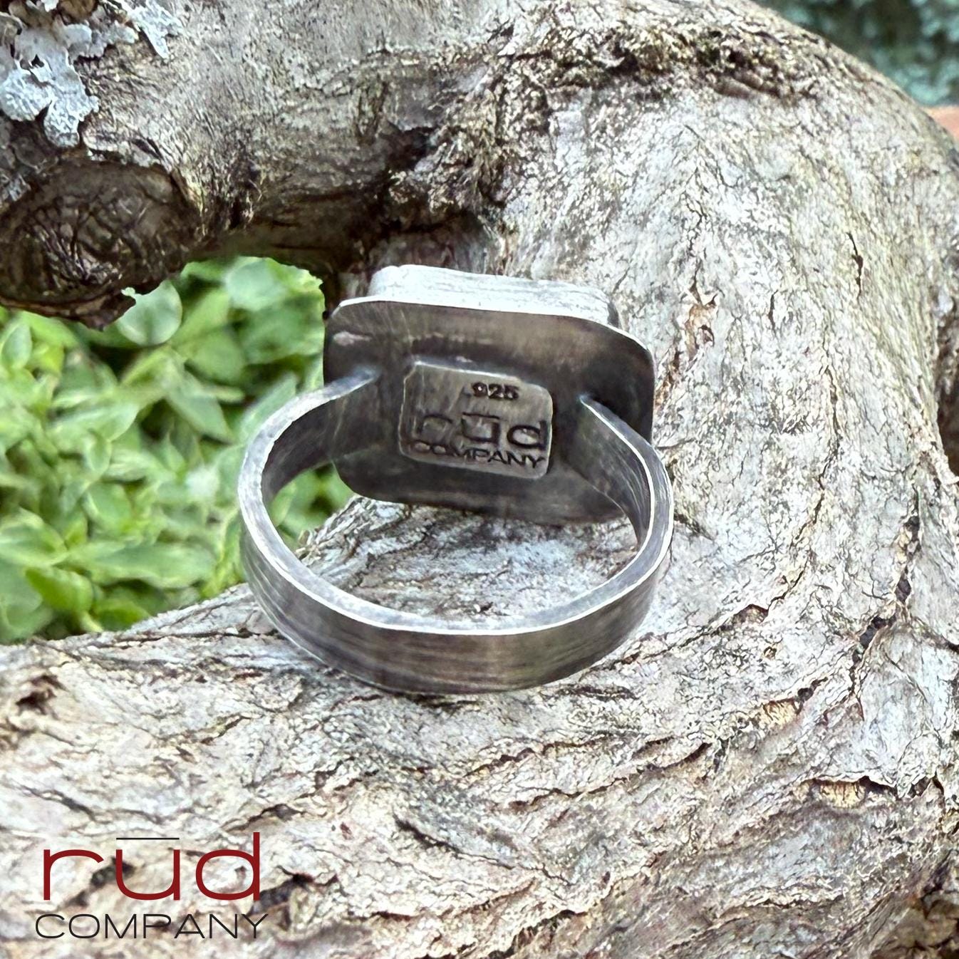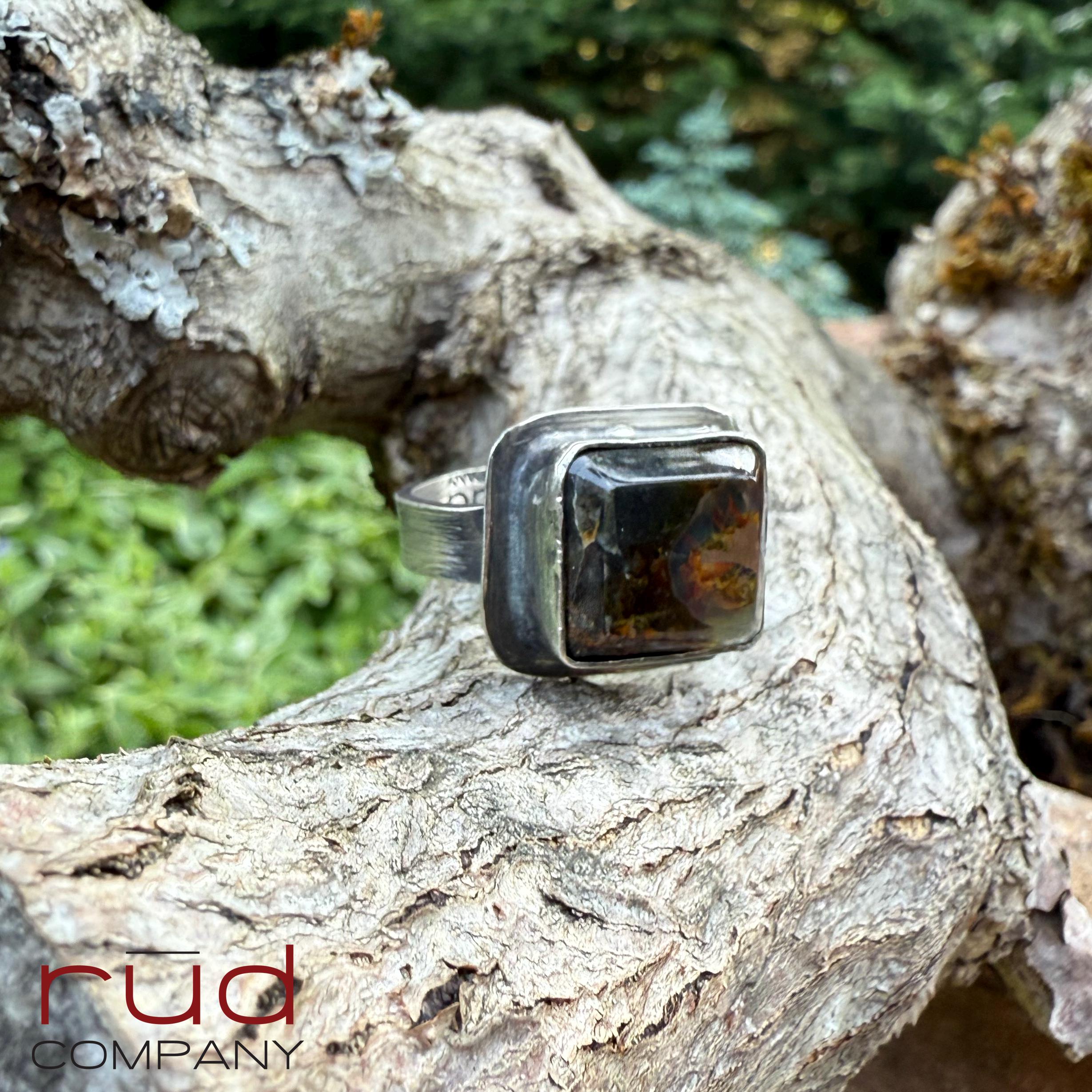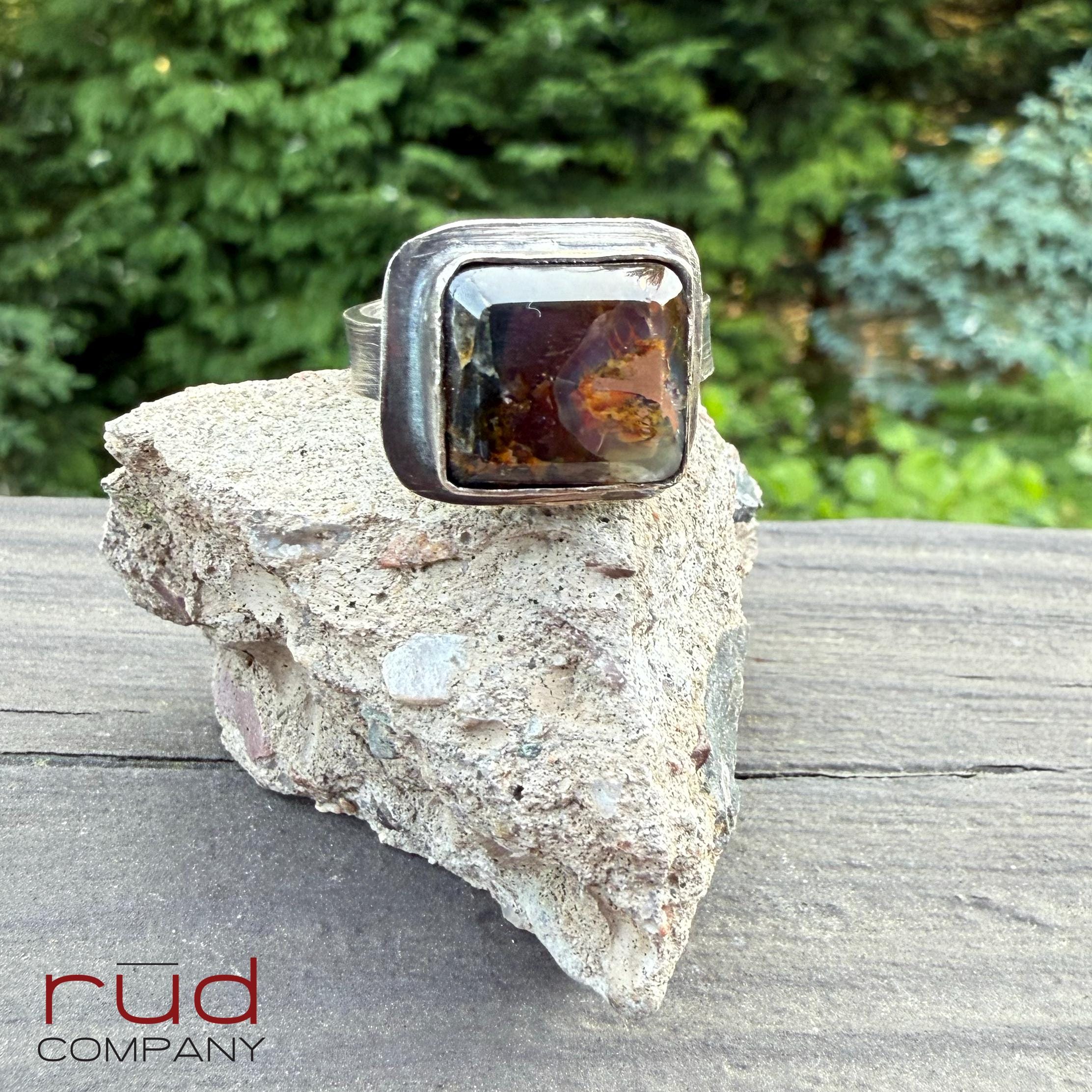 This ring will set you apart - there is only one and this stone/material is very rare and only comes from a single source location in Indonesia. The stonecutter uses a bevel technique that is stunning. I've set it into a scallop-edged sterling silver bezel, with a bit of a flair for comfort and design.