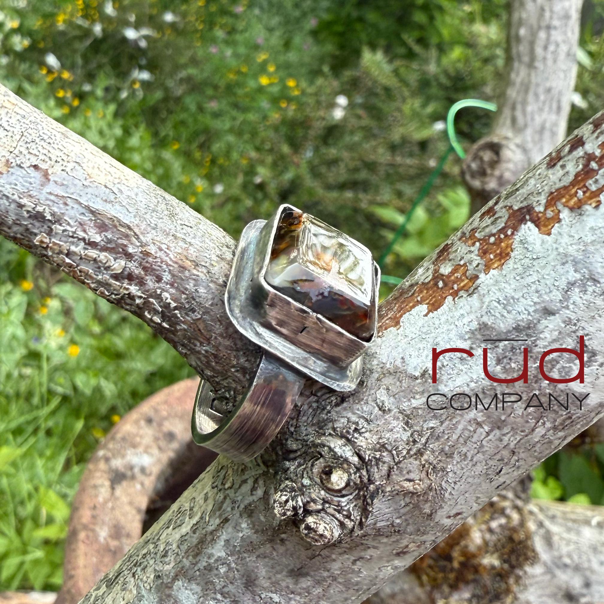 This lovely handcrafted, one of a kind solid sterling silver bezel set statement ring showcases an exquisite, expertly cut native copper in black chalcedony beveled square cabochon. An incredibly rare piece! The swirls of dark caramel browns, smoky gray and black, a spot of semi-translucent cream... and the best part, a large flake of native copper. Reflective in the right light/angle (see video).