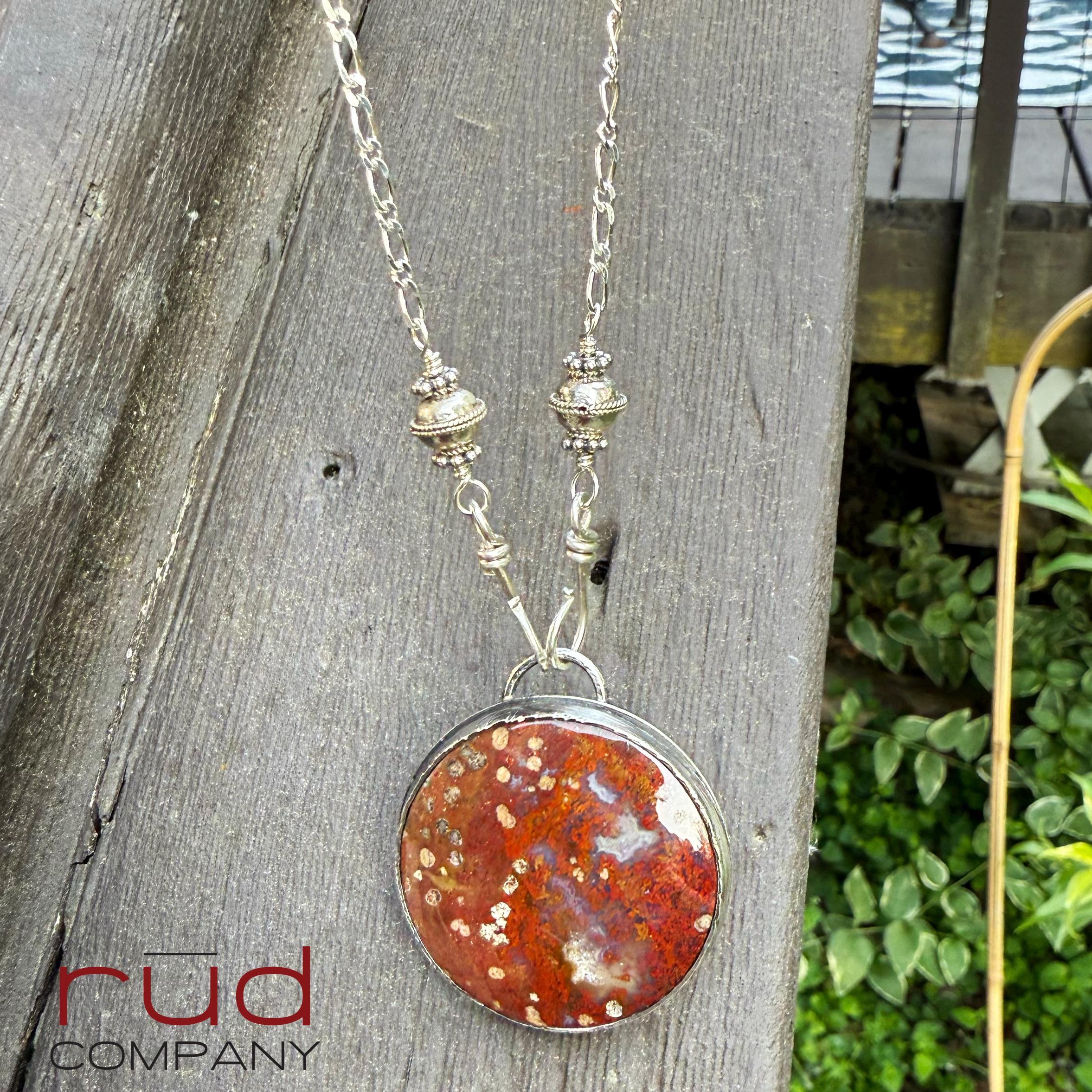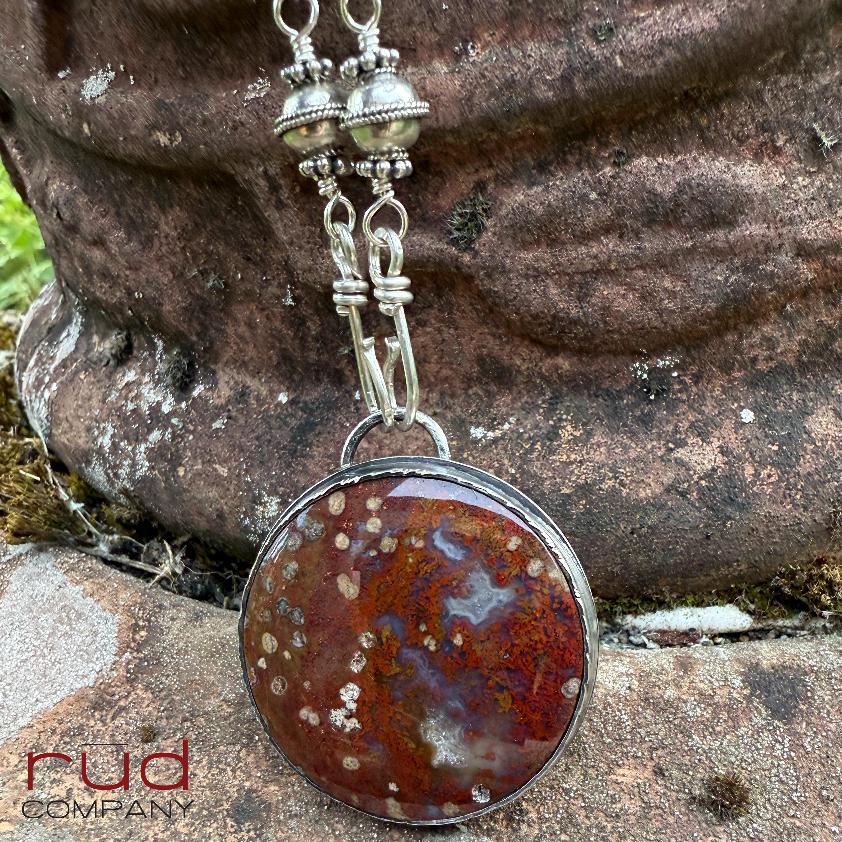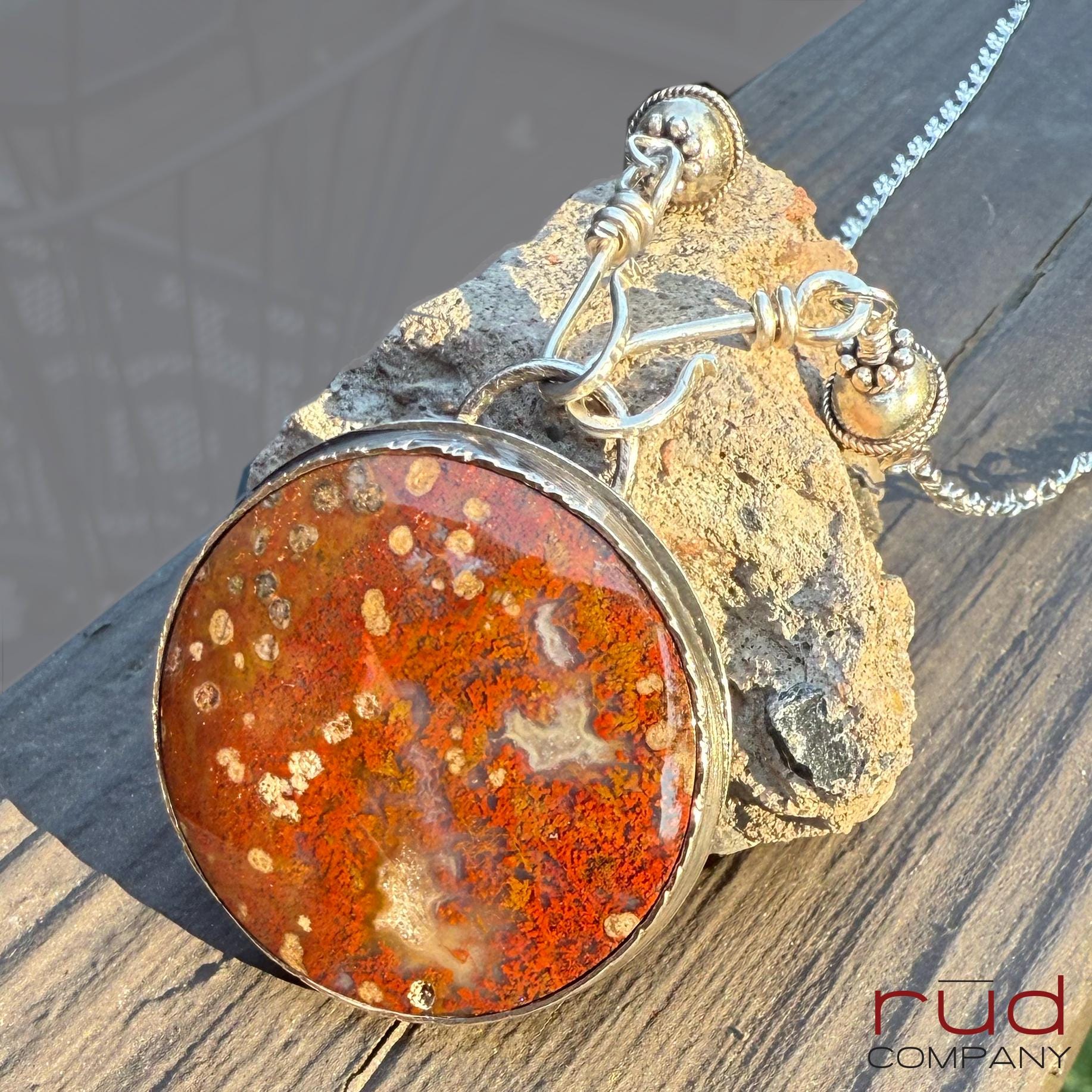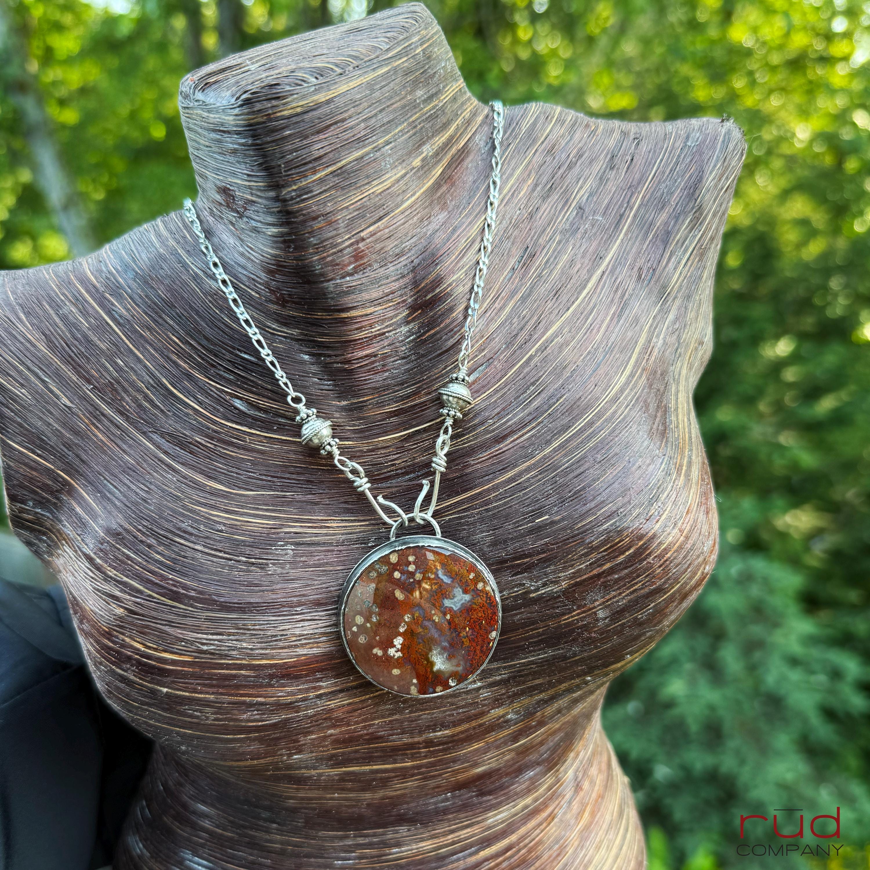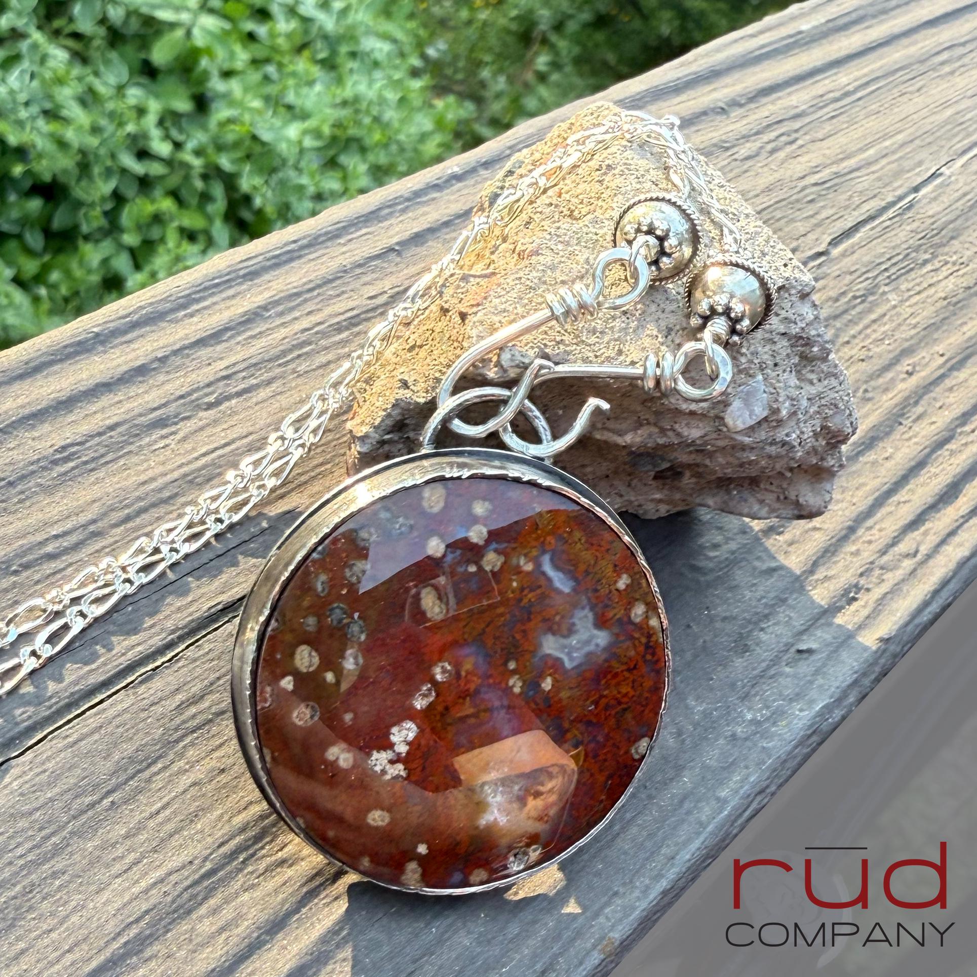 Land Before Time - Petrified Agatized Red Palm Root Round Cabochon set in Sterling Silver Necklace