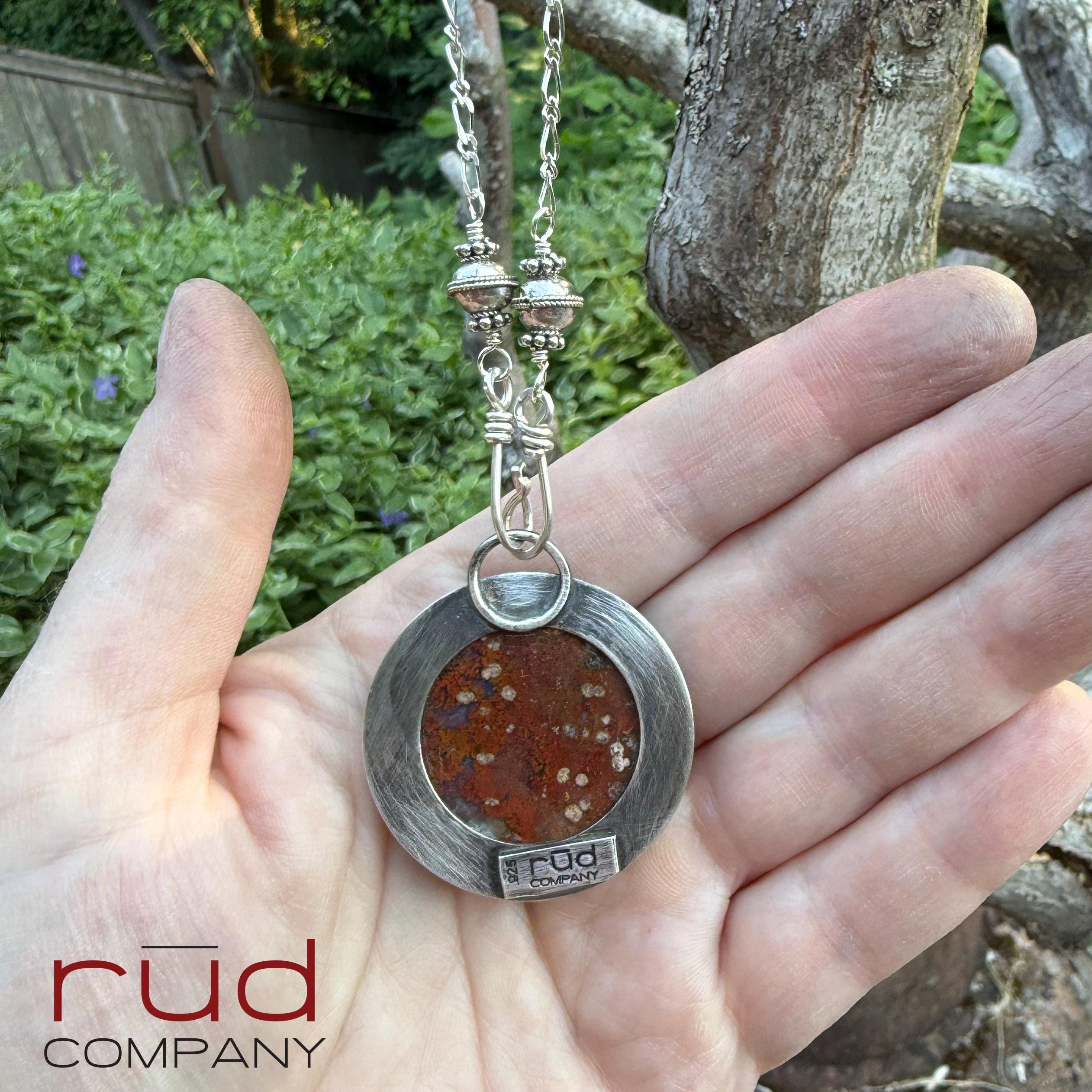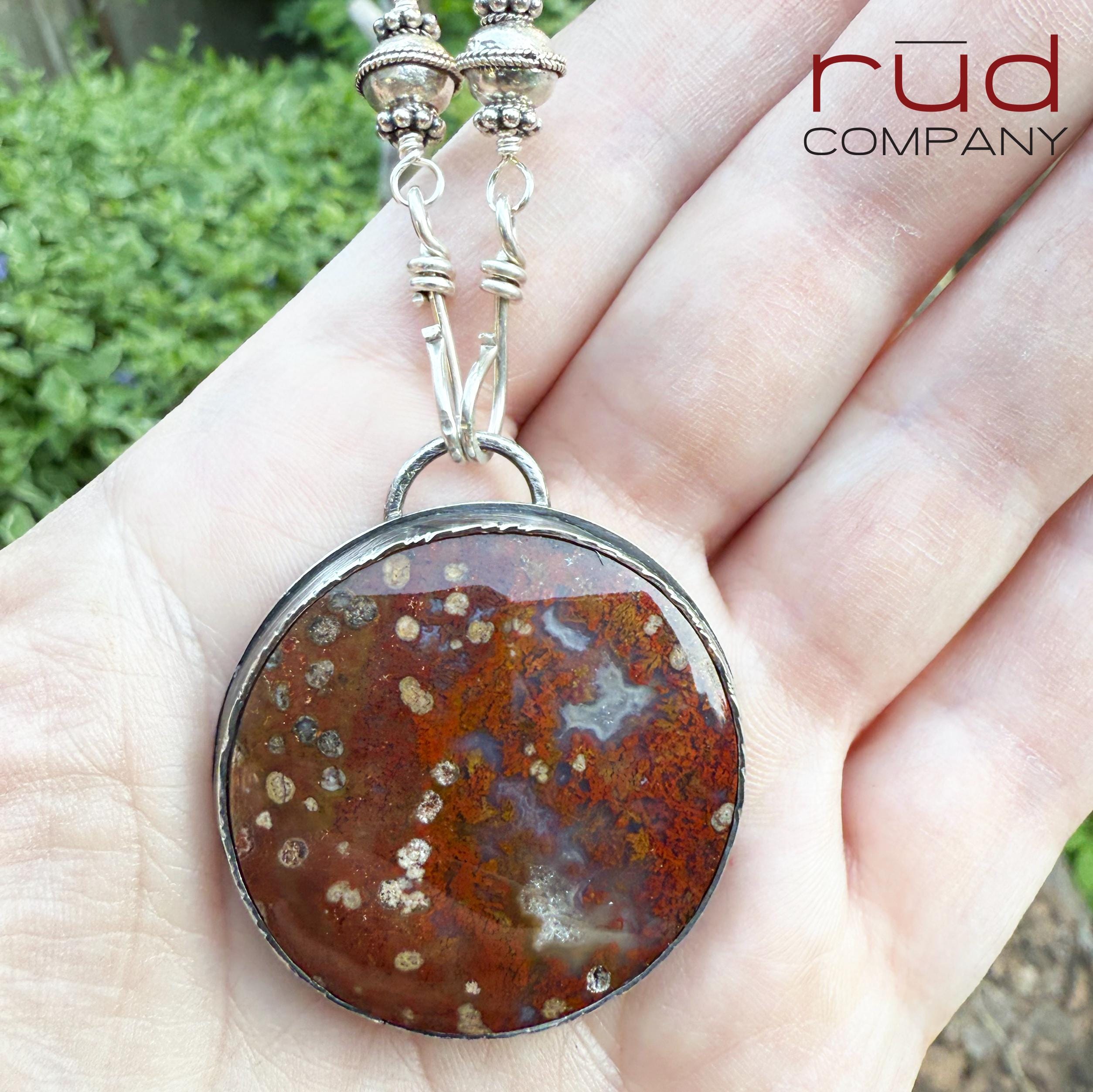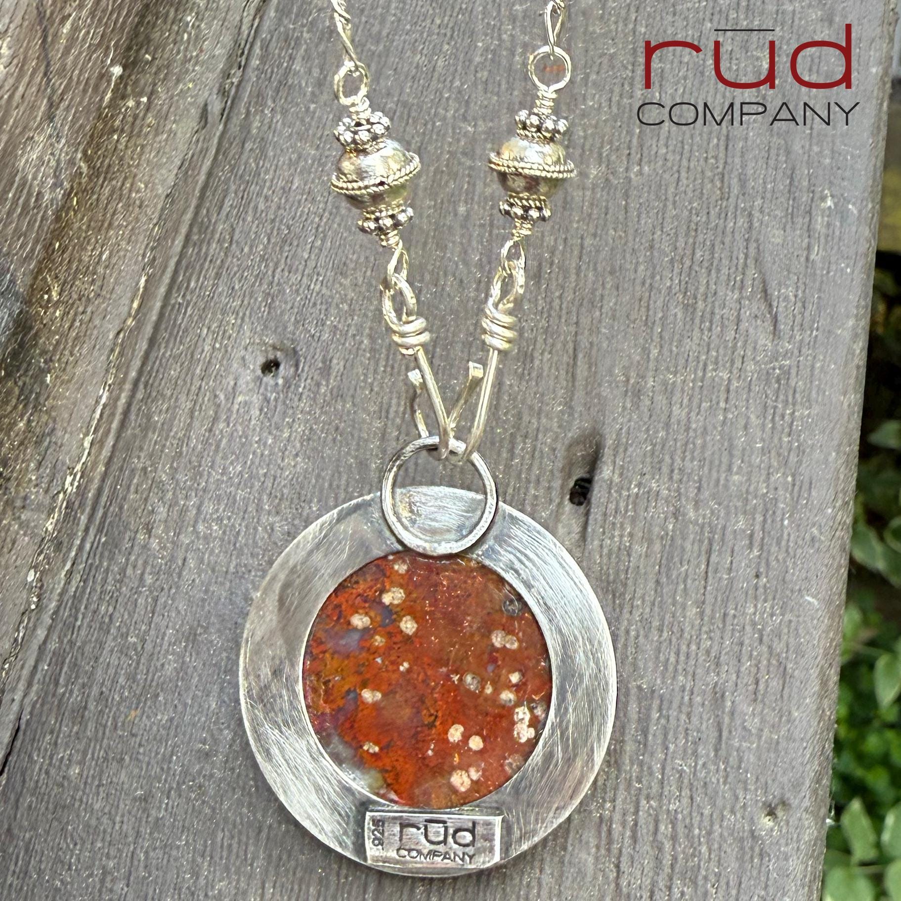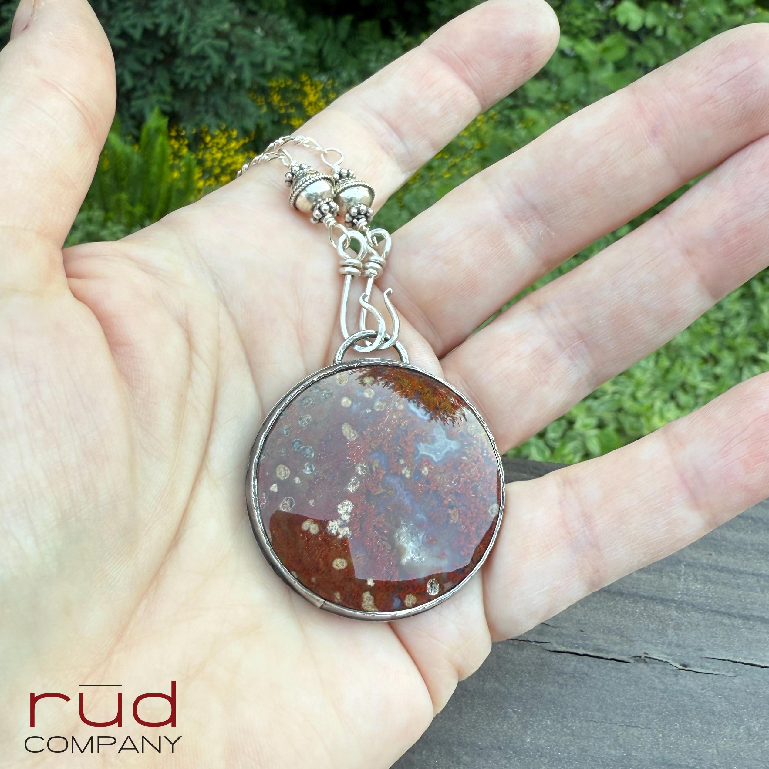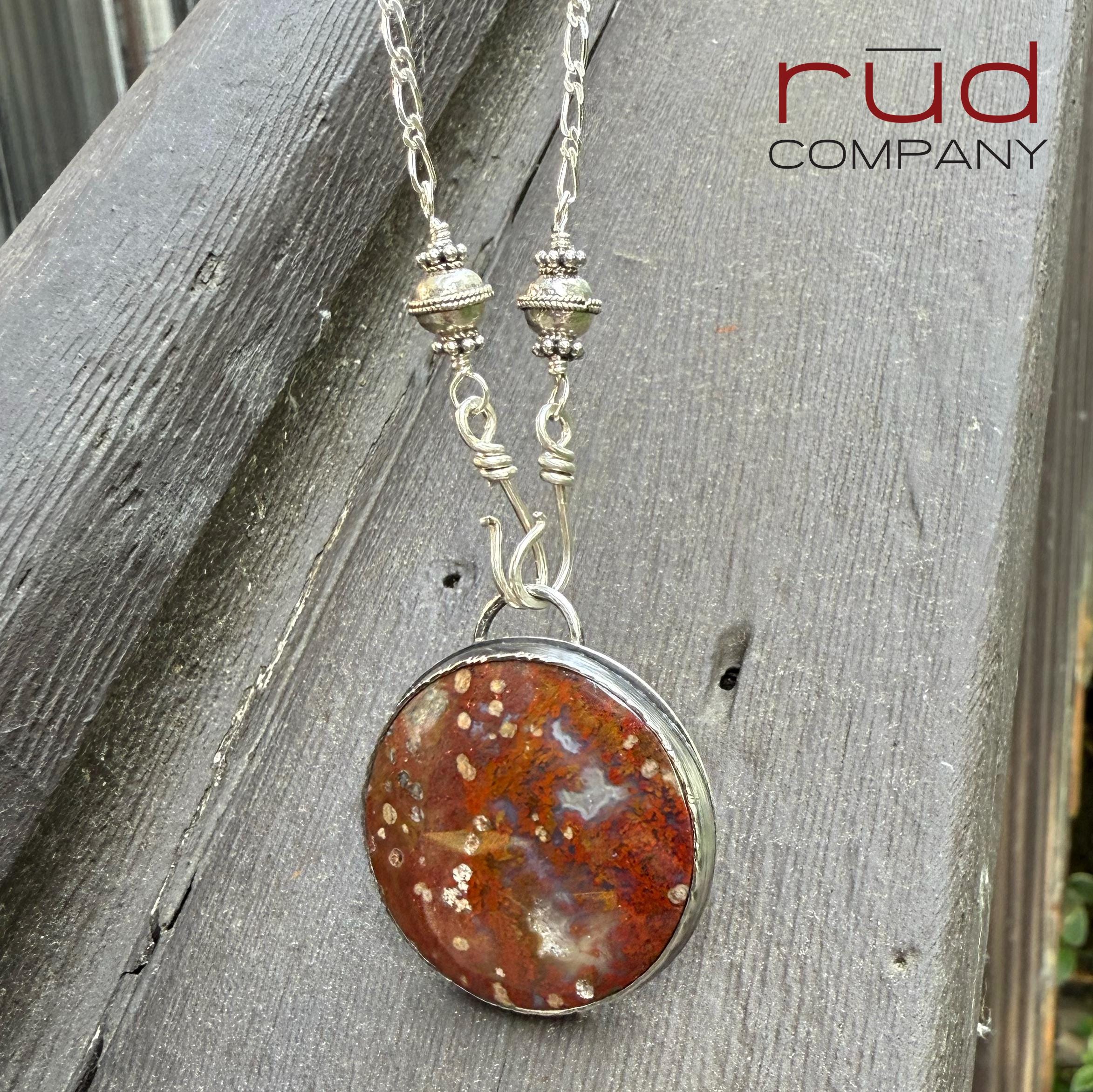 Land Before Time - Petrified Agatized Red Palm Root Round Cabochon set in Sterling Silver Necklace