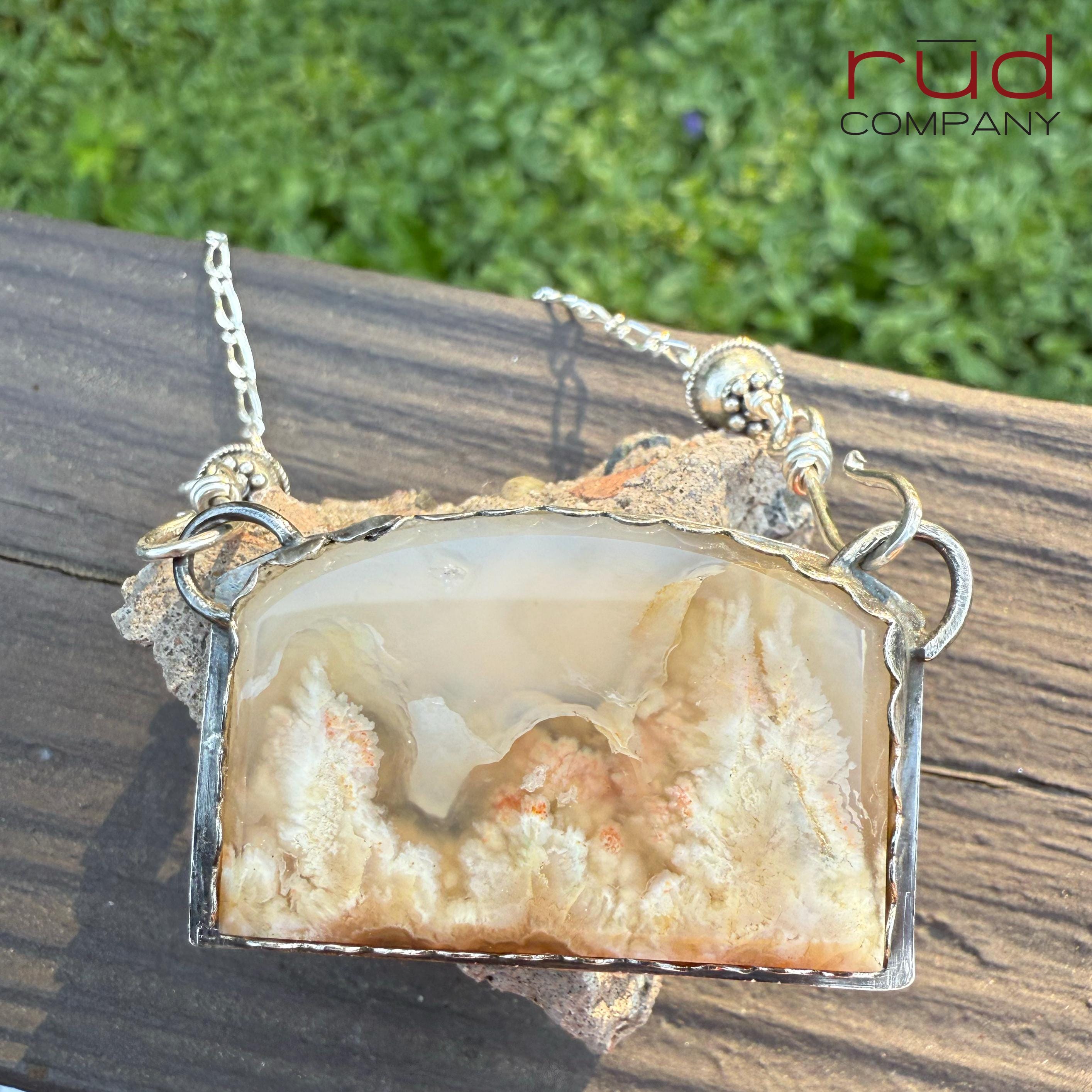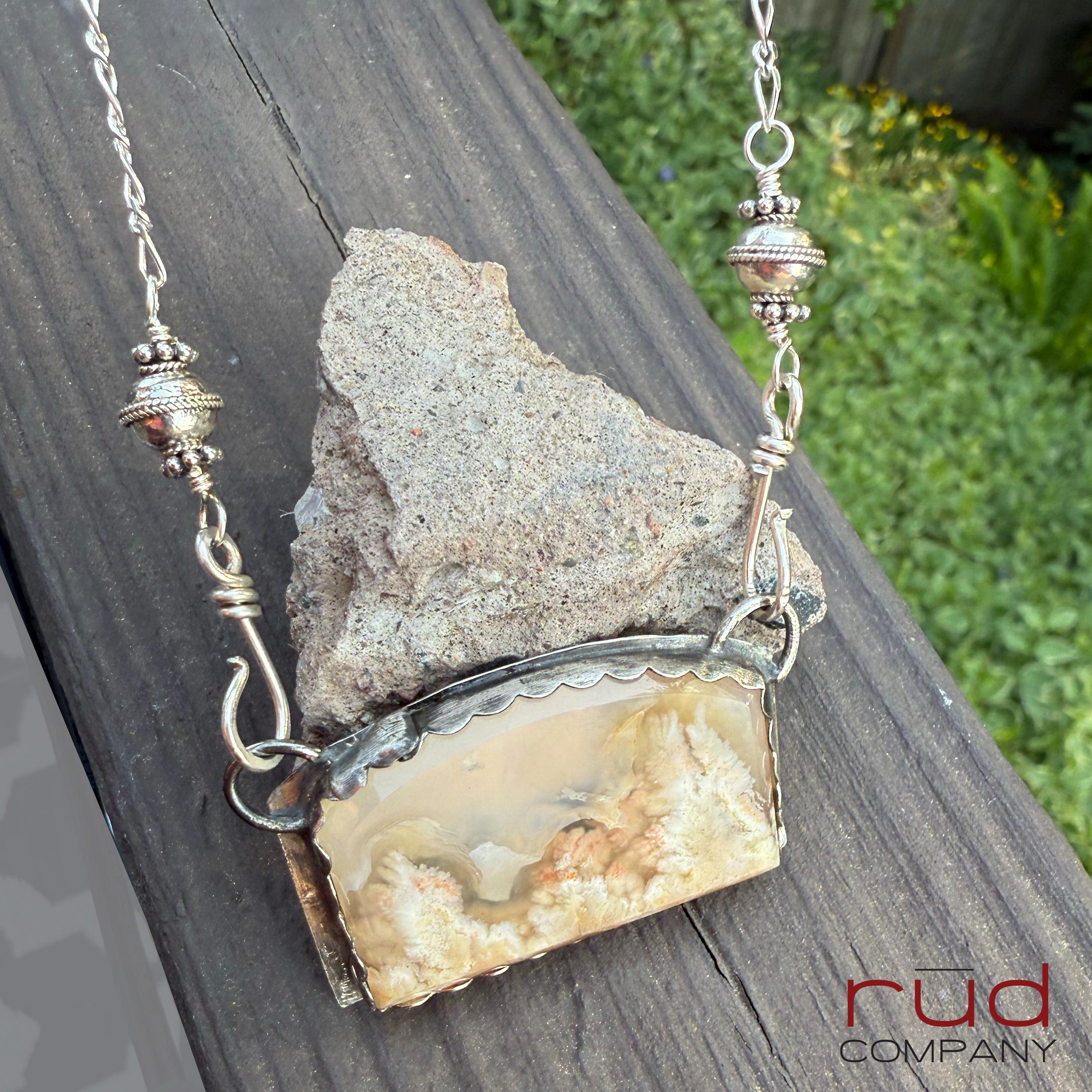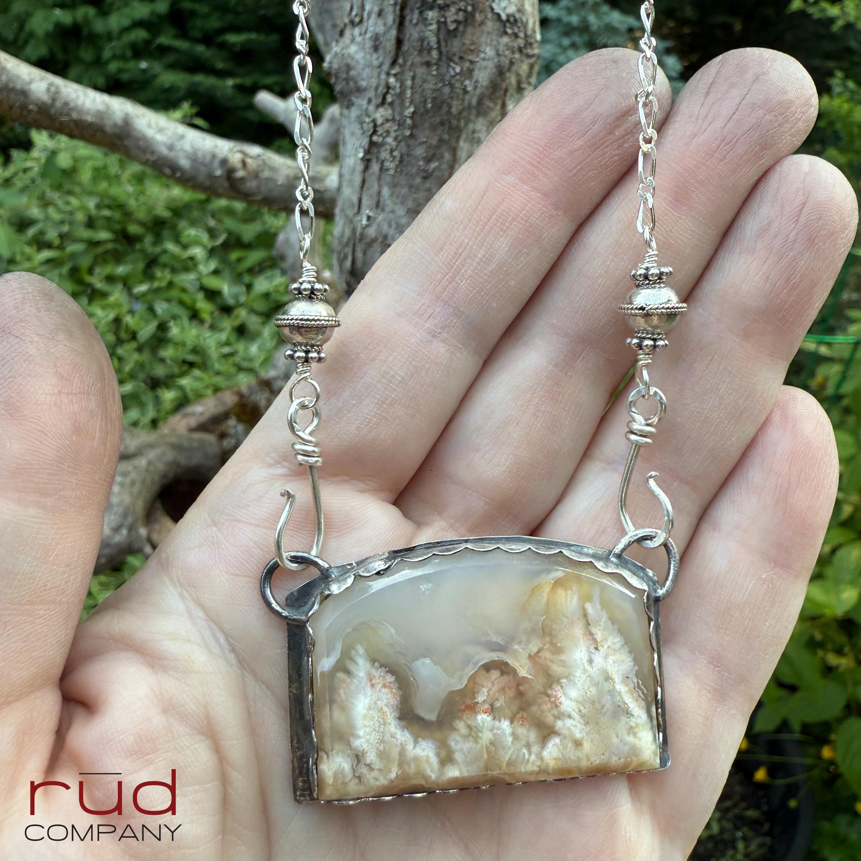 Nature's Portrait - Feather Plume Agate Beveled Freeform Cabochon set Sterling Silver Necklace Handmade One of kind Cream Plume Translucent