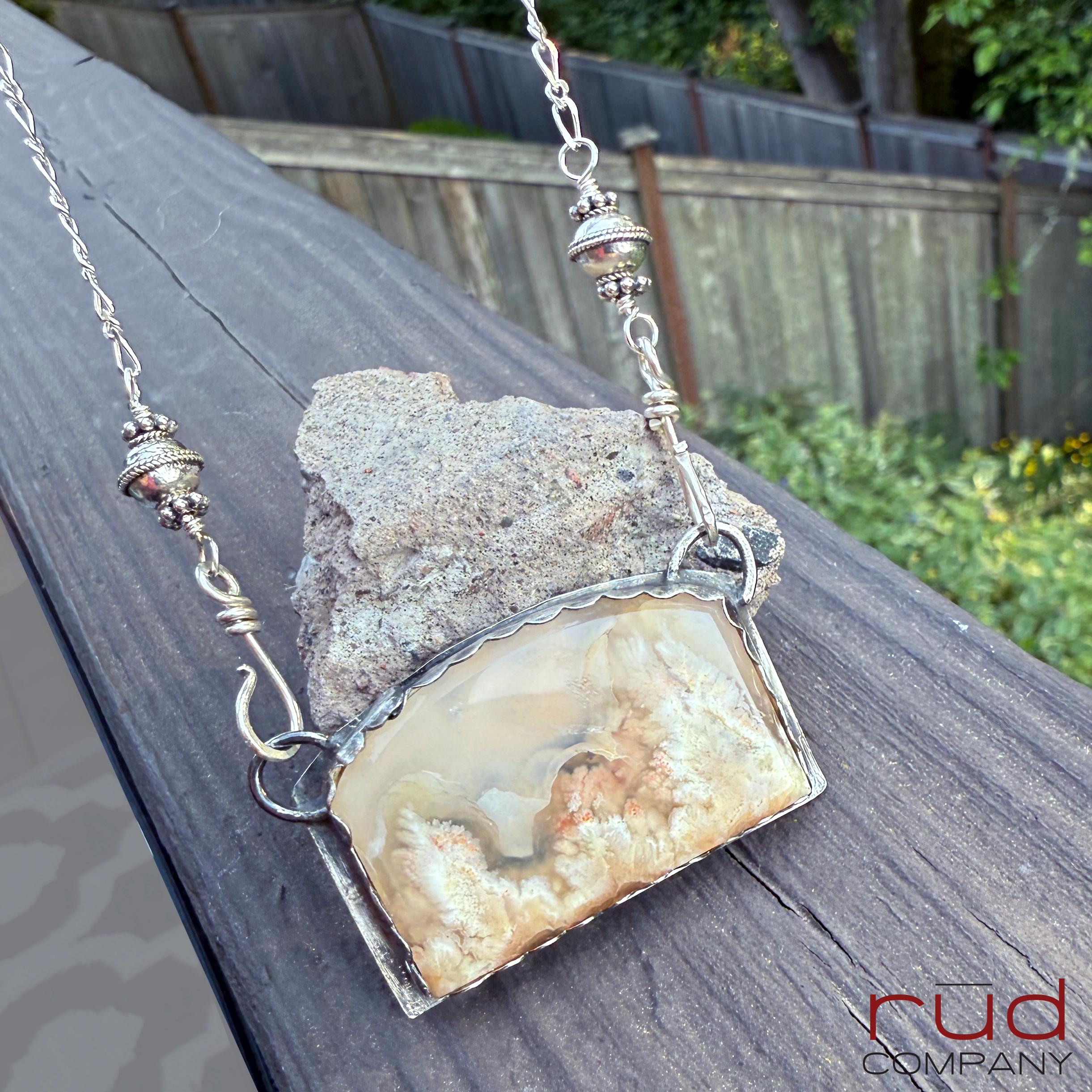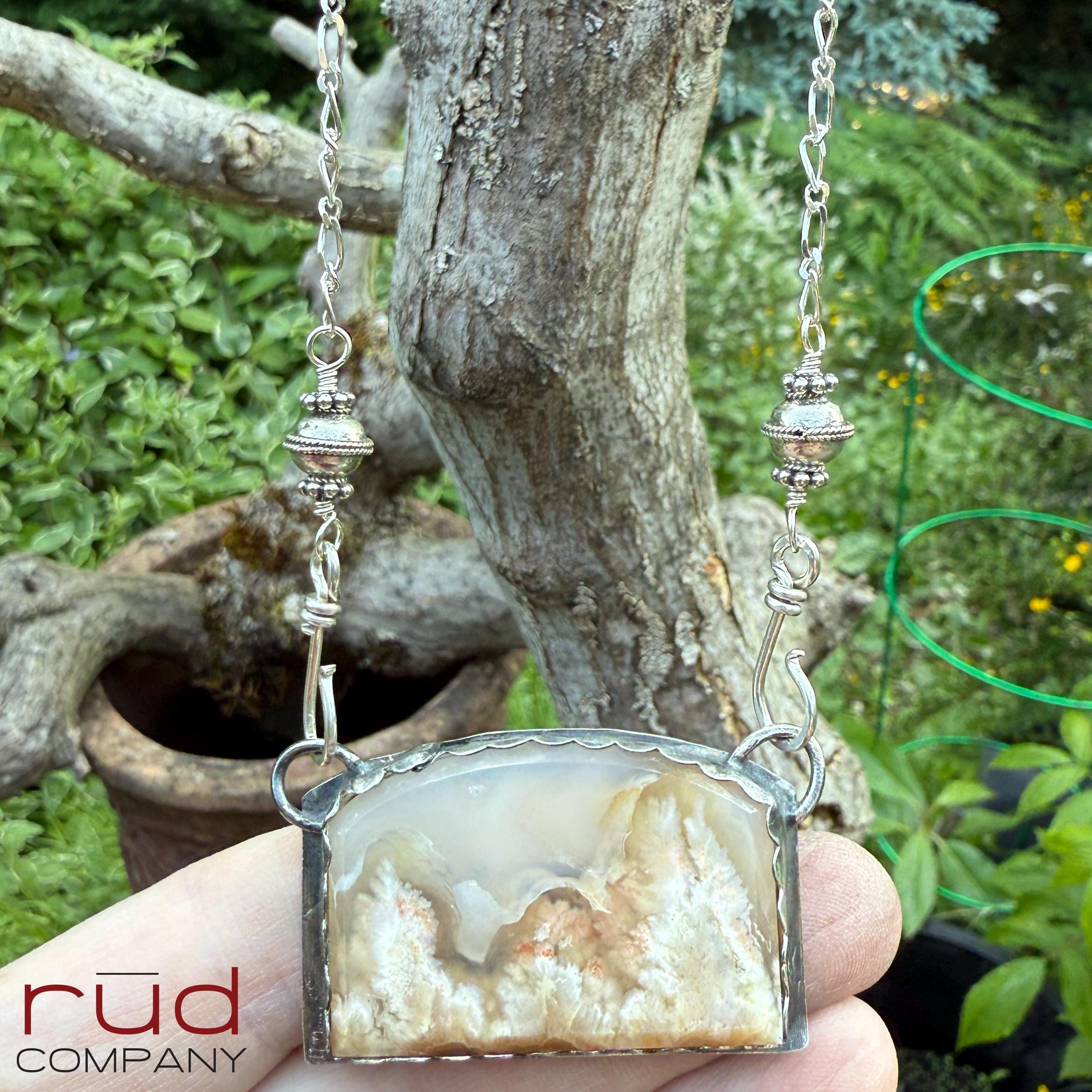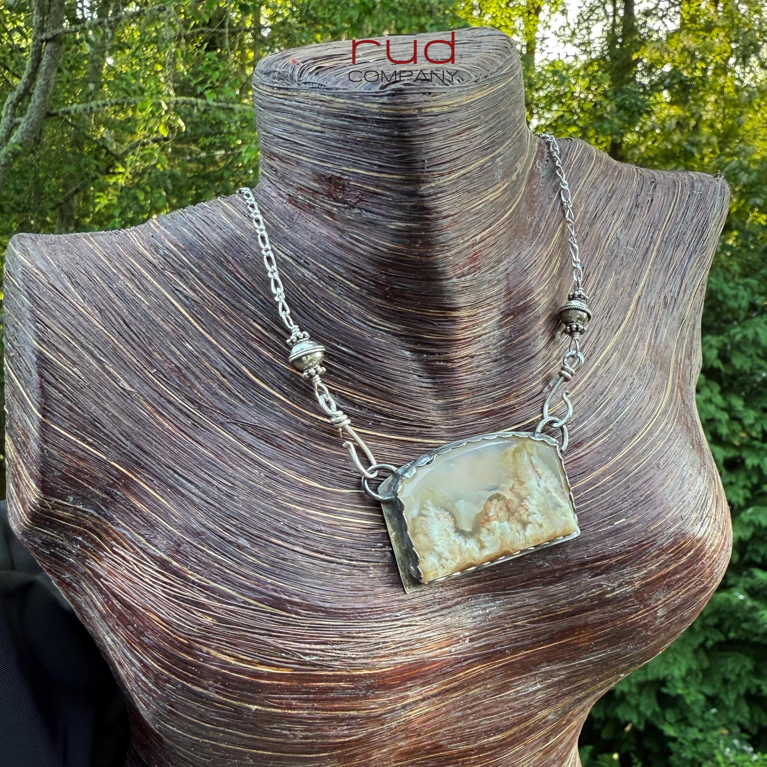 Nature's Portrait - Feather Plume Agate Beveled Freeform Cabochon set Sterling Silver Necklace Handmade One of kind Cream Plume Translucent