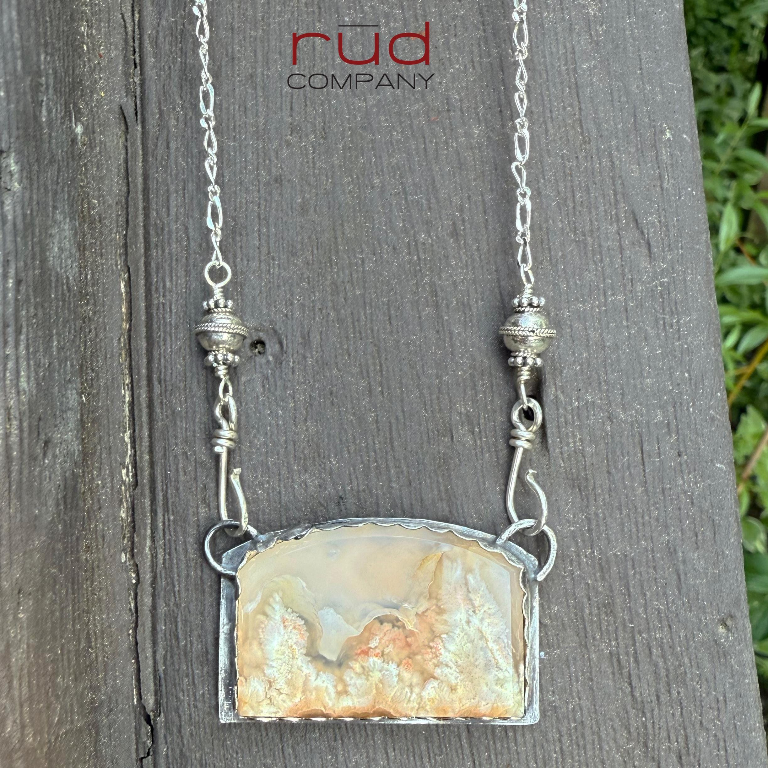 This lovely handcrafted, one of a kind solid sterling silver necklace is set with an exquisite, expertly cut and polished Indonesian Feather Plume Agate Freeform Beveled Cabochon. The necklace is made from sterling silver figaro chain, with hand-wired connections of bali-silver beads and double hooks - this makes it easy to put on anytime! You can choose your length of chain from the menu. The cabochon gets more interesting the longer you gaze at it - feathery plumes of cream and tan with white and tiniest hints of pink. Both sides are polished, beveled cut is flawless. The plumes of cream and translucent agate bring many scenes of nature to mind. A stunning stone indeed.