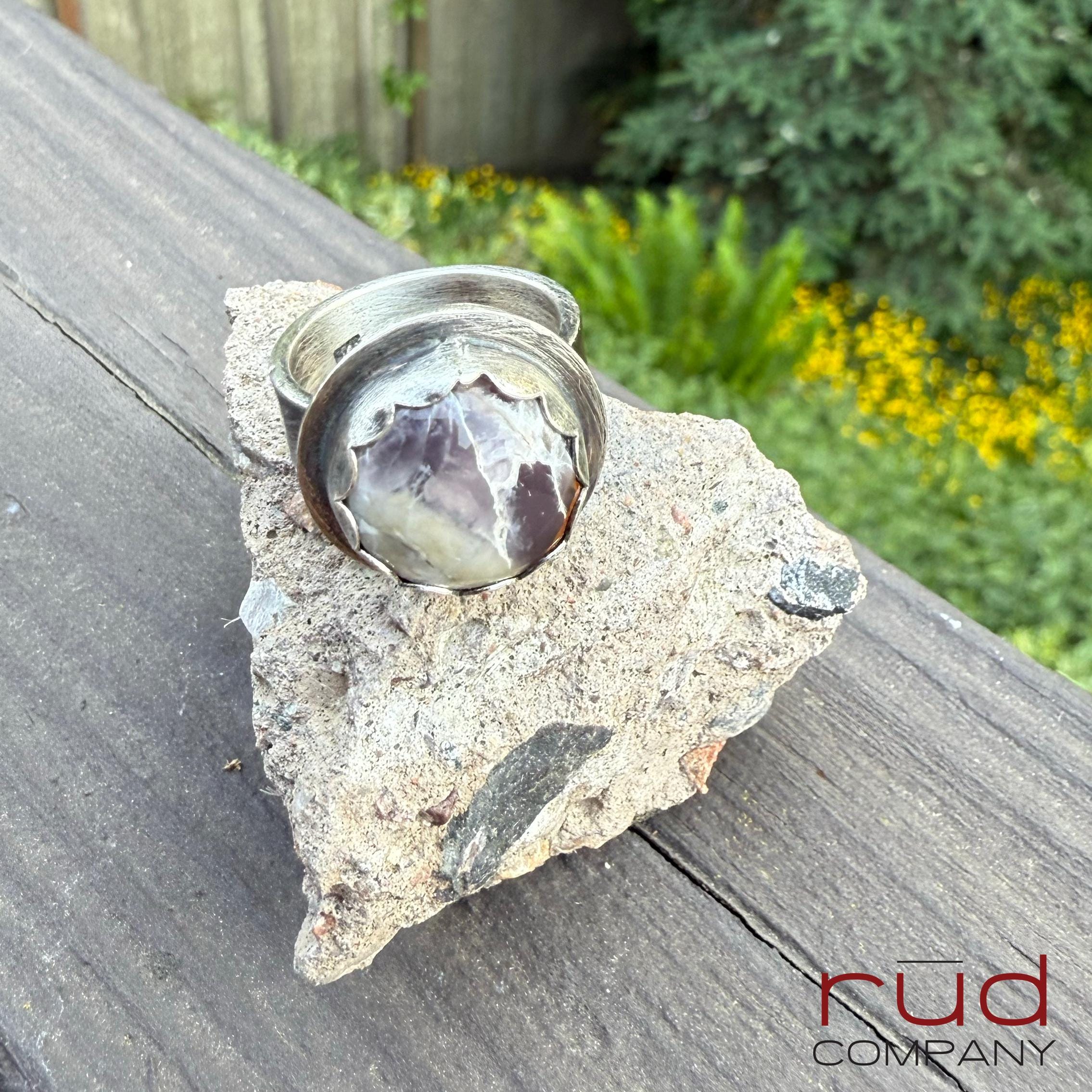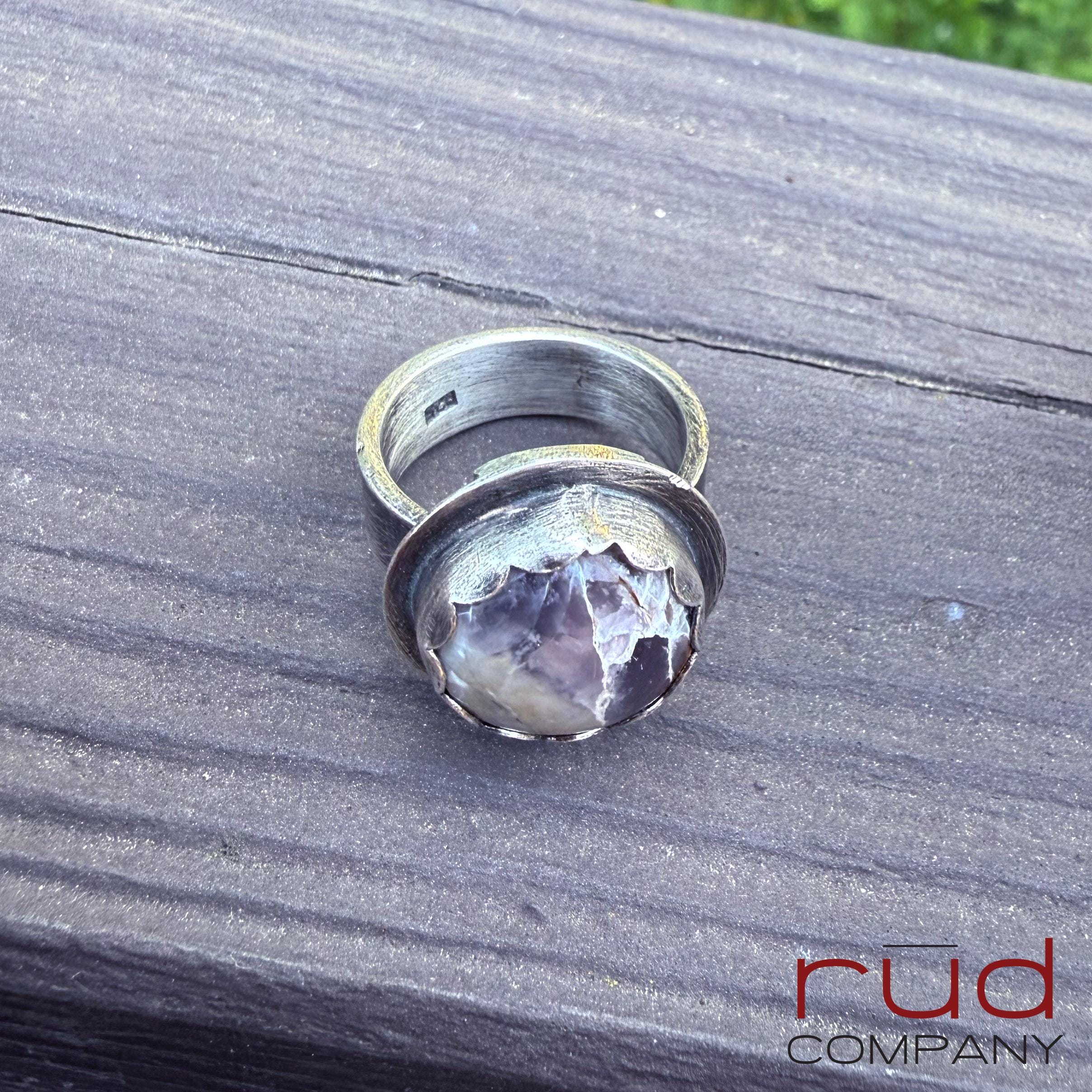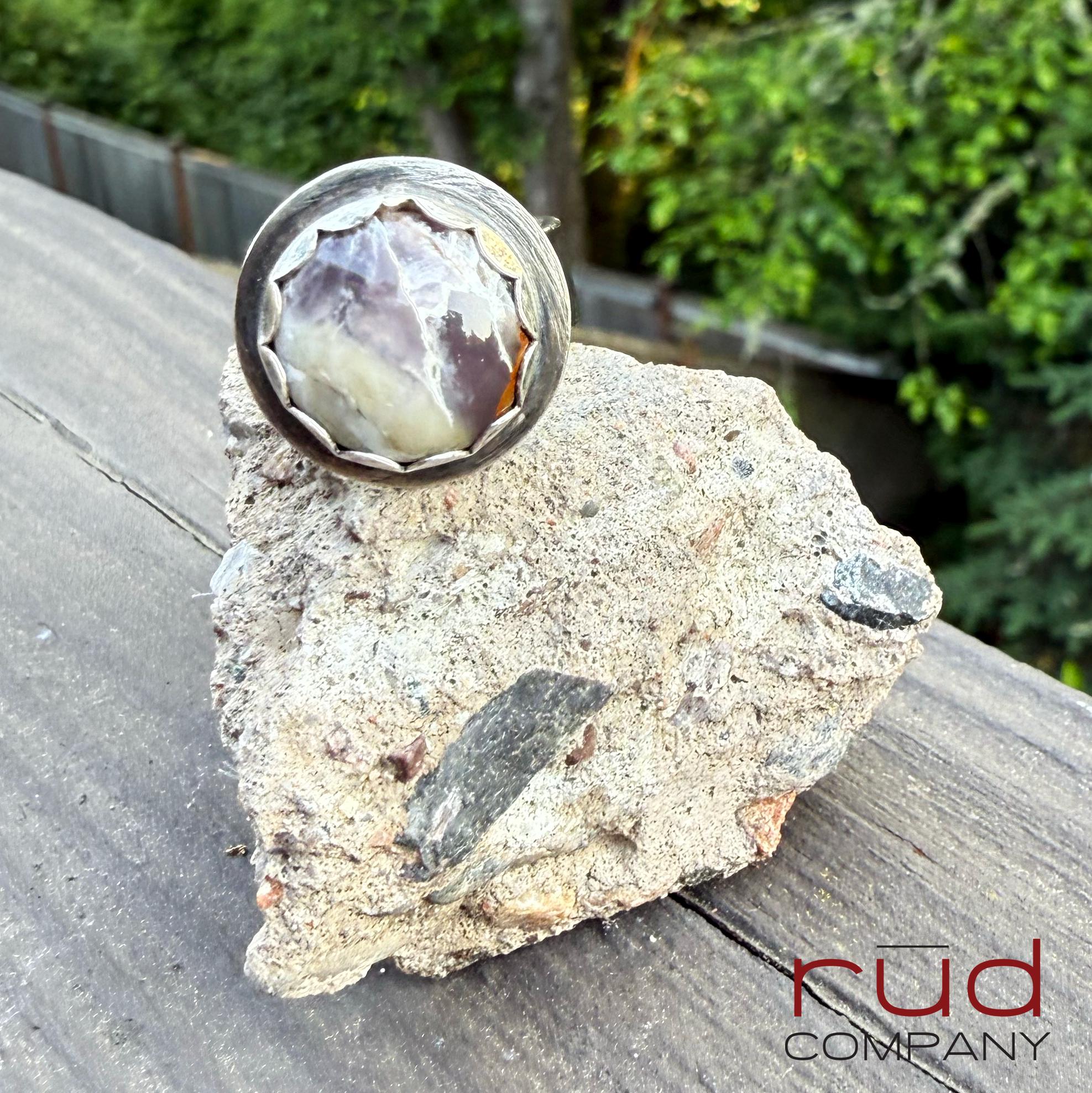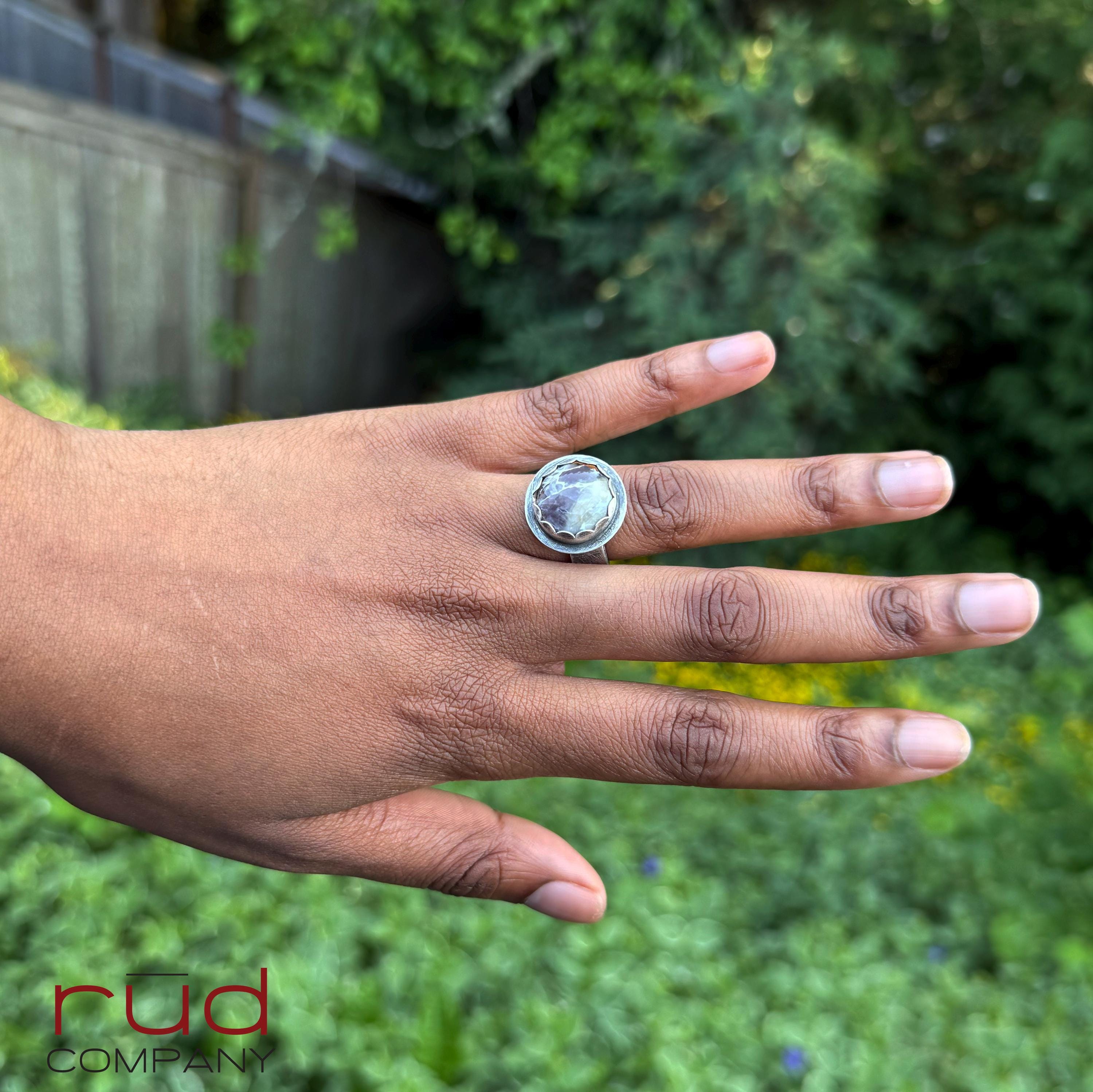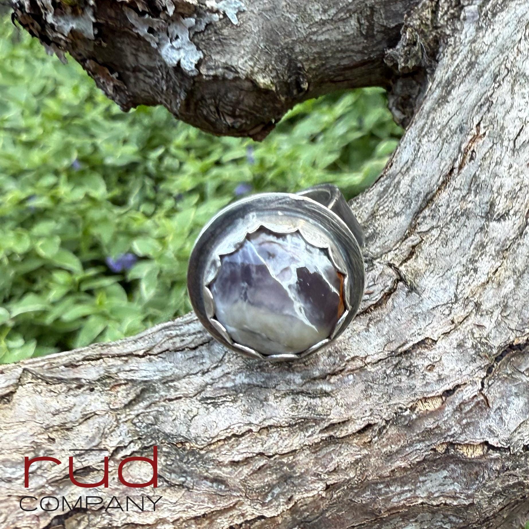 The Oracle's Eye - Domed Cabochon Ring of Common Opal set in Sterling Silver Unisex Size 8 shades of Lavender Purple cream & veins of white