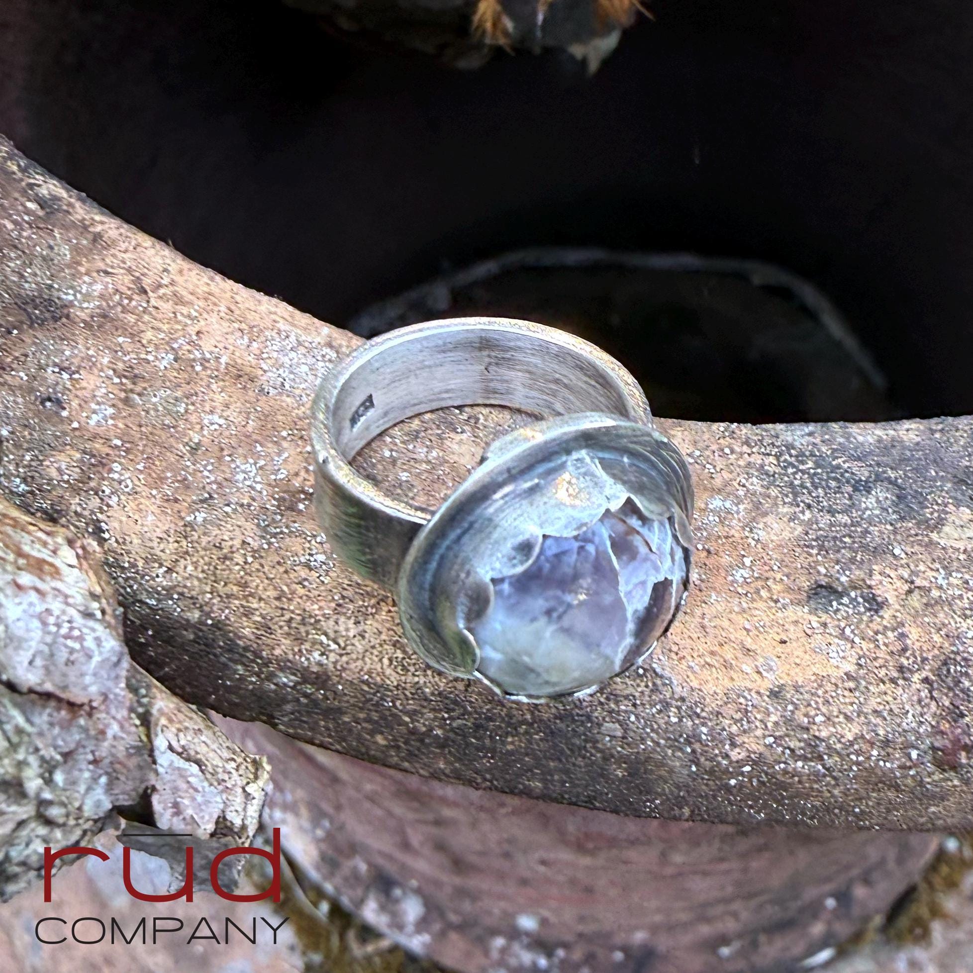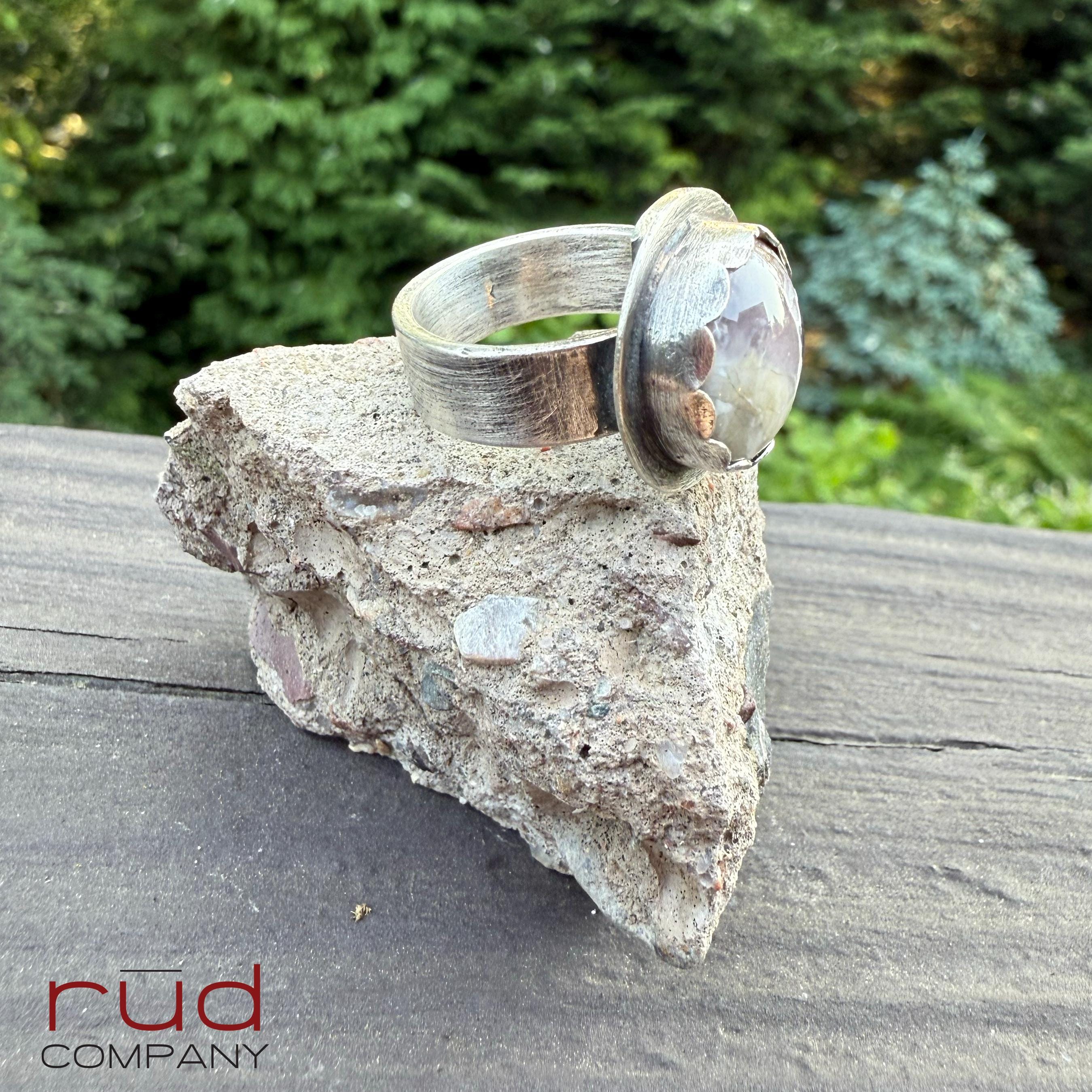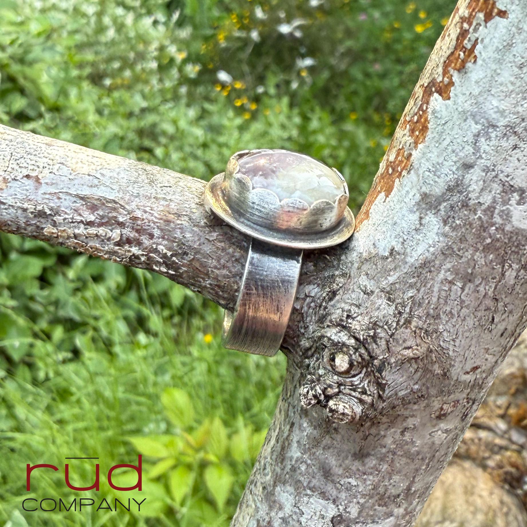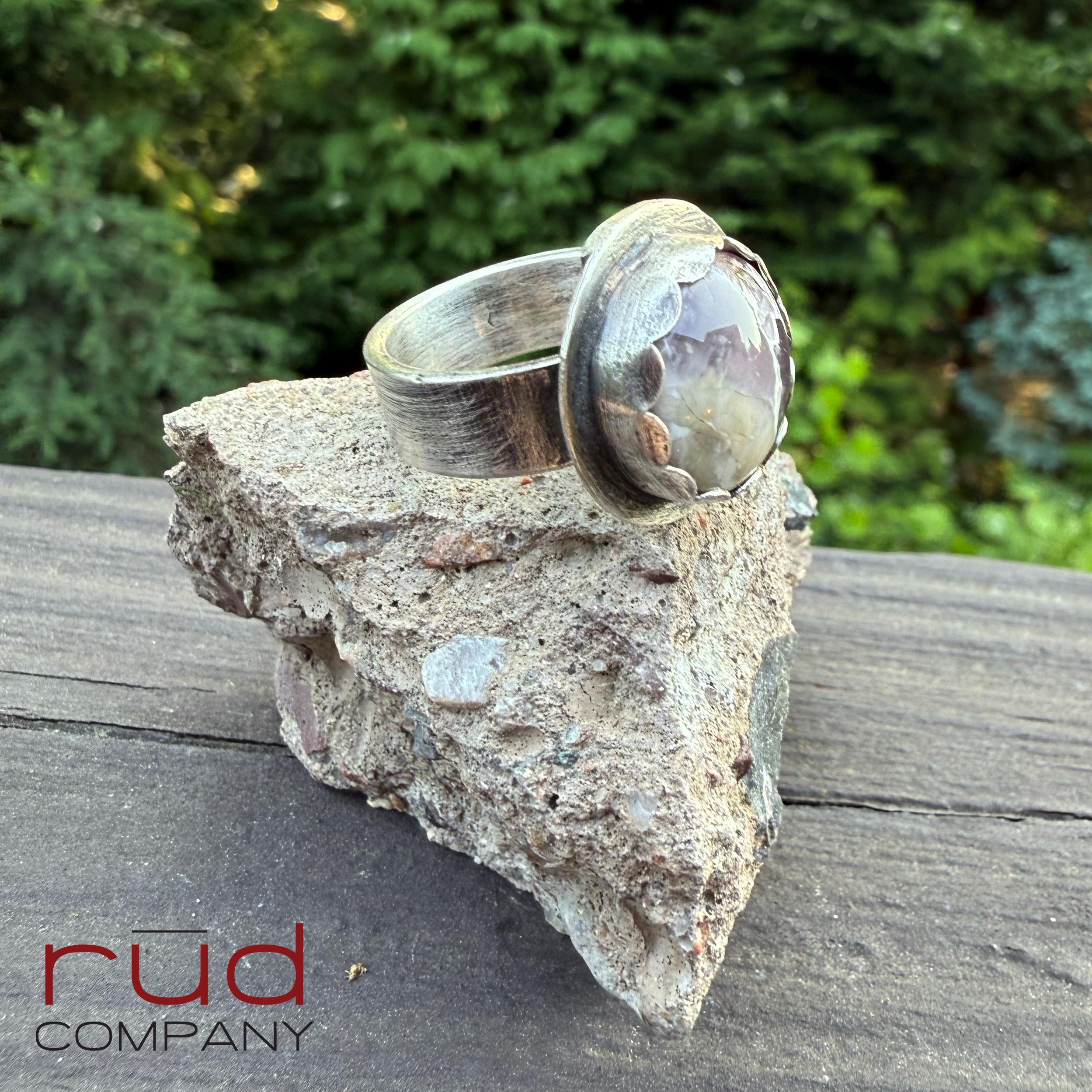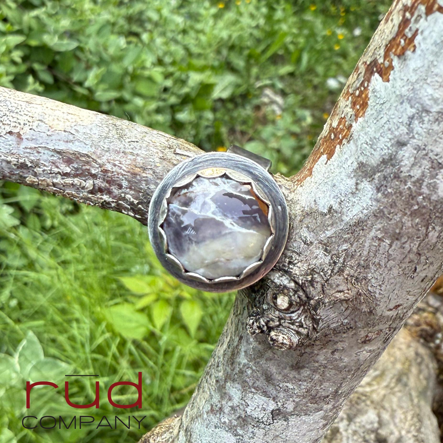 This Stunning handcrafted, one of a kind solid sterling silver bezel set statement ring showcases an exquisite, expertly cut Common Opal cabochon. The ring is well made with a wide 7mm band and a high scalloped bezel and surround by a circular sterling outline. It will be a stunning ring for a human of any gender =) The colors and pattern look like... a storm cloud or ancient Oracle sky... do you see it?