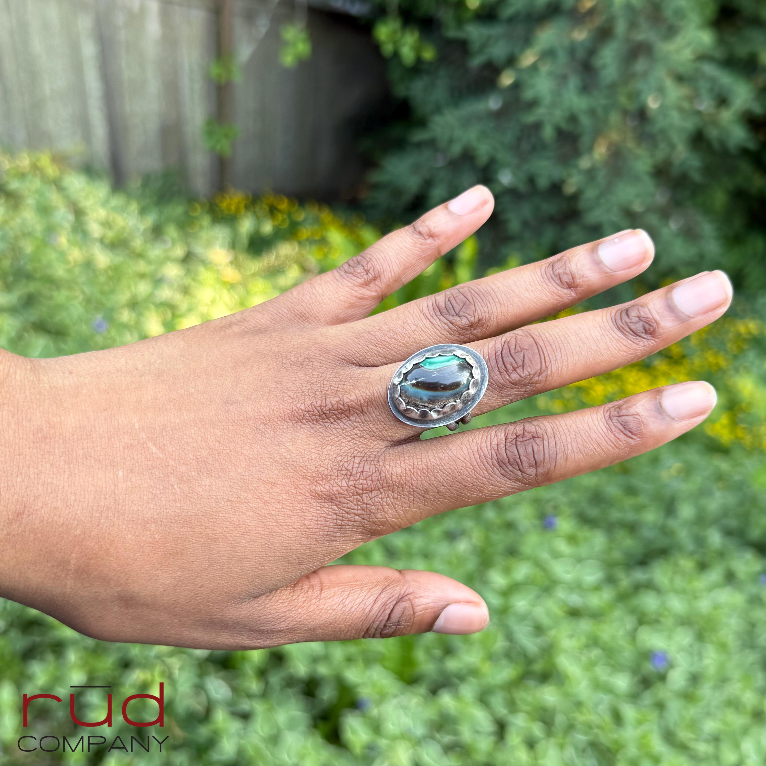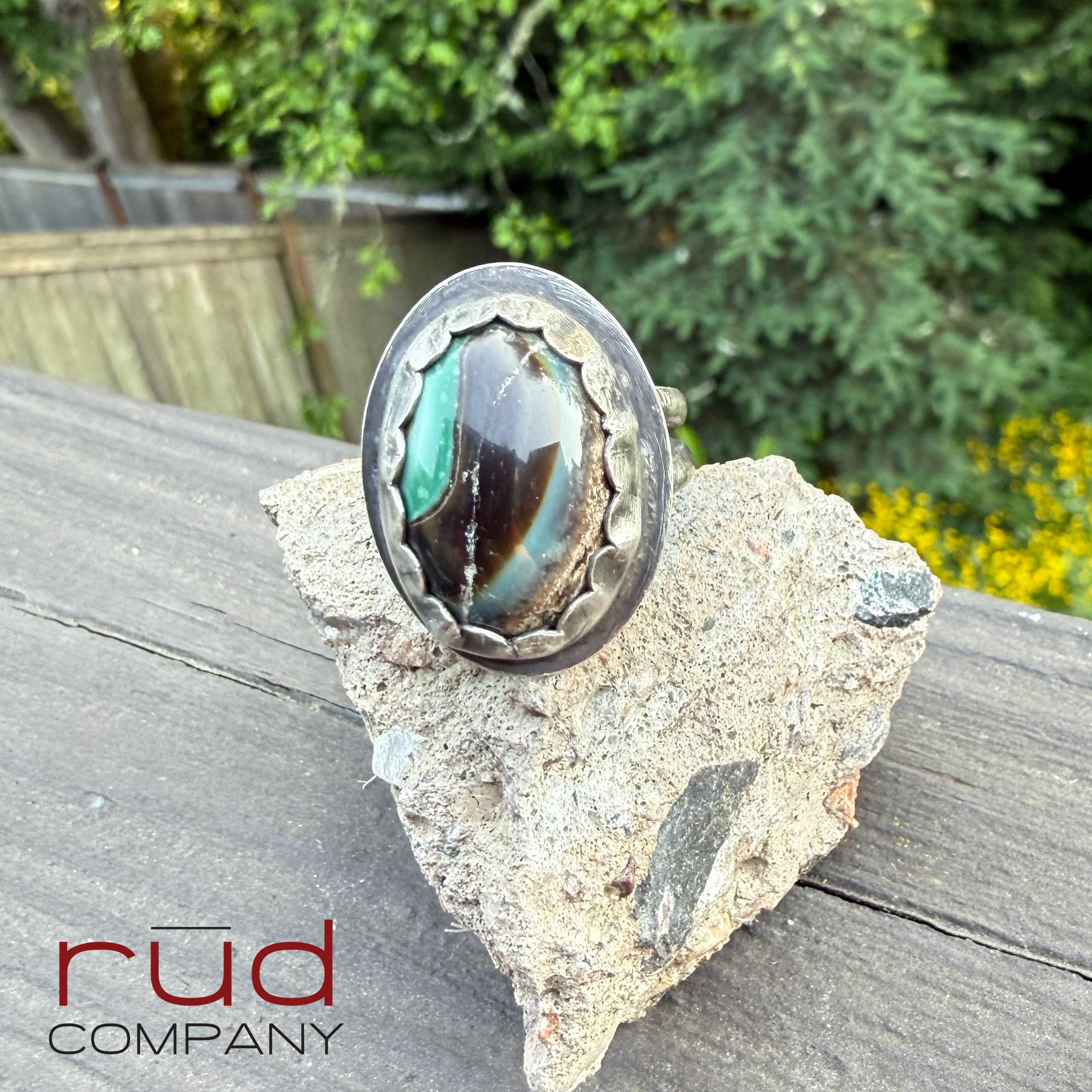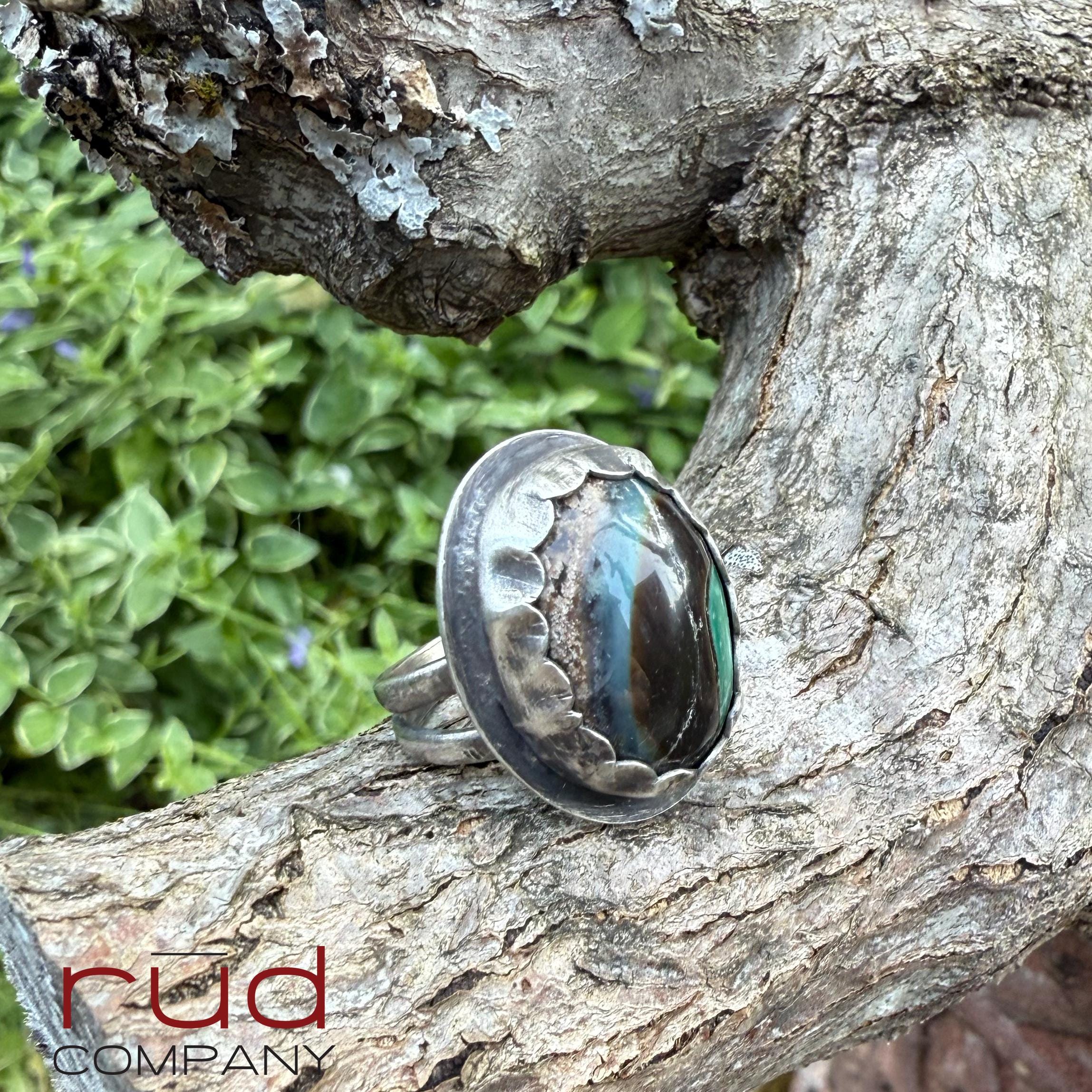 This handcrafted, one of a kind solid sterling silver bezel set statement ring showcases an exquisite, opalized petrified wood domed cabochon. The ring is well made with a split shank band and a high scalloped bezel and surround by a circular sterling outline. You can see the polished back of the stone on the underside. It will be a stunning ring for a human of any gender =) The colors and pattern of this opalized petrified wood are beautiful. The ring is approximately a size 9.