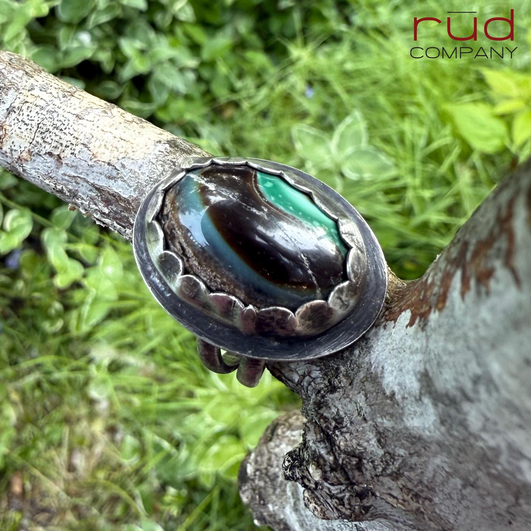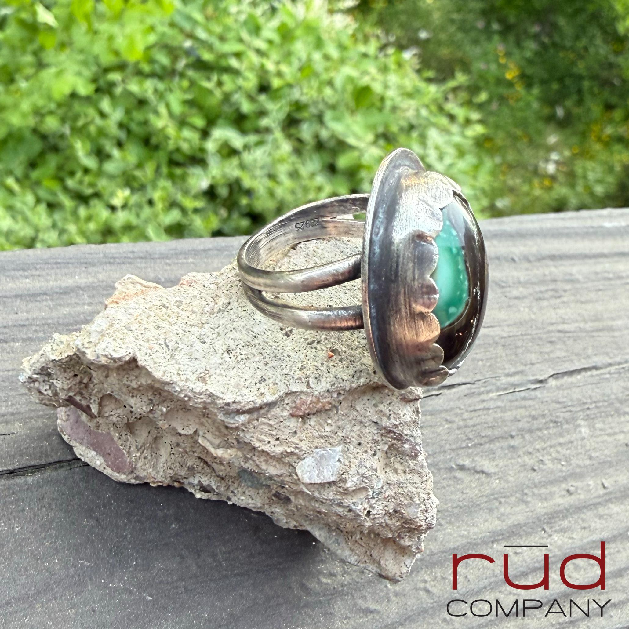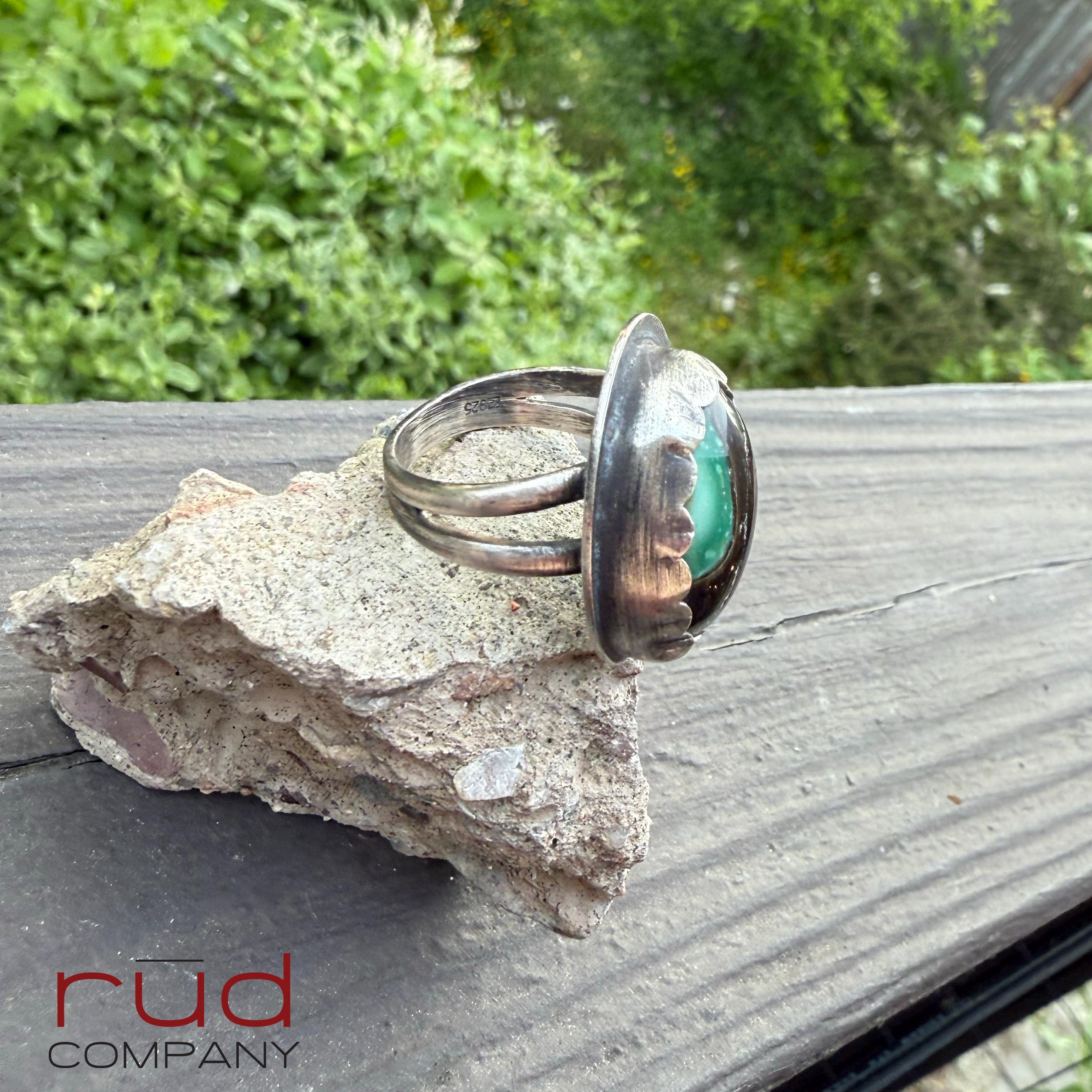 This handcrafted, one of a kind solid sterling silver bezel set statement ring showcases an exquisite, opalized petrified wood domed cabochon. The ring is well made with a split shank band and a high scalloped bezel and surround by a circular sterling outline. You can see the polished back of the stone on the underside. It will be a stunning ring for a human of any gender =) The colors and pattern of this opalized petrified wood are beautiful. The ring is approximately a size 9.