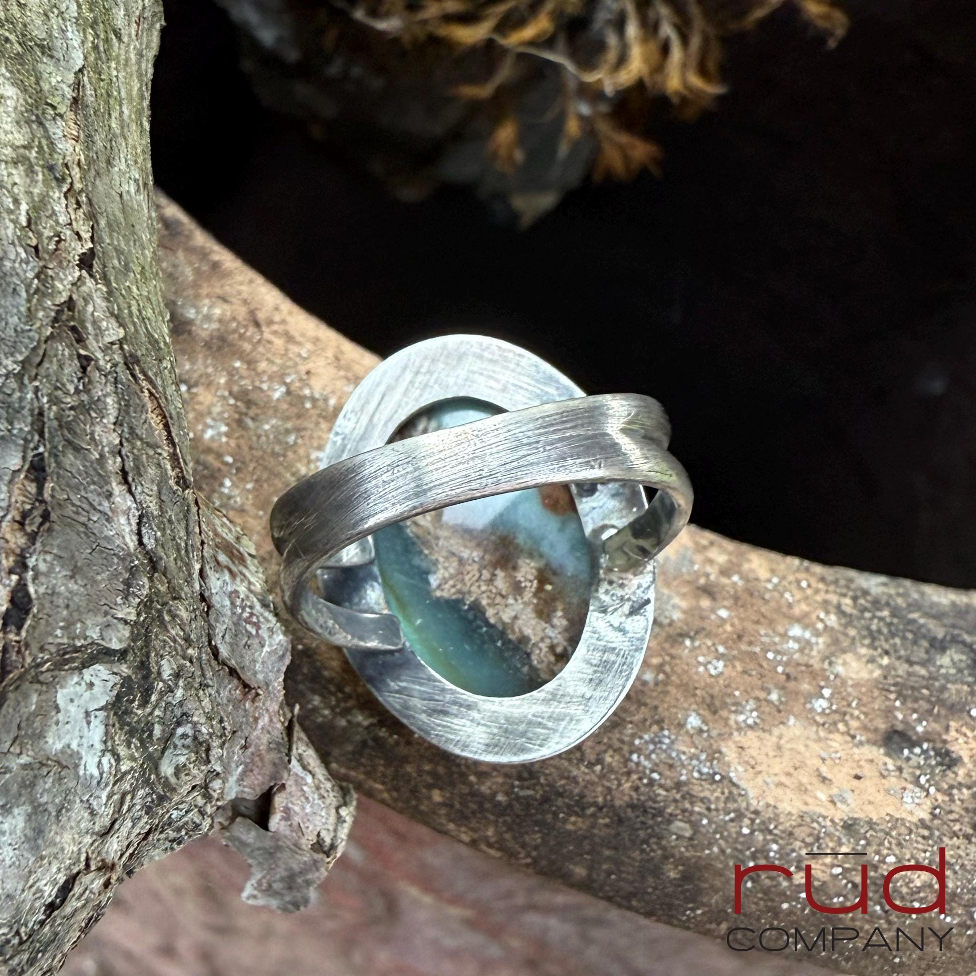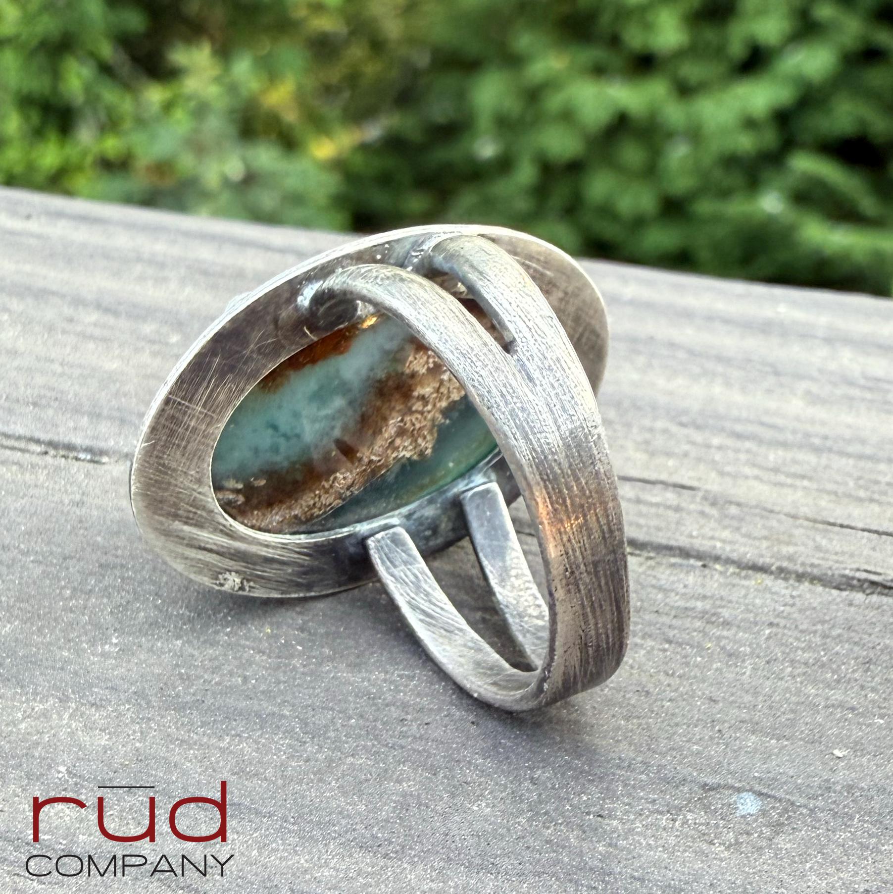 Silvan Relic - Domed Cabochon Ring of Opalized, Petrified Wood set in Sterling Silver Unisex Size 9 shades of turquoise, cream and brown