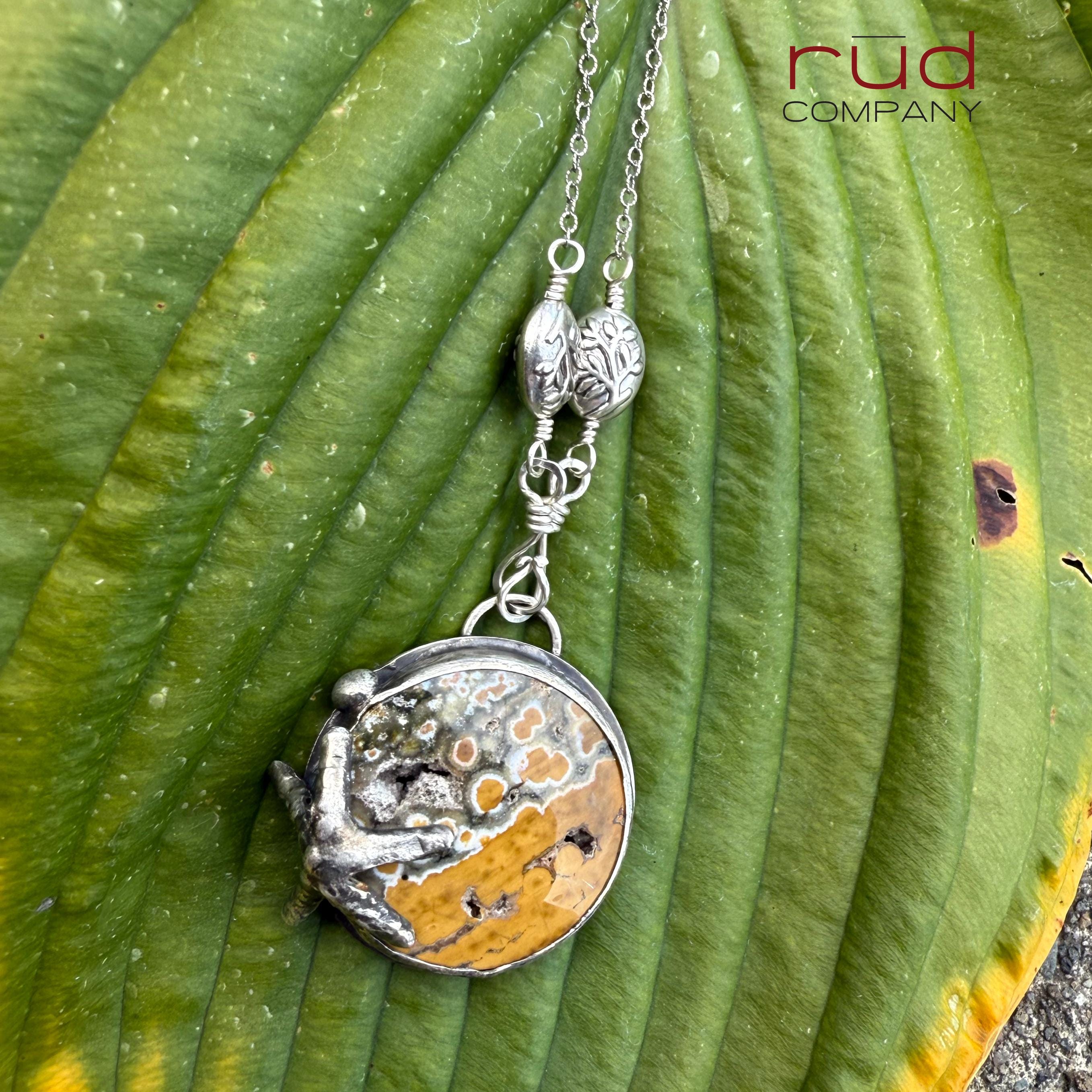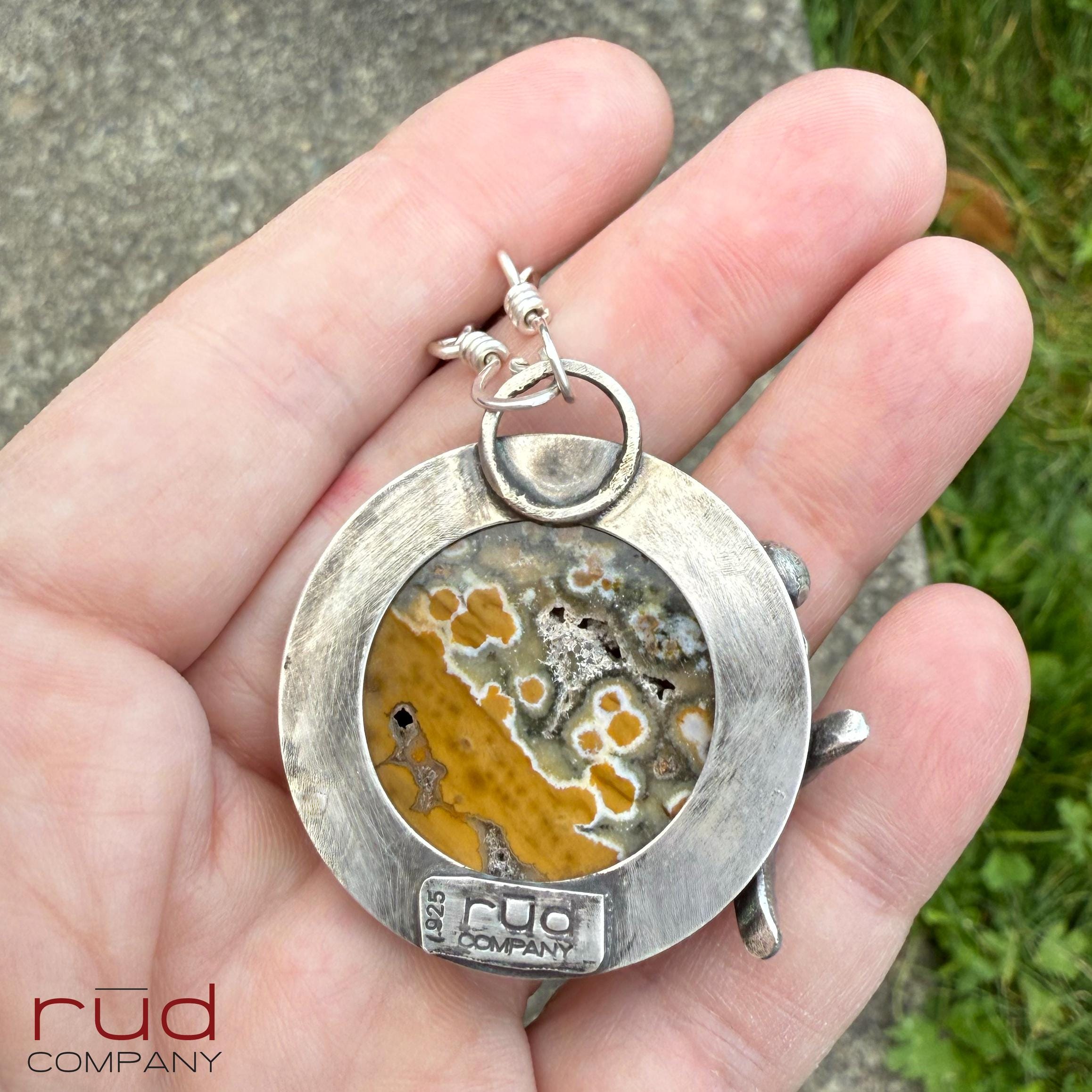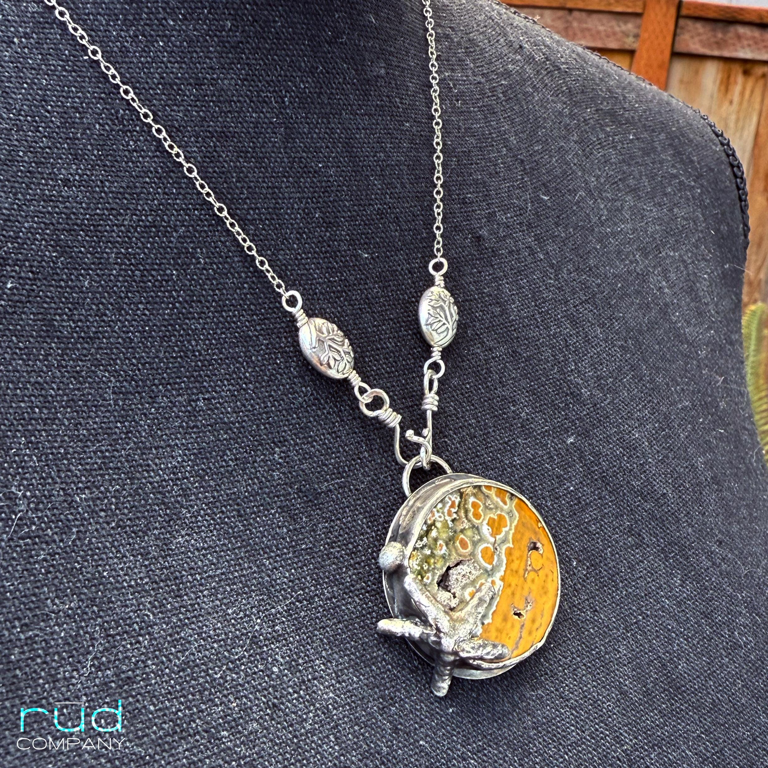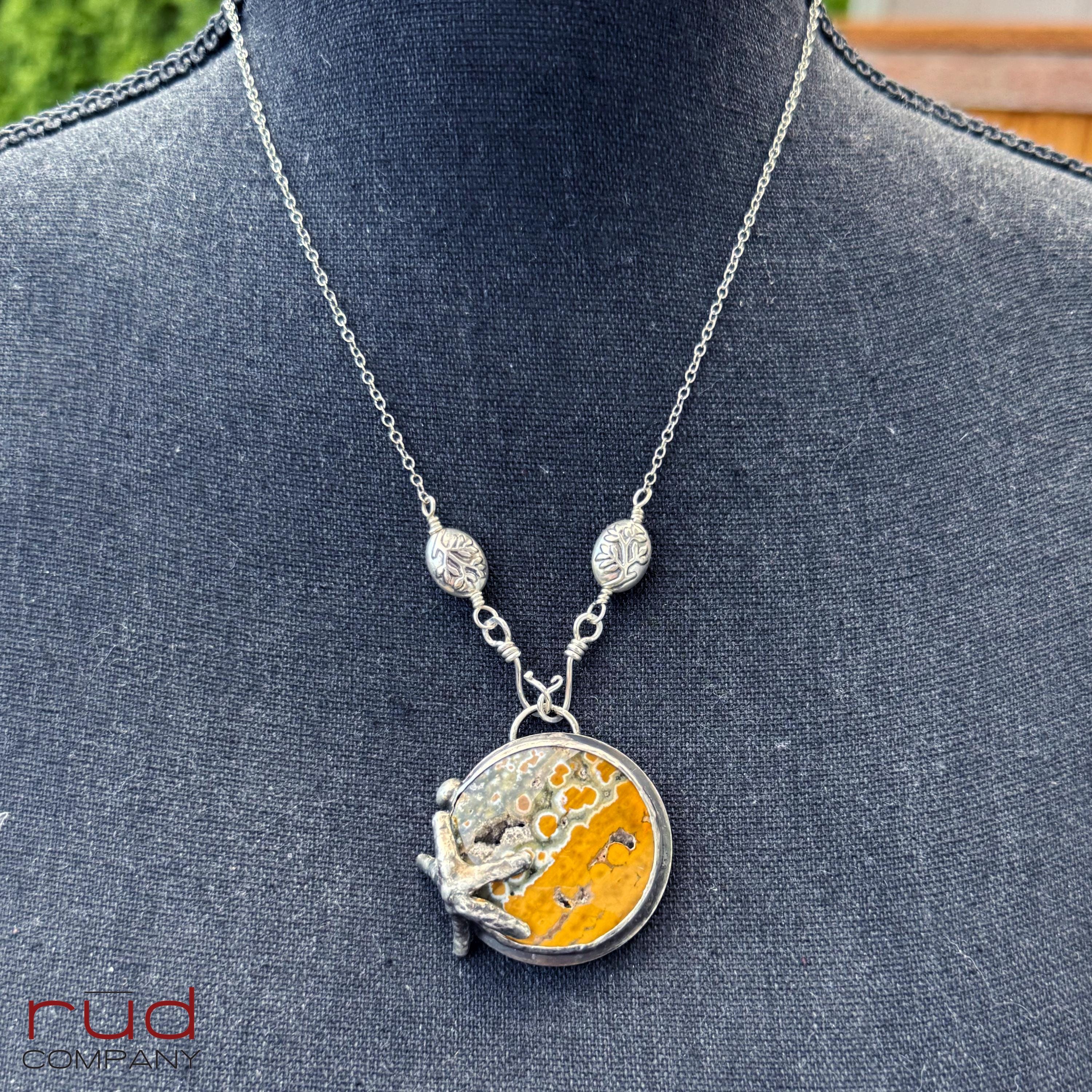 This lovely handcrafted, one of a kind solid sterling silver necklace is set with an exquisite, expertly cut and polished rare Ocean Jasper Circle or Round cabochon. This stone features a sparkly, natural "druzy pocket" - which is a natural cavity with crystals. Both sides are polished, and the deep golden yellow and olive green stone features the orbicular patterns Ocean Jasper is best known for. A stunning piece indeed. I've left the back open so the stone can be appreciated from both sides. I've included a starfish across the stone - hanging on as they do - meant to be.