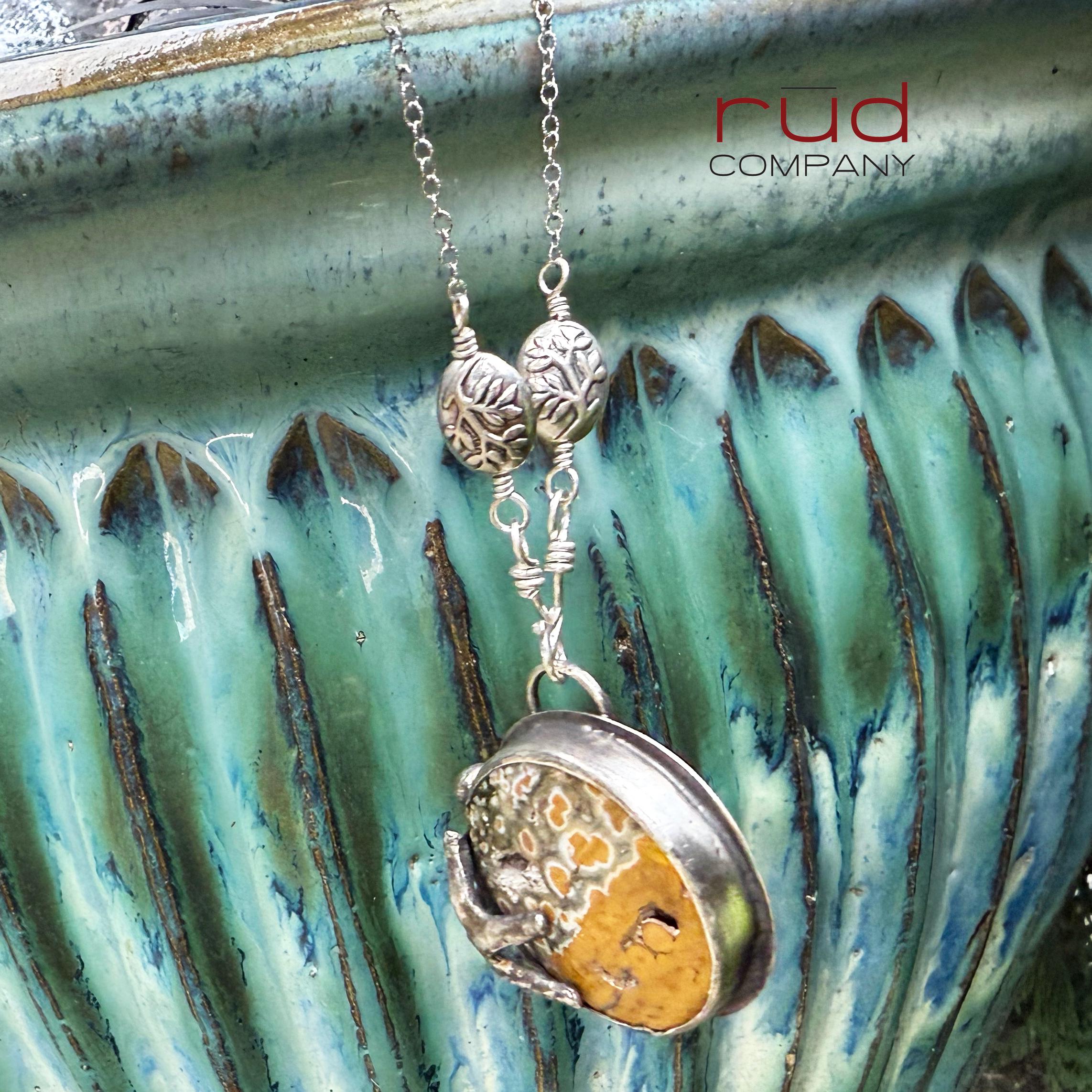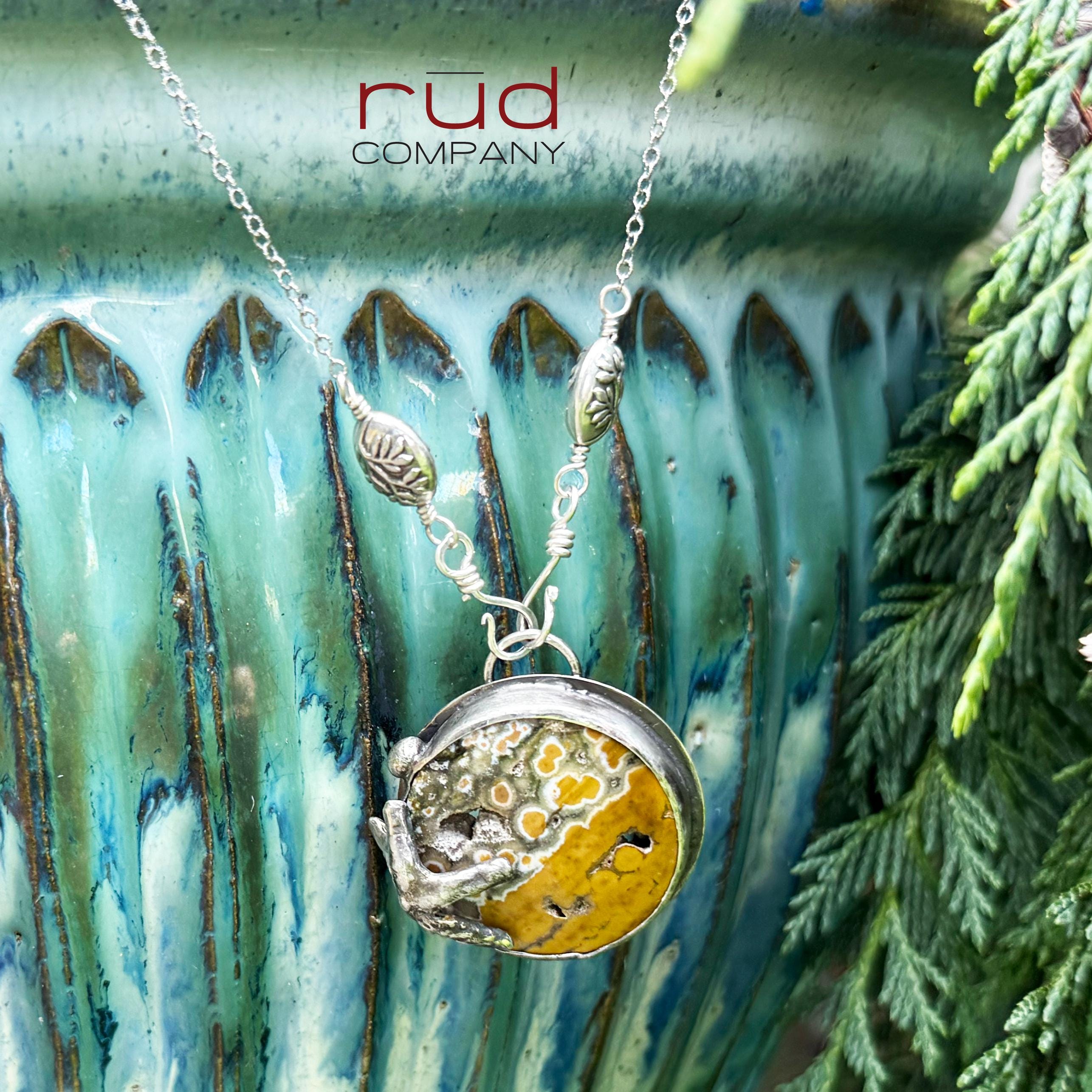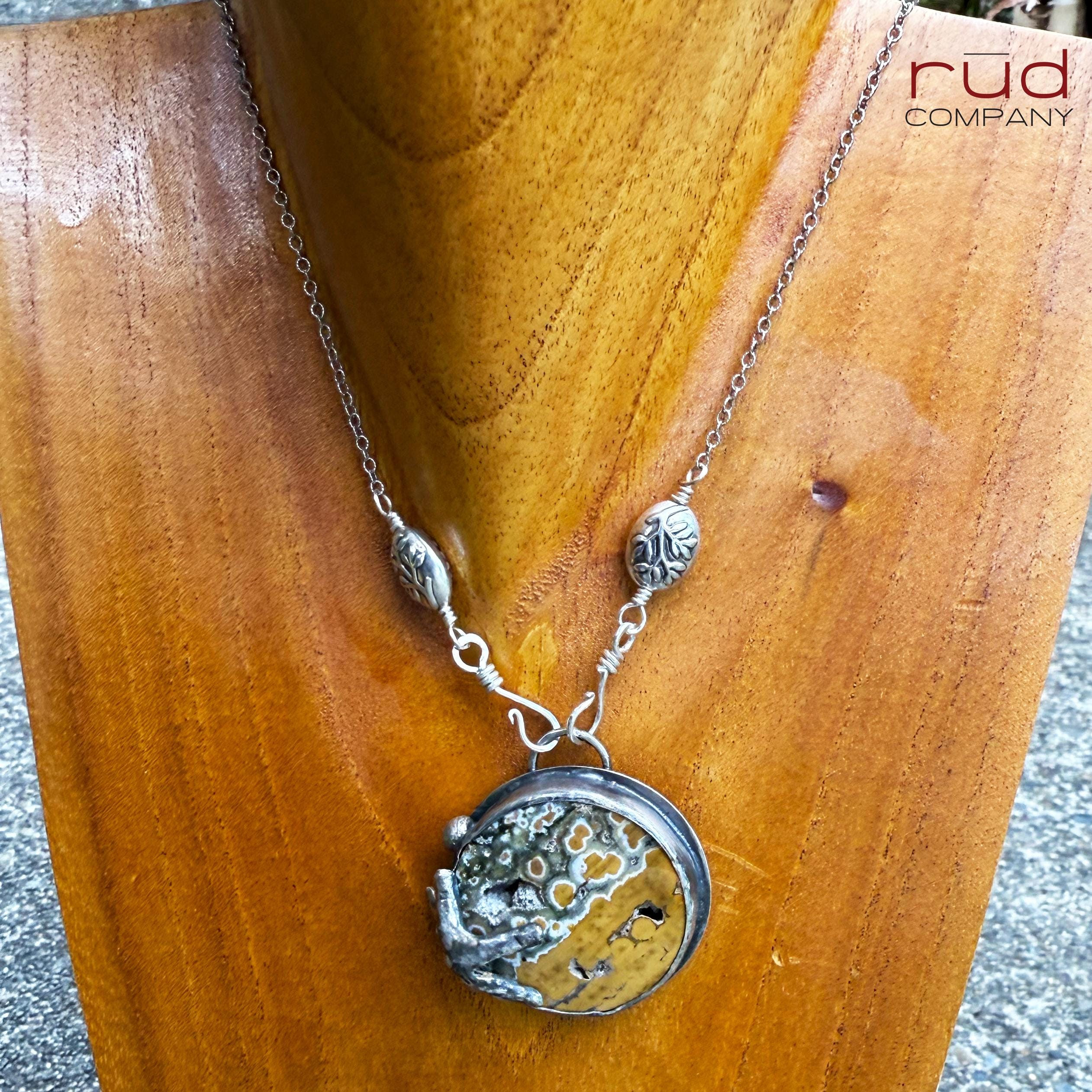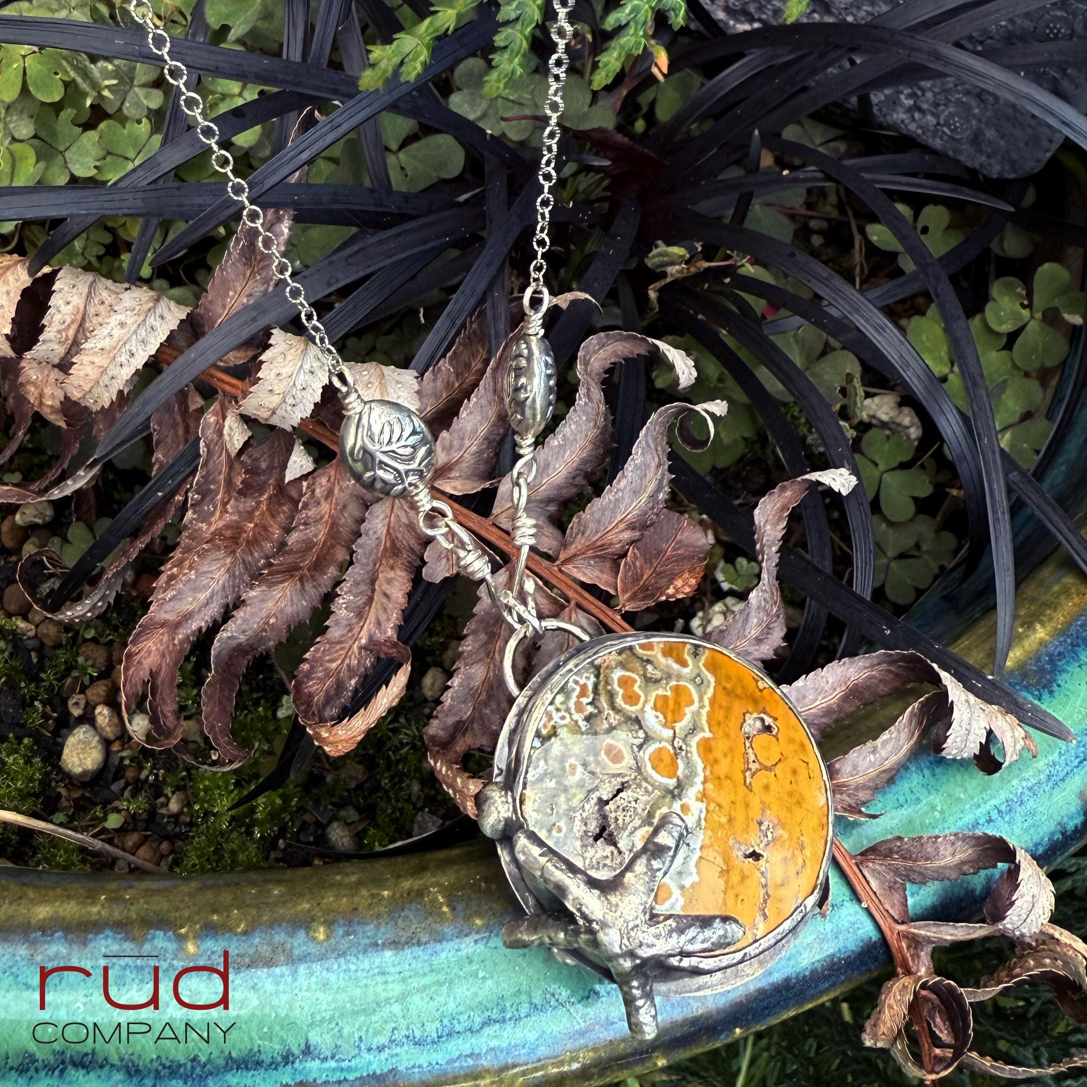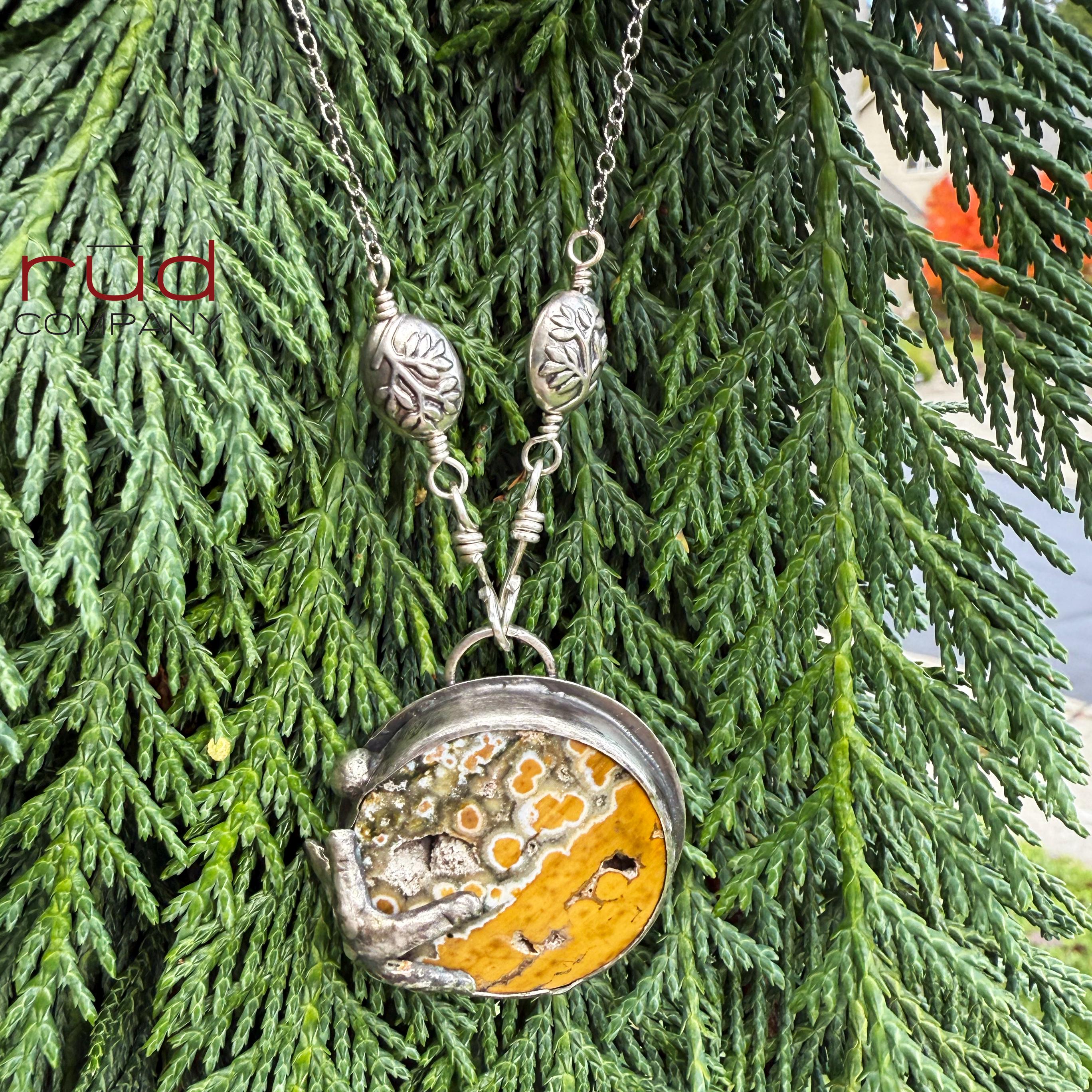 This lovely handcrafted, one of a kind solid sterling silver necklace is set with an exquisite, expertly cut and polished rare Ocean Jasper Circle or Round cabochon. This stone features a sparkly, natural "druzy pocket" - which is a natural cavity with crystals. Both sides are polished, and the deep golden yellow and olive green stone features the orbicular patterns Ocean Jasper is best known for. A stunning piece indeed. I've left the back open so the stone can be appreciated from both sides. I've included a starfish across the stone - hanging on as they do - meant to be.