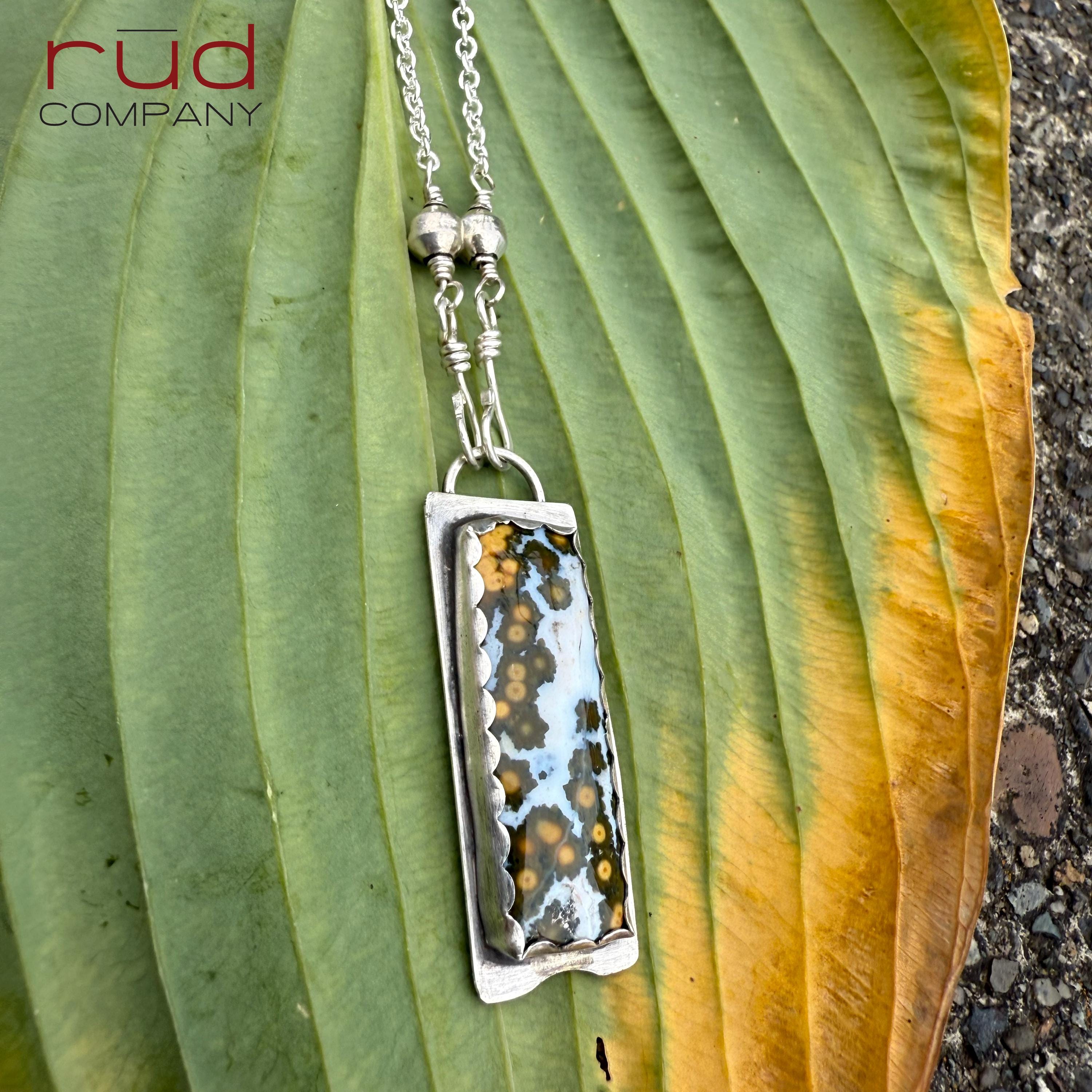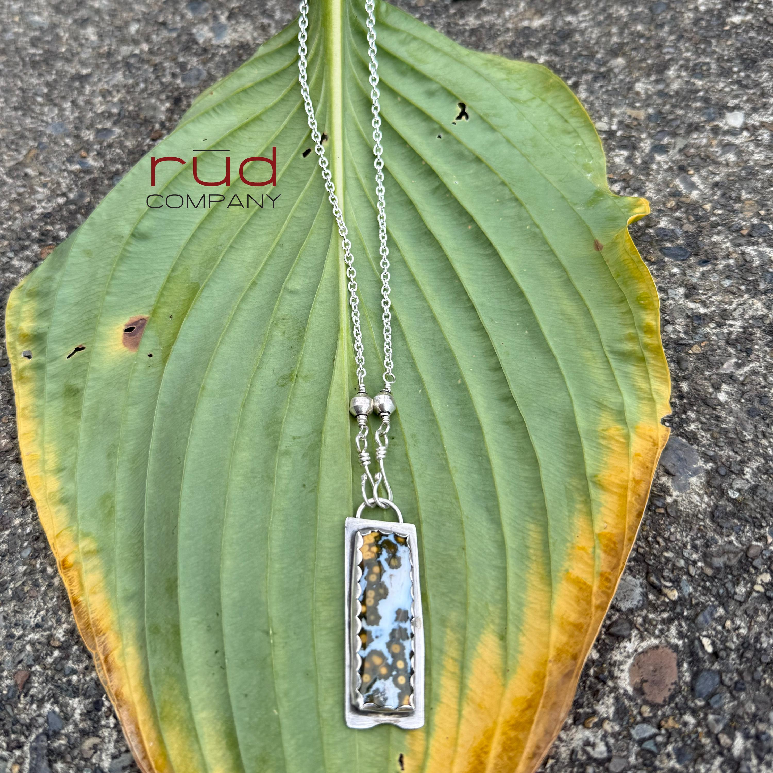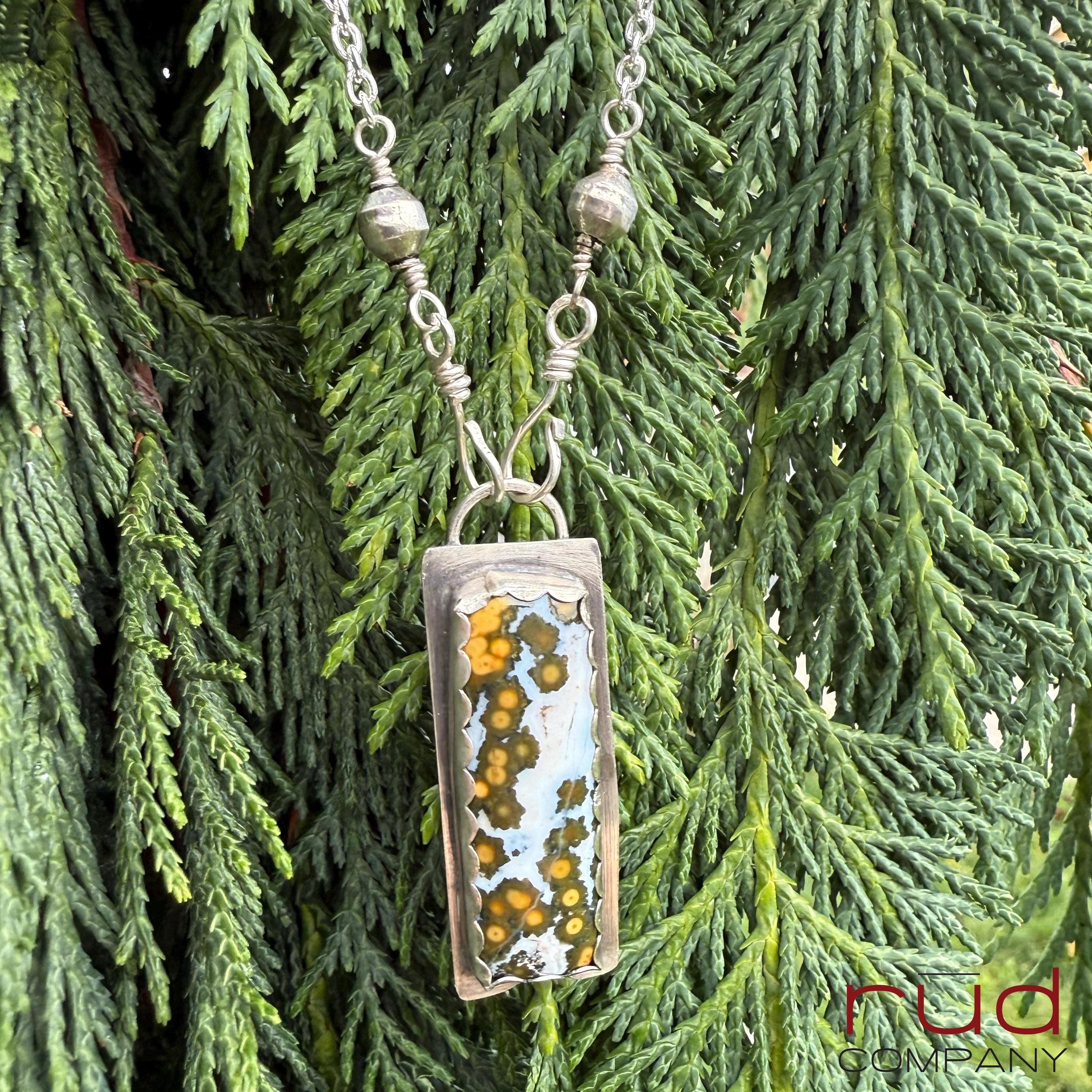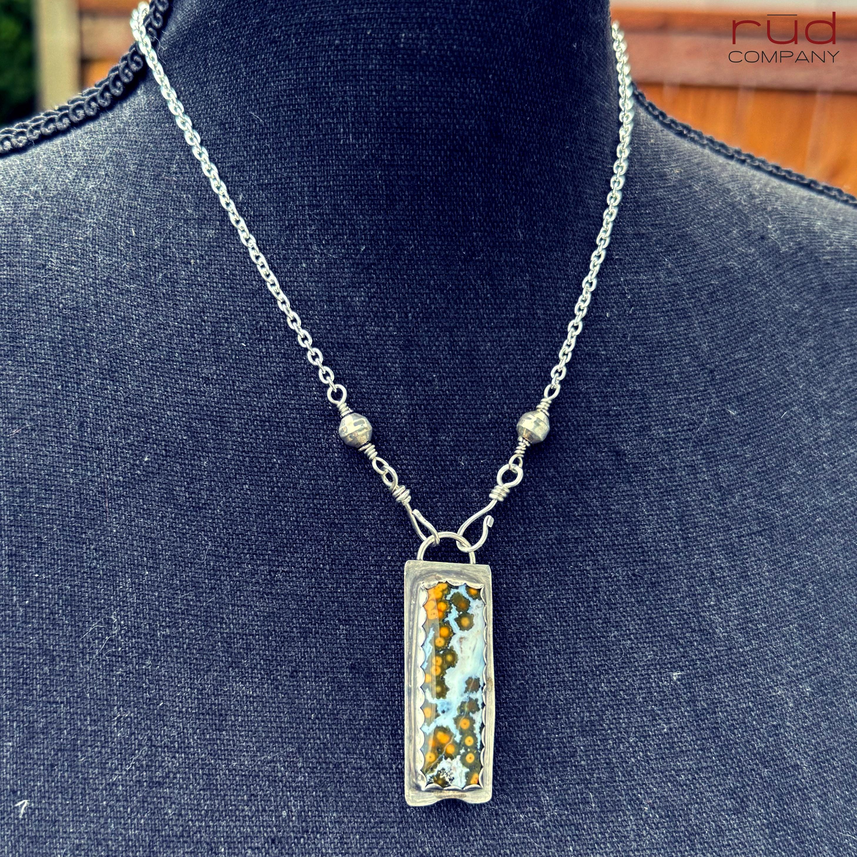 Forest Wayfinder - Rare Ocean Jasper Rectangle Cabochon set in Sterling Silver Necklace, Hand-Forged, Front Hook, Pine Mountain theme