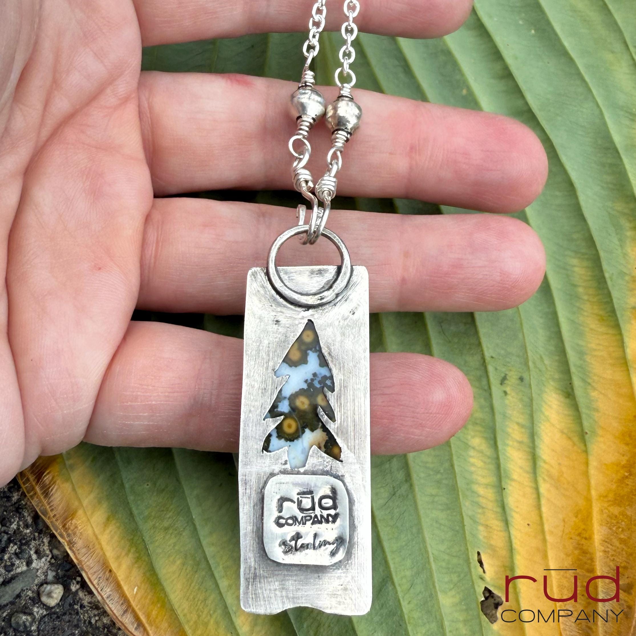 This lovely handcrafted, one of a kind solid sterling silver necklace is set with an exquisite, expertly cut and polished orbicular Ocean Jasper rectangle cabochon. Simple and stunning. Both sides are polished, and the greens, yellows, and bluish-whites are beautiful. Accented by a cutout pine tree on the reverse side, revealing more of the unusual patterns of the stone.