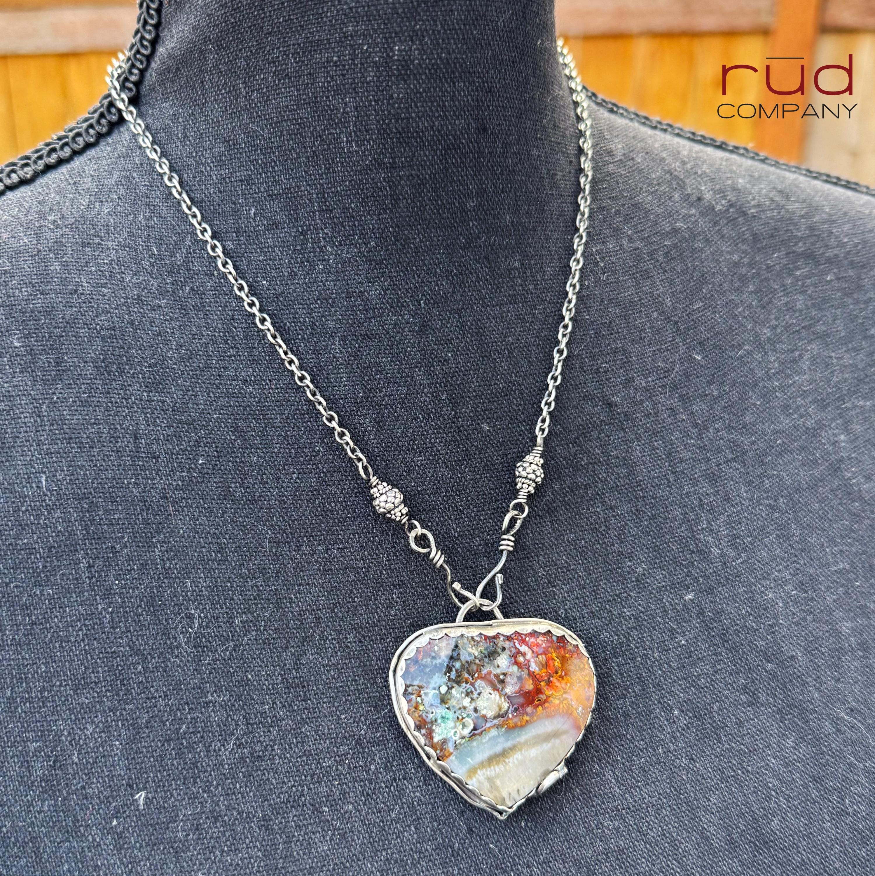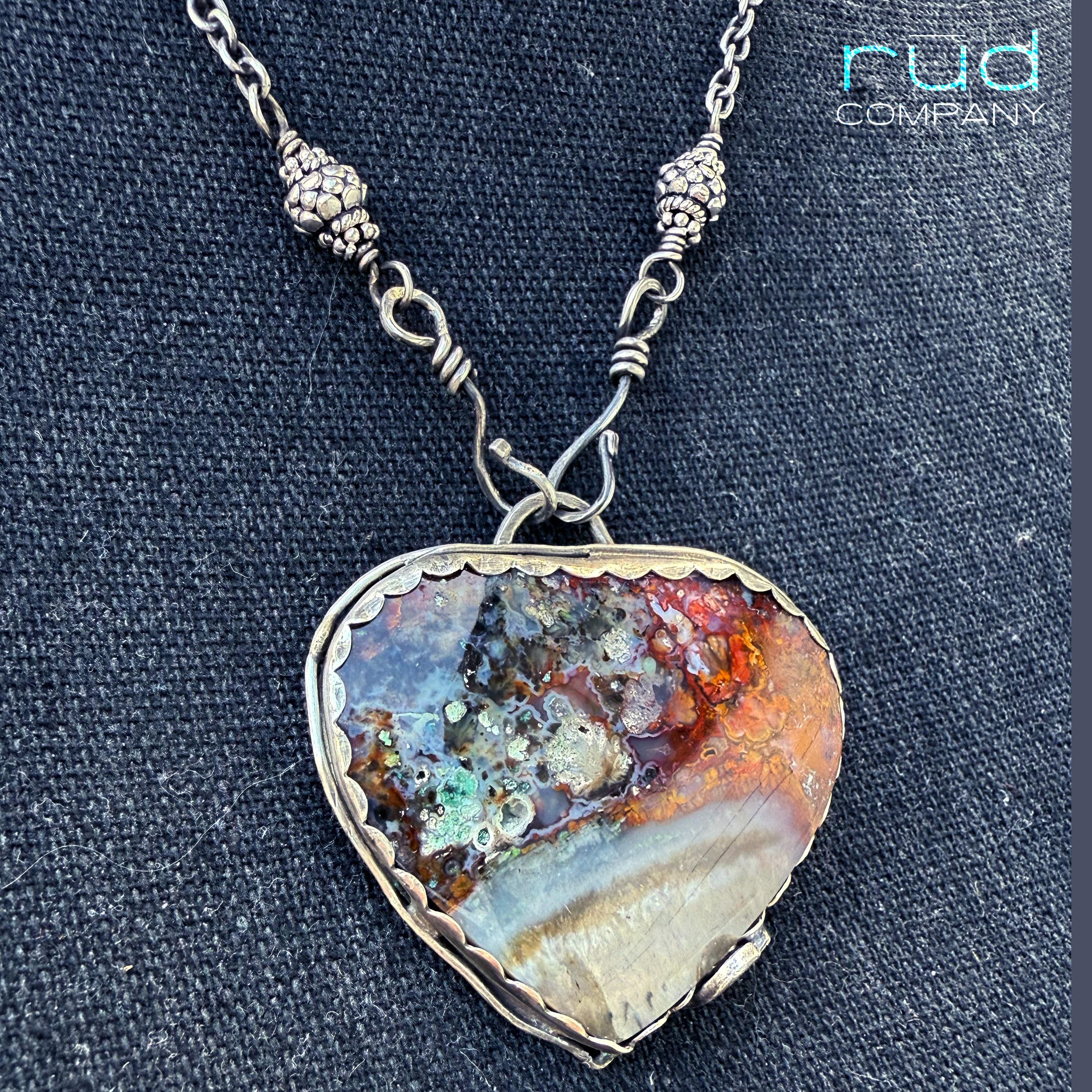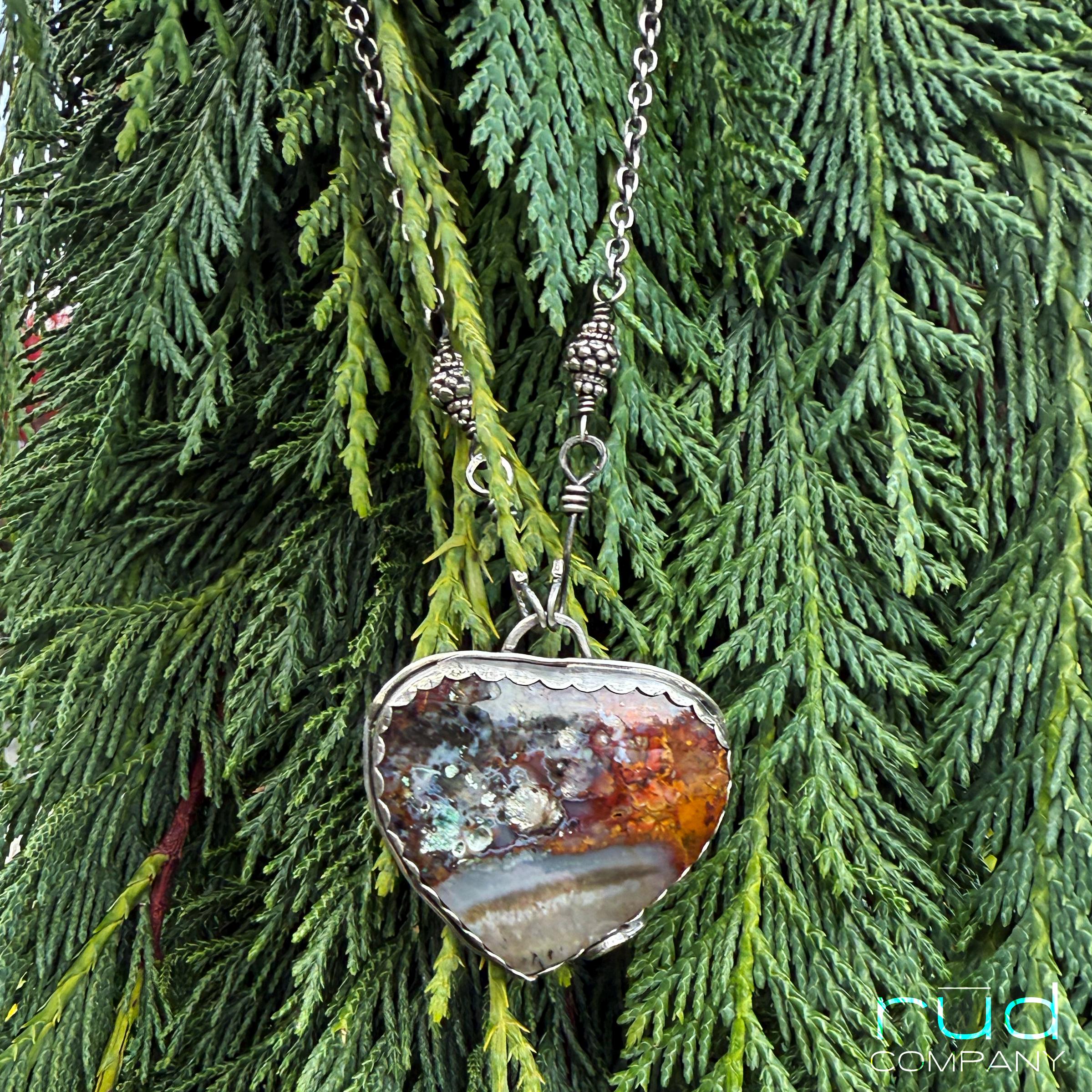 Alchemist’s Heart - Colorful Opalized Petrified Wood pendant set in Sterling Silver with fire and water elements on reverse - Front Hook