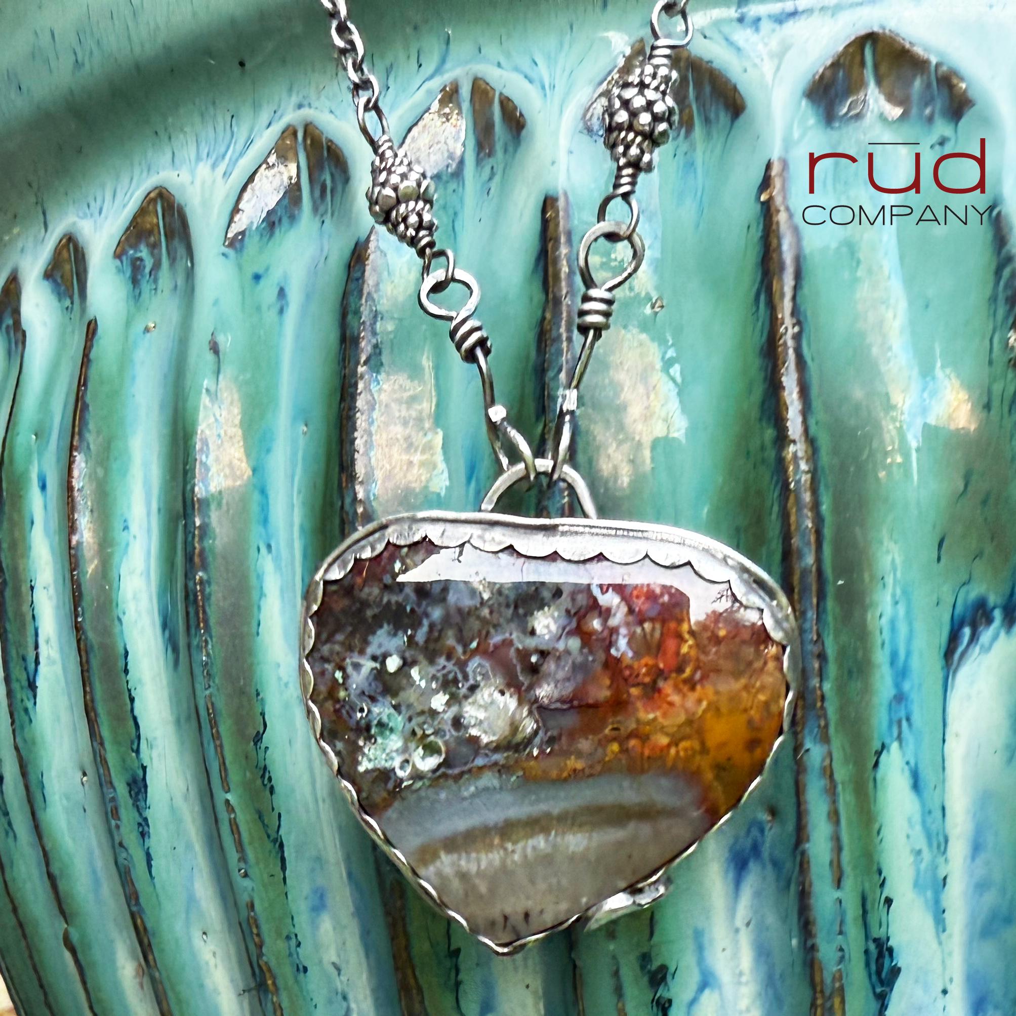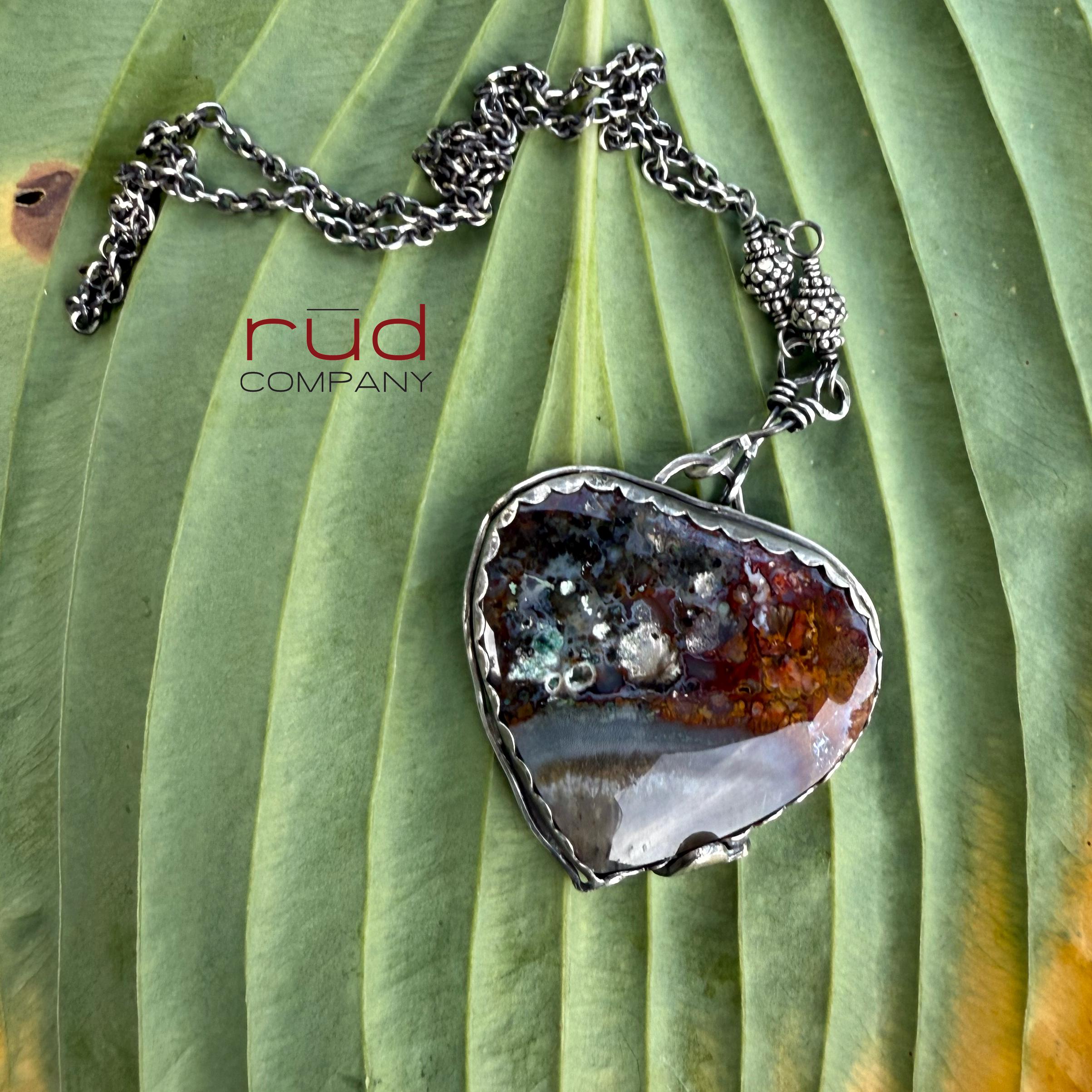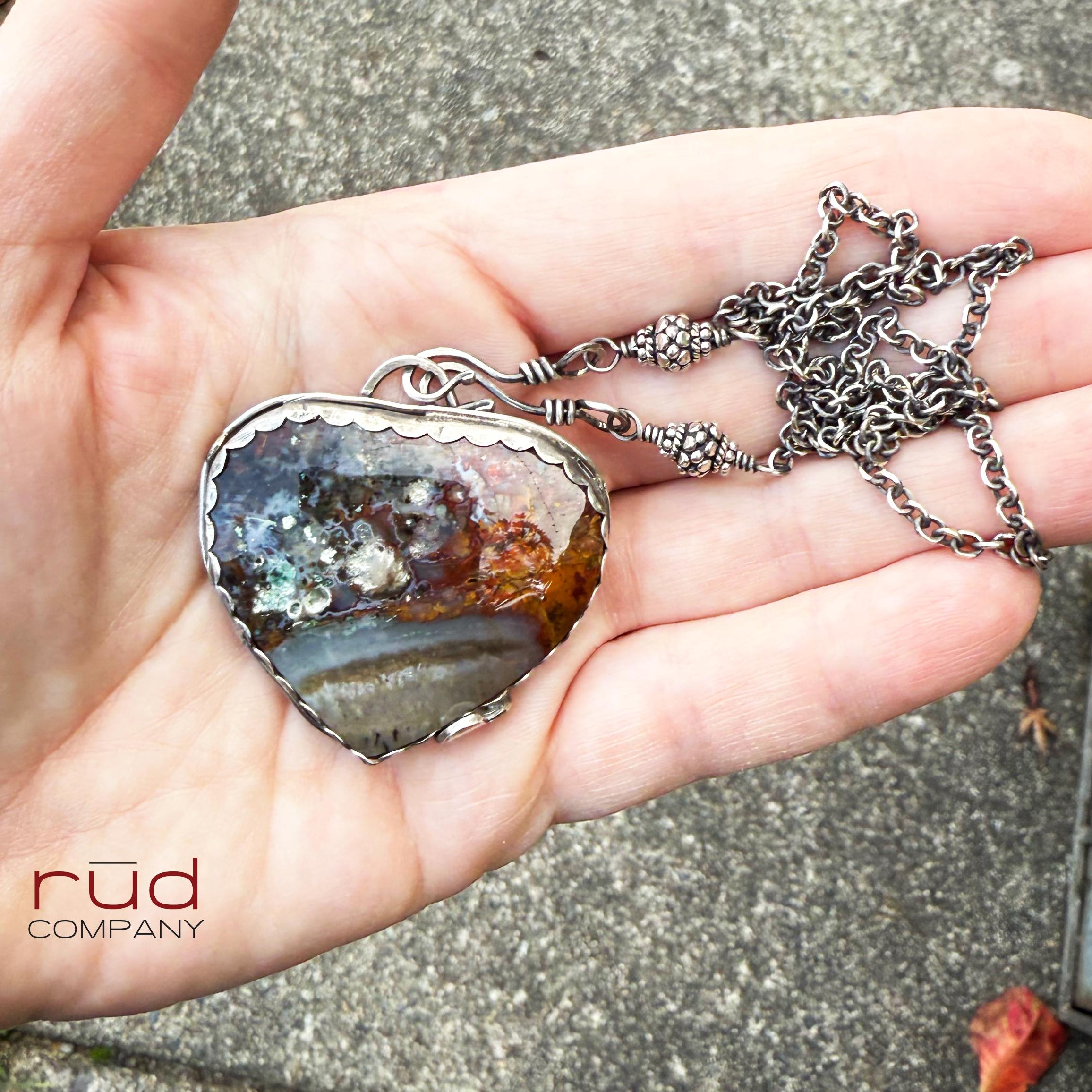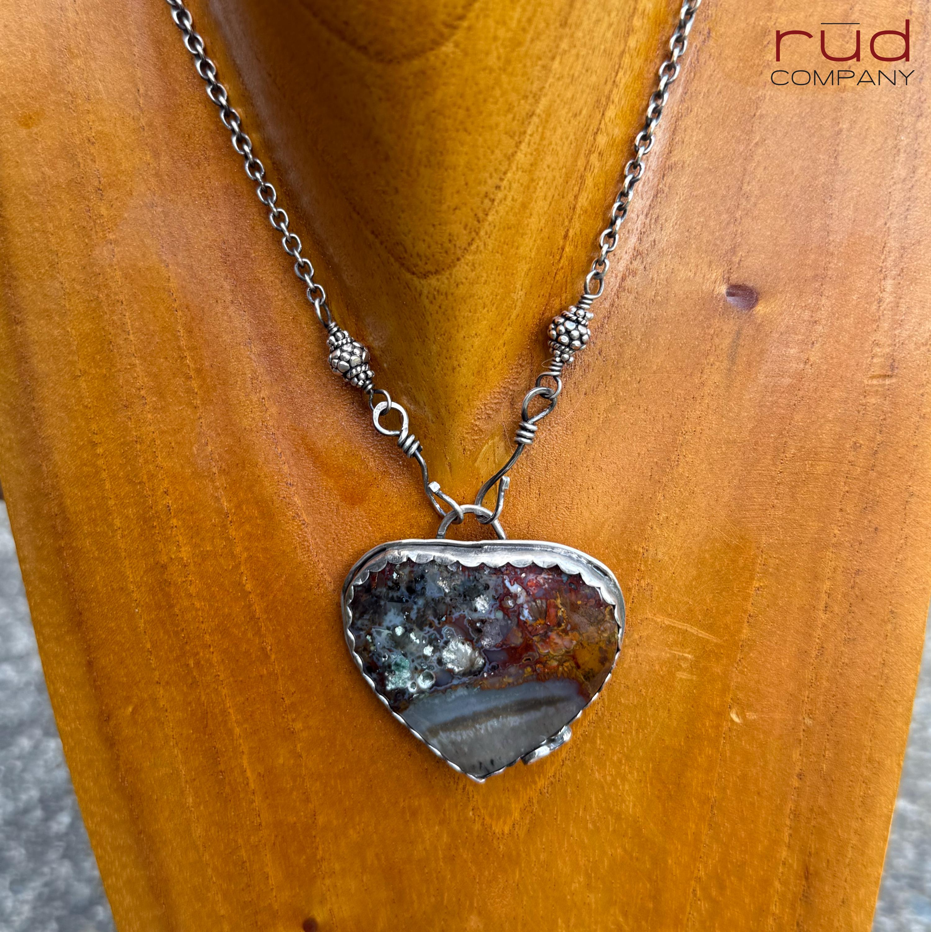 Alchemist’s Heart - Colorful Opalized Petrified Wood pendant set in Sterling Silver with fire and water elements on reverse - Front Hook