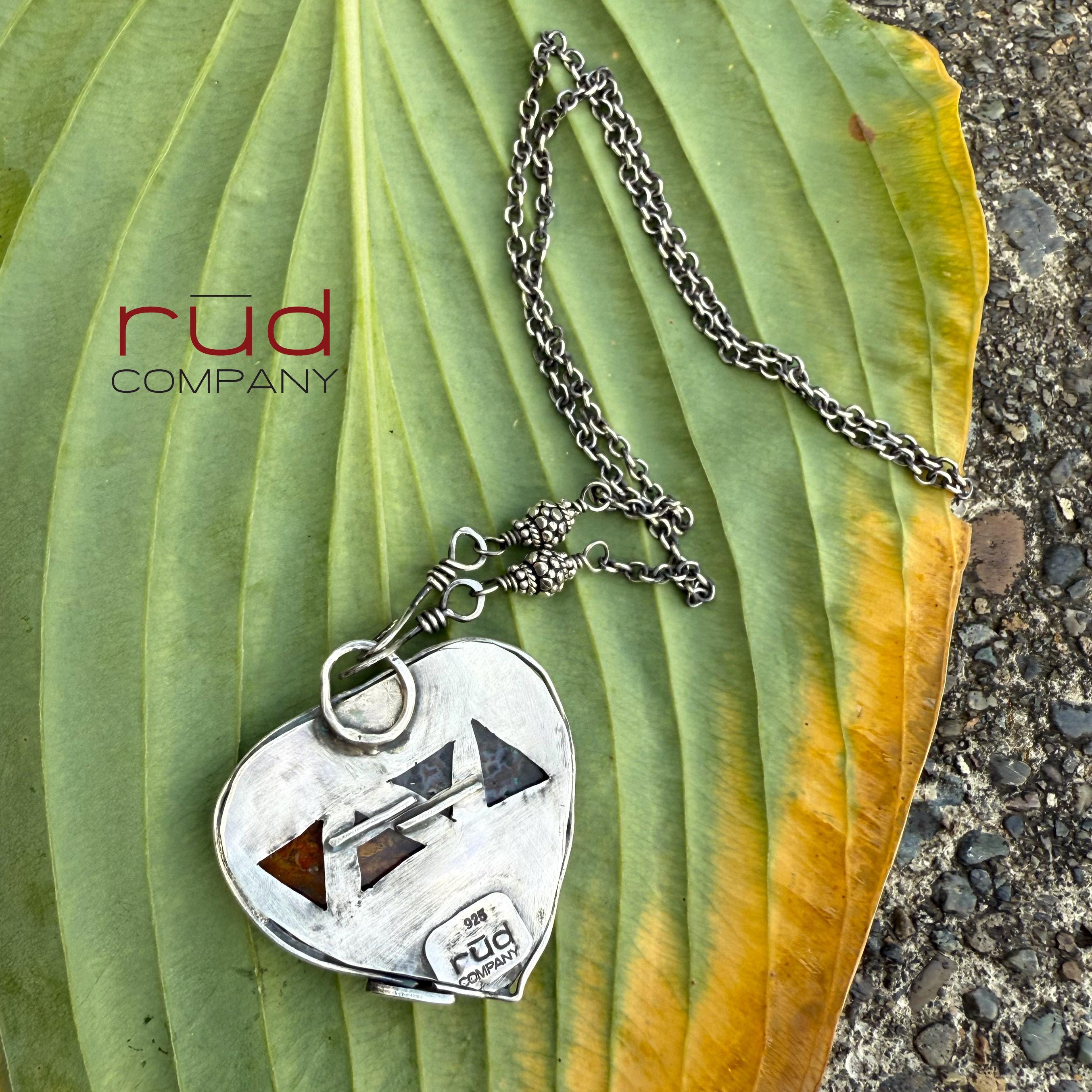 This lovely handcrafted, one of a kind solid sterling silver necklace is set with an exquisite, expertly cut and polished Opalized Petrified Wood HEART cabochon. I could stare at this incredibly rare pattern of fiery oranges and rust, deep charcoal and blue, turquoise and marbled teals forever. I've blackened the sterling around the stone to create a beautiful frame. On the reverse, I've cutout the elemental signs for Fire, Water, Earth and Wind in a rustic style. On the lower front, a whimsical single heart wraps around the side. An incredible bespoke work of art.