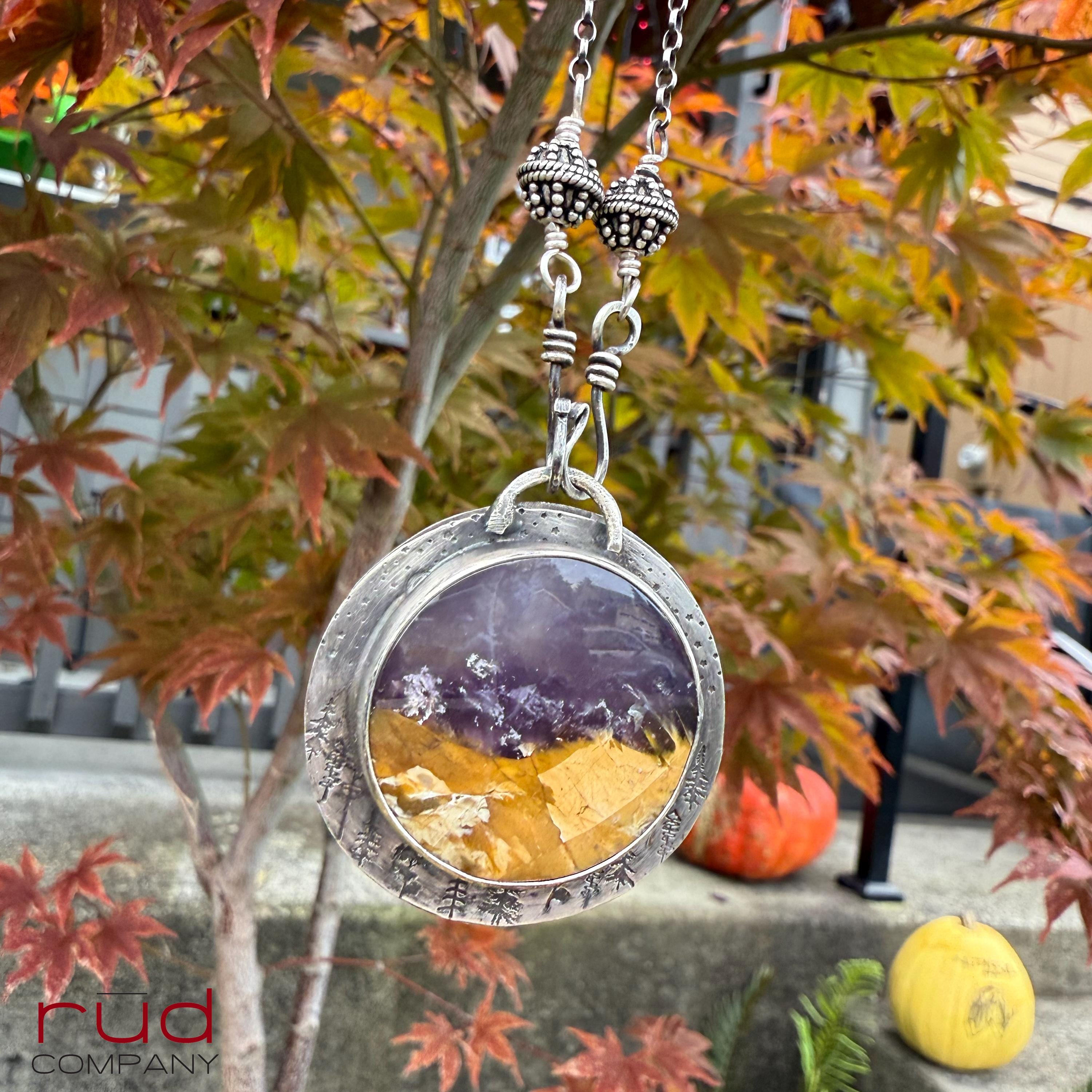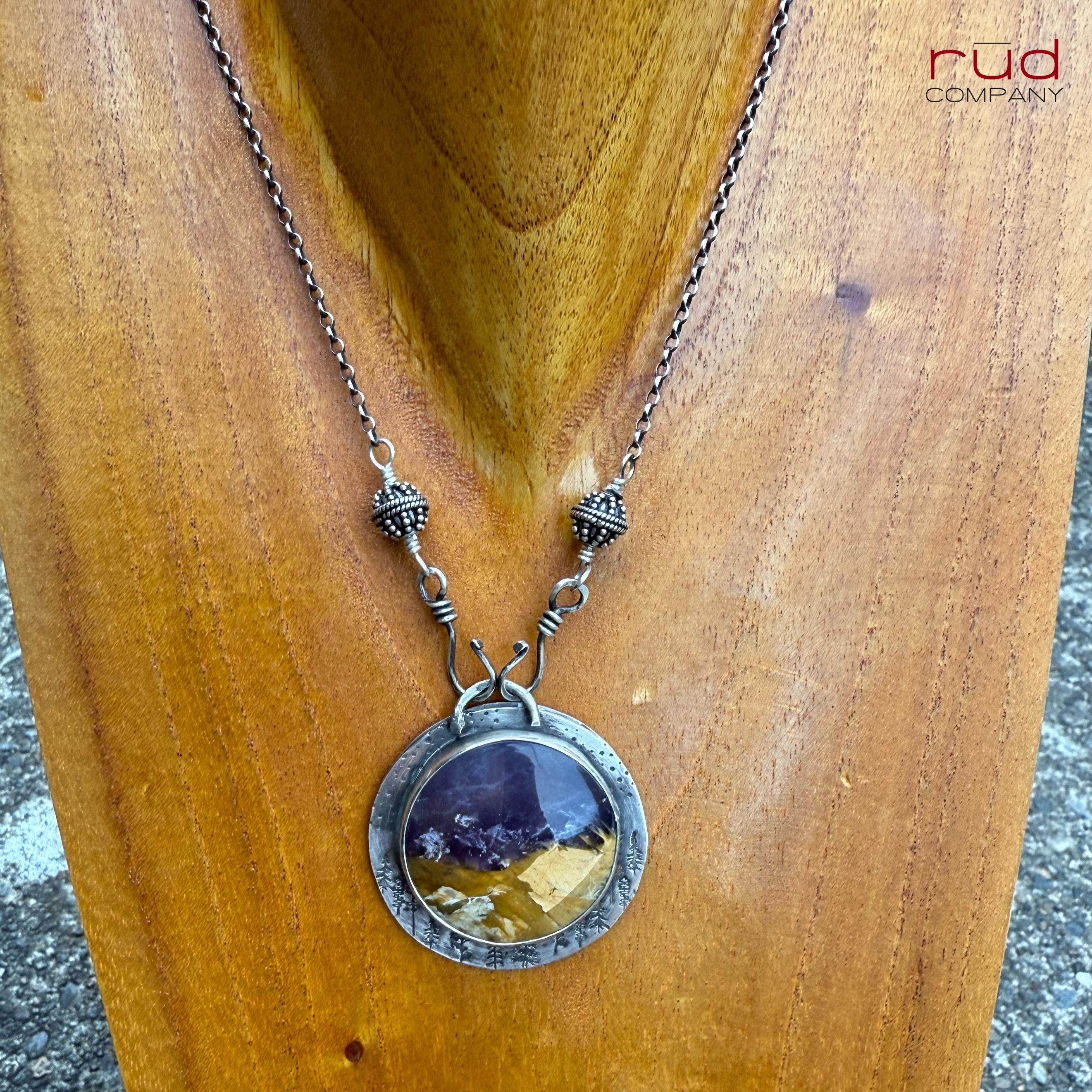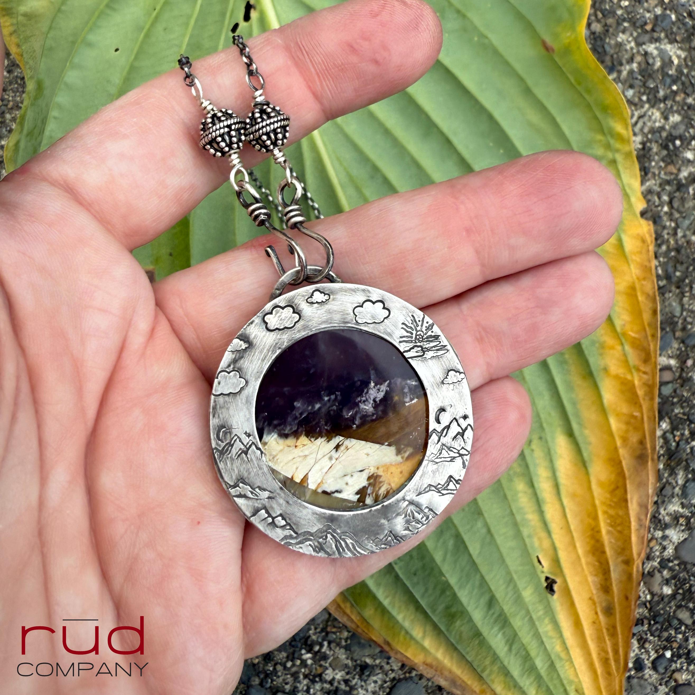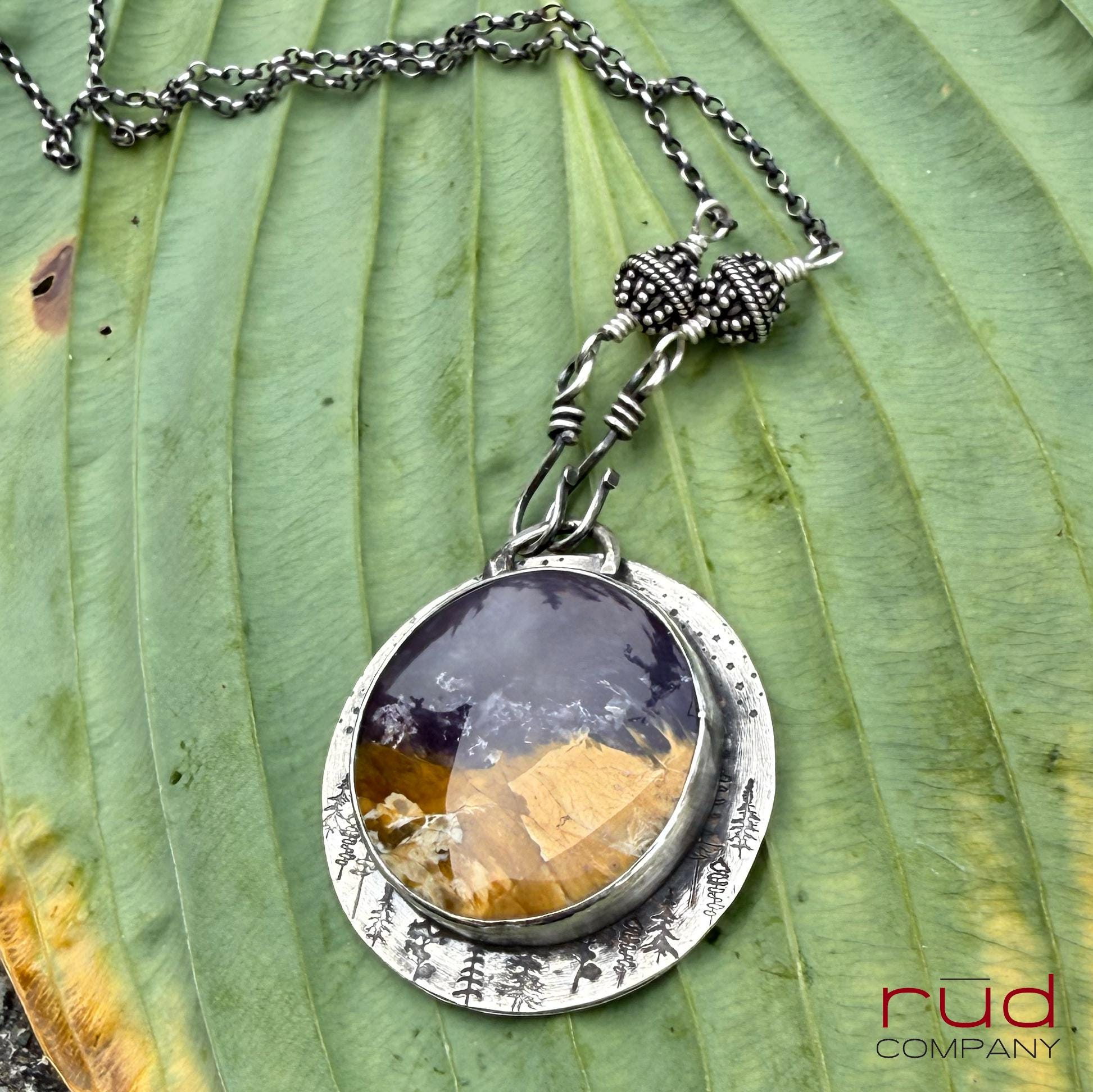 Twilight Vista - Stunning Purple Common Opal pendant necklace set in Sterling Silver hand-stamped starry night forest mountains landscape