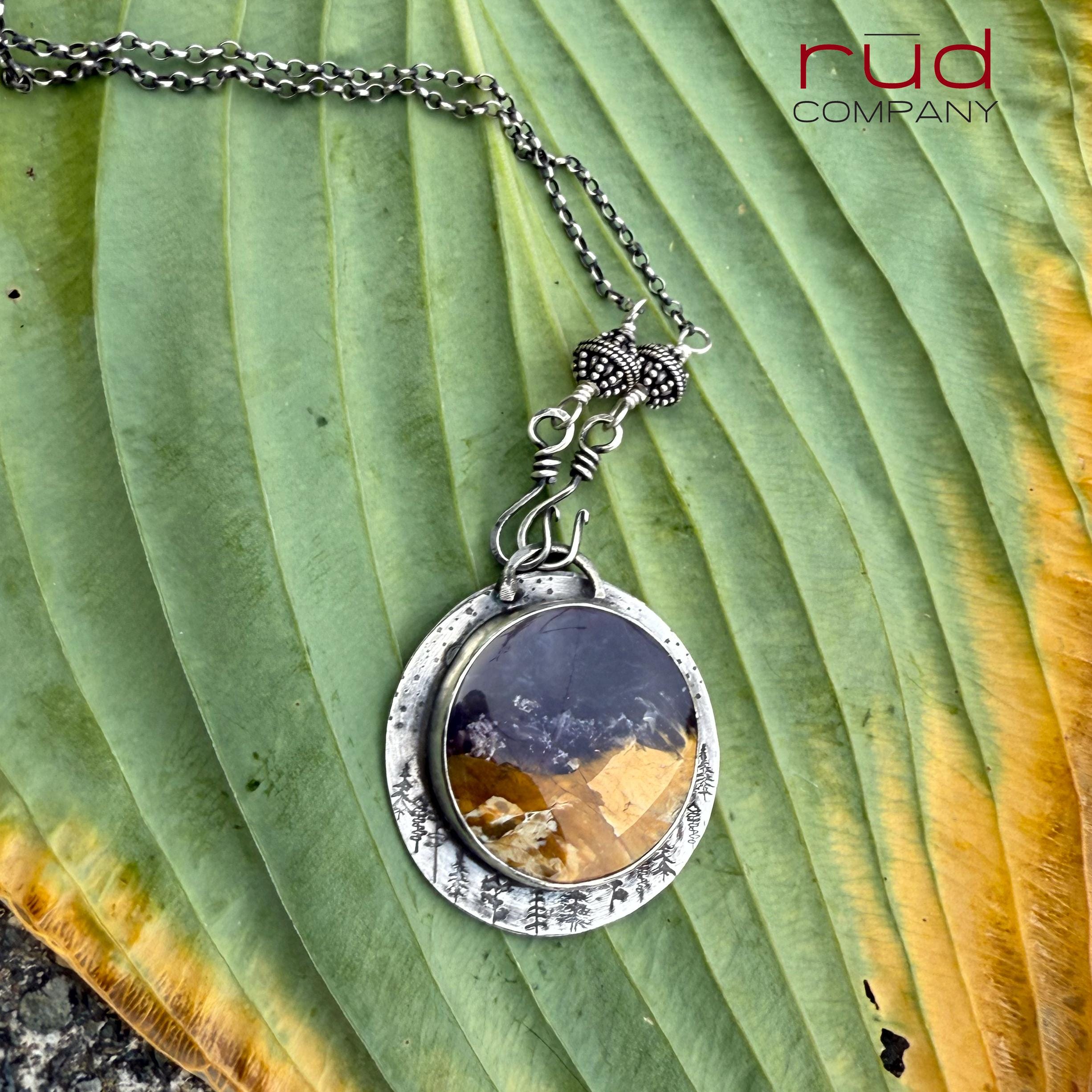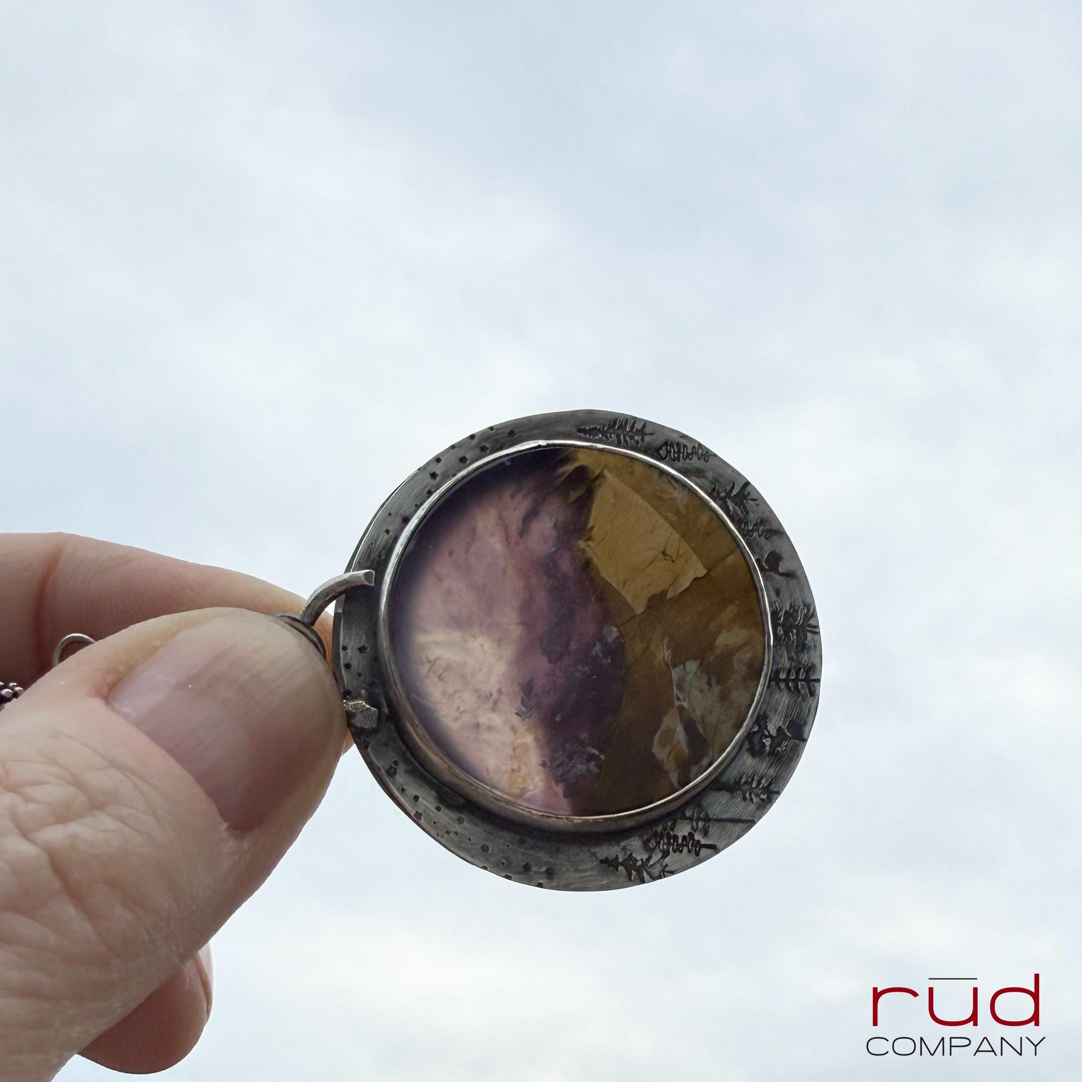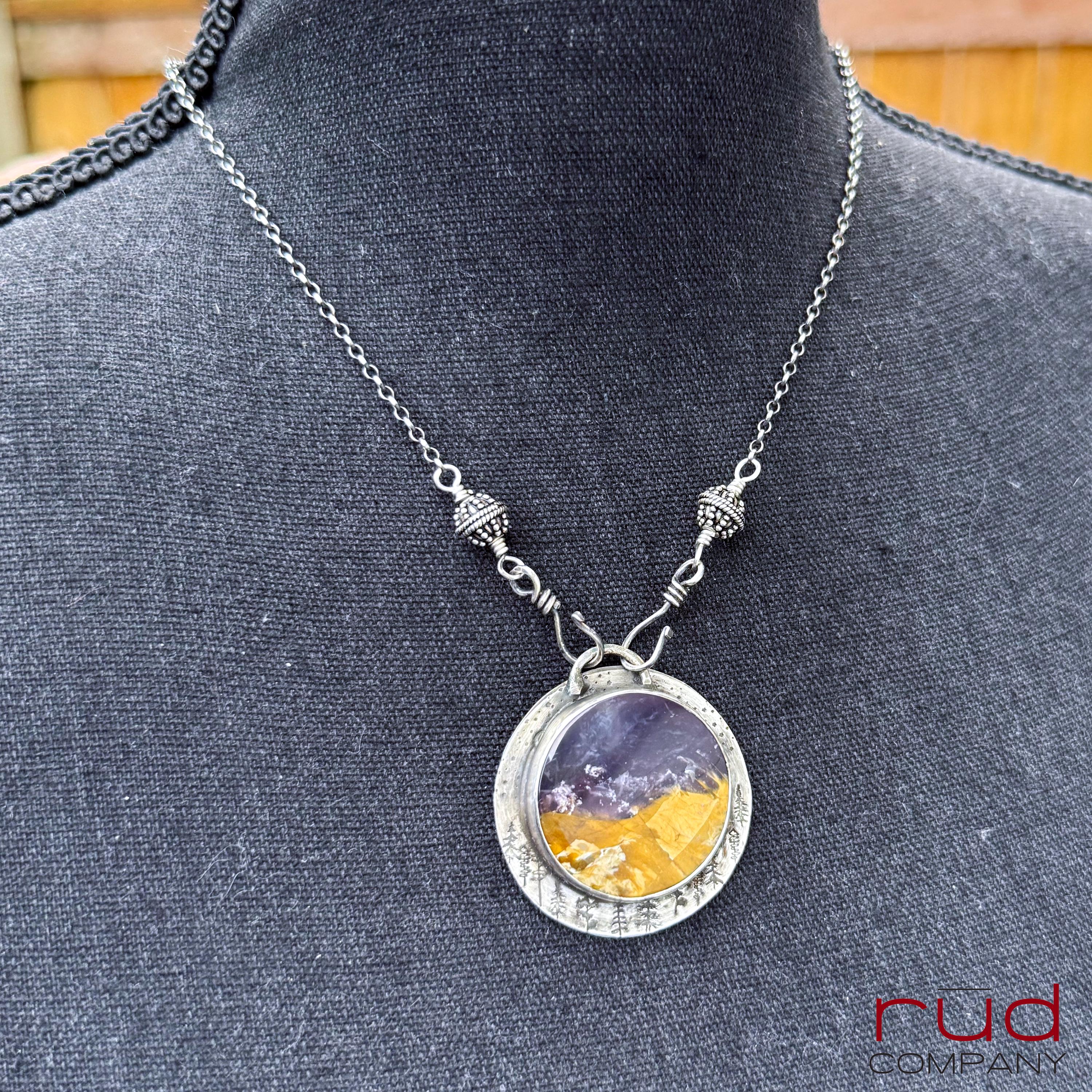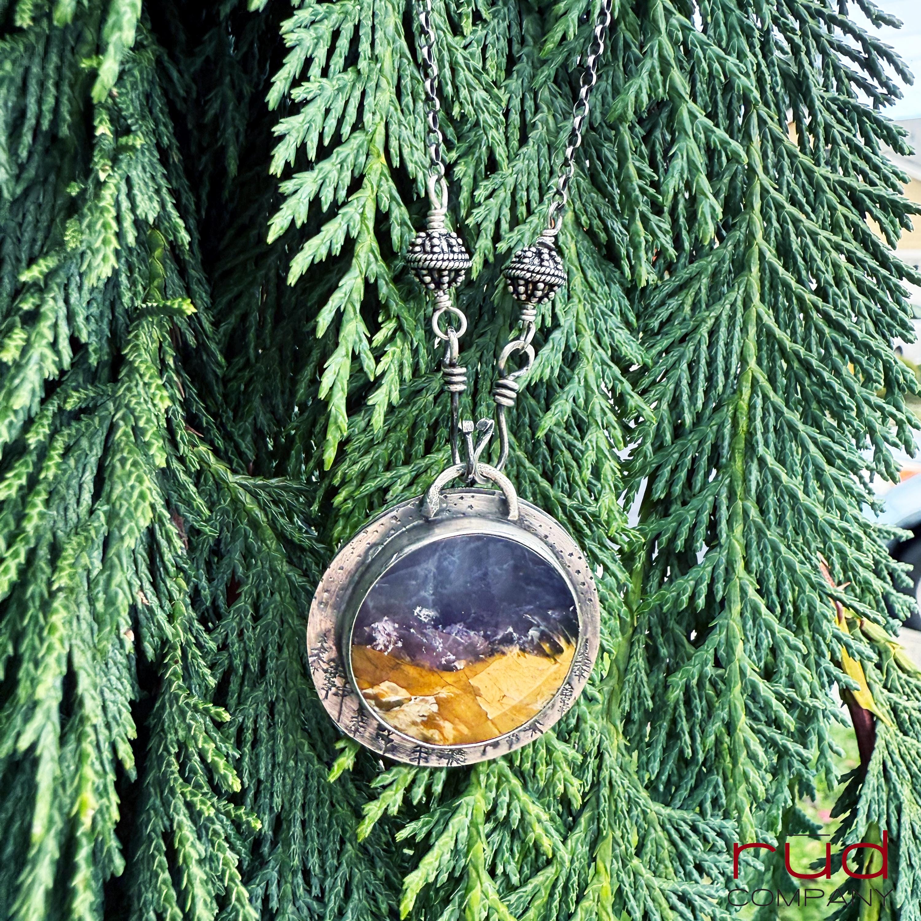 Twilight Vista - Stunning Purple Common Opal pendant necklace set in Sterling Silver hand-stamped starry night forest mountains landscape