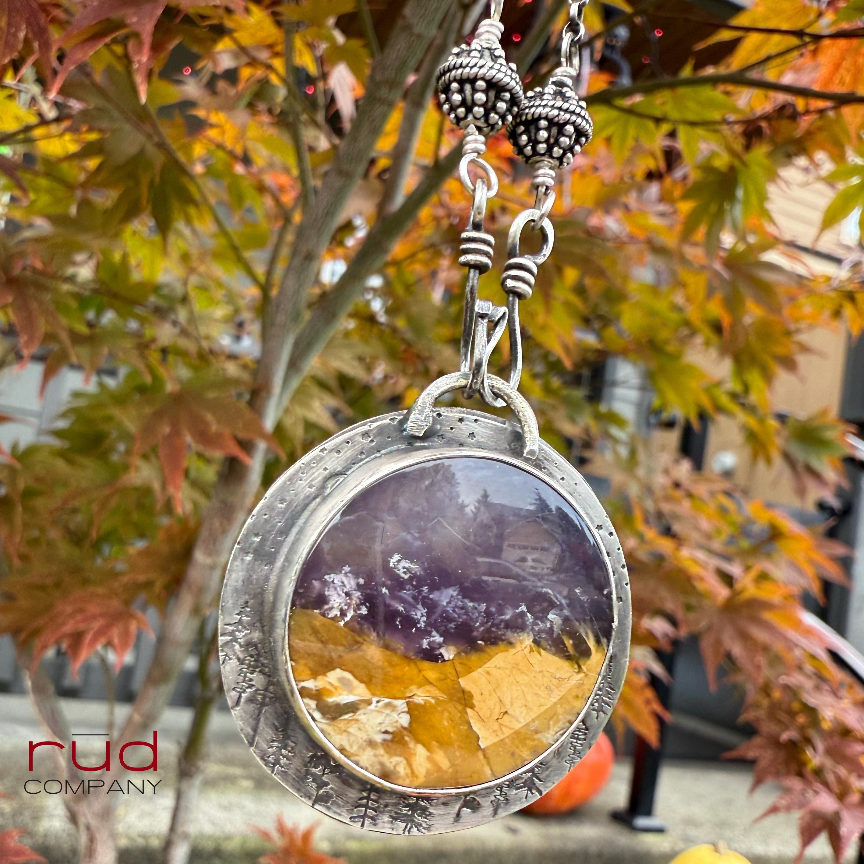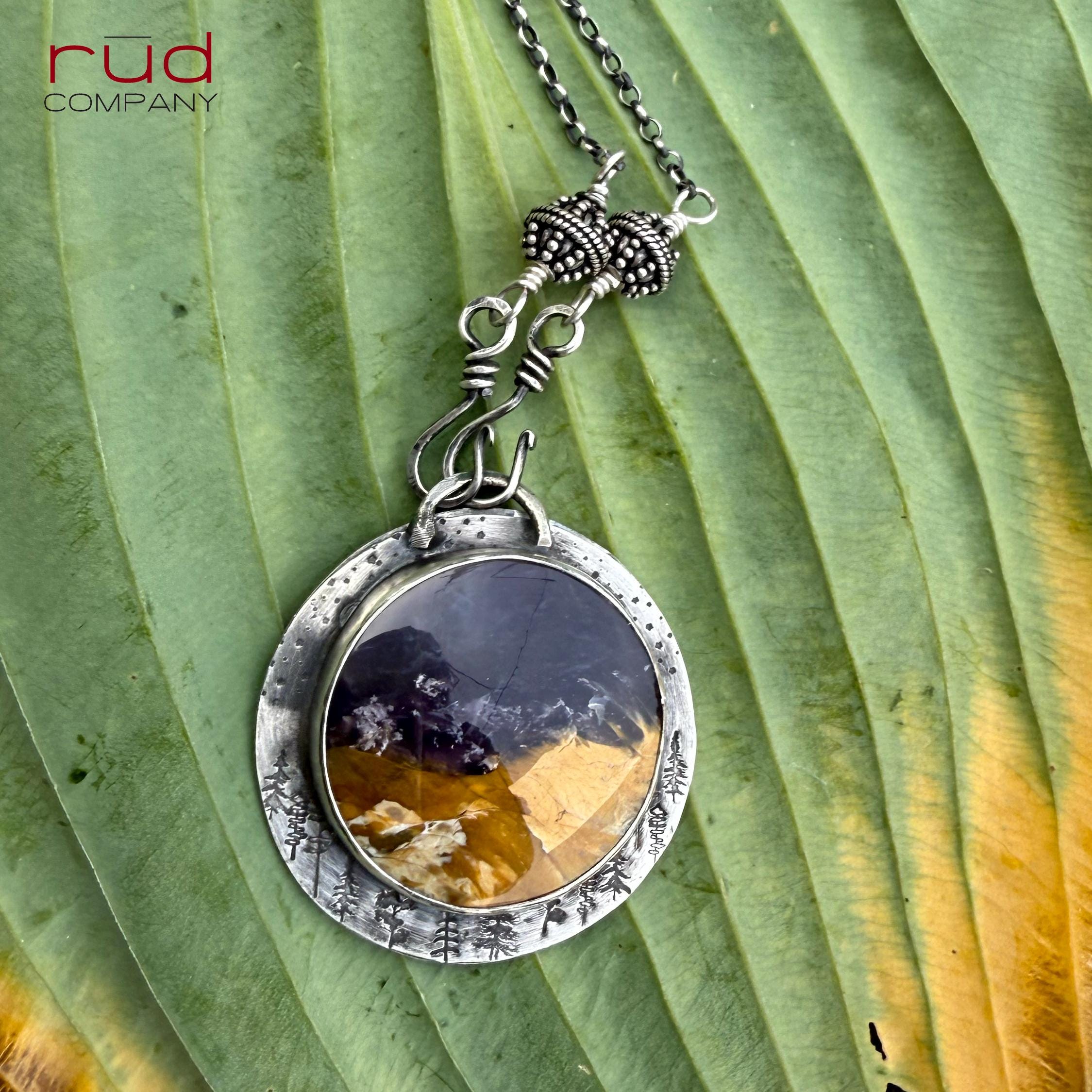 This lovely handcrafted, one of a kind solid sterling silver necklace is set with an exquisite, expertly cut and polished Purple Common Opal cabochon (the name of the stone really is "common opal", but this piece is anything but common!). The stone itself is translucent deep purple with beautiful deep tan - like a natural purple sky over a mountain skyline. I've blackened the sterling around the stone and hand-stamped a starry mountain night on the reverse to create a beautiful frame. On the front, the same starry night but with a forest below. What a beautiful landscape!